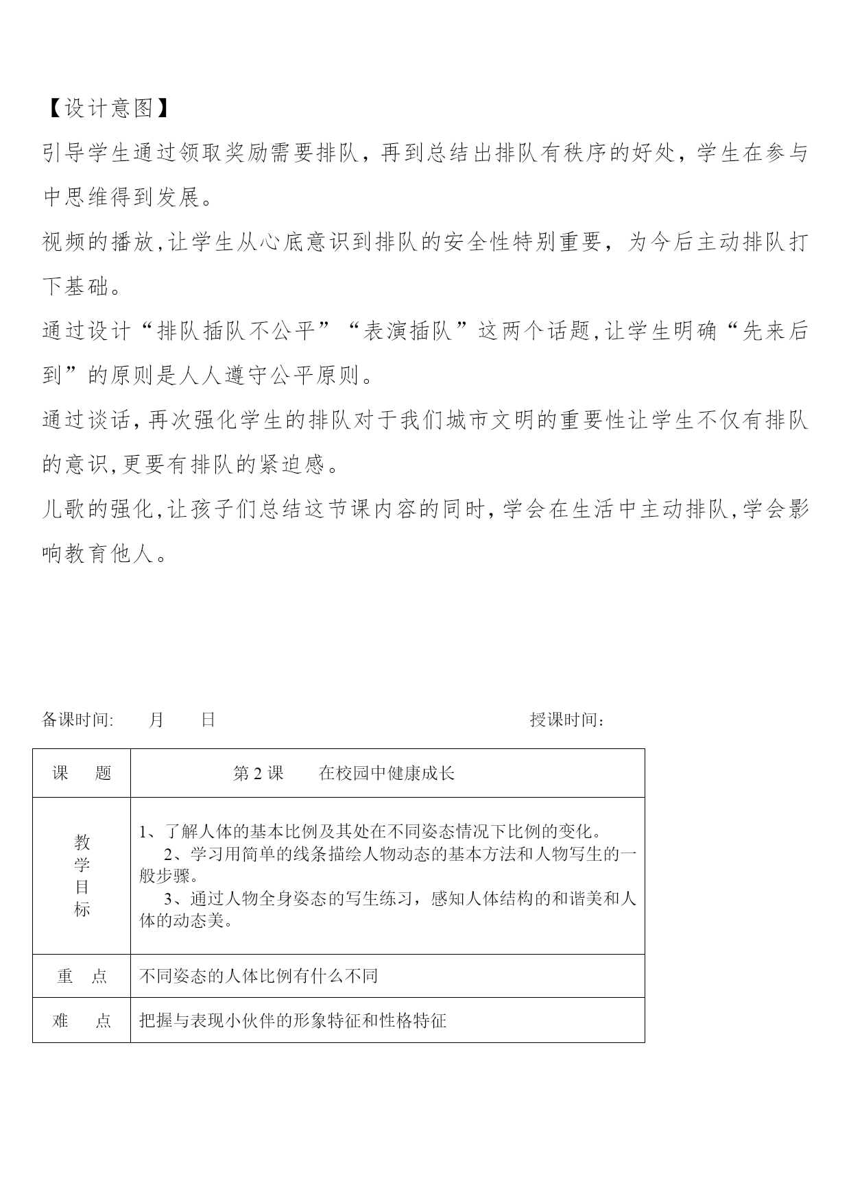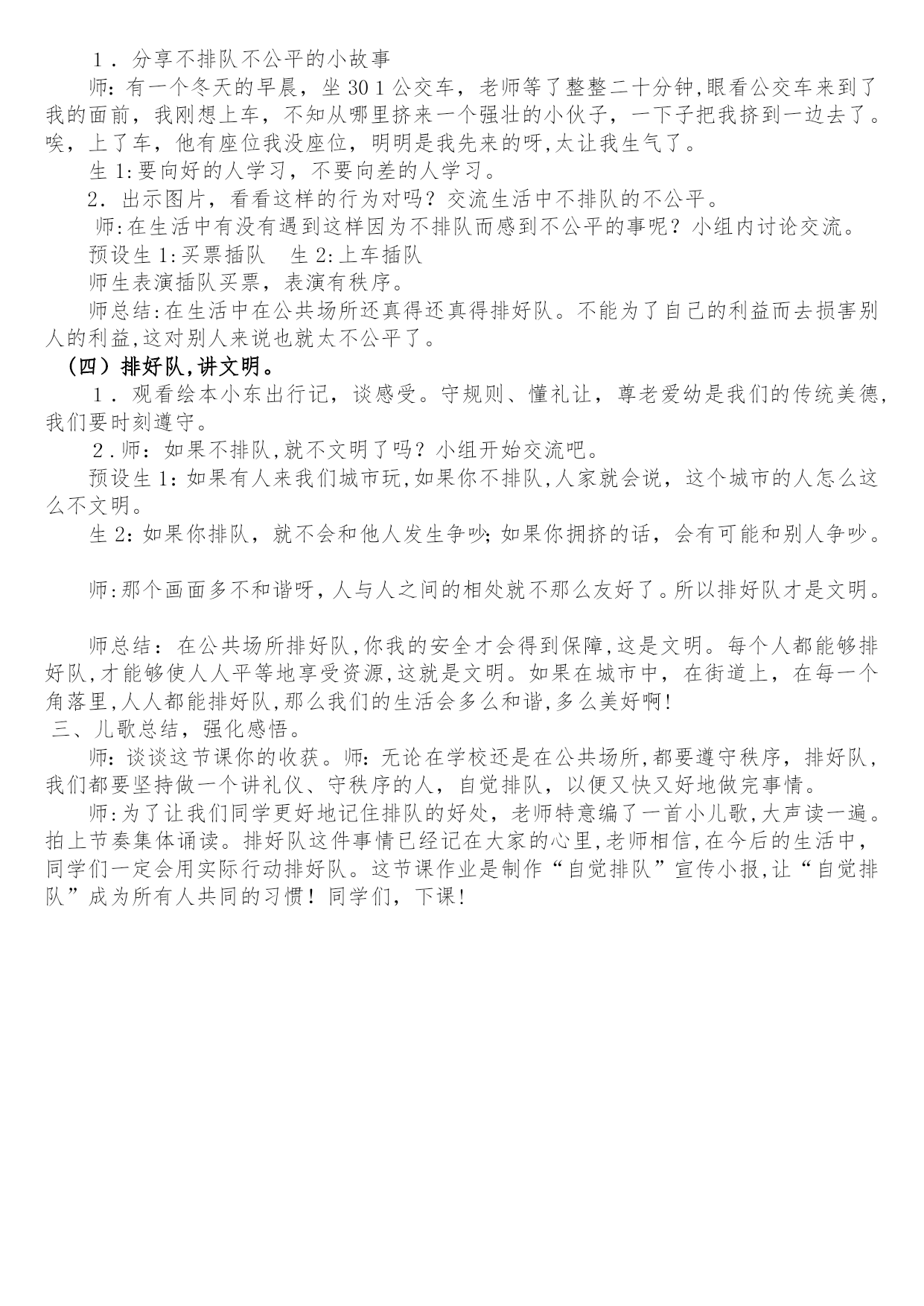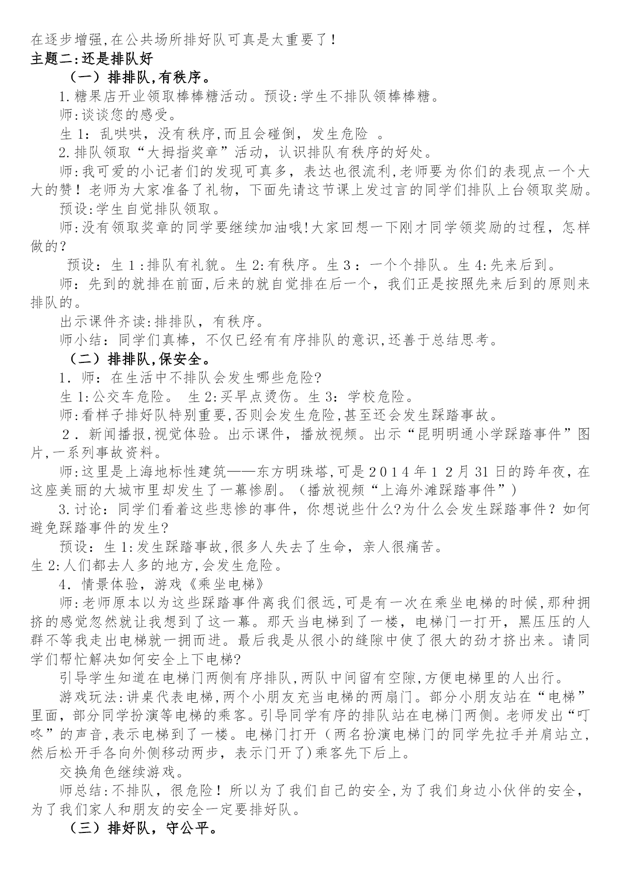 《大家排好队》教学设计教学过程:课前音乐《排队歌》导入,活跃气氛。同学们我们刚刚听了一首儿歌,叫《排队歌》。这节课就让我们一起走进课堂,感受有序排队的魅力。板书课题大家排好队。主题一:哪些地方要排队1.师:我们先来观看一组图片。(出示在学校学生排队的照片。)谈谈你的感受?生1:在学校里我们每天都在排队,这样才能更有秩序。师:其实,不仅在学校要排好队,在其他公共场所也有很多排队现象。老师布置了课前调查作业,同学们已经当上小记者,自主调查了生活中需要排队的场所。下面小组合作把你的采访记录与组内成员进行交流,小组长组织好大家依次发言,在交流中要认真倾听、积极发言并完善自己的调查表,听明白了吗?好,开始吧。2.组内交流,小组成员积极发言、质疑补充和评价。教师巡视指导。师:刚才在组长的组织下,各小组同学们都积极参与,认真的讨论交流,表现最棒的是1组和3组,1组同学组长组织有序,组员有不同意见举手质疑补充,3组同学课前调查的场所最多,关于排队现象的讨论也有很多想法,对这两个组提出表扬!大家要向他们学习!哪个小组愿意把你们的发现和感想分享给大家呢?请3组的小记者们上来分享。3.全班交流,出示图片,了解生活中的排队规则。预设:组长1号:大家好!我们小组讨论需要排队的场所有:医院、饭馆、儿童乐园、超市、公交站、还有汽车的行驶和停放。先下面由2号同学说说她的发现。2号:同学们,这是周末我生病去医院在收费窗口拍下的照片,一位志愿者大姐姐举着文明排队的牌子,引导病人和家属自觉排队,大部分人都在排队,有一位阿姨没有排到队伍里,我上前询问,发现阿姨是和别人询问卫生间在哪,哈哈,虚惊一场,看来人们在医院都是能自觉排队的。3号:大家请看这张照片,周末中午我和爸爸、妈妈去餐馆吃饭,点餐时发现餐馆生意好,人很多,但是大家都没有抱怨等待时间长,按顺序排队。下午妈妈带我去了儿童乐园玩,人们排队交费进入,孩子们开始玩了,家长们就自动的排成一排坐在椅子上等待孩子。4号:周末妈妈带我去了超市,超市的人可真多,排队称重、结账的队伍也很长,其中有一位老爷爷忘记称买的水果了不能结账,又想要就进去称,后面等的人开始抱怨。我觉得大家都应该相互理解,排队时有个好心情。1号:下过大雪之后,我发现虽然天气很冷,在公交车站人们都能有序上车,有老人上车后,会有人主动让座,可也有些年轻人装作看不见,我想大家都应该主动给老人让座。司机都按照交通规则行驶,虽然车辆行驶的很慢,排起了长队,可是还有一些不幸的交通事故发生,很多车辆在路边停放,有的没有停放在停车位里,这样的排队有安全隐患。这就是我们组的发现,哪位同学愿意补充,和大家继续交流?学生补充:早点摊上排队买早点;去博物馆参观要排队买票进入;火车站要排队买票,进站要排队安检进入候车室;坐大巴车要排队买票上车;去银行办理业务要叫号领取小票排队办理业务,去旅游景点要排队买票......小组长1号:同学们你们说的排队场所真多,真棒!生1:我觉得3组同学调查的真仔细,表达也很清楚!我要向你们学习!生2:我觉得2号同学讲述的故事很完整,表情丰富,声音洪亮,表现真棒!师:根据同学们的调查统计,一共调查了5种公共场所,发现人们有序排队的占90%,不能文明排队的占10%。看来排队在社会中的公共场所随处可见,我们市民的排队意识也在逐步增强,在公共场所排好队可真是太重要了!主题二:还是排队好排排队,有秩序。1.糖果店开业领取棒棒糖活动。预设:学生不排队领棒棒糖。师:谈谈您的感受。生1:乱哄哄,没有秩序,而且会碰倒,发生危险。2.排队领取“大拇指奖章”活动,认识排队有秩序的好处。师:我可爱的小记者们的发现可真多,表达也很流利,老师要为你们的表现点一个大大的赞!老师为大家准备了礼物,下面先请这节课上发过言的同学们排队上台领取奖励。预设:学生自觉排队领取。师:没有领取奖章的同学要继续加油哦!大家回想一下刚才同学领奖励的过程,怎样做的?预设:生1:排队有礼貌。生2:有秩序。生3:一个个排队。生4:先来后到。师:先到的就排在前面,后来的就自觉排在后一个,我们正是按照先来后到的原则来排队的。出示课件齐读:排排队,有秩序。师小结:同学们真棒,不仅已经有有序排队的意识,还善于总结思考。排排队,保安全。1.师:在生活中不排队会发生哪些危险?生1:公交车危险。生2:买早点烫伤。生3:学校危险。师:看样子排好队特别重要,否则会发生危险,甚至还会发生踩踏事故。2.新闻播报,视觉体验。出示课件,播放视频。出示“昆明明通小学踩踏事件”图片,一系列事故资料。师:这里是上海地标性建筑——东方明珠塔,可是2014年12月31日的跨年夜,在这座美丽的大城市里却发生了一幕惨剧。(播放视频“上海外滩踩踏事件”)3.讨论:同学们看