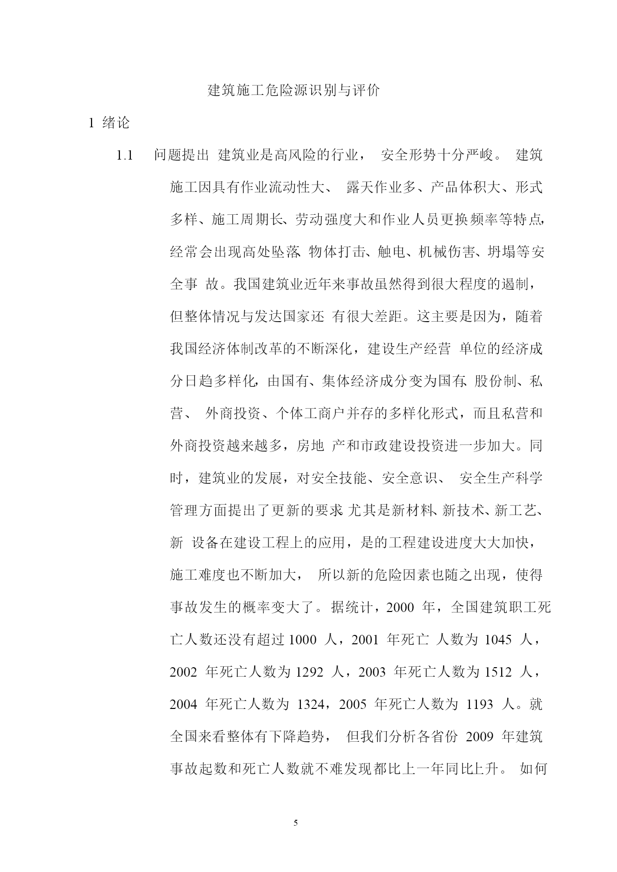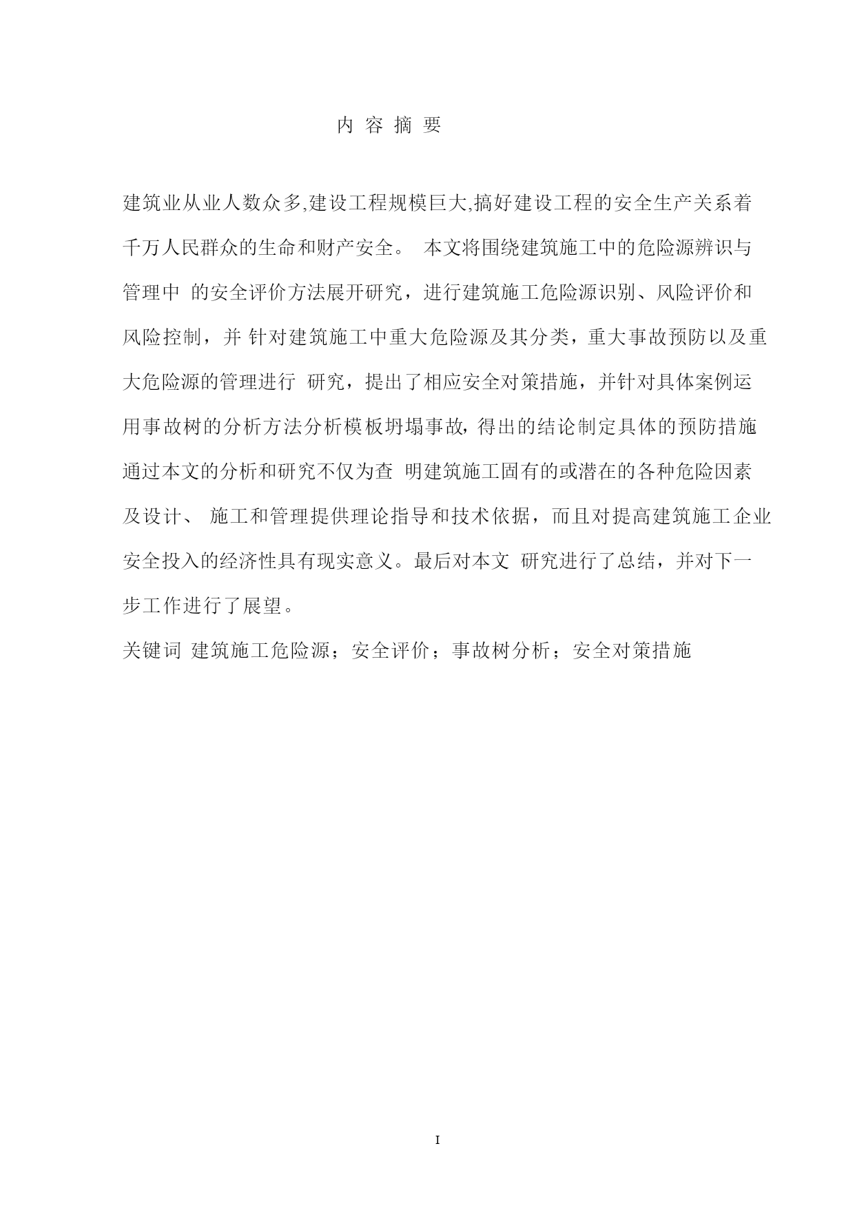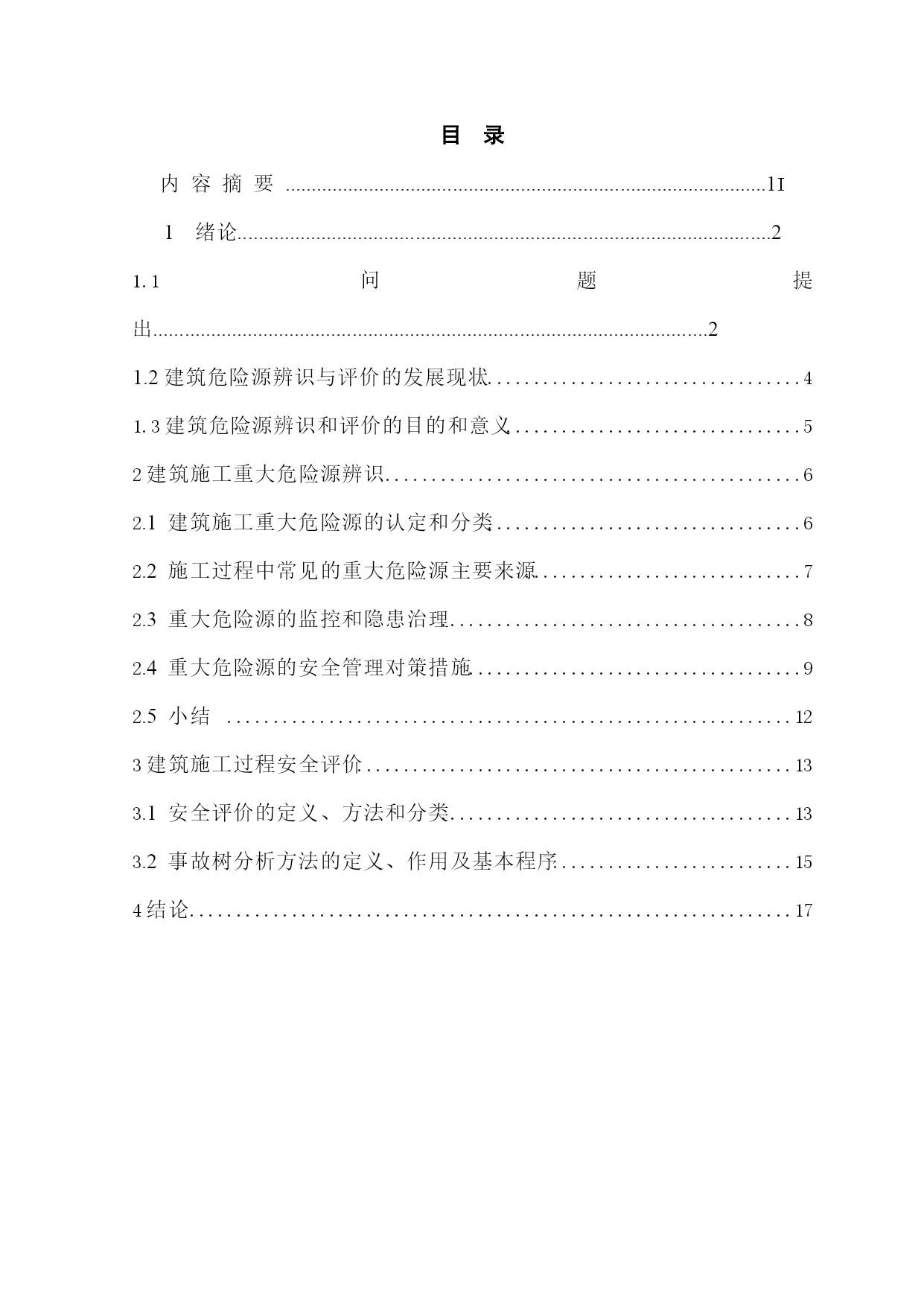浙江树人大学建筑施工危险源识别与评价专业行政管理学号学生虞丽青班级09行政创新二零一二年六月目录INDEX\h"—M—"\o"S"\c"2"\z"2052"TOC\o"1-3"\h\z\uHYPERLINK\l"_Toc225703787"内容摘要............................................................................................1IHYPERLINK\l"_Toc225703789"1绪论......................................................................................................21.1问题提出..........................................................................................................2HYPERLINK\l"_Toc225703791"1.2建筑危险源辨识与评价的发展现状41.3HYPERLINK\l"_Toc225703792"建筑危险源辨识和评价的目的和意义5HYPERLINK\l"_Toc225703794"2建筑施工重大危险源辨识6HYPERLINK\l"_Toc225703795"2.1建筑施工重大危险源的认定和分类6HYPERLINK\l"_Toc225703796"2.2施工过程中常见的重大危险源主要来源7HYPERLINK\l"_Toc225703797"2.3重大危险源的监控和隐患治理8HYPERLINK\l"_Toc225703798"2.4重大危险源的安全管理对策措施9HYPERLINK\l"_Toc225703800"2.5小结12HYPERLINK\l"_Toc225703801"3建筑施工过程安全评价13HYPERLINK\l"_Toc225703802"3.1安全评价的定义、方法和分类13HYPERLINK\l"_Toc225703803"3.2事故树分析方法的定义、作用及基本程序15HYPERLINK\l"_Toc225703804"4结论17I内容摘要建筑业从业人数众多,建设工程规模巨大,搞好建设工程的安全生产关系着千万人民群众的生命和财产安全。本文将围绕建筑施工中的危险源辨识与管理中的安全评价方法展开研究,进行建筑施工危险源识别、风险评价和风险控制,并针对建筑施工中重大危险源及其分类,重大事故预防以及重大危险源的管理进行研究,提出了相应安全对策措施,并针对具体案例运用事故树的分析方法分析模板坍塌事故,得出的结论制定具体的预防措施。通过本文的分析和研究不仅为查明建筑施工固有的或潜在的各种危险因素及设计、施工和管理提供理论指导和技术依据,而且对提高建筑施工企业安全投入的经济性具有现实意义。最后对本文研究进行了总结,并对下一步工作进行了展望。关键词建筑施工危险源;安全评价;事故树分析;安全对策措施建筑施工危险源识别与评价1绪论问题提出建筑业是高风险的行业,安全形势十分严峻。建筑施工因具有作业流动性大、露天作业多、产品体积大、形式多样、施工周期长、劳动强度大和作业人员更换频率等特点,经常会出现高处坠落、物体打击、触电、机械伤害、坍塌等安全事故。我国建筑业近年来事故虽然得到很大程度的遏制,但整体情况与发达国家还有很大差距。这主要是因为,随着我国经济体制改革的不断深化,建设生产经营单位的经济成分日趋多样化,由国有、集体经济成分变为国有、股份制、私营、外商投资、个体工商户并存的多样化形式,而且私营和外商投资越来越多,房地产和市政建设投资进一步加大。同时,建筑业的发展,对安全技能、安全意识、安全生产科学管理方面提出了更新的要求。尤其是新材料、新技术、新工艺、新设备在建设工程上的应用,是的工程建设进度大大加快,施工难度也不断加大,所以新的危险因素也随之出现,使得事故发生的概率变大了。据统计,2000年,全国建筑职工死亡人数还没有超过1000人,2001年死亡人数为1045人,2002年死亡人数为1292人,2003年死亡人数为1512人,2004年死亡人数为1324,2005年死亡人数为1193人。就全国来看整体有下降趋势,但我们分析各省份2009年建筑事故起数和死亡人数就不难发现都比上一年同比上升。如何保障和提高建筑施工的安全性,是建筑施工安全管理中的重要课题。通过调查笔者发现目前