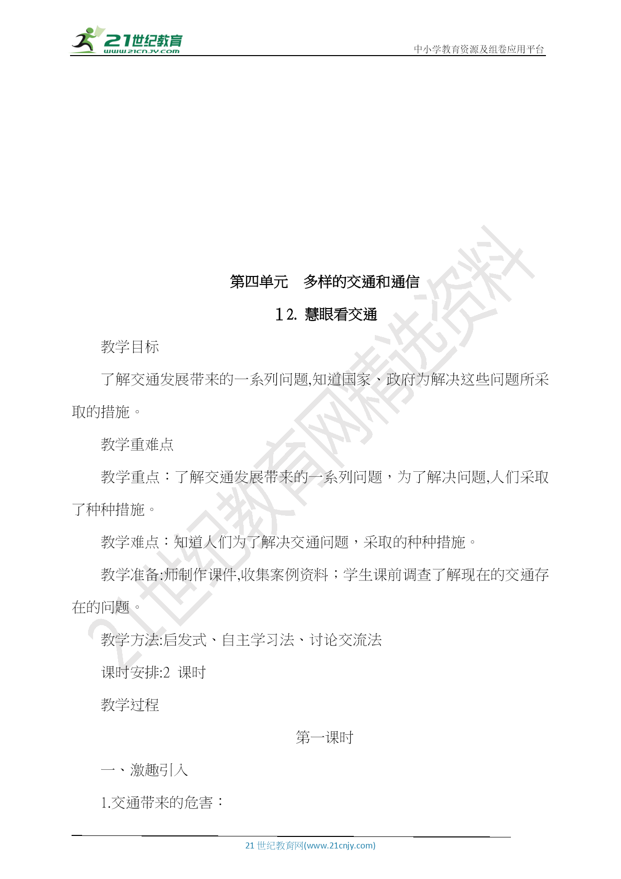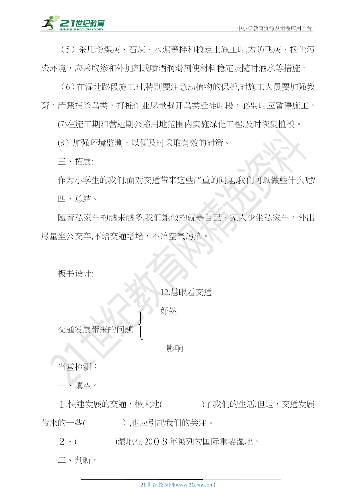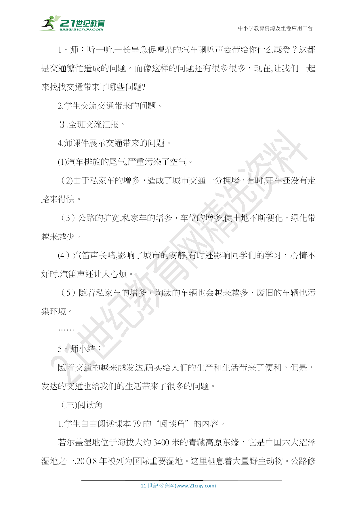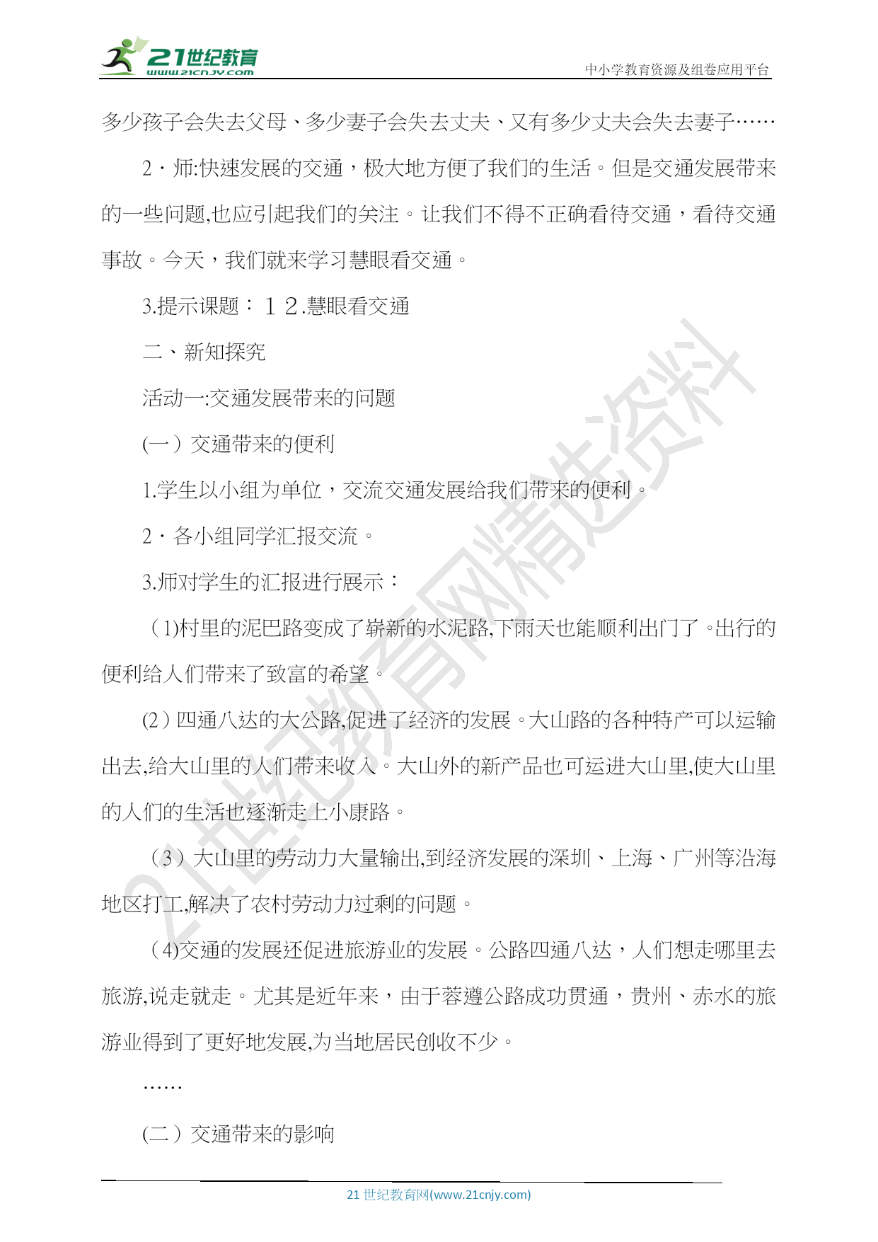 中小学教育资源及组卷应用平台HYPERLINK"http://www.21cnjy.com/"21世纪教育网(www.21cnjy.com)第四单元多样的交通和通信12.慧眼看交通教学目标了解交通发展带来的一系列问题,知道国家、政府为解决这些问题所采取的措施。教学重难点教学重点:了解交通发展带来的一系列问题,为了解决问题,人们采取了种种措施。教学难点:知道人们为了解决交通问题,采取的种种措施。教学准备:师制作课件,收集案例资料;学生课前调查了解现在的交通存在的问题。教学方法:启发式、自主学习法、讨论交流法课时安排:2课时教学过程第一课时一、激趣引入1.交通带来的危害:从统计资料看,世界上每年大约因道路交通事故造成50万人死亡,1000万人受伤,造成的经济损失相当于国民经济生产总值的1%~2%。我国的情况更是不容乐观,每年死亡9万人左右,平均每天死亡250多人,相当于每天坠毁一架大型客机,损失之大,不言而喻。交通事故对生命与财产的吞噬,已经给肇事者自身、受害人家庭和社会带来了巨大的危害。一个人牵动一个家,每天约死250人,也就意味着有250个家庭受到伤害。多少父母会失去孩子、多少孩子会失去父母、多少妻子会失去丈夫、又有多少丈夫会失去妻子……2.师:快速发展的交通,极大地方便了我们的生活。但是交通发展带来的一些问题,也应引起我们的关注。让我们不得不正确看待交通,看待交通事故。今天,我们就来学习慧眼看交通。3.提示课题:12.慧眼看交通二、新知探究活动一:交通发展带来的问题(一)交通带来的便利1.学生以小组为单位,交流交通发展给我们带来的便利。2.各小组同学汇报交流。3.师对学生的汇报进行展示:(1)村里的泥巴路变成了崭新的水泥路,下雨天也能顺利出门了。出行的便利给人们带来了致富的希望。(2)四通八达的大公路,促进了经济的发展。大山路的各种特产可以运输出去,给大山里的人们带来收入。大山外的新产品也可运进大山里,使大山里的人们的生活也逐渐走上小康路。(3)大山里的劳动力大量输出,到经济发展的深圳、上海、广州等沿海地区打工,解决了农村劳动力过剩的问题。(4)交通的发展还促进旅游业的发展。公路四通八达,人们想走哪里去旅游,说走就走。尤其是近年来,由于蓉遵公路成功贯通,贵州、赤水的旅游业得到了更好地发展,为当地居民创收不少。……(二)交通带来的影响1.师:听一听,一长串急促嘈杂的汽车喇叭声会带给你什么感受?这都是交通繁忙造成的问题。而像这样的问题还有很多很多,现在,让我们一起来找找交通带来了哪些问题?2.学生交流交通带来的问题。3.全班交流汇报。4.师课件展示交通带来的问题。(1)汽车排放的尾气,严重污染了空气。(2)由于私家车的增多,造成了城市交通十分拥堵,有时,开车还没有走路来得快。(3)公路的扩宽,私家车的增多,车位的增多,使土地不断硬化,绿化带越来越少。(4)汽笛声长鸣,影响了城市的安静,有时还影响同学们的学习,心情不好时,汽笛声还让人心烦。(5)随着私家车的增多,淘汰的车辆也会越来越多,废旧的车辆也污染环境。……5.师小结:随着交通的越来越发达,确实给人们的生产和生活带来了便利。但是,发达的交通也给我们的生活带来了很多的问题。(三)阅读角1.学生自由阅读课本79的“阅读角”的内容。若尔盖湿地位于海拔大约3400米的青藏高原东缘,它是中国六大沼泽湿地之一,2008年被列为国际重要湿地。这里栖息着大量野生动物。公路修到湿地,使人们可以欣赏到湿地的美丽风光。为了最大限度减少公路建设对湿地带来的影响,国家采取了许多减缓影响的环保措施和对策。2.思考:公路穿越湿地会对环境带来哪些影响?3.学生汇报交流。4.师:公路穿越湿地,给湿地带来许多不利影响。一影响湿地周围的水污染,易使污水污染河流;二是影响动植物的生存环境;三是影响大气环境,特别是施工时期扬尘和汽车尾气污染;四是造成湿地的噪声污染。5.为了减少公路建设对湿地带来的影响,国家采取了许多减缓影响的环保措施和对策。(1)选定路线阶段时,对于湿地环境保护规划区和有珍奇动植物的湿地,应明确不穿越并尽量远离。(2)防止因分隔湿地而造成水流阻隔、干枯,使原生物消失或使物种数量逐渐减少,在湿地路段应尽可能设置桥梁穿越。(3)桥梁设计施工阶段制定科学的方案。首先设计时应尽可能减少桥墩的数量,其次桥梁主墩基础施工采用双壁钢围堰防水,钻孔作业在围堰中进行,产生的废渣用船运到指定地点堆放,不得弃于河道或湖、河滩地,最后桥涵施工和船舶运输都必须制定相应的油污染应急预案,配备必要的油污染净化、清理器材和设备。(4)施工队伍生活污水合理处理,不可直接排入河流中。经常检查施工机械,以防漏油漏水,施