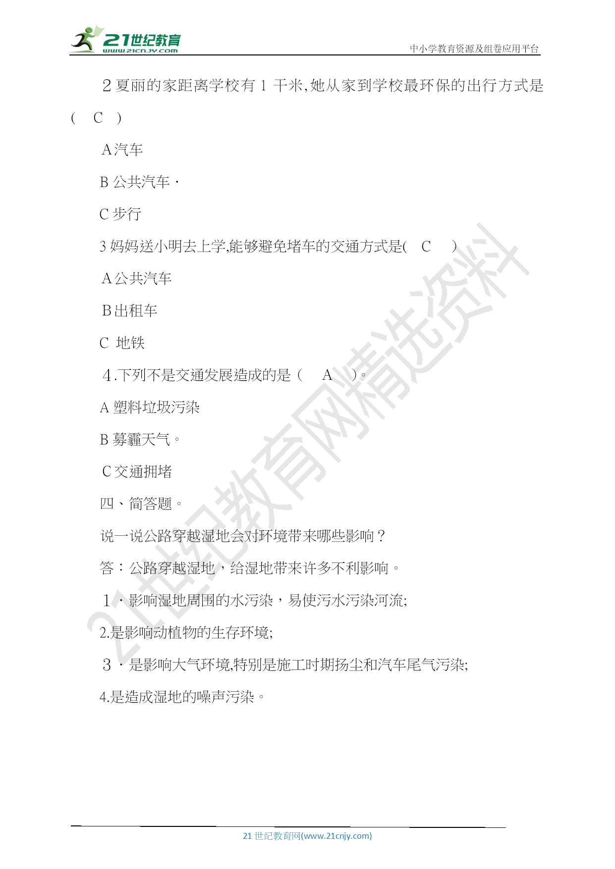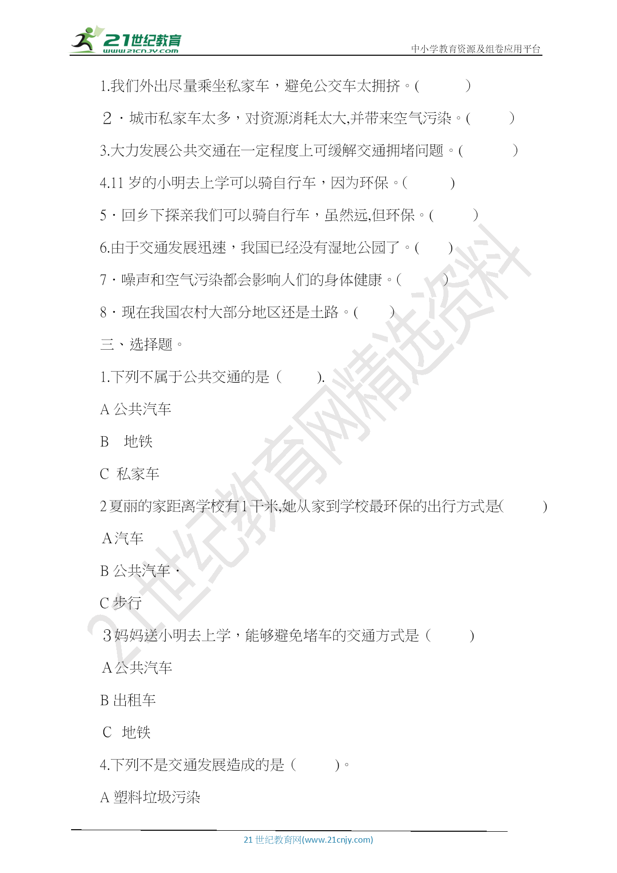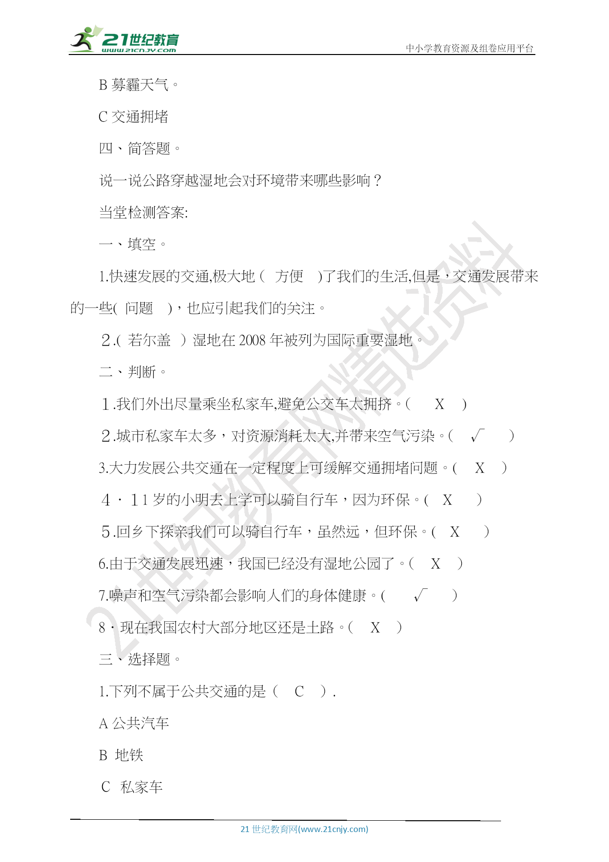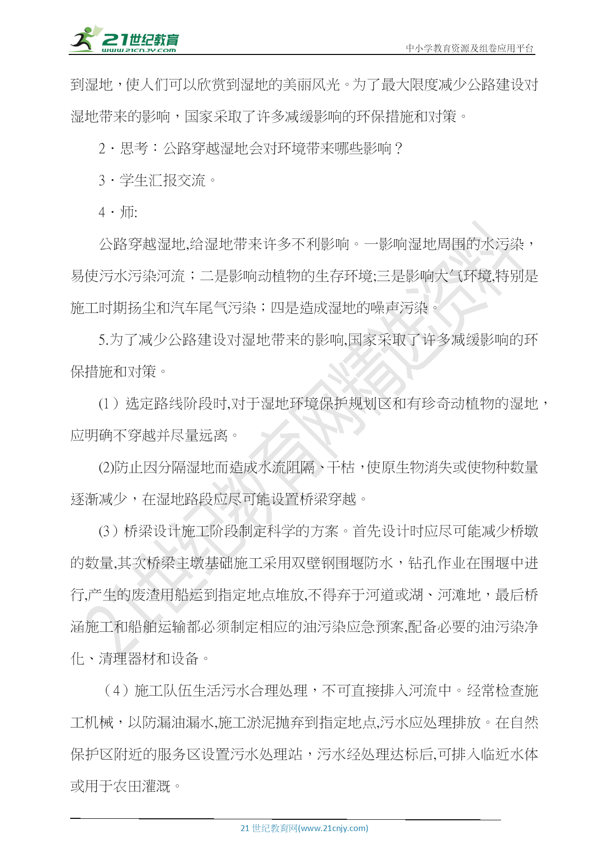 中小学教育资源及组卷应用平台HYPERLINK"http://www.21cnjy.com/"21世纪教育网(www.21cnjy.com)第四单元多样的交通和通信12.慧眼看交通教学目标了解交通发展带来的一系列问题,知道国家、政府为解决这些问题所采取的措施。教学重难点教学重点:了解交通发展带来的一系列问题,为了解决问题,人们采取了种种措施。教学难点:知道人们为了解决交通问题,采取的种种措施。教学准备:师制作课件,收集案例资料;学生课前调查了解现在的交通存在的问题。教学方法:启发式、自主学习法、讨论交流法课时安排:2课时教学过程第一课时一、激趣引入1.交通带来的危害:从统计资料看,世界上每年大约因道路交通事故造成50万人死亡,1000万人受伤,造成的经济损失相当于国民经济生产总值的1%~2%。我国的情况更是不容乐观,每年死亡9万人左右,平均每天死亡250多人,相当于每天坠毁一架大型客机,损失之大,不言而喻。交通事故对生命与财产的吞噬,已经给肇事者自身、受害人家庭和社会带来了巨大的危害。一个人牵动一个家,每天约死250人,也就意味着有250个家庭受到伤害。多少父母会失去孩子、多少孩子会失去父母、多少妻子会失去丈夫、又有多少丈夫会失去妻子……2.师:快速发展的交通,极大地方便了我们的生活。但是交通发展带来的一些问题,也应引起我们的关注。让我们不得不正确看待交通,看待交通事故。今天,我们就来学习慧眼看交通。3.提示课题:12.慧眼看交通二、新知探究活动一:交通发展带来的问题(一)交通带来的便利1.学生以小组为单位,交流交通发展给我们带来的便利。2.各小组同学汇报交流。3.师对学生的汇报进行展示:(1)村里的泥巴路变成了崭新的水泥路,下雨天也能顺利出门了。出行的便利给人们带来了致富的希望。(2)四通八达的大公路,促进了经济的发展。大山路的各种特产可以运输出去,给大山里的人们带来收入。大山外的新产品也可运进大山里,使大山里的人们的生活也逐渐走上小康路。(3)大山里的劳动力大量输出,到经济发展的深圳、上海、广州等沿海地区打工,解决了农村劳动力过剩的问题。(4)交通的发展还促进旅游业的发展。公路四通八达,人们想走哪里去旅游,说走就走。尤其是近年来,由于蓉遵公路成功贯通,贵州、赤水的旅游业得到了更好地发展,为当地居民创收不少。……(二)交通带来的影响1.师:听一听,一长串急促嘈杂的汽车喇叭声会带给你什么感受?这都是交通繁忙造成的问题。而像这样的问题还有很多很多,现在,让我们一起来找找交通带来了哪些问题?2.学生交流交通带来的问题。3.全班交流汇报。4.师课件展示交通带来的问题。(1)汽车排放的尾气,严重污染了空气。(2)由于私家车的增多,造成了城市交通十分拥堵,有时,开车还没有走路来得快。(3)公路的扩宽,私家车的增多,车位的增多,使土地不断硬化,绿化带越来越少。(4)汽笛声长鸣,影响了城市的安静,有时还影响同学们的学习,心情不好时,汽笛声还让人心烦。(5)随着私家车的增多,淘汰的车辆也会越来越多,废旧的车辆也污染环境。……5.师小结:随着交通的越来越发达,确实给人们的生产和生活带来了便利。但是,发达的交通也给我们的生活带来了很多的问题。(三)阅读角1.学生自由阅读课本79的“阅读角”的内容。若尔盖湿地位于海拔大约3400米的青藏高原东缘,它是中国六大沼泽湿地之一,2008年被列为国际重要湿地。这里栖息着大量野生动物。公路修到湿地,使人们可以欣赏到湿地的美丽风光。为了最大限度减少公路建设对湿地带来的影响,国家采取了许多减缓影响的环保措施和对策。2.思考:公路穿越湿地会对环境带来哪些影响?3.学生汇报交流。4.师:公路穿越湿地,给湿地带来许多不利影响。一影响湿地周围的水污染,易使污水污染河流;二是影响动植物的生存环境;三是影响大气环境,特别是施工时期扬尘和汽车尾气污染;四是造成湿地的噪声污染。5.为了减少公路建设对湿地带来的影响,国家采取了许多减缓影响的环保措施和对策。(1)选定路线阶段时,对于湿地环境保护规划区和有珍奇动植物的湿地,应明确不穿越并尽量远离。(2)防止因分隔湿地而造成水流阻隔、干枯,使原生物消失或使物种数量逐渐减少,在湿地路段应尽可能设置桥梁穿越。(3)桥梁设计施工阶段制定科学的方案。首先设计时应尽可能减少桥墩的数量,其次桥梁主墩基础施工采用双壁钢围堰防水,钻孔作业在围堰中进行,产生的废渣用船运到指定地点堆放,不得弃于河道或湖、河滩地,最后桥涵施工和船舶运输都必须制定相应的油污染应急预案,配备必要的油污染净化、清理器材和设备。(4)施工队伍生活污水合理处理,不可直接排入河流中。经常检查施工机械,以防漏油漏水,施