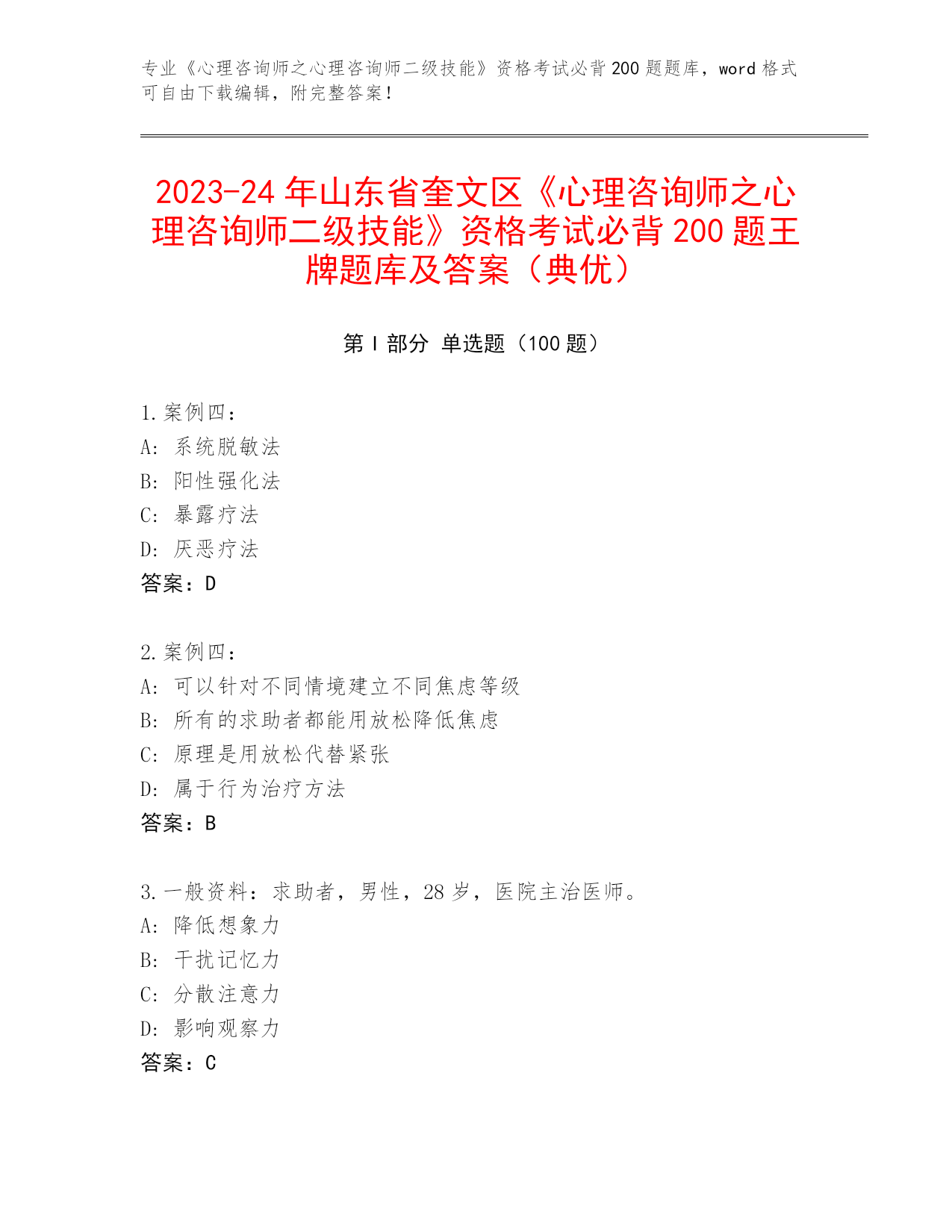 2023-24年山东省奎文区《心理咨询师之心理咨询师二级技能》资格考试必背200题王牌题库及答案(典优)