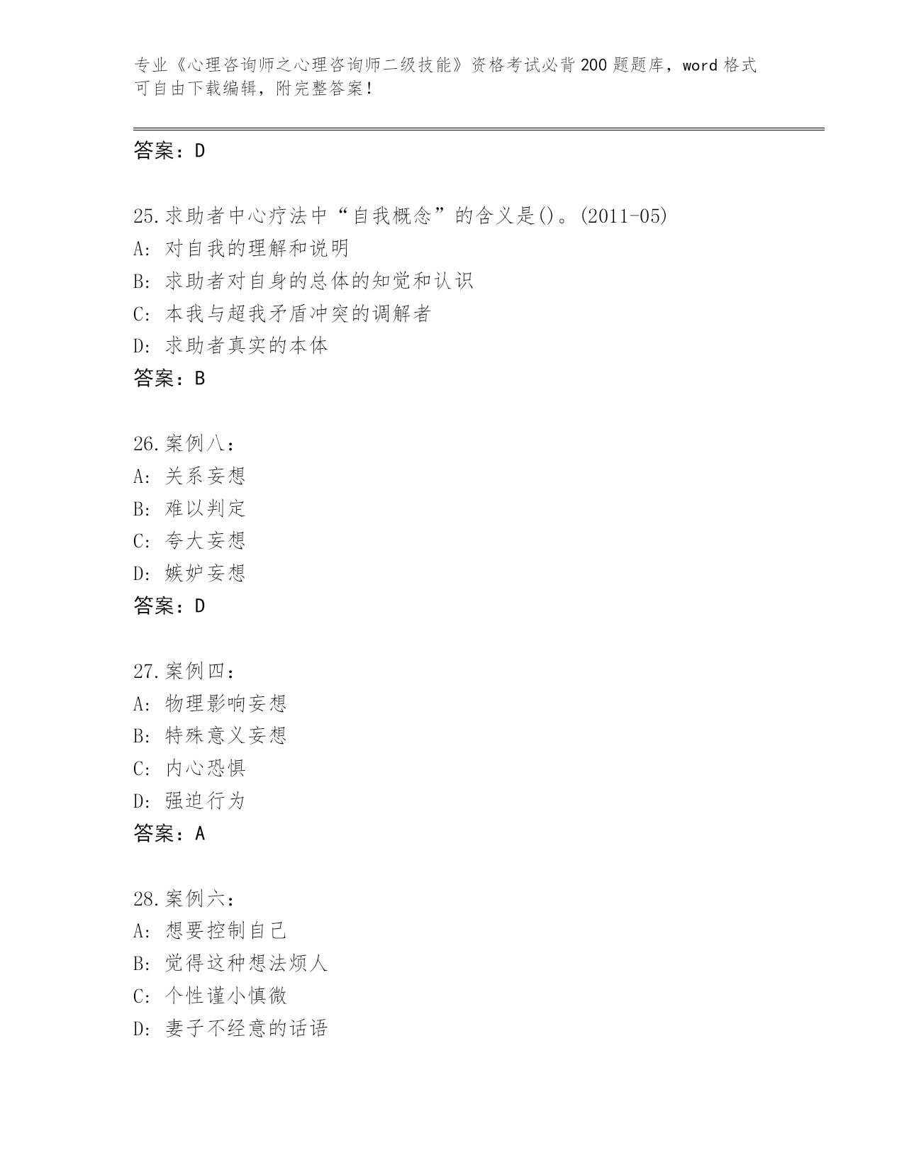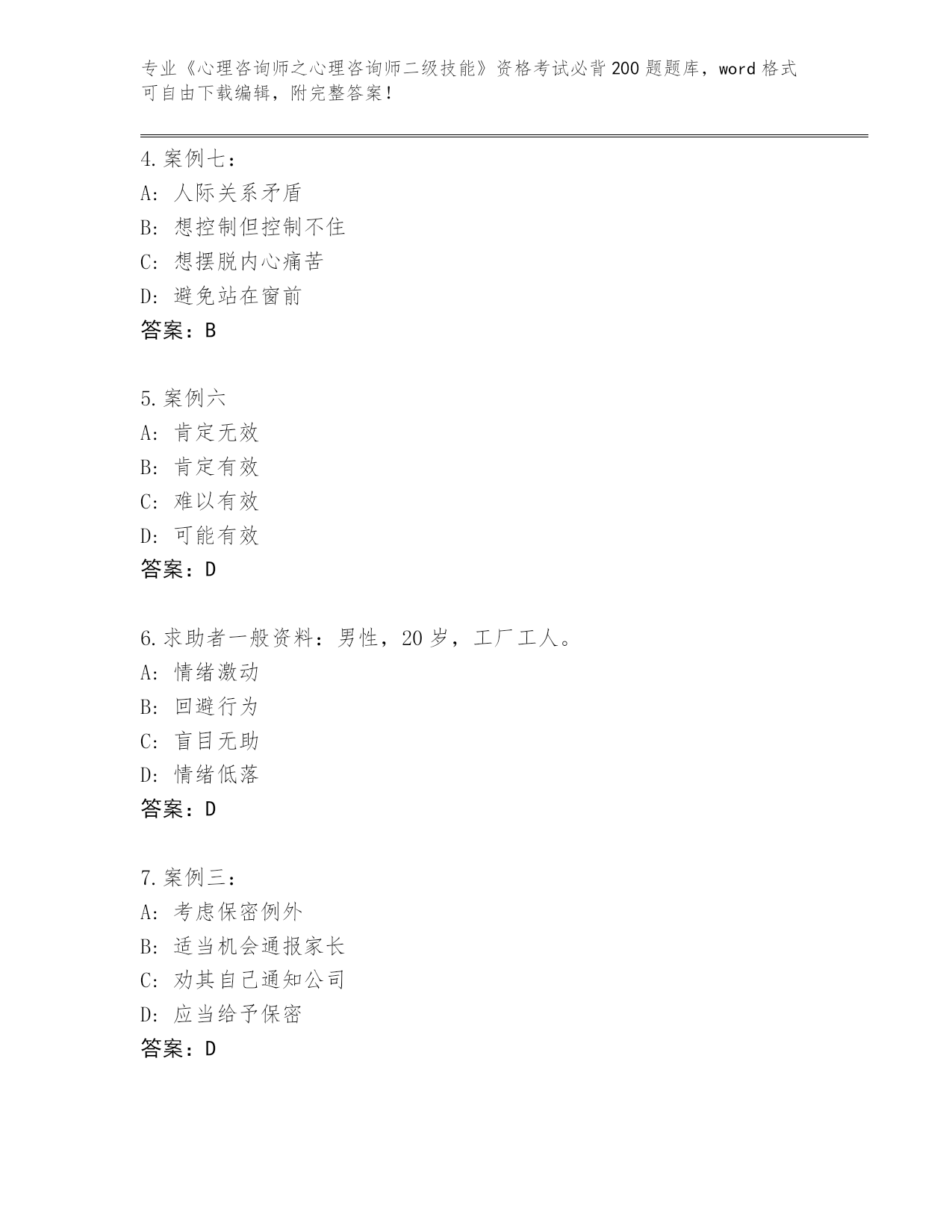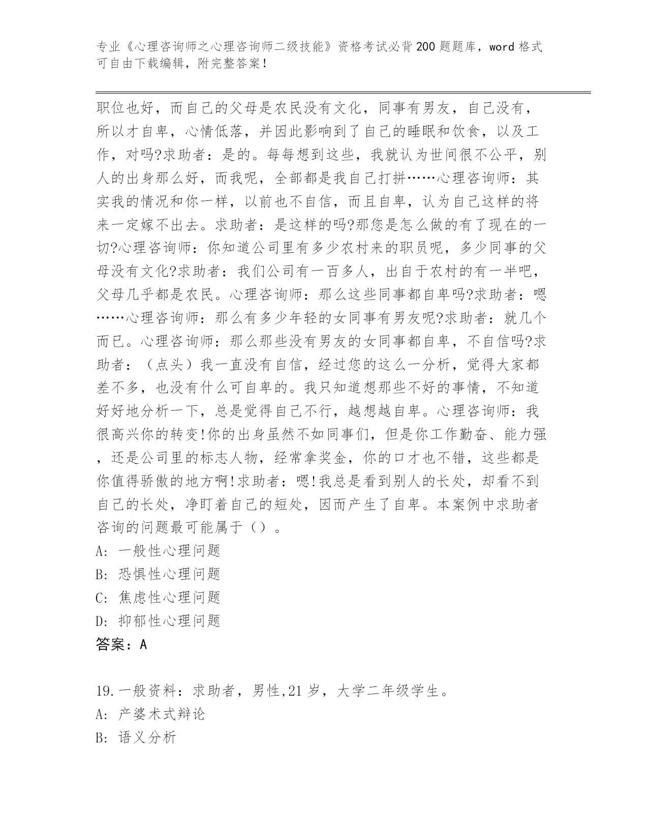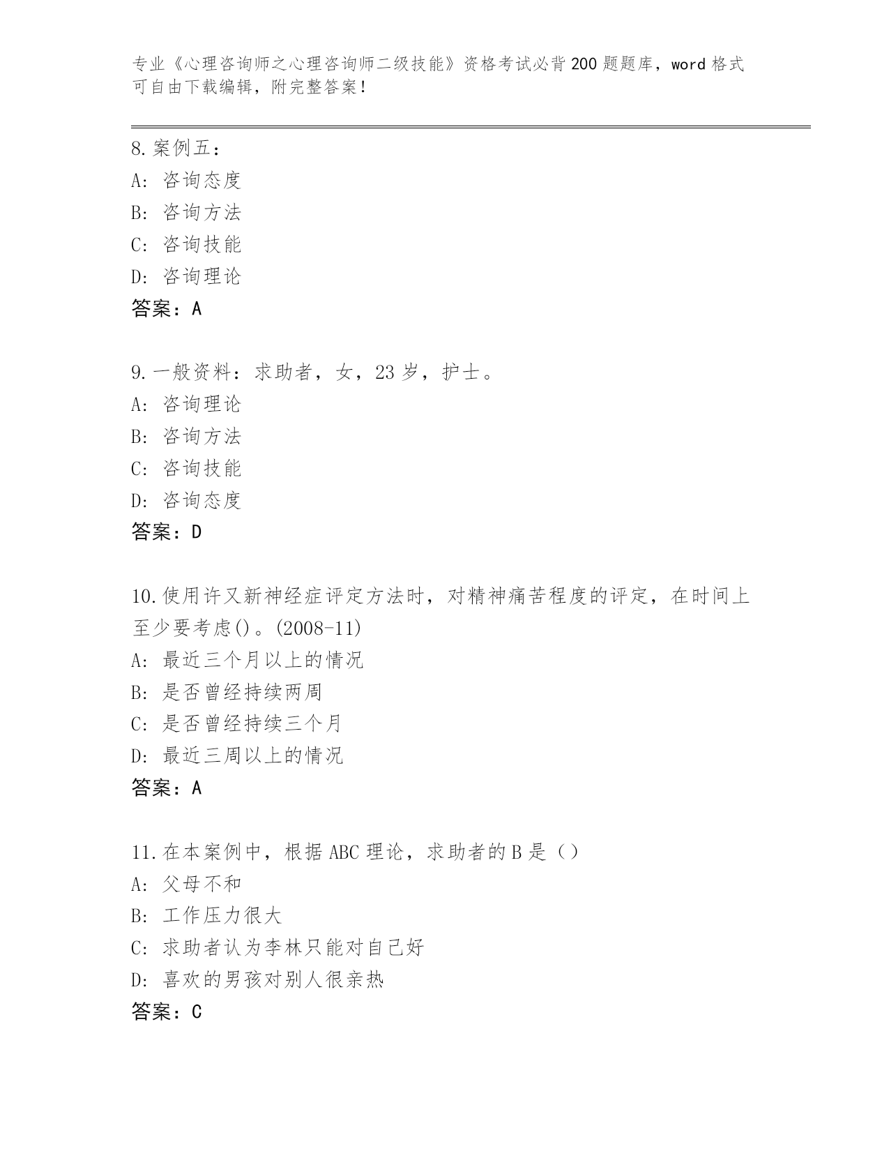 河南省殷都区历年《心理咨询师之心理咨询师二级技能》资格考试必背200题王牌题库(典优)
