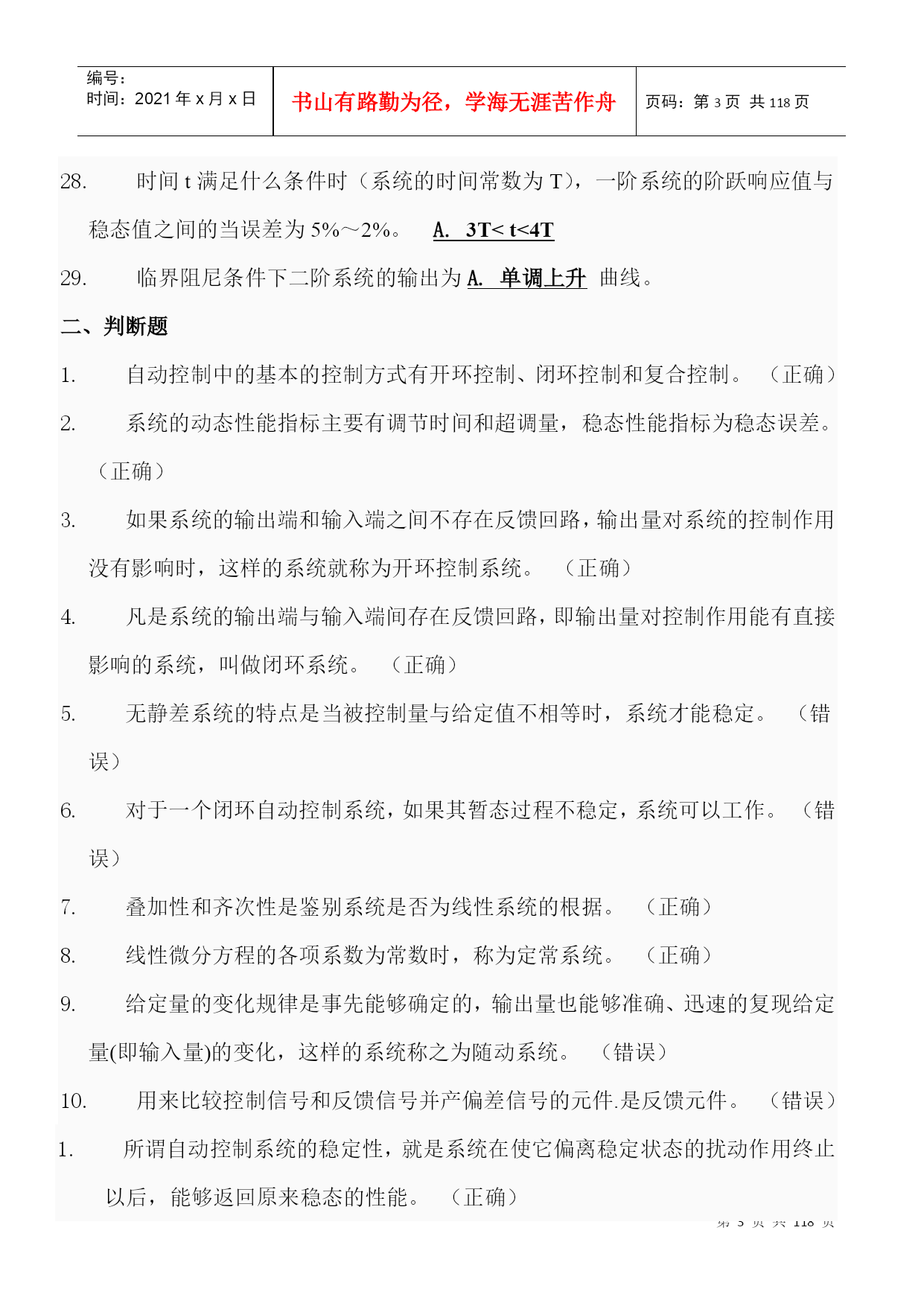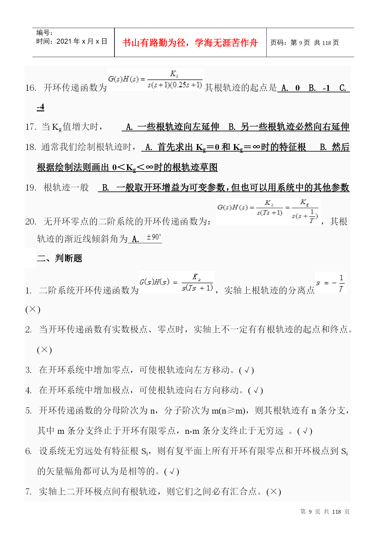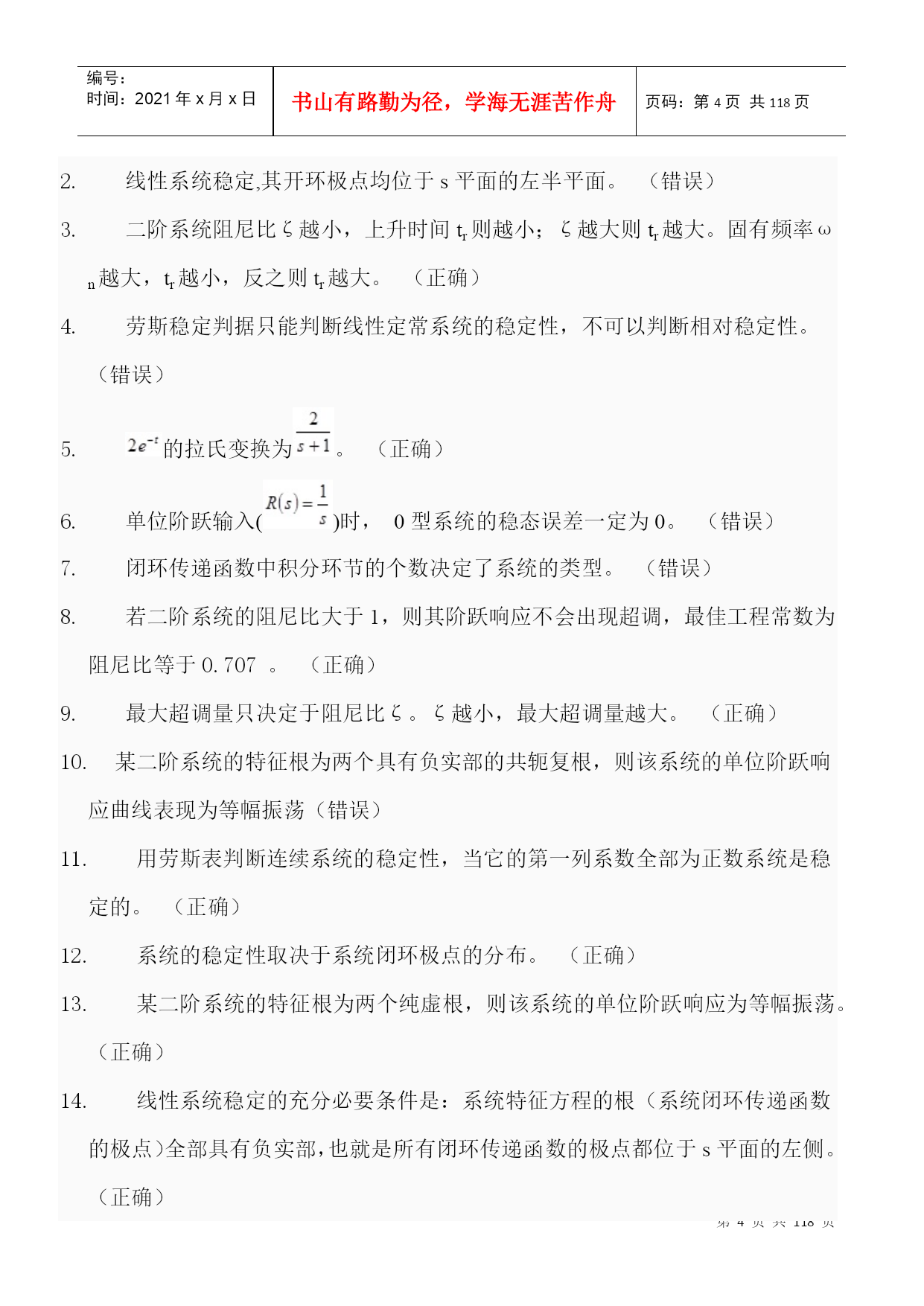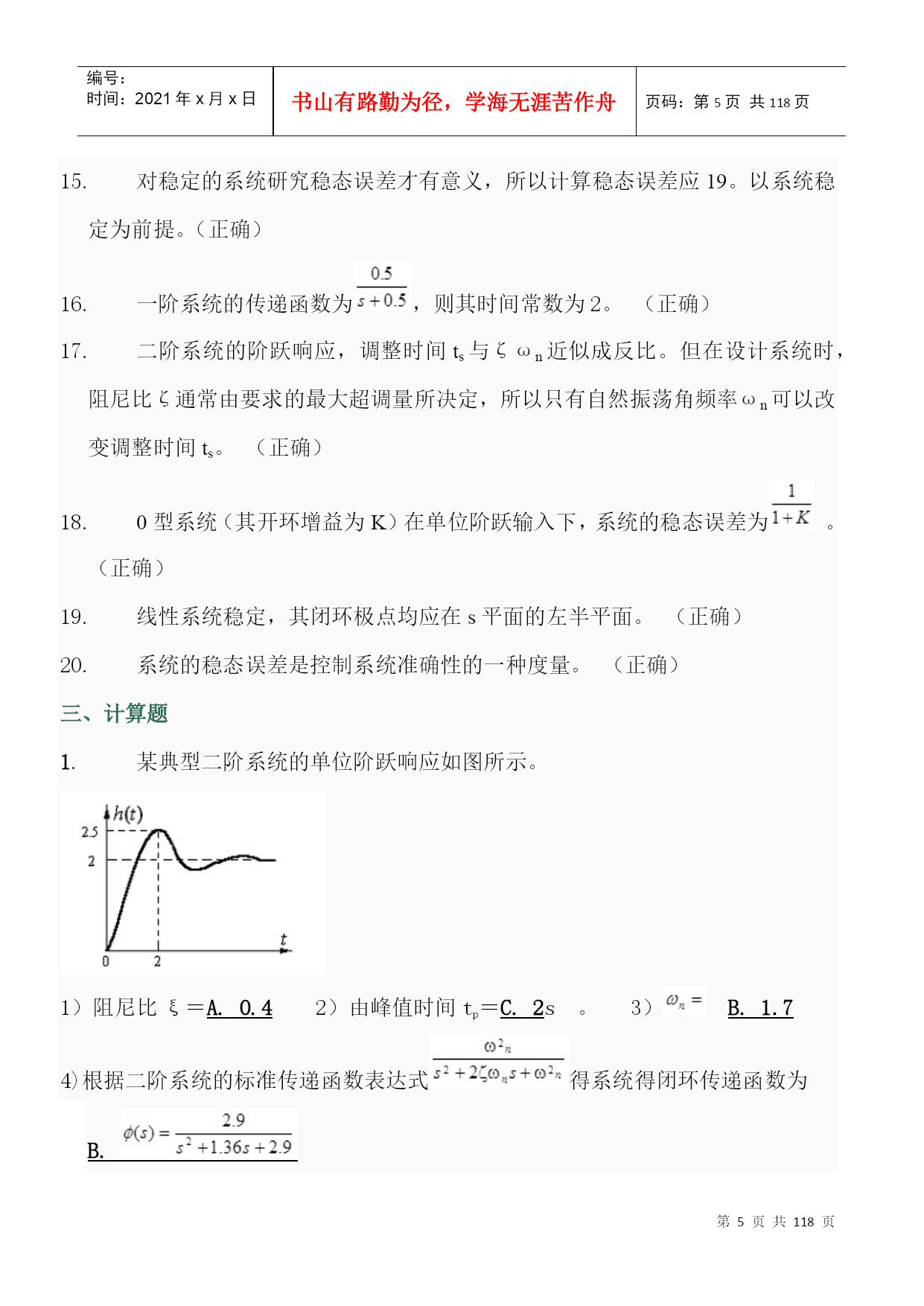 编号:时间:2021年x月x日书山有路勤为径,学海无涯苦作舟页码:第PAGE118页共NUMPAGES118页第PAGE\*MERGEFORMAT118页共NUMPAGES\*MERGEFORMAT118页一、不定项选择题1.控制系统的基本要求可归结为D.稳定性;准确性和快速性。2.反馈控制系统一般是指什么反馈?B.负反馈3.以下控制系统按结构分类正确的是A.开环控制系统、闭环控制系统和复合控制系统?4.以下不属于随动系统的是D.恒温控制系统。5.自动控制技术可以实现以下A.极大地提高劳动生产率B.提高产品的质量C.减轻人们的劳动强度,使人们从繁重的劳动中解放出来D.原子能生产,深水作业以及火箭或导弹的制导。6.自动控制就是在没有人直接参与的情况下,利用控制装置使A.生产过程B.被控对象的某一物理量准确地按照给定的规律运行或变化。7.反馈结果有利于加强输入信号的作用时叫C.正反馈8.系统输出全部或部分地返回到输入端,此类系统是A.反馈控制系统B.闭环控制系统9.自动控制系统一般由A.控制装置和被控制对象组成。10.对于一般的控制系统,当给定量或扰动量突然增加某一给定值时,输出量的暂态过程可能出现以下A.单调过程B.衰减振荡过程C.持续振荡过程D.发散振荡过程11.单位斜坡函数的拉氏变换结果是(D.)。12.以下属于一阶系统的阶跃响应特点的是D.没有超调量?13.阶跃响应从终值的10%上升到终值的90%所需的时间叫A.上升时间14.劳斯稳定判据能判断什么系统的稳定性?D.线性定常系统15.已知系统闭环传递函数为:则系统的ωn为C.216.已知系统闭环传递函数为:则系统的超调σ%为D.0.04317.二阶系统的临界阻尼比是B.118.单位阶跃函数的拉普拉斯变换结果是(A.)19.峰值超出终值的百分比叫B.超调量20.已知系统闭环传递函数为:则系统的ts(5%)是C.2.1s21.在欠阻尼的情况下,二阶系统的单位阶跃响应为A.振幅按指数规律衰减的简谐振荡22.阶跃响应到达并保持在终值%误差带内所需的最短时间;有时也用终值的%误差带来定义叫D.调节时间23.阶跃响应第一次达到终值的50%所需的时间叫B.延迟时间24.以下为二阶系统阻尼比,其中一定不稳定的是D.ζ≤025.某二阶系统的特征根为两个互不相等的实数,则该系统的单位阶跃响应曲线有什么特点?A.单调上升26.已知系统闭环传递函数为:则系统的阻尼比ξ为B.0.70727.阶跃响应越过稳态值达到第一个峰值所需的时间叫C.峰值时间28.时间t满足什么条件时(系统的时间常数为T),一阶系统的阶跃响应值与稳态值之间的当误差为5%~2%。A.3T<t<4T29.临界阻尼条件下二阶系统的输出为A.单调上升曲线。二、判断题1.自动控制中的基本的控制方式有开环控制、闭环控制和复合控制。(正确)2.系统的动态性能指标主要有调节时间和超调量,稳态性能指标为稳态误差。(正确)3.如果系统的输出端和输入端之间不存在反馈回路,输出量对系统的控制作用没有影响时,这样的系统就称为开环控制系统。(正确)4.凡是系统的输出端与输入端间存在反馈回路,即输出量对控制作用能有直接影响的系统,叫做闭环系统。(正确)5.无静差系统的特点是当被控制量与给定值不相等时,系统才能稳定。(错误)6.对于一个闭环自动控制系统,如果其暂态过程不稳定,系统可以工作。(错误)7.叠加性和齐次性是鉴别系统是否为线性系统的根据。(正确)8.线性微分方程的各项系数为常数时,称为定常系统。(正确)9.给定量的变化规律是事先能够确定的,输出量也能够准确、迅速的复现给定量(即输入量)的变化,这样的系统称之为随动系统。(错误)10.用来比较控制信号和反馈信号并产偏差信号的元件.是反馈元件。(错误)1.所谓自动控制系统的稳定性,就是系统在使它偏离稳定状态的扰动作用终止以后,能够返回原来稳态的性能。(正确)2.线性系统稳定,其开环极点均位于s平面的左半平面。(错误)3.二阶系统阻尼比ζ越小,上升时间tr则越小;ζ越大则tr越大。固有频率ωn越大,tr越小,反之则tr越大。(正确)4.劳斯稳定判据只能判断线性定常系统的稳定性,不可以判断相对稳定性。(错误)5.的拉氏变换为。(正确)6.单位阶跃输入()时,0型系统的稳态误差一定为0。(错误)7.闭环传递函数中积分环节的个数决定了系统的类型。(错误)8.若二阶系统的阻尼比大于1,则其阶跃响应不会出现超调,最佳工程常数为阻尼比等于0.707。(正确)9.最大超调量只决定于阻尼比ζ。ζ越小,最大超调量越大。(正确)10.某二阶系统的特征根为两个具有负实部的共轭复根,则该系统的单位阶跃