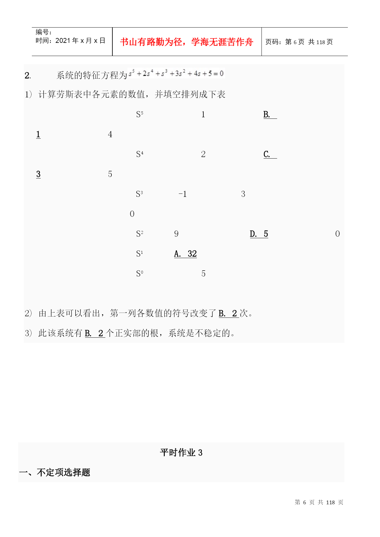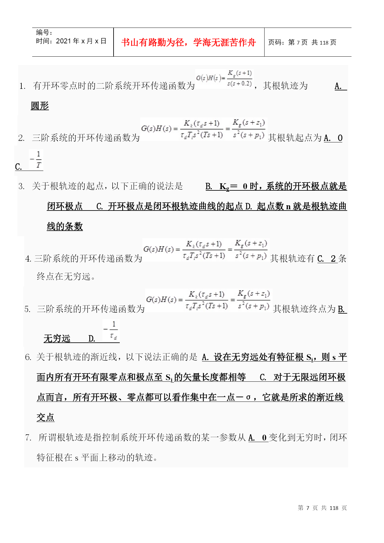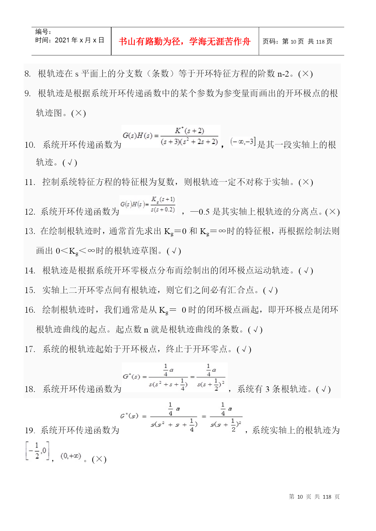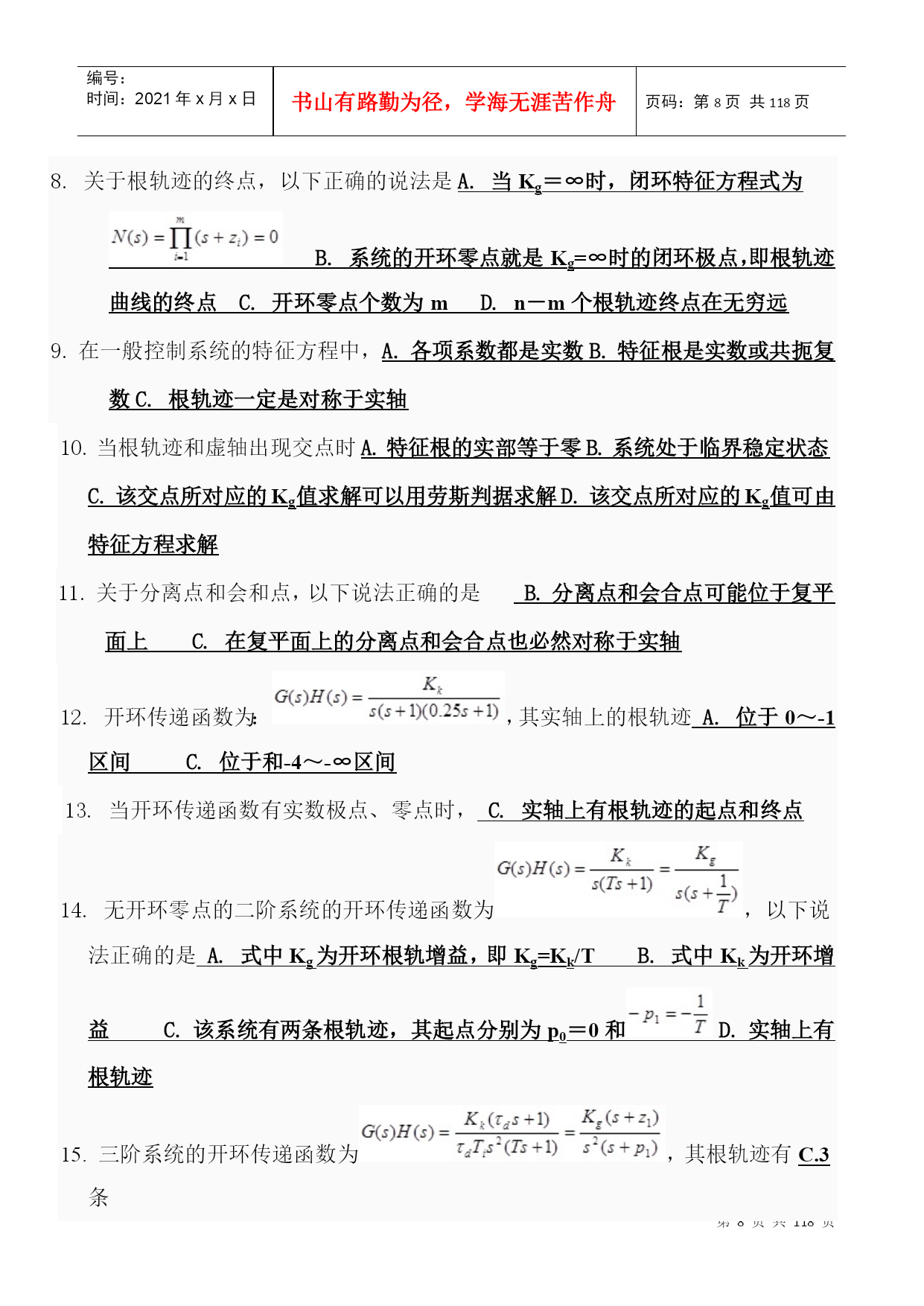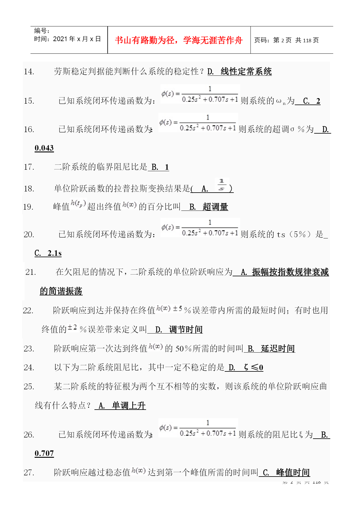 编号:时间:2021年x月x日书山有路勤为径,学海无涯苦作舟页码:第PAGE118页共NUMPAGES118页第PAGE\*MERGEFORMAT118页共NUMPAGES\*MERGEFORMAT118页一、不定项选择题1.控制系统的基本要求可归结为D.稳定性;准确性和快速性。2.反馈控制系统一般是指什么反馈?B.负反馈3.以下控制系统按结构分类正确的是A.开环控制系统、闭环控制系统和复合控制系统?4.以下不属于随动系统的是D.恒温控制系统。5.自动控制技术可以实现以下A.极大地提高劳动生产率B.提高产品的质量C.减轻人们的劳动强度,使人们从繁重的劳动中解放出来D.原子能生产,深水作业以及火箭或导弹的制导。6.自动控制就是在没有人直接参与的情况下,利用控制装置使A.生产过程B.被控对象的某一物理量准确地按照给定的规律运行或变化。7.反馈结果有利于加强输入信号的作用时叫C.正反馈8.系统输出全部或部分地返回到输入端,此类系统是A.反馈控制系统B.闭环控制系统9.自动控制系统一般由A.控制装置和被控制对象组成。10.对于一般的控制系统,当给定量或扰动量突然增加某一给定值时,输出量的暂态过程可能出现以下A.单调过程B.衰减振荡过程C.持续振荡过程D.发散振荡过程11.单位斜坡函数的拉氏变换结果是(D.)。12.以下属于一阶系统的阶跃响应特点的是D.没有超调量?13.阶跃响应从终值的10%上升到终值的90%所需的时间叫A.上升时间14.劳斯稳定判据能判断什么系统的稳定性?D.线性定常系统15.已知系统闭环传递函数为:则系统的ωn为C.216.已知系统闭环传递函数为:则系统的超调σ%为D.0.04317.二阶系统的临界阻尼比是B.118.单位阶跃函数的拉普拉斯变换结果是(A.)19.峰值超出终值的百分比叫B.超调量20.已知系统闭环传递函数为:则系统的ts(5%)是C.2.1s21.在欠阻尼的情况下,二阶系统的单位阶跃响应为A.振幅按指数规律衰减的简谐振荡22.阶跃响应到达并保持在终值%误差带内所需的最短时间;有时也用终值的%误差带来定义叫D.调节时间23.阶跃响应第一次达到终值的50%所需的时间叫B.延迟时间24.以下为二阶系统阻尼比,其中一定不稳定的是D.ζ≤025.某二阶系统的特征根为两个互不相等的实数,则该系统的单位阶跃响应曲线有什么特点?A.单调上升26.已知系统闭环传递函数为:则系统的阻尼比ξ为B.0.70727.阶跃响应越过稳态值达到第一个峰值所需的时间叫C.峰值时间28.时间t满足什么条件时(系统的时间常数为T),一阶系统的阶跃响应值与稳态值之间的当误差为5%~2%。A.3T<t<4T29.临界阻尼条件下二阶系统的输出为A.单调上升曲线。二、判断题1.自动控制中的基本的控制方式有开环控制、闭环控制和复合控制。(正确)2.系统的动态性能指标主要有调节时间和超调量,稳态性能指标为稳态误差。(正确)3.如果系统的输出端和输入端之间不存在反馈回路,输出量对系统的控制作用没有影响时,这样的系统就称为开环控制系统。(正确)4.凡是系统的输出端与输入端间存在反馈回路,即输出量对控制作用能有直接影响的系统,叫做闭环系统。(正确)5.无静差系统的特点是当被控制量与给定值不相等时,系统才能稳定。(错误)6.对于一个闭环自动控制系统,如果其暂态过程不稳定,系统可以工作。(错误)7.叠加性和齐次性是鉴别系统是否为线性系统的根据。(正确)8.线性微分方程的各项系数为常数时,称为定常系统。(正确)9.给定量的变化规律是事先能够确定的,输出量也能够准确、迅速的复现给定量(即输入量)的变化,这样的系统称之为随动系统。(错误)10.用来比较控制信号和反馈信号并产偏差信号的元件.是反馈元件。(错误)1.所谓自动控制系统的稳定性,就是系统在使它偏离稳定状态的扰动作用终止以后,能够返回原来稳态的性能。(正确)2.线性系统稳定,其开环极点均位于s平面的左半平面。(错误)3.二阶系统阻尼比ζ越小,上升时间tr则越小;ζ越大则tr越大。固有频率ωn越大,tr越小,反之则tr越大。(正确)4.劳斯稳定判据只能判断线性定常系统的稳定性,不可以判断相对稳定性。(错误)5.的拉氏变换为。(正确)6.单位阶跃输入()时,0型系统的稳态误差一定为0。(错误)7.闭环传递函数中积分环节的个数决定了系统的类型。(错误)8.若二阶系统的阻尼比大于1,则其阶跃响应不会出现超调,最佳工程常数为阻尼比等于0.707。(正确)9.最大超调量只决定于阻尼比ζ。ζ越小,最大超调量越大。(正确)10.某二阶系统的特征根为两个具有负实部的共轭复根,则该系统的单位阶跃