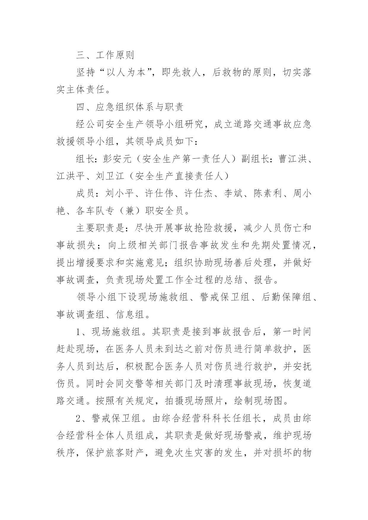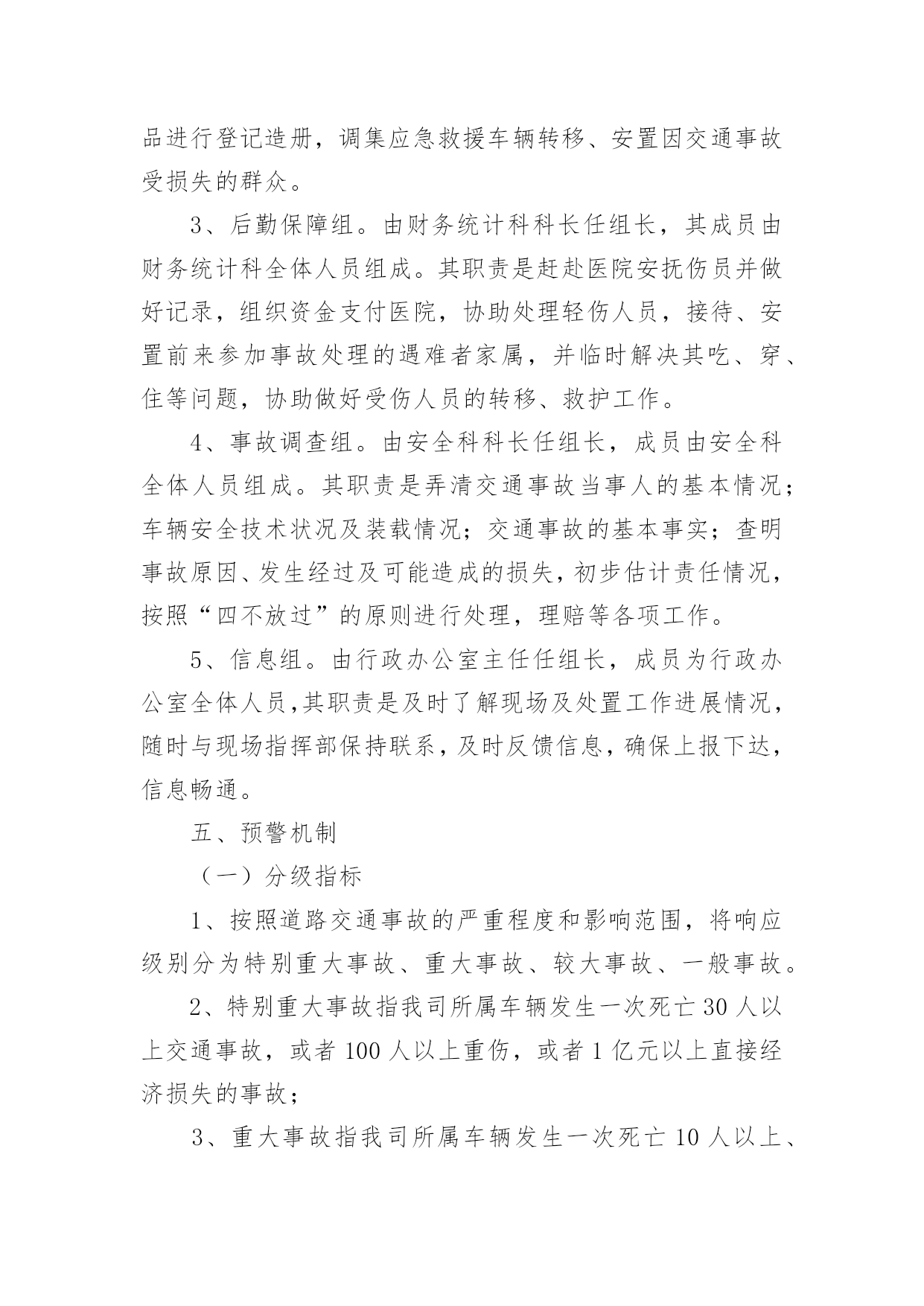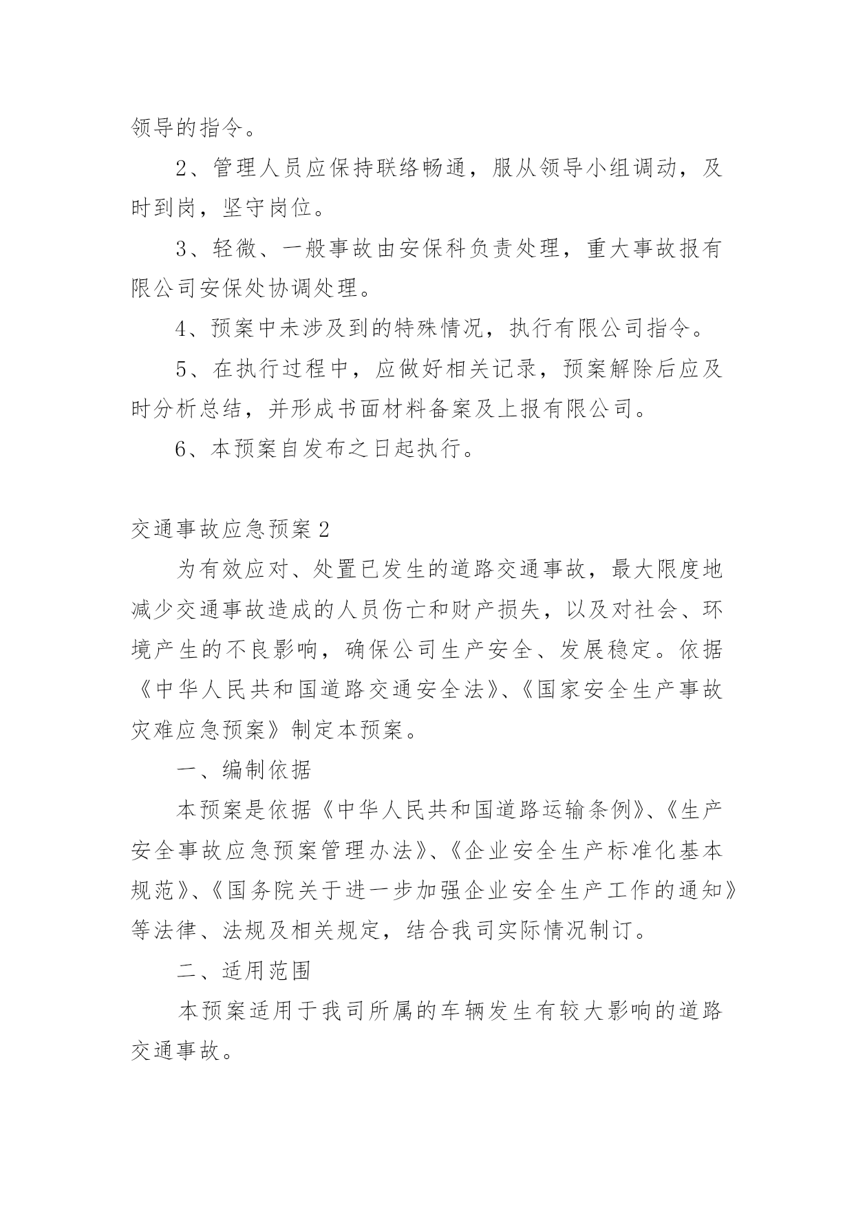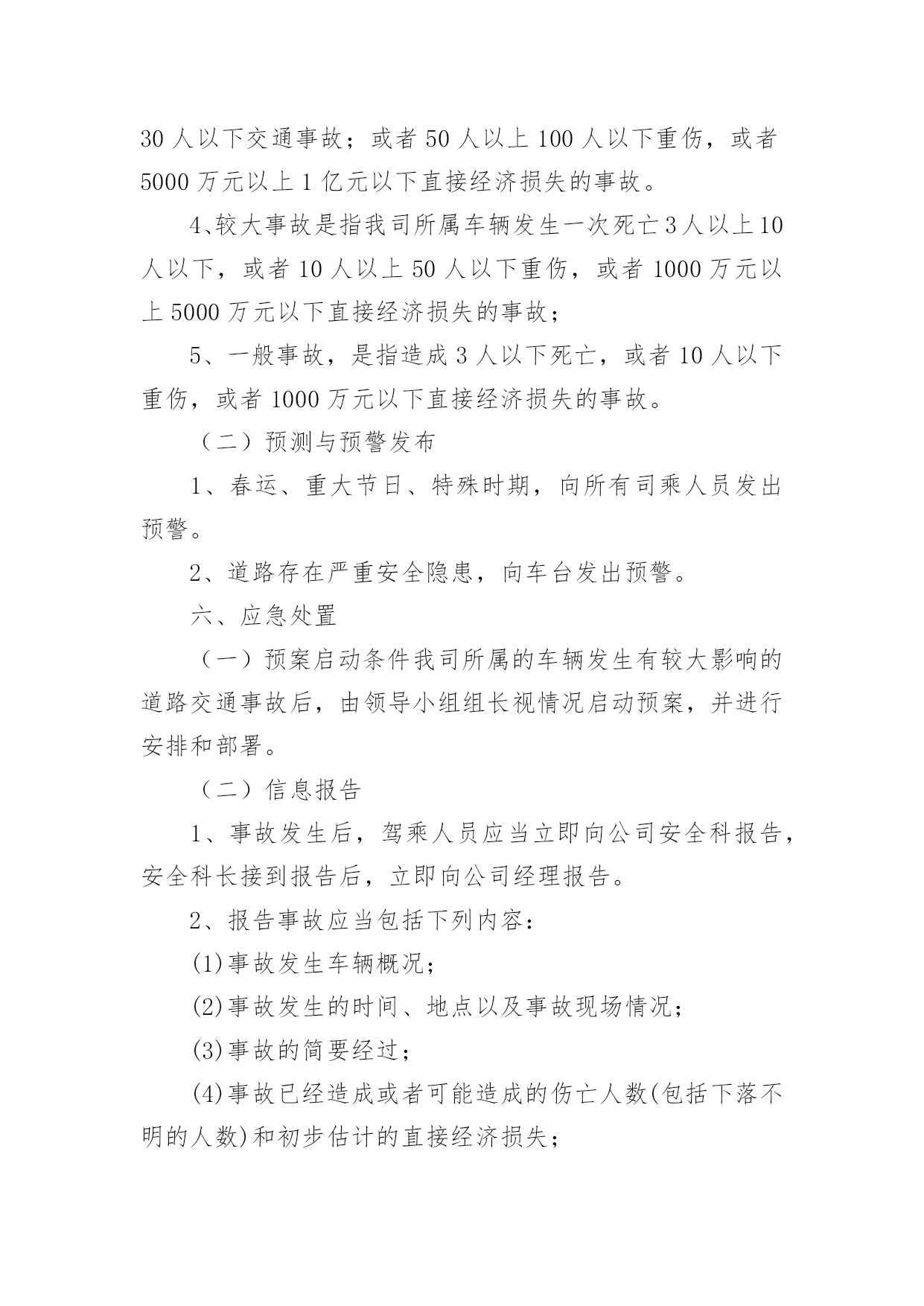 交通事故应急预案在平时的学习、工作或生活中,有时会出现一些突发事件,为了控制事故的发展,就有可能需要事先制定应急预案。怎样写应急预案才更能起到其作用呢?下面是小编为大家整理的交通事故应急预案,仅供参考,大家一起来看看吧。交通事故应急预案1一、基本原则:为进一步强化我公司春运安全生产管理工作,建立健全春运安全管理制度和安全生产事故处理应急救援机制,牢固树立“安全第一、预防为主、综合治理、防治结合”的宗旨,强化红线意识,提高赣榆公司安全生产事故的应急救援能力和事故处理的有效性,使安全生产事故处理更加规范化和程序化,进一步控制事态的发展,缩小影响减少损失,充分保障公司各项生产工作秩序稳定有序。依据有限公司有关文件的规定,针对公司的实际情况,制定20__年春运安全生产处理应急救援方案:二、组织机构:1、为加强春运方案的组织领导,确保公司在发生春运安全生产事故时,各项应急救援措施落实到位,快速、及时、有序的做好事故的处理工作,公司成立春运安全生产应急救援方案领导小组:组长:略副组长:略成员:略2、领导小组下设“事故应急救援处理处”,负责全面落实领导小组制定的各项应急措施和方案,办公地点设在公司安保科。3、领导小组职责:①负责事故处理应急预案的具体组织实施。②协调内外部关系,制定应急方案,向有限公司安保处报告安全生产事故和应急救援预案的执行情况。③组织相关人员赶赴事故现场,配合有关部门组织协调抢救和应急处置工作。④查明事故原因,评估事故损失。⑤根据事故性质,对有关责任人提出处理意见。⑥指导安保科制定防范措施。三、信息报告:1、各个科室应严格执行公司的信息报告制度,当发生安全生产事故时,事故现场当事人和相关人员应利用一切条件,迅速拨打当地的救援电话请求帮助,同时向公司领导小组报告案情。2、公司在接到报案后,应迅速查明案情,并以电话和传真方式,在规定时间内向有限公司安保处和保险公司报告事故的情况,涉及旅客意外伤害和商务事故应同时向有限公司客运处报告。四、事故报告的时限规定及后果预测:1、发生一般事故,事故发生方的驾驶员或承包业主应在事故发生后立即报告公司安保科,安保科立即派人赶赴事故现场,组织开展抢险救援等事故处理工作。安保科按事故等级时间规定上报安全处。2、发生重大事故,事故发生方的驾驶员或承包业主应在第一时间内报告公司安保科,安保科接报案后,应立即向有限公司安保处报告,并组织相关部门赶赴事故现场,组织协调抢险救援等事故处理工作。3、发生特大事故,事故发生方的驾驶员或承包业主应在最短时间内报告公司安保科,安保科接报后应立即向总公司安保处报告,事故报告时间最长不超过1小时,公司领导带领有关科室人员立即赶赴事故现场,组织协调抢险救援等事故处理工作,并随时向上级主管部门报告事故变化情况。4、各科室管理人员应保持通讯联络畅通,在预案启动后及时向公司报告各类有效信息。报告方式采用电话、传真或专人报告。5、安保科在查明案情后,应根据事故中的人员伤亡情况,财产的破坏程度和事故善后处理以及恢复生产所需的物资品种和资金的。需求量等方面的内容,进行事故的后果预测,并以书面形式报告有限公司安保处。五、应急救援预案的启动程序与响应:当发生重大以上安全生产事故,立即启动应急救援预案,应急预案的启动命令应有日值班领导下达,安保科为预案的具体组织者和实施部门,启动与响应程序为:1、道路交通事故、旅客意外伤害事故现场处置程序:①当发生安全生产事故后,事故当事人和相关人员应采取自救、互救措施,抢救伤员保护事故现场,并向当地公安机关和所在单位报告。②安保科接到报告后,应通过安络立即与公安部门和安全协作单位联系,了解事故发生的详细情况,并按规定的内容向总公司报告。③公司和安保科人员到达事故现场后,应立即会同公安、医疗机构组织抢救伤员和财产,减少事故损失。协助公安部门维持现场秩序,并对当事人再次进行询问。④事故处理人员必须做好伤亡人员亲属的思想稳定工作,防止矛盾激化,缩小事故影响。⑤制作图片和事故现场图,采集行车记录仪的数据,对事故发生原因进行初步分析。⑥对人员伤亡情况进行调查,调查的内容包括,伤亡人员的姓名、年龄、籍贯、工作单位、家庭成员及年龄、伤势程度等。⑦对车辆损失进行勘察,并会同保险公司和物价定损部门,对财产损失进行定损,确定车辆维修地点。⑧对事故所需的费用进行估算,督促当事人或承包人尽快筹集资金。2、其它事故现场处置程序:①事故处理相关人员到达事故现场后,应采取措施保护现场,并组织人员配合救援部门立即救护伤员,抢救财产。②对事故现场进行详细勘察,收集证据,查明事故原因。③对人员伤亡情况进行调查研究,调查的内容包括,伤亡人员的.姓名、年龄、籍贯、工作单位、家庭成员及年龄、伤势程度等。④对财产损失进行评估,确定事故直接经济损失。⑤制定善后处理方案,编制事故调查报告。六、