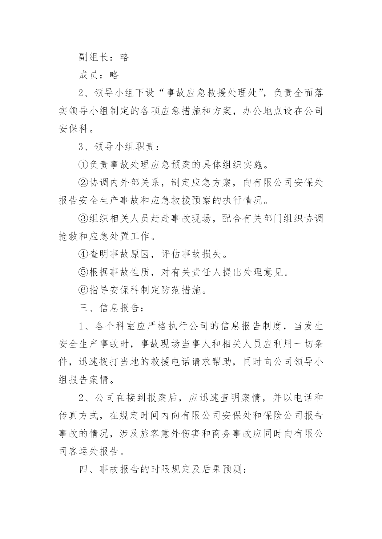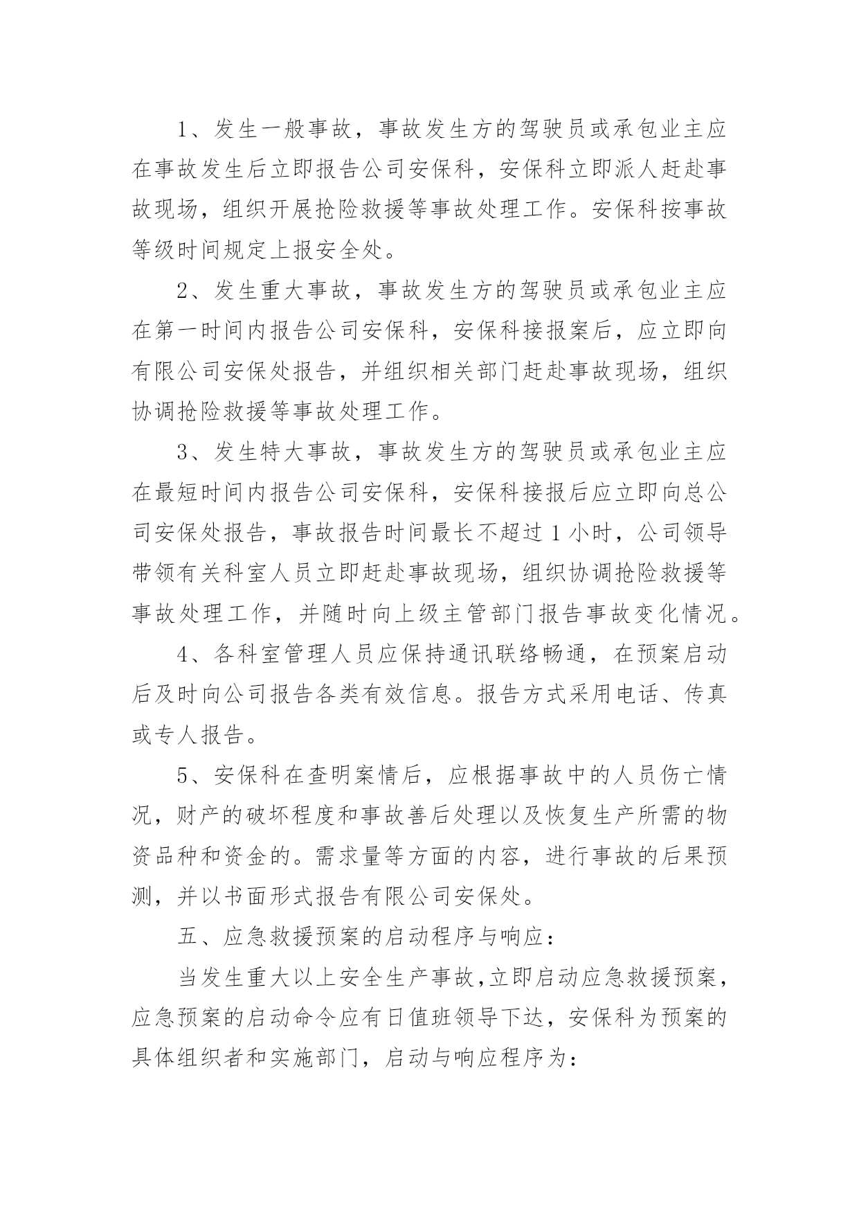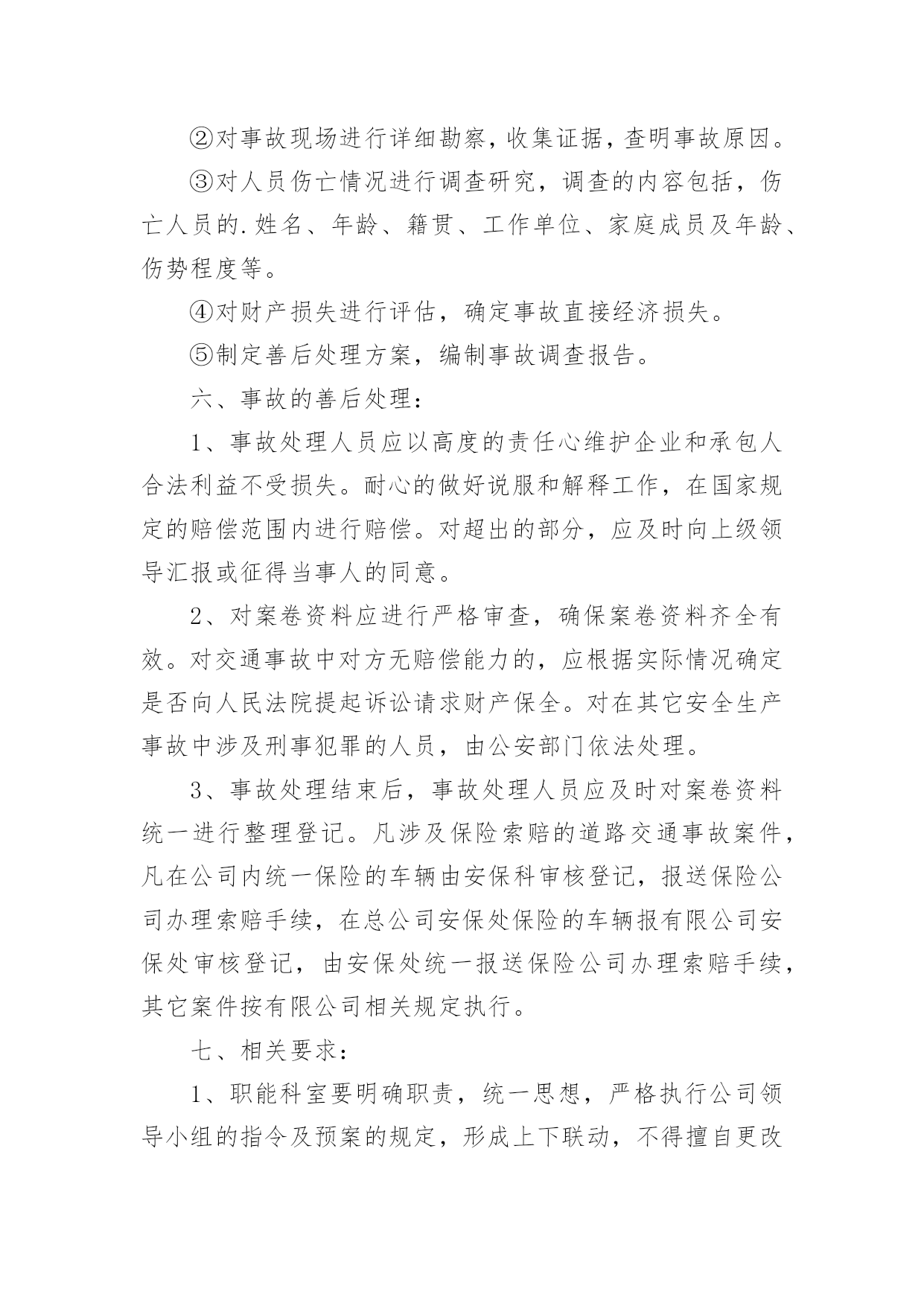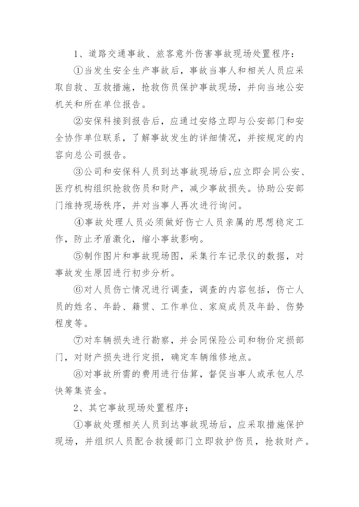 交通事故应急预案在平时的学习、工作或生活中,有时会出现一些突发事件,为了控制事故的发展,就有可能需要事先制定应急预案。怎样写应急预案才更能起到其作用呢?下面是小编为大家整理的交通事故应急预案,仅供参考,大家一起来看看吧。交通事故应急预案1一、基本原则:为进一步强化我公司春运安全生产管理工作,建立健全春运安全管理制度和安全生产事故处理应急救援机制,牢固树立“安全第一、预防为主、综合治理、防治结合”的宗旨,强化红线意识,提高赣榆公司安全生产事故的应急救援能力和事故处理的有效性,使安全生产事故处理更加规范化和程序化,进一步控制事态的发展,缩小影响减少损失,充分保障公司各项生产工作秩序稳定有序。依据有限公司有关文件的规定,针对公司的实际情况,制定20__年春运安全生产处理应急救援方案:二、组织机构:1、为加强春运方案的组织领导,确保公司在发生春运安全生产事故时,各项应急救援措施落实到位,快速、及时、有序的做好事故的处理工作,公司成立春运安全生产应急救援方案领导小组:组长:略副组长:略成员:略2、领导小组下设“事故应急救援处理处”,负责全面落实领导小组制定的各项应急措施和方案,办公地点设在公司安保科。3、领导小组职责:①负责事故处理应急预案的具体组织实施。②协调内外部关系,制定应急方案,向有限公司安保处报告安全生产事故和应急救援预案的执行情况。③组织相关人员赶赴事故现场,配合有关部门组织协调抢救和应急处置工作。④查明事故原因,评估事故损失。⑤根据事故性质,对有关责任人提出处理意见。⑥指导安保科制定防范措施。三、信息报告:1、各个科室应严格执行公司的信息报告制度,当发生安全生产事故时,事故现场当事人和相关人员应利用一切条件,迅速拨打当地的救援电话请求帮助,同时向公司领导小组报告案情。2、公司在接到报案后,应迅速查明案情,并以电话和传真方式,在规定时间内向有限公司安保处和保险公司报告事故的情况,涉及旅客意外伤害和商务事故应同时向有限公司客运处报告。四、事故报告的时限规定及后果预测:1、发生一般事故,事故发生方的驾驶员或承包业主应在事故发生后立即报告公司安保科,安保科立即派人赶赴事故现场,组织开展抢险救援等事故处理工作。安保科按事故等级时间规定上报安全处。2、发生重大事故,事故发生方的驾驶员或承包业主应在第一时间内报告公司安保科,安保科接报案后,应立即向有限公司安保处报告,并组织相关部门赶赴事故现场,组织协调抢险救援等事故处理工作。3、发生特大事故,事故发生方的驾驶员或承包业主应在最短时间内报告公司安保科,安保科接报后应立即向总公司安保处报告,事故报告时间最长不超过1小时,公司领导带领有关科室人员立即赶赴事故现场,组织协调抢险救援等事故处理工作,并随时向上级主管部门报告事故变化情况。4、各科室管理人员应保持通讯联络畅通,在预案启动后及时向公司报告各类有效信息。报告方式采用电话、传真或专人报告。5、安保科在查明案情后,应根据事故中的人员伤亡情况,财产的破坏程度和事故善后处理以及恢复生产所需的物资品种和资金的。需求量等方面的内容,进行事故的后果预测,并以书面形式报告有限公司安保处。五、应急救援预案的启动程序与响应:当发生重大以上安全生产事故,立即启动应急救援预案,应急预案的启动命令应有日值班领导下达,安保科为预案的具体组织者和实施部门,启动与响应程序为:1、道路交通事故、旅客意外伤害事故现场处置程序:①当发生安全生产事故后,事故当事人和相关人员应采取自救、互救措施,抢救伤员保护事故现场,并向当地公安机关和所在单位报告。②安保科接到报告后,应通过安络立即与公安部门和安全协作单位联系,了解事故发生的详细情况,并按规定的内容向总公司报告。③公司和安保科人员到达事故现场后,应立即会同公安、医疗机构组织抢救伤员和财产,减少事故损失。协助公安部门维持现场秩序,并对当事人再次进行询问。④事故处理人员必须做好伤亡人员亲属的思想稳定工作,防止矛盾激化,缩小事故影响。⑤制作图片和事故现场图,采集行车记录仪的数据,对事故发生原因进行初步分析。⑥对人员伤亡情况进行调查,调查的内容包括,伤亡人员的姓名、年龄、籍贯、工作单位、家庭成员及年龄、伤势程度等。⑦对车辆损失进行勘察,并会同保险公司和物价定损部门,对财产损失进行定损,确定车辆维修地点。⑧对事故所需的费用进行估算,督促当事人或承包人尽快筹集资金。2、其它事故现场处置程序:①事故处理相关人员到达事故现场后,应采取措施保护现场,并组织人员配合救援部门立即救护伤员,抢救财产。②对事故现场进行详细勘察,收集证据,查明事故原因。③对人员伤亡情况进行调查研究,调查的内容包括,伤亡人员的.姓名、年龄、籍贯、工作单位、家庭成员及年龄、伤势程度等。④对财产损失进行评估,确定事故直接经济损失。⑤制定善后处理方案,编制事故调查报告。六、