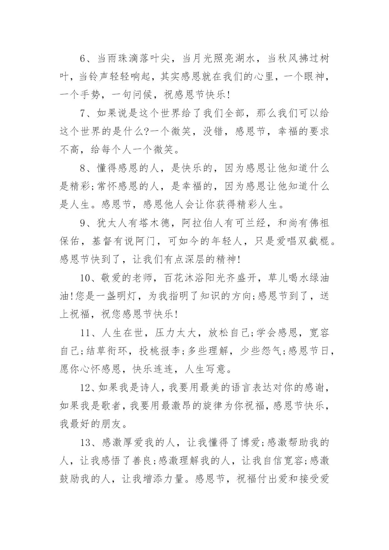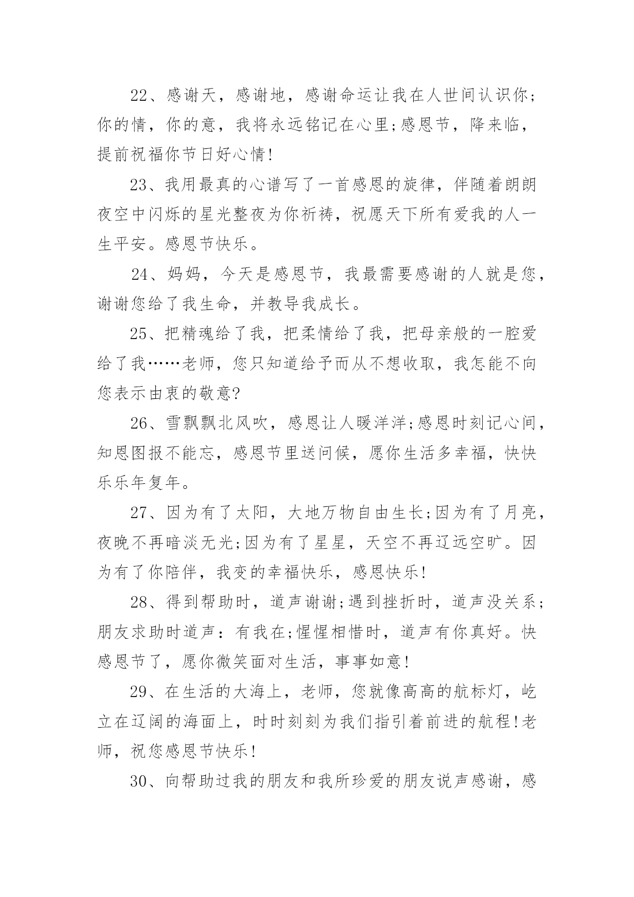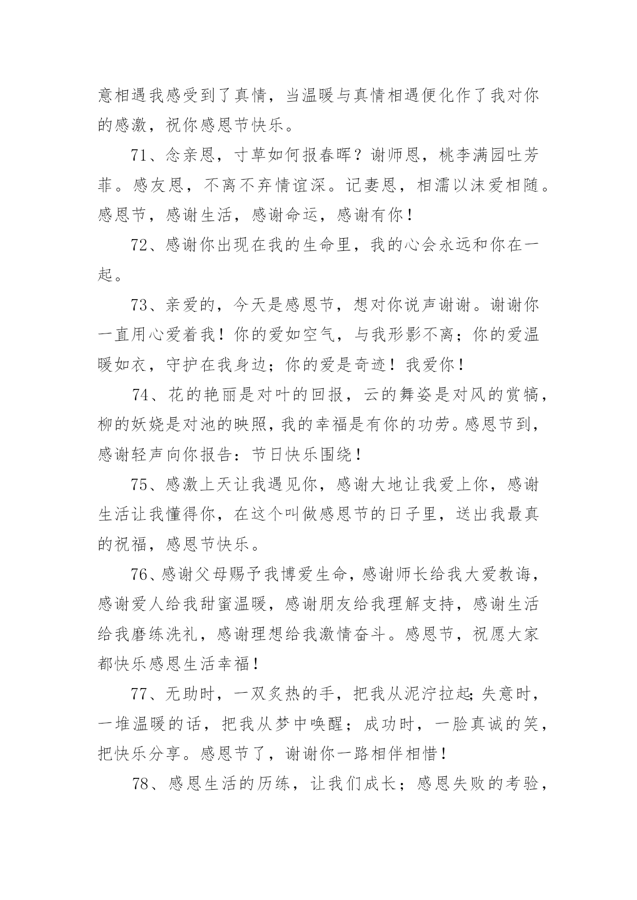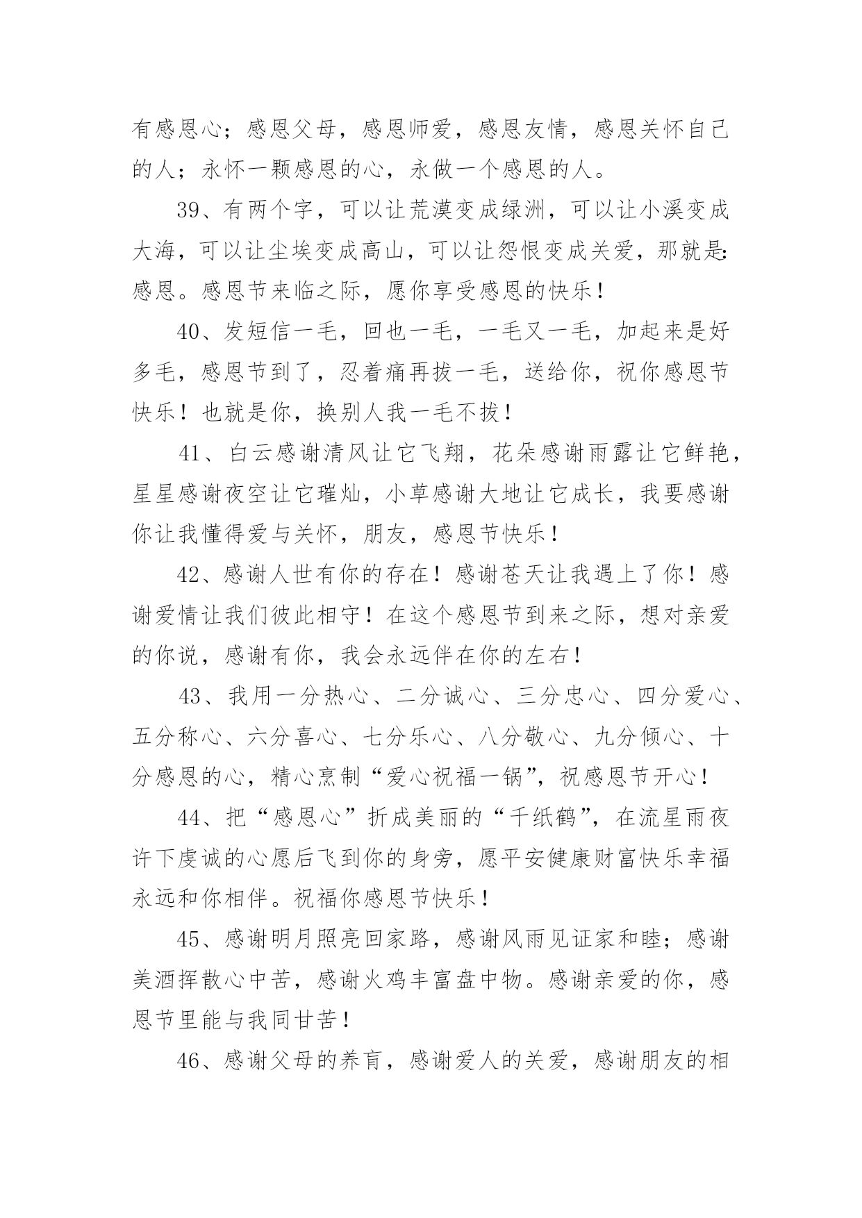 感恩节最火简单的文案感恩节最火简单的文案170句随着社交网络开始流行,越来越多人钟情于在社交平台上发布文案,文案在生活中是比较重要的一种宣传形式。那些火遍朋友圈的文案都是什么样的呢?下面是小编收集整理的感恩节最火简单的文案170句,仅供参考,欢迎大家阅读。1、在我孤独时是你告诉我什么是快乐,在我忧伤时是你告诉我什么是开心,在我哭泣时是你为我擦干泪水,感谢你我的朋友,感恩节快乐。2、友情是一盏明灯,照亮了我人生的黑暗;友情是一句问候,温暖了我孤冷的感觉;友情是一条短信,表达了我深深的谢意:感恩节来了,请接受我最真挚的心情,感谢路上有你同行,愿你幸福快乐,愿我们情谊源远流长!3、有一种花出泥不染,叫莲花;有一份情温暖人间,叫慈善;有一群人广施仁爱;叫慈辉;有一个我感触念于心,叫感恩;这个感恩节,祝你一生平安幸福快乐!4、有你的日子,冬天不会寒冷;有你的日子,黑夜里不会孤单;有你的日子,生活充满色彩;有的日子,让我学会了珍惜;愿天下父母感恩节快乐。5、燃起的炉火,带来了一丝温暖;烹制的火鸡,带来了一丝美好。感谢生命,感谢缘分,感谢情谊,感谢知己。感恩节即将到,人生因感恩而美丽,愿你一切如意。6、当雨珠滴落叶尖,当月光照亮湖水,当秋风拂过树叶,当铃声轻轻响起,其实感恩就在我们的心里,一个眼神,一个手势,一句问候,祝感恩节快乐!7、如果说是这个世界给了我们全部,那么我们可以给这个世界的是什么?一个微笑,没错,感恩节,幸福的要求不高,给每个人一个微笑。8、懂得感恩的人,是快乐的,因为感恩让他知道什么是精彩;常怀感恩的人,是幸福的,因为感恩让他知道什么是人生。感恩节,感恩他人会让你获得精彩人生。9、犹太人有塔木德,阿拉伯人有可兰经,和尚有佛祖保佑,基督有说阿门,可如今的年轻人,只是爱唱双截棍。感恩节快到了,让我们有点深层的精神!10、敬爱的老师,百花沐浴阳光齐盛开,草儿喝水绿油油!您是一盏明灯,为我指明了知识的方向;感恩节到了,送上祝福,祝您感恩节快乐!11、人生在世,压力太大,放松自己;学会感恩,宽容自己;结草衔环,投桃报李;多些理解,少些怨气;感恩节日,愿你心怀感恩,快乐连连,人生写意。12、如果我是诗人,我要用最美的语言表达对你的感谢,如果我是歌者,我要用最激昂的旋律为你祝福,感恩节快乐,我最好的朋友。13、感激厚爱我的人,让我懂得了博爱;感激帮助我的人,让我感悟了善良;感激理解我的人,让我自信宽容;感激鼓励我的人,让我增添力量。感恩节,祝福付出爱和接受爱的人都幸福快乐!14、为了让我懂得生活,您付出了全部的爱,为了让我懂得人生,您付出了一生的心血,今天是感恩节,真心的谢谢您。祝你永远幸福。15、是火鸡,就该是感恩节的主角;是朋友,就该记在心中;感恩节到了,不送你火鸡,祝你往后的日子像火鸡同样美味。16、每个阳光灿烂的日子,都会让我心存感谢!在这个感恩节,真心的感谢你,让我可以以坚强的意志和无谓的精神,抗击酷暑严寒,风雨雷电,而不觉疲惫和孤单。17、感谢明月照亮夜空,感谢朝阳捧出黎明,感谢父母赋予我生命,感谢朋友伴随我成长,让我们怀着一颗感恩的心去生活,感恩节快乐!18、恩节,有钱的捧个钱场,没钱的借钱捧个钱场,有恩的赶紧报恩,有怨的不要折腾。敞开心门,打起精神,拥一颗感恩的心,快乐整个人生。19、只要我们时时怀着一颗感恩的心,爱情就会天长地久,事业就会马到成功,家庭就会美满幸福,身体就会健康平安。感谢周围所有的人。感恩节快乐!20、因为能认识你而感到难忘,因为喜欢上你而感到快乐,会因为能得到你的爱而感到满足。祝你感恩节快乐!21、忆往昔,孤单时有你,落寞时有你,沮丧时有你,无助时有你;展明朝,快乐时有你,庆祝时有你,开心时有你,收获时有你,用我的心爱你。22、感谢天,感谢地,感谢命运让我在人世间认识你;你的情,你的意,我将永远铭记在心里;感恩节,降来临,提前祝福你节日好心情!23、我用最真的心谱写了一首感恩的旋律,伴随着朗朗夜空中闪烁的星光整夜为你祈祷,祝愿天下所有爱我的人一生平安。感恩节快乐。24、妈妈,今天是感恩节,我最需要感谢的人就是您,谢谢您给了我生命,并教导我成长。25、把精魂给了我,把柔情给了我,把母亲般的一腔爱给了我……老师,您只知道给予而从不想收取,我怎能不向您表示由衷的敬意?26、雪飘飘北风吹,感恩让人暖洋洋;感恩时刻记心间,知恩图报不能忘,感恩节里送问候,愿你生活多幸福,快快乐乐年复年。27、因为有了太阳,大地万物自由生长;因为有了月亮,夜晚不再暗淡无光;因为有了星星,天空不再辽远空旷。因为有了你陪伴,我变的幸福快乐,感恩快乐!28、得到帮助时,道声谢谢;遇到挫折时,道声没关系;朋友求助时道声:有我在;惺惺相惜时,道声有你真好。快感恩节了,愿你微笑面对生活,事事如意!29、在生活的大海上,老师,您就像高高的航
