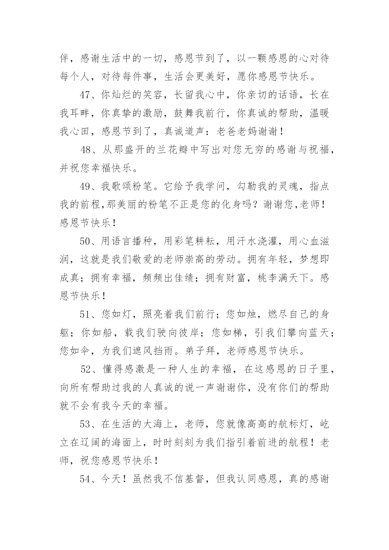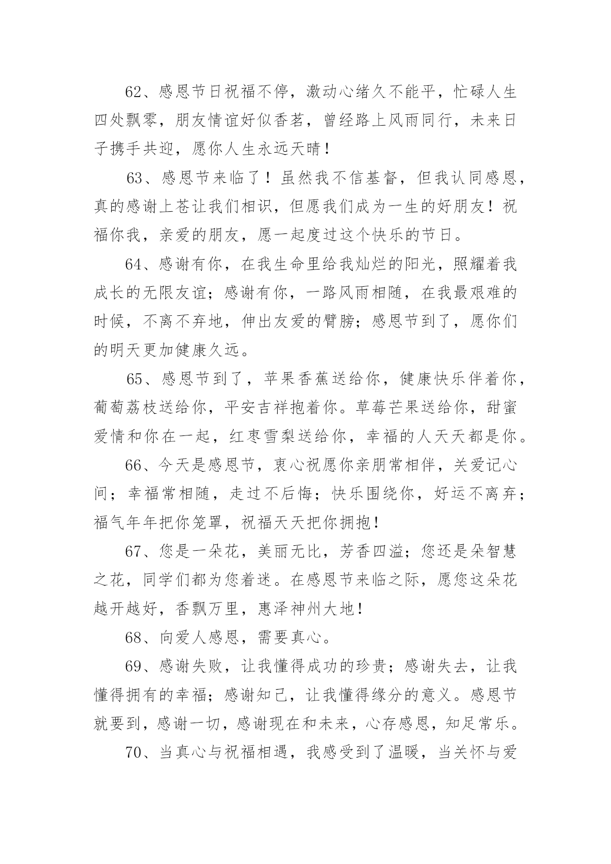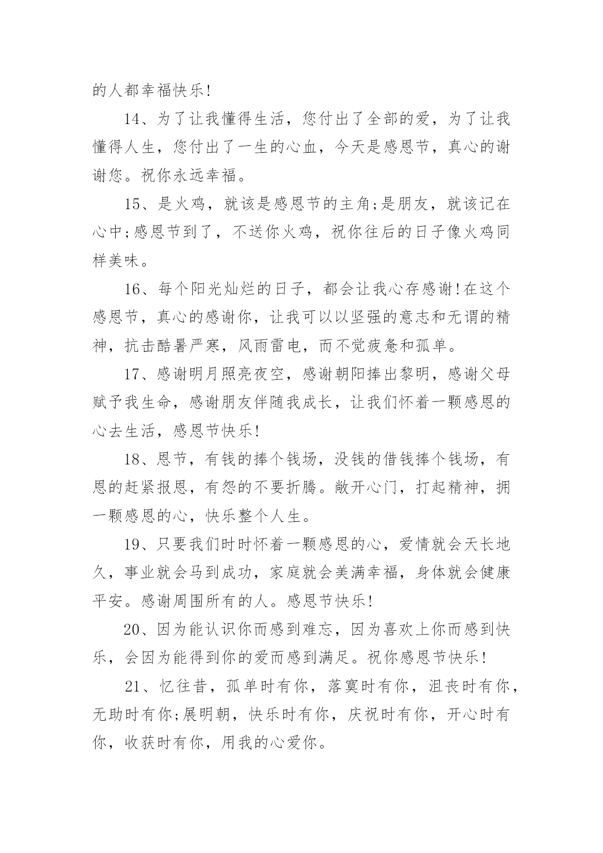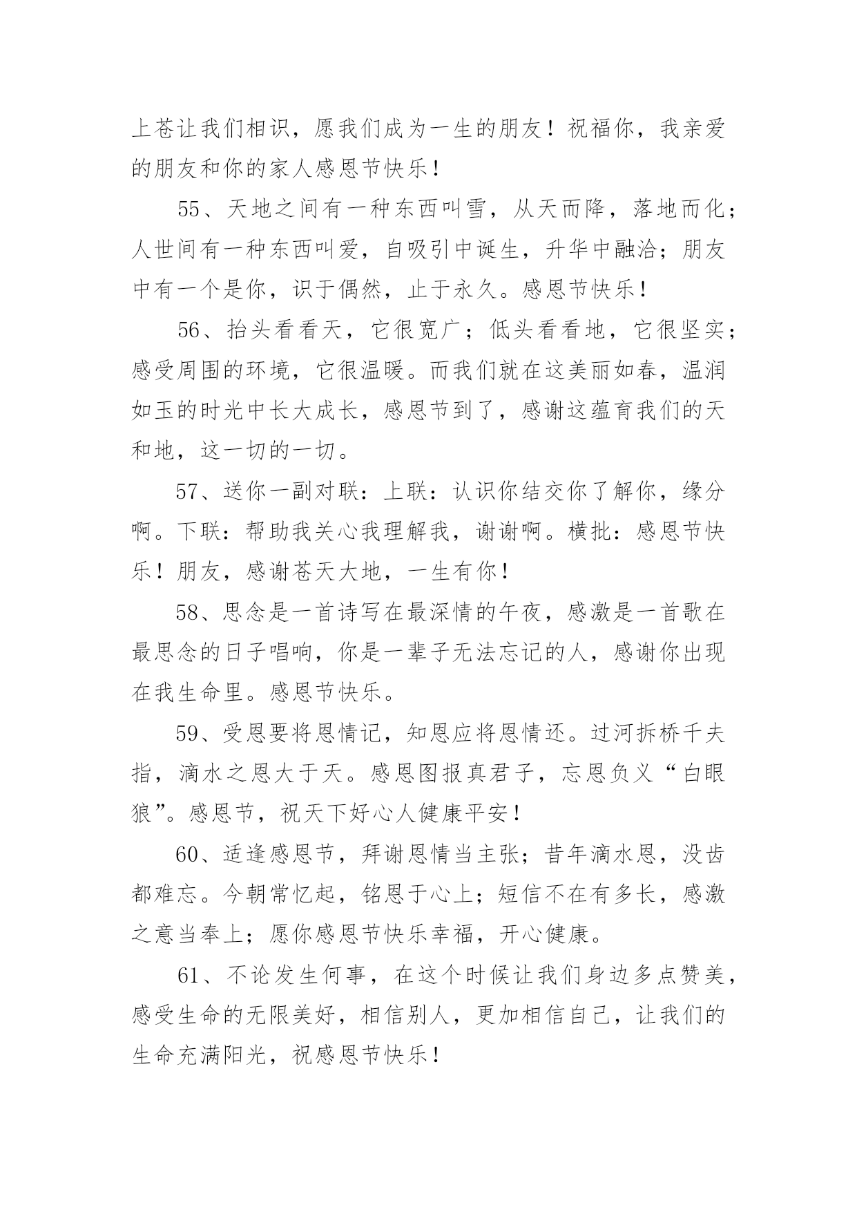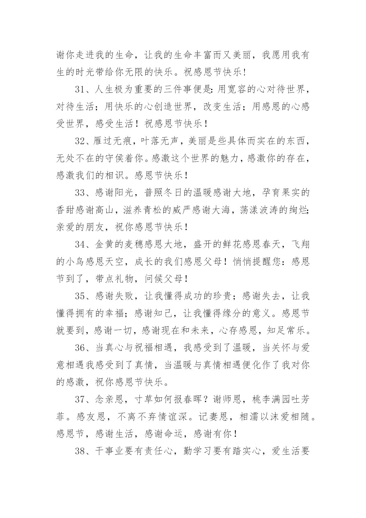 感恩节最火简单的文案感恩节最火简单的文案170句随着社交网络开始流行,越来越多人钟情于在社交平台上发布文案,文案在生活中是比较重要的一种宣传形式。那些火遍朋友圈的文案都是什么样的呢?下面是小编收集整理的感恩节最火简单的文案170句,仅供参考,欢迎大家阅读。1、在我孤独时是你告诉我什么是快乐,在我忧伤时是你告诉我什么是开心,在我哭泣时是你为我擦干泪水,感谢你我的朋友,感恩节快乐。2、友情是一盏明灯,照亮了我人生的黑暗;友情是一句问候,温暖了我孤冷的感觉;友情是一条短信,表达了我深深的谢意:感恩节来了,请接受我最真挚的心情,感谢路上有你同行,愿你幸福快乐,愿我们情谊源远流长!3、有一种花出泥不染,叫莲花;有一份情温暖人间,叫慈善;有一群人广施仁爱;叫慈辉;有一个我感触念于心,叫感恩;这个感恩节,祝你一生平安幸福快乐!4、有你的日子,冬天不会寒冷;有你的日子,黑夜里不会孤单;有你的日子,生活充满色彩;有的日子,让我学会了珍惜;愿天下父母感恩节快乐。5、燃起的炉火,带来了一丝温暖;烹制的火鸡,带来了一丝美好。感谢生命,感谢缘分,感谢情谊,感谢知己。感恩节即将到,人生因感恩而美丽,愿你一切如意。6、当雨珠滴落叶尖,当月光照亮湖水,当秋风拂过树叶,当铃声轻轻响起,其实感恩就在我们的心里,一个眼神,一个手势,一句问候,祝感恩节快乐!7、如果说是这个世界给了我们全部,那么我们可以给这个世界的是什么?一个微笑,没错,感恩节,幸福的要求不高,给每个人一个微笑。8、懂得感恩的人,是快乐的,因为感恩让他知道什么是精彩;常怀感恩的人,是幸福的,因为感恩让他知道什么是人生。感恩节,感恩他人会让你获得精彩人生。9、犹太人有塔木德,阿拉伯人有可兰经,和尚有佛祖保佑,基督有说阿门,可如今的年轻人,只是爱唱双截棍。感恩节快到了,让我们有点深层的精神!10、敬爱的老师,百花沐浴阳光齐盛开,草儿喝水绿油油!您是一盏明灯,为我指明了知识的方向;感恩节到了,送上祝福,祝您感恩节快乐!11、人生在世,压力太大,放松自己;学会感恩,宽容自己;结草衔环,投桃报李;多些理解,少些怨气;感恩节日,愿你心怀感恩,快乐连连,人生写意。12、如果我是诗人,我要用最美的语言表达对你的感谢,如果我是歌者,我要用最激昂的旋律为你祝福,感恩节快乐,我最好的朋友。13、感激厚爱我的人,让我懂得了博爱;感激帮助我的人,让我感悟了善良;感激理解我的人,让我自信宽容;感激鼓励我的人,让我增添力量。感恩节,祝福付出爱和接受爱的人都幸福快乐!14、为了让我懂得生活,您付出了全部的爱,为了让我懂得人生,您付出了一生的心血,今天是感恩节,真心的谢谢您。祝你永远幸福。15、是火鸡,就该是感恩节的主角;是朋友,就该记在心中;感恩节到了,不送你火鸡,祝你往后的日子像火鸡同样美味。16、每个阳光灿烂的日子,都会让我心存感谢!在这个感恩节,真心的感谢你,让我可以以坚强的意志和无谓的精神,抗击酷暑严寒,风雨雷电,而不觉疲惫和孤单。17、感谢明月照亮夜空,感谢朝阳捧出黎明,感谢父母赋予我生命,感谢朋友伴随我成长,让我们怀着一颗感恩的心去生活,感恩节快乐!18、恩节,有钱的捧个钱场,没钱的借钱捧个钱场,有恩的赶紧报恩,有怨的不要折腾。敞开心门,打起精神,拥一颗感恩的心,快乐整个人生。19、只要我们时时怀着一颗感恩的心,爱情就会天长地久,事业就会马到成功,家庭就会美满幸福,身体就会健康平安。感谢周围所有的人。感恩节快乐!20、因为能认识你而感到难忘,因为喜欢上你而感到快乐,会因为能得到你的爱而感到满足。祝你感恩节快乐!21、忆往昔,孤单时有你,落寞时有你,沮丧时有你,无助时有你;展明朝,快乐时有你,庆祝时有你,开心时有你,收获时有你,用我的心爱你。22、感谢天,感谢地,感谢命运让我在人世间认识你;你的情,你的意,我将永远铭记在心里;感恩节,降来临,提前祝福你节日好心情!23、我用最真的心谱写了一首感恩的旋律,伴随着朗朗夜空中闪烁的星光整夜为你祈祷,祝愿天下所有爱我的人一生平安。感恩节快乐。24、妈妈,今天是感恩节,我最需要感谢的人就是您,谢谢您给了我生命,并教导我成长。25、把精魂给了我,把柔情给了我,把母亲般的一腔爱给了我……老师,您只知道给予而从不想收取,我怎能不向您表示由衷的敬意?26、雪飘飘北风吹,感恩让人暖洋洋;感恩时刻记心间,知恩图报不能忘,感恩节里送问候,愿你生活多幸福,快快乐乐年复年。27、因为有了太阳,大地万物自由生长;因为有了月亮,夜晚不再暗淡无光;因为有了星星,天空不再辽远空旷。因为有了你陪伴,我变的幸福快乐,感恩快乐!28、得到帮助时,道声谢谢;遇到挫折时,道声没关系;朋友求助时道声:有我在;惺惺相惜时,道声有你真好。快感恩节了,愿你微笑面对生活,事事如意!29、在生活的大海上,老师,您就像高高的航