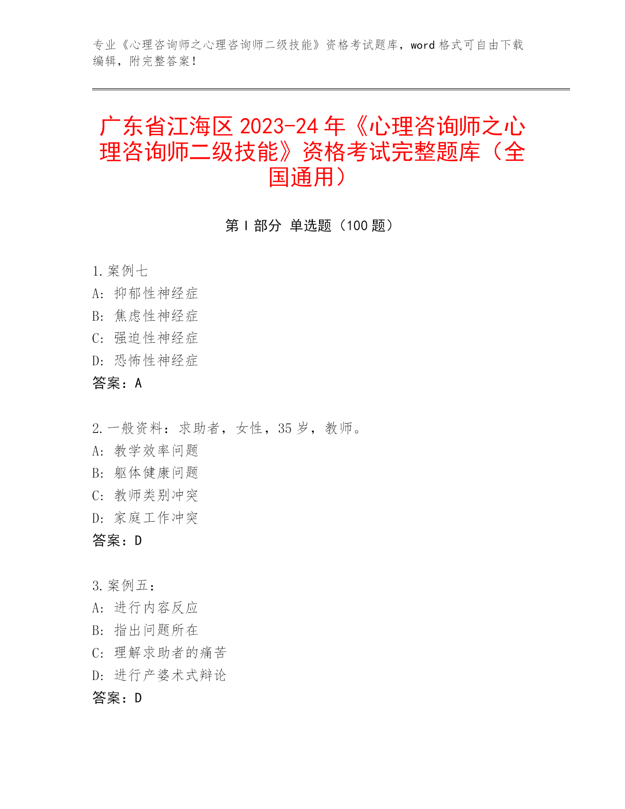 广东省江海区2023-24年《心理咨询师之心理咨询师二级技能》资格考试完整题库(全国通用)