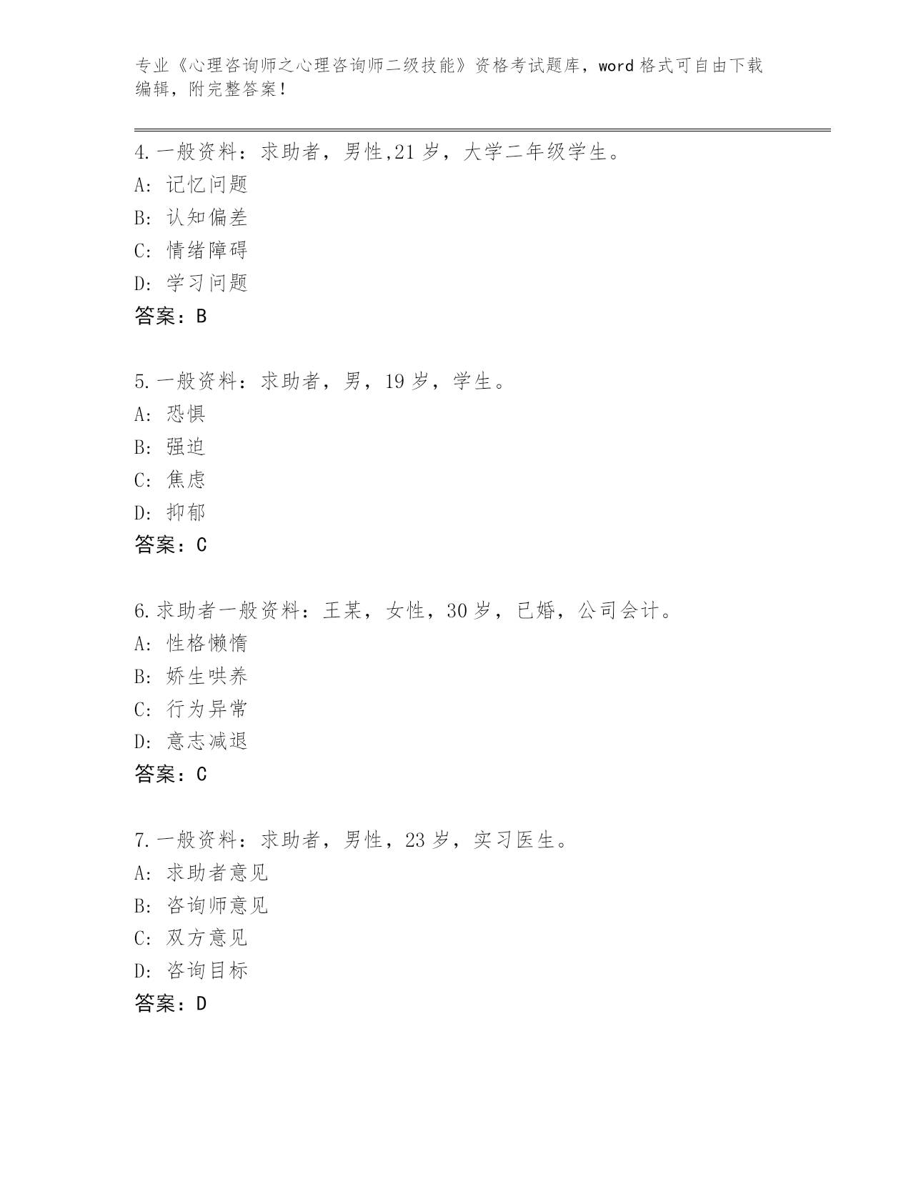 2024年广东省江海区《心理咨询师之心理咨询师二级技能》资格考试必刷200题题库加答案