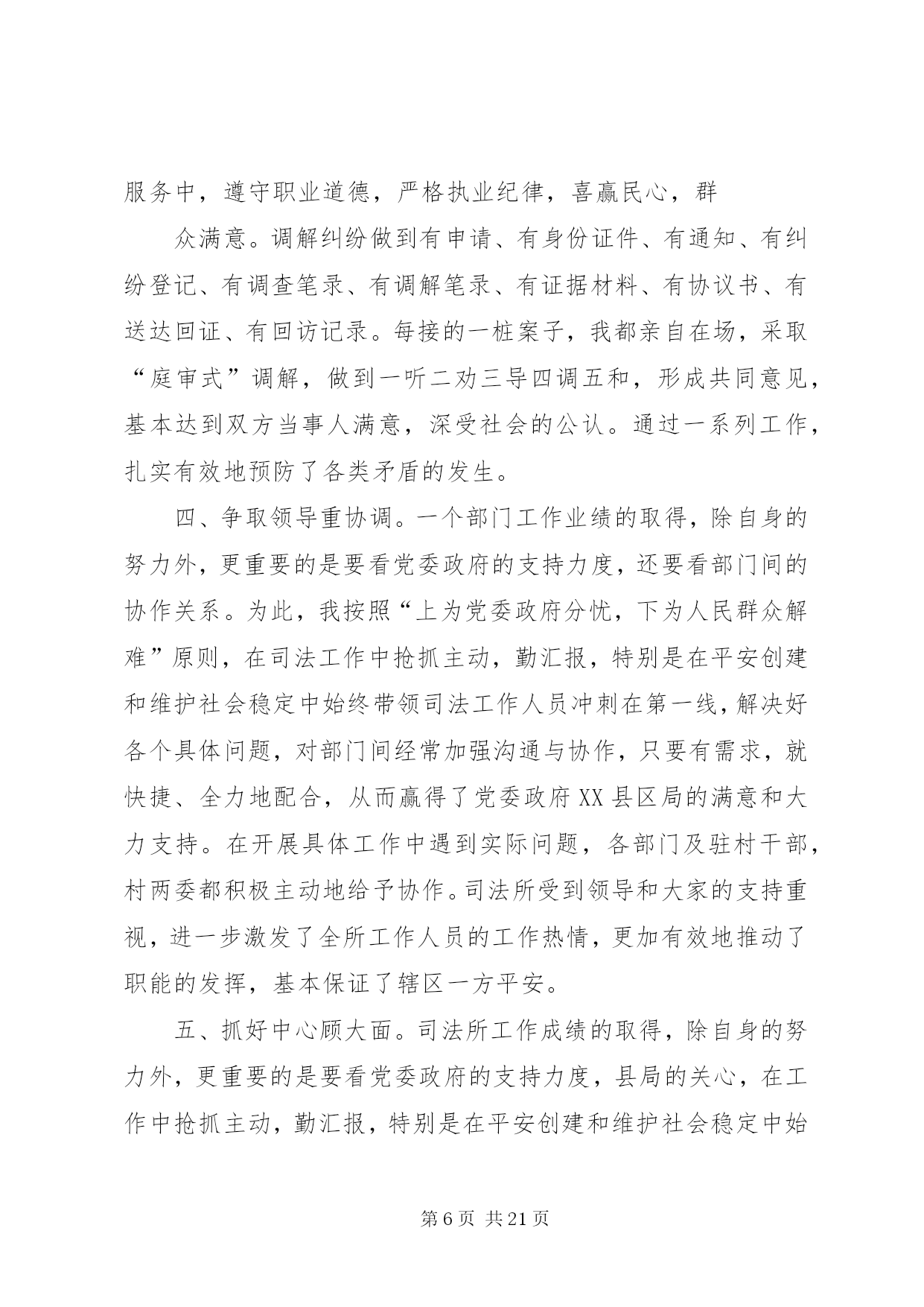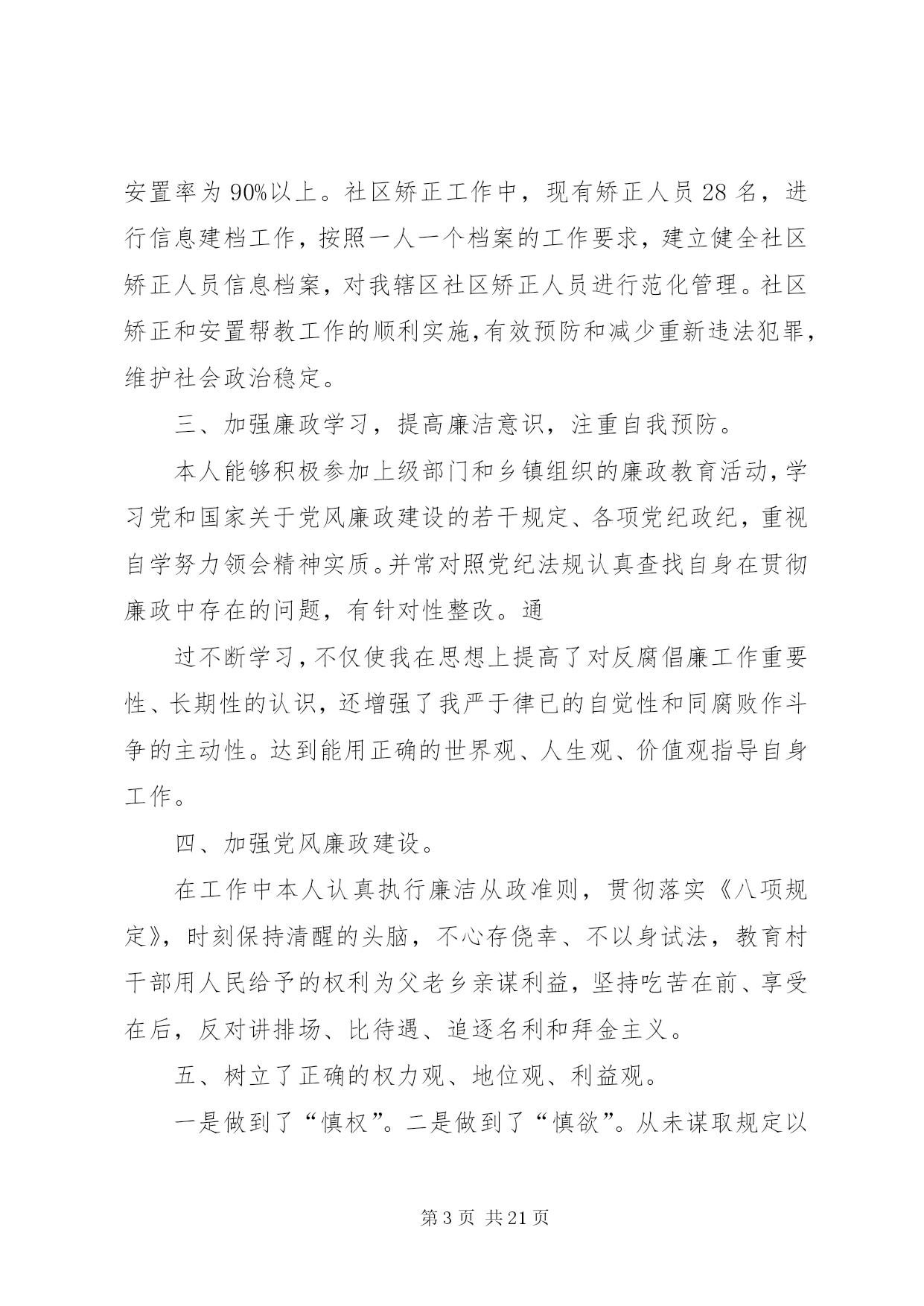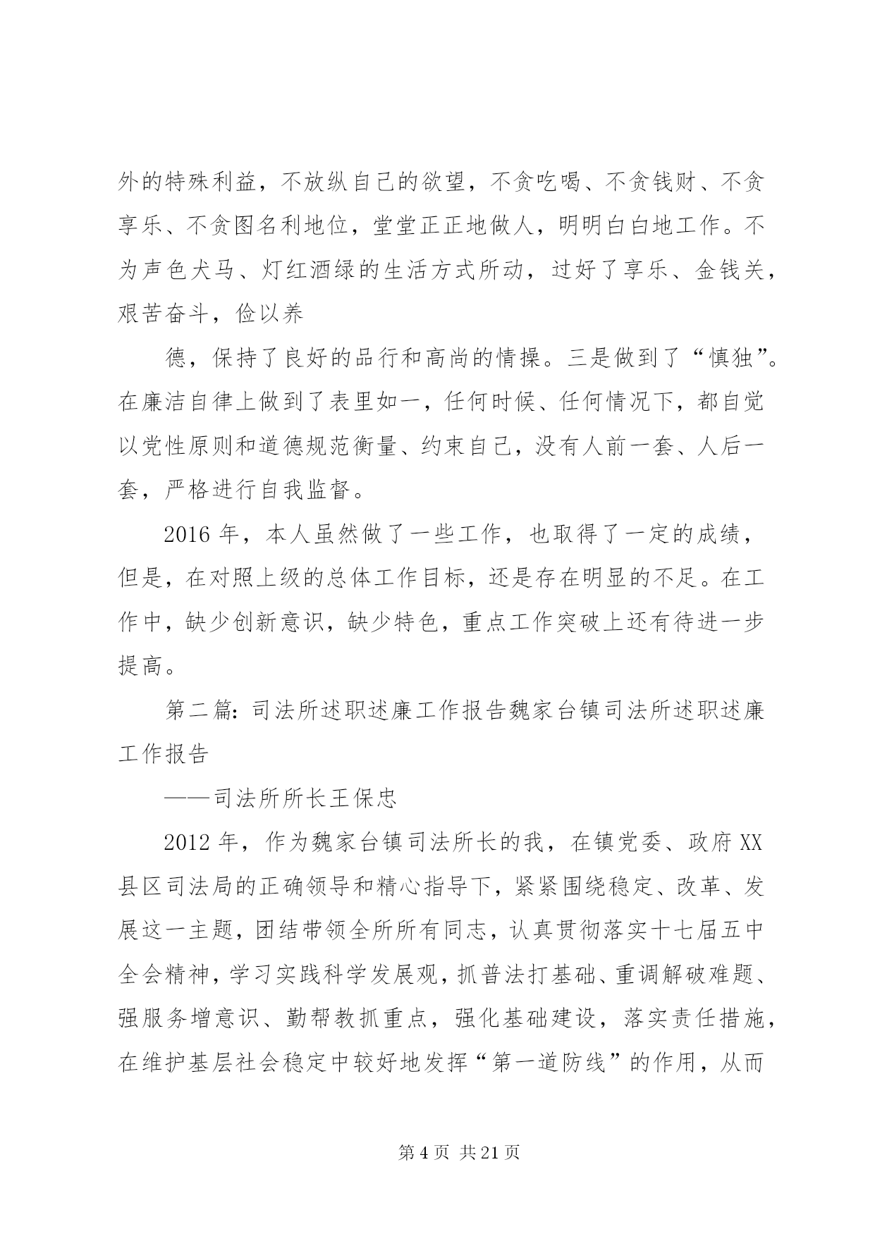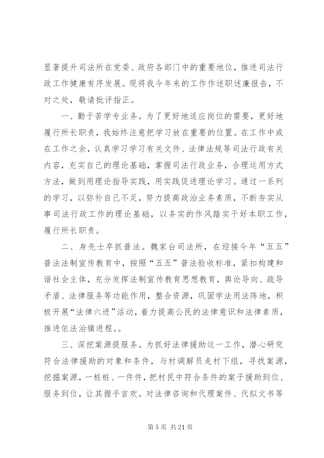 第PAGE\*Arabic\*MERGEFORMAT21页共NUMPAGES\*MERGEFORMAT21页司法所长XX年度述职述廉报告今年以来,本人在县司法局和镇党委、政府的正确领导下,以党的十八届五中全会精神、及省、市、县有关会议精神为指导,紧紧围绕镇党委、政府中心工作,积极推动依法治理,扎实开展人民调解工作,着力完成刑释解教、社区矫正和“七五”普法各项任务,现就自己今年来工作和廉洁自律情况汇报如下:一、加强政治理论学习和业务学习,全面提高自身素质我始终把学习和更新知识结构放在日常工作的重要部分,尤其是在学习贯彻党的群众路线教育活动中,我深入学习习总书记的讲话精神,重点学习党的路线、方针和政策,认真学习基层工作方式方法、业务知识,提高了自身综合知识水平。二、履行职责,全力做好各项工作(一)加强普法依法治理工作。按年初制定的《岩瑞镇2016年普法依法治理工作要点》,突出重点,创新思路,完善各项措施,把法制宣传延伸到各个领域,全面推动了普法工作及依法治理工作。以多种形式、多层面的开展好法制宣传教育。突出工作重点,创新形式的开展法制教育:一是注重领导干部和机关人员的学法用法,坚持和完善党委理论学习中心组集体学法制度。二是加强在校学生的法制宣传教育。充分利用校方组织的活动,开展生动活泼的法制教育。6月份,在岩瑞中心小学进行了《如何预防青少年犯罪》的法制教育课,近六百师生接受了生动的法制教育。三是抓农村和农村“两委”班子的法律知识的培训学习。结合农村工作实际,如赔偿、土地流转等,加强农村法制宣传教育基础设施建设,大力开展适合农民特点的法制宣传教育,利用广播、电视、板报、法律书角、远程教育网、赶集等形式,广泛宣传,同时对村“两委”班子采取以会代训和法制讲座、远程教育等形式。(二)人民调解工作。近年来,我们从调解的大量的民间纠纷中发现,有四大类纠纷比较突出,一是家庭纠纷多,二是邻里纠纷多,三是土地纠纷多,四是人身损害赔偿纠纷多。2016年我所以贯彻《人民调解法》为抓手,层层培训,全力提升人民调解工作水平,并积极开展“争当人民调解能手”活动,共发生各类纠纷70起,调解率达98%,调解成功率达95%,没有一起纠纷因调解不及时或不合法引起民转刑,民转非案件,较好地发挥了在社会治安综合治理第一道防线的作用,为我镇的社会稳定起到了积极作用。(三)加强审前调查评估、安置帮教、社区矫正,为创建“平安岩瑞”尽职尽力。2016年共对10名犯罪嫌疑人进行审前调查,准确掌握他们的平时情况。在安置帮教中致2016年11月底的回归人员为13名,进行跟踪排忧解难,解决他们的实际问题,帮教率达100%,安置率为90%以上。社区矫正工作中,现有矫正人员28名,进行信息建档工作,按照一人一个档案的工作要求,建立健全社区矫正人员信息档案,对我辖区社区矫正人员进行范化管理。社区矫正和安置帮教工作的顺利实施,有效预防和减少重新违法犯罪,维护社会政治稳定。三、加强廉政学习,提高廉洁意识,注重自我预防。本人能够积极参加上级部门和乡镇组织的廉政教育活动,学习党和国家关于党风廉政建设的若干规定、各项党纪政纪,重视自学努力领会精神实质。并常对照党纪法规认真查找自身在贯彻廉政中存在的问题,有针对性整改。通过不断学习,不仅使我在思想上提高了对反腐倡廉工作重要性、长期性的认识,还增强了我严于律已的自觉性和同腐败作斗争的主动性。达到能用正确的世界观、人生观、价值观指导自身工作。四、加强党风廉政建设。在工作中本人认真执行廉洁从政准则,贯彻落实《八项规定》,时刻保持清醒的头脑,不心存侥幸、不以身试法,教育村干部用人民给予的权利为父老乡亲谋利益,坚持吃苦在前、享受在后,反对讲排场、比待遇、追逐名利和拜金主义。五、树立了正确的权力观、地位观、利益观。一是做到了“慎权”。二是做到了“慎欲”。从未谋取规定以外的特殊利益,不放纵自己的欲望,不贪吃喝、不贪钱财、不贪享乐、不贪图名利地位,堂堂正正地做人,明明白白地工作。不为声色犬马、灯红酒绿的生活方式所动,过好了享乐、金钱关,艰苦奋斗,俭以养德,保持了良好的品行和高尚的情操。三是做到了“慎独”。在廉洁自律上做到了表里如一,任何时候、任何情况下,都自觉以党性原则和道德规范衡量、约束自己,没有人前一套、人后一套,严格进行自我监督。2016年,本人虽然做了一些工作,也取得了一定的成绩,但是,在对照上级的总体工作目标,还是存在明显的不足。在工作中,缺少创新意识,缺少特色,重点工作突破上还有待进一步提高。第二篇:司法所述职述廉工作报告魏家台镇司法所述职述廉工作报告——司法所所长王保忠2012年,作为魏家台镇司法所长的我,在镇党委、政府XX县区司法局的正确领导和精心指导下,紧紧围绕稳定、改革、发展这一主题,团结带领全所所有同志,认真贯彻落实十七届