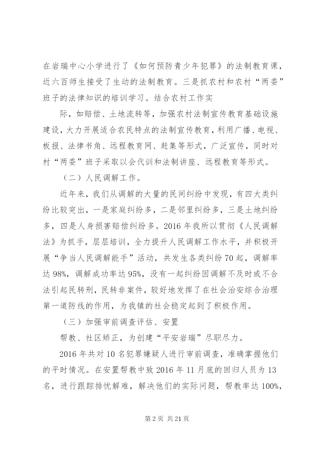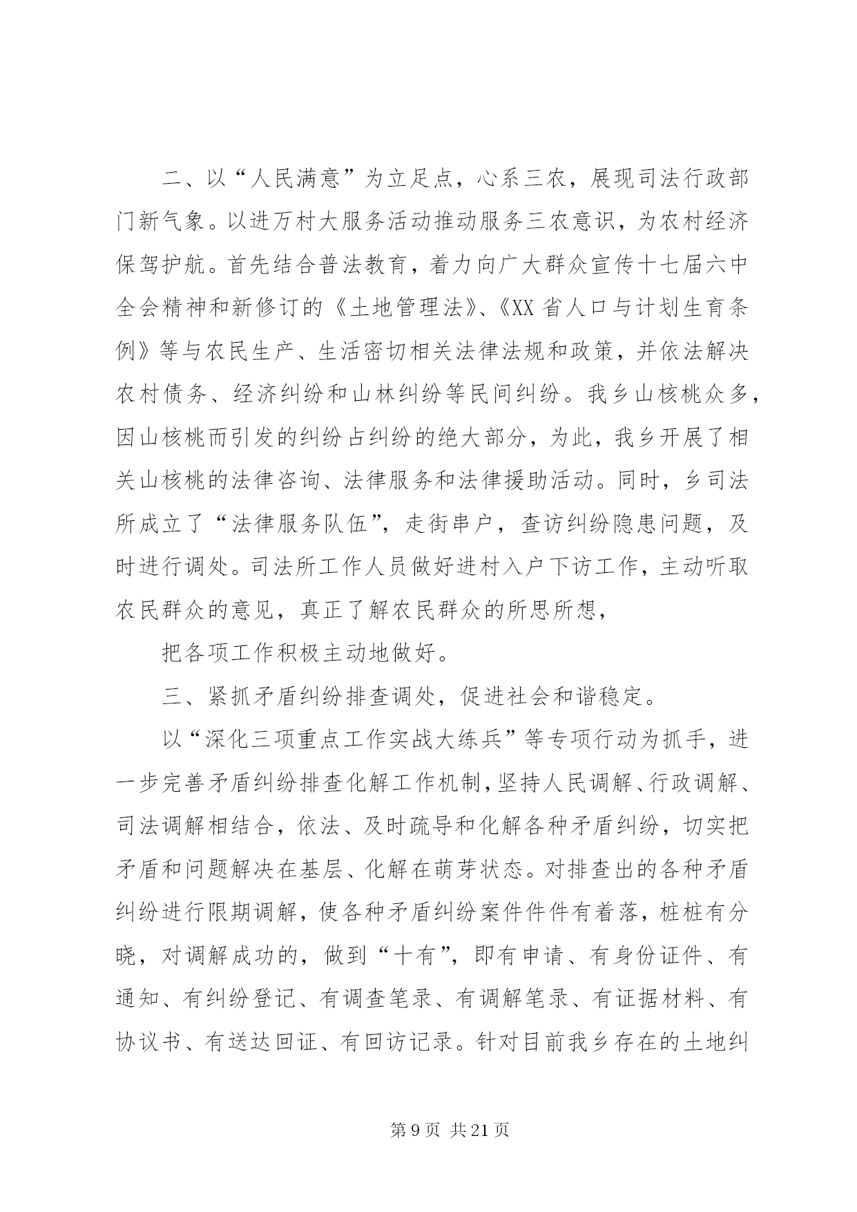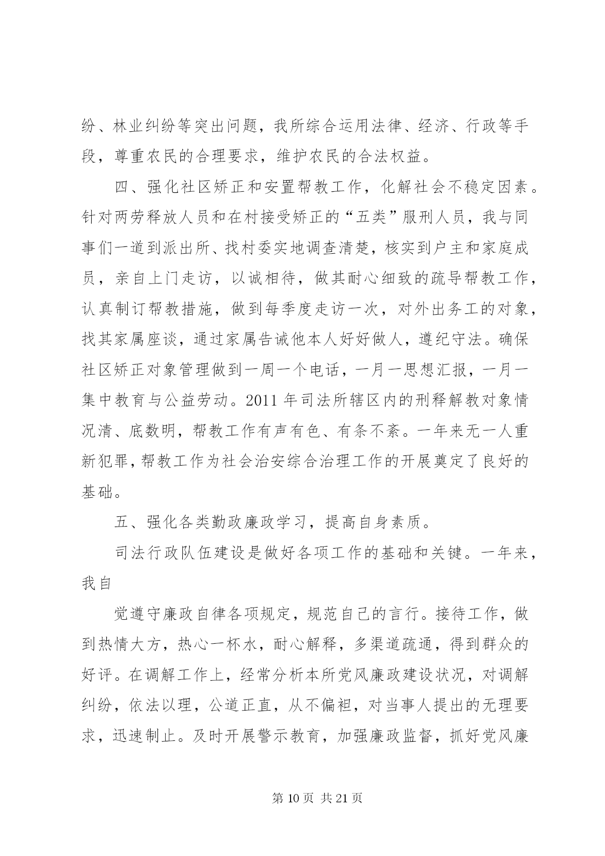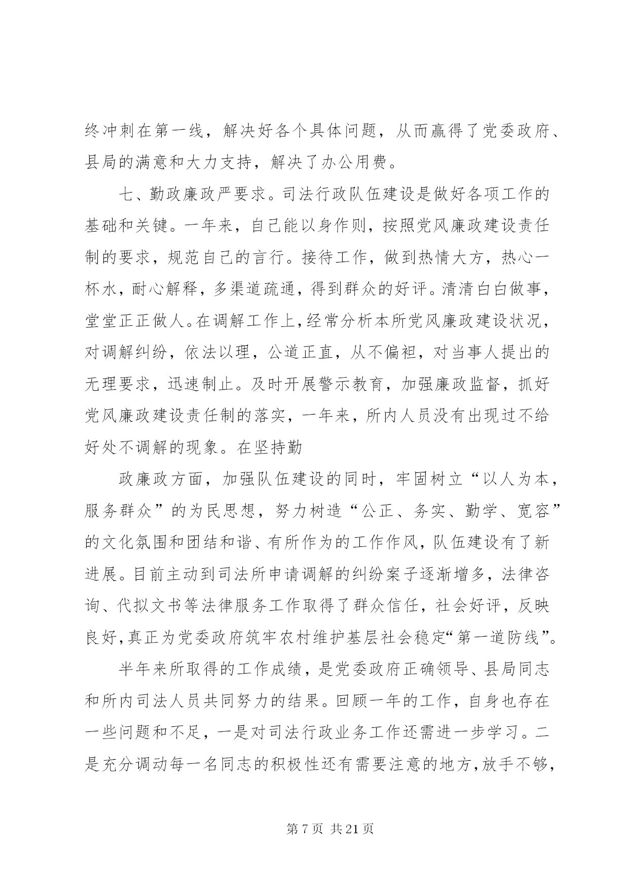第PAGE\*Arabic\*MERGEFORMAT21页共NUMPAGES\*MERGEFORMAT21页司法所长XX年度述职述廉报告今年以来,本人在县司法局和镇党委、政府的正确领导下,以党的十八届五中全会精神、及省、市、县有关会议精神为指导,紧紧围绕镇党委、政府中心工作,积极推动依法治理,扎实开展人民调解工作,着力完成刑释解教、社区矫正和“七五”普法各项任务,现就自己今年来工作和廉洁自律情况汇报如下:一、加强政治理论学习和业务学习,全面提高自身素质我始终把学习和更新知识结构放在日常工作的重要部分,尤其是在学习贯彻党的群众路线教育活动中,我深入学习习总书记的讲话精神,重点学习党的路线、方针和政策,认真学习基层工作方式方法、业务知识,提高了自身综合知识水平。二、履行职责,全力做好各项工作(一)加强普法依法治理工作。按年初制定的《岩瑞镇2016年普法依法治理工作要点》,突出重点,创新思路,完善各项措施,把法制宣传延伸到各个领域,全面推动了普法工作及依法治理工作。以多种形式、多层面的开展好法制宣传教育。突出工作重点,创新形式的开展法制教育:一是注重领导干部和机关人员的学法用法,坚持和完善党委理论学习中心组集体学法制度。二是加强在校学生的法制宣传教育。充分利用校方组织的活动,开展生动活泼的法制教育。6月份,在岩瑞中心小学进行了《如何预防青少年犯罪》的法制教育课,近六百师生接受了生动的法制教育。三是抓农村和农村“两委”班子的法律知识的培训学习。结合农村工作实际,如赔偿、土地流转等,加强农村法制宣传教育基础设施建设,大力开展适合农民特点的法制宣传教育,利用广播、电视、板报、法律书角、远程教育网、赶集等形式,广泛宣传,同时对村“两委”班子采取以会代训和法制讲座、远程教育等形式。(二)人民调解工作。近年来,我们从调解的大量的民间纠纷中发现,有四大类纠纷比较突出,一是家庭纠纷多,二是邻里纠纷多,三是土地纠纷多,四是人身损害赔偿纠纷多。2016年我所以贯彻《人民调解法》为抓手,层层培训,全力提升人民调解工作水平,并积极开展“争当人民调解能手”活动,共发生各类纠纷70起,调解率达98%,调解成功率达95%,没有一起纠纷因调解不及时或不合法引起民转刑,民转非案件,较好地发挥了在社会治安综合治理第一道防线的作用,为我镇的社会稳定起到了积极作用。(三)加强审前调查评估、安置帮教、社区矫正,为创建“平安岩瑞”尽职尽力。2016年共对10名犯罪嫌疑人进行审前调查,准确掌握他们的平时情况。在安置帮教中致2016年11月底的回归人员为13名,进行跟踪排忧解难,解决他们的实际问题,帮教率达100%,安置率为90%以上。社区矫正工作中,现有矫正人员28名,进行信息建档工作,按照一人一个档案的工作要求,建立健全社区矫正人员信息档案,对我辖区社区矫正人员进行范化管理。社区矫正和安置帮教工作的顺利实施,有效预防和减少重新违法犯罪,维护社会政治稳定。三、加强廉政学习,提高廉洁意识,注重自我预防。本人能够积极参加上级部门和乡镇组织的廉政教育活动,学习党和国家关于党风廉政建设的若干规定、各项党纪政纪,重视自学努力领会精神实质。并常对照党纪法规认真查找自身在贯彻廉政中存在的问题,有针对性整改。通过不断学习,不仅使我在思想上提高了对反腐倡廉工作重要性、长期性的认识,还增强了我严于律已的自觉性和同腐败作斗争的主动性。达到能用正确的世界观、人生观、价值观指导自身工作。四、加强党风廉政建设。在工作中本人认真执行廉洁从政准则,贯彻落实《八项规定》,时刻保持清醒的头脑,不心存侥幸、不以身试法,教育村干部用人民给予的权利为父老乡亲谋利益,坚持吃苦在前、享受在后,反对讲排场、比待遇、追逐名利和拜金主义。五、树立了正确的权力观、地位观、利益观。一是做到了“慎权”。二是做到了“慎欲”。从未谋取规定以外的特殊利益,不放纵自己的欲望,不贪吃喝、不贪钱财、不贪享乐、不贪图名利地位,堂堂正正地做人,明明白白地工作。不为声色犬马、灯红酒绿的生活方式所动,过好了享乐、金钱关,艰苦奋斗,俭以养德,保持了良好的品行和高尚的情操。三是做到了“慎独”。在廉洁自律上做到了表里如一,任何时候、任何情况下,都自觉以党性原则和道德规范衡量、约束自己,没有人前一套、人后一套,严格进行自我监督。2016年,本人虽然做了一些工作,也取得了一定的成绩,但是,在对照上级的总体工作目标,还是存在明显的不足。在工作中,缺少创新意识,缺少特色,重点工作突破上还有待进一步提高。第二篇:司法所述职述廉工作报告魏家台镇司法所述职述廉工作报告——司法所所长王保忠2012年,作为魏家台镇司法所长的我,在镇党委、政府XX县区司法局的正确领导和精心指导下,紧紧围绕稳定、改革、发展这一主题,团结带领全所所有同志,认真贯彻落实十七届