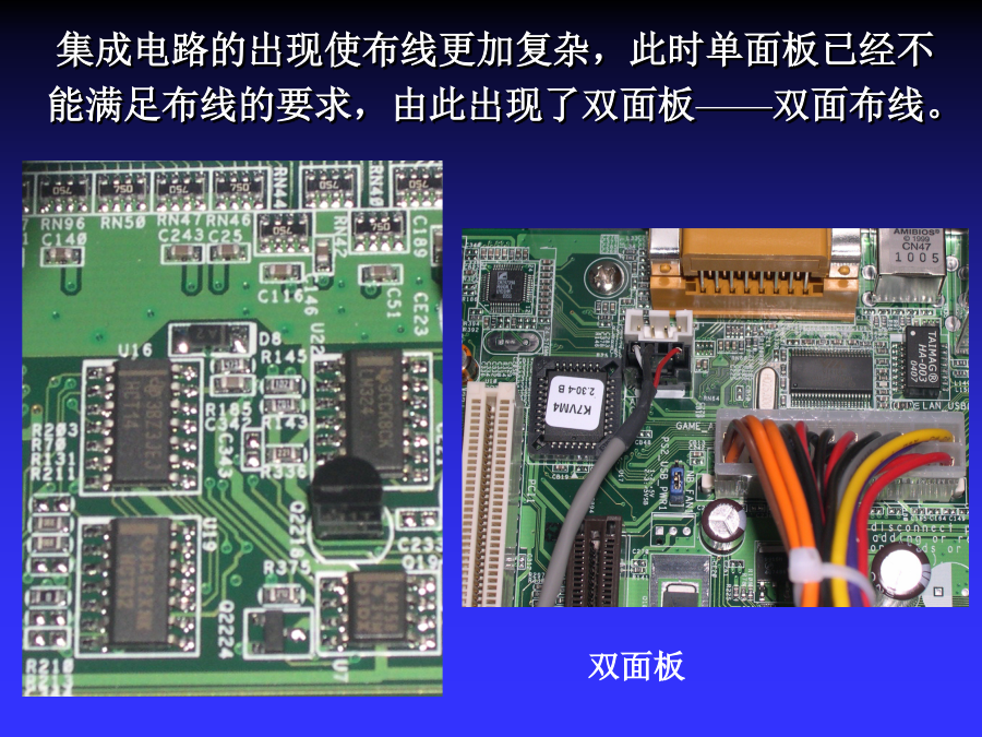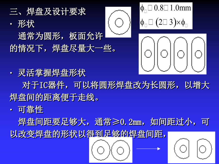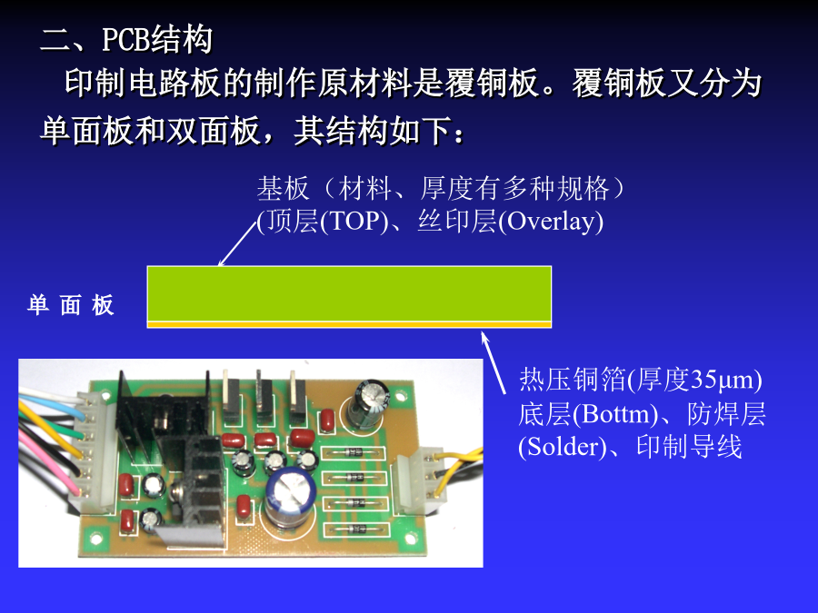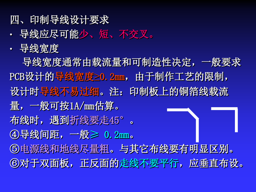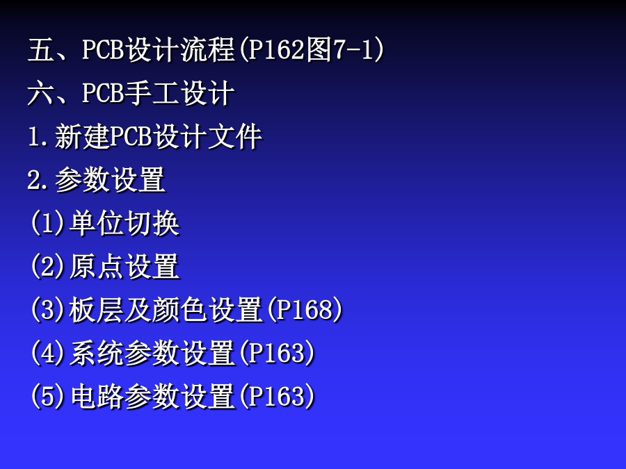 一、印制电路板的概念1.印制板的作用:依照电路原理图上的元器件、集成电路、开关、连接器和其他相关元器件之间的相互关系和连接,将他们用导线的连接形式相互连接到一起。2.印制电路板发展过程集成电路的出现使布线更加复杂,此时单面板已经不能满足布线的要求,由此出现了双面板——双面布线。二、PCB结构印制电路板的制作原材料是覆铜板。覆铜板又分为单面板和双面板,其结构如下:三、焊盘及设计要求形状通常为圆形,板面允许的情况下,焊盘尽量大一些。灵活掌握焊盘形状对于IC器件,可以将圆形焊盘改为长圆形,以增大焊盘间的距离便于走线。可靠性焊盘间距要足够大,通常≥0.2mm,如间距过小,可以改变焊盘的形状以得到足够的焊盘间距,四、印制导线设计要求导线应尽可能少、短、不交叉。导线宽度导线宽度通常由载流量和可制造性决定,一般要求PCB设计的导线宽度≥0.2mm,由于制作工艺的限制,设计时导线不易过细。注:印制板上的铜箔线载流量,一般可按1A/mm估算。布线时,遇到折线要走45°。④导线间距,一般≥0.2mm。⑤电源线和地线尽量粗。与其它布线要有明显区别。⑥对于双面板,正反面的走线不要平行,应垂直布设。初学者设计时需掌握的基本原则是:板面允许的情况下,导线尽量粗一些。导线与导线之间的间距不要过近。导线与焊盘的间距不得过近。板面允许的情况下,焊盘尽量大一些。五、PCB设计流程(P162图7-1)六、PCB手工设计1.新建PCB设计文件2.参数设置(1)单位切换(2)原点设置(3)板层及颜色设置(P168)(4)系统参数设置(P163)(5)电路参数设置(P163)3.规划电路板(1)手工法(P180)(1)向导法4.加载元器件封装5.布局(按结构尺寸、美观、抗干扰性等要求)6.布线(按电流密度、美观、抗干扰性等要求)7.保存七、元器件封装设计在元器件封装设计前,了解电路中所有元器件的形状、尺寸、引线。不同型号、规格元器件尺寸差异很大,需要了解其体积大小,设计电路板时要注意留有足够的安装空间;对于IC和三极管要注意引脚的排列顺序及各引脚的功能。封装设计内容有焊盘、丝印层上的边框及说明文字或符号标识等。例如方法(P210):1.新建元器件封装库在工程文件下,新建元器件封装库(P210)2.设置参数2.手动创建元器件封装(P213)