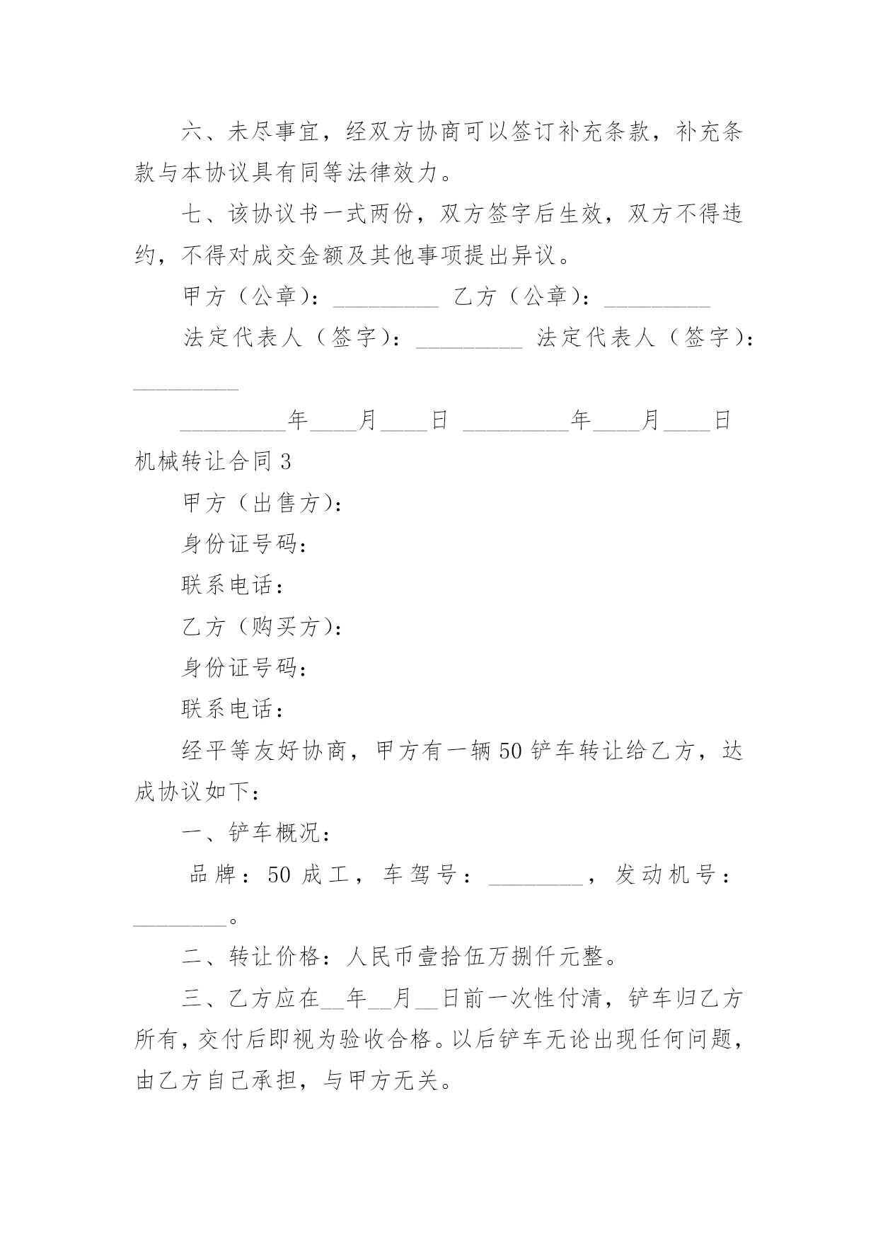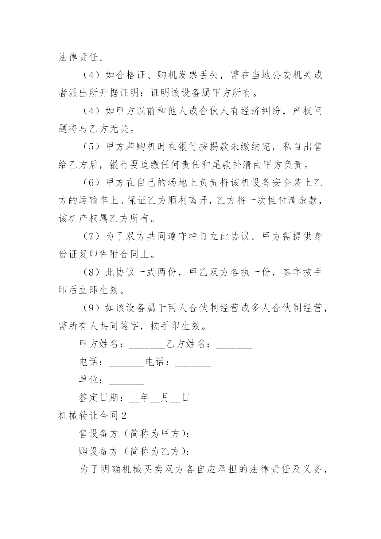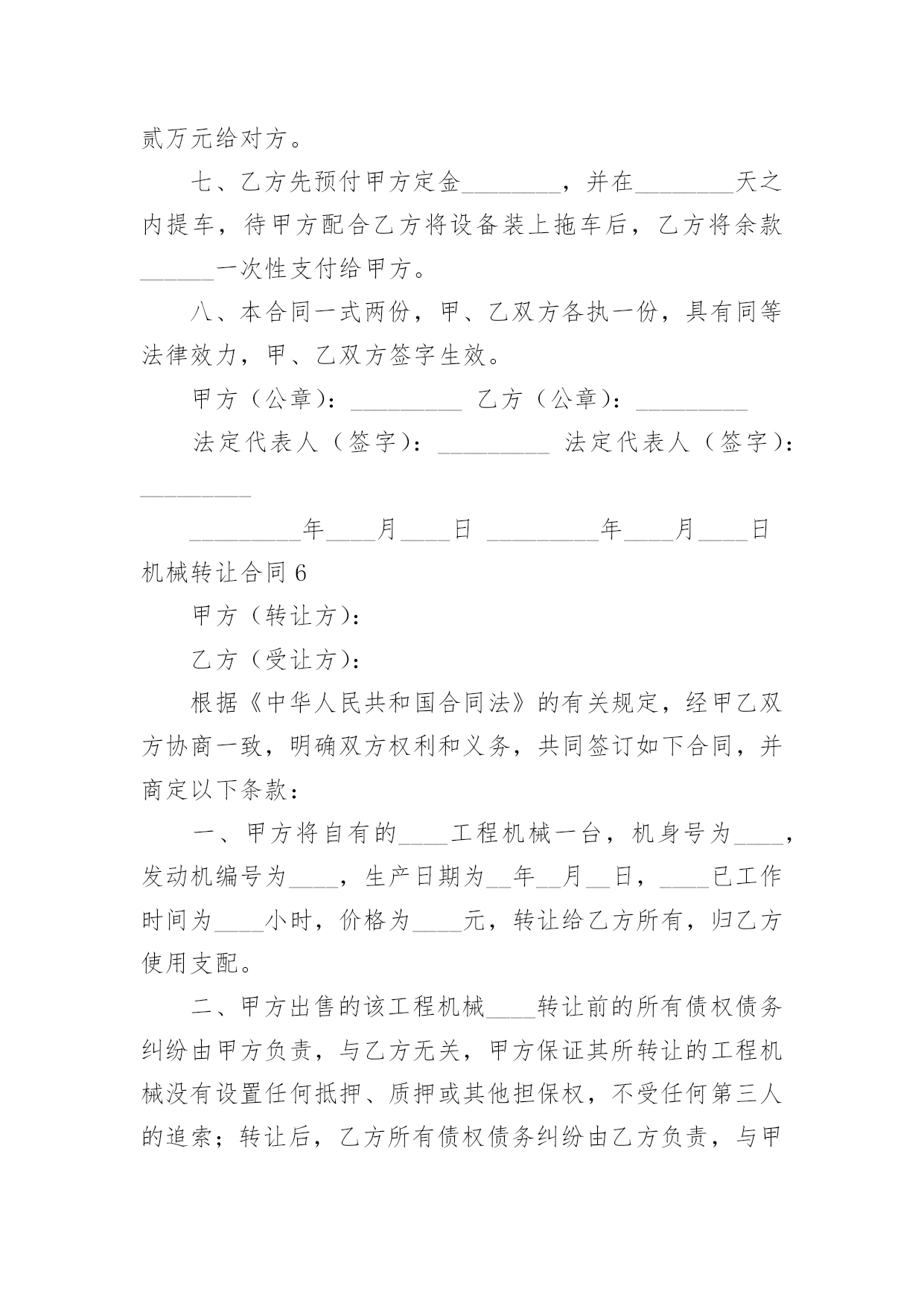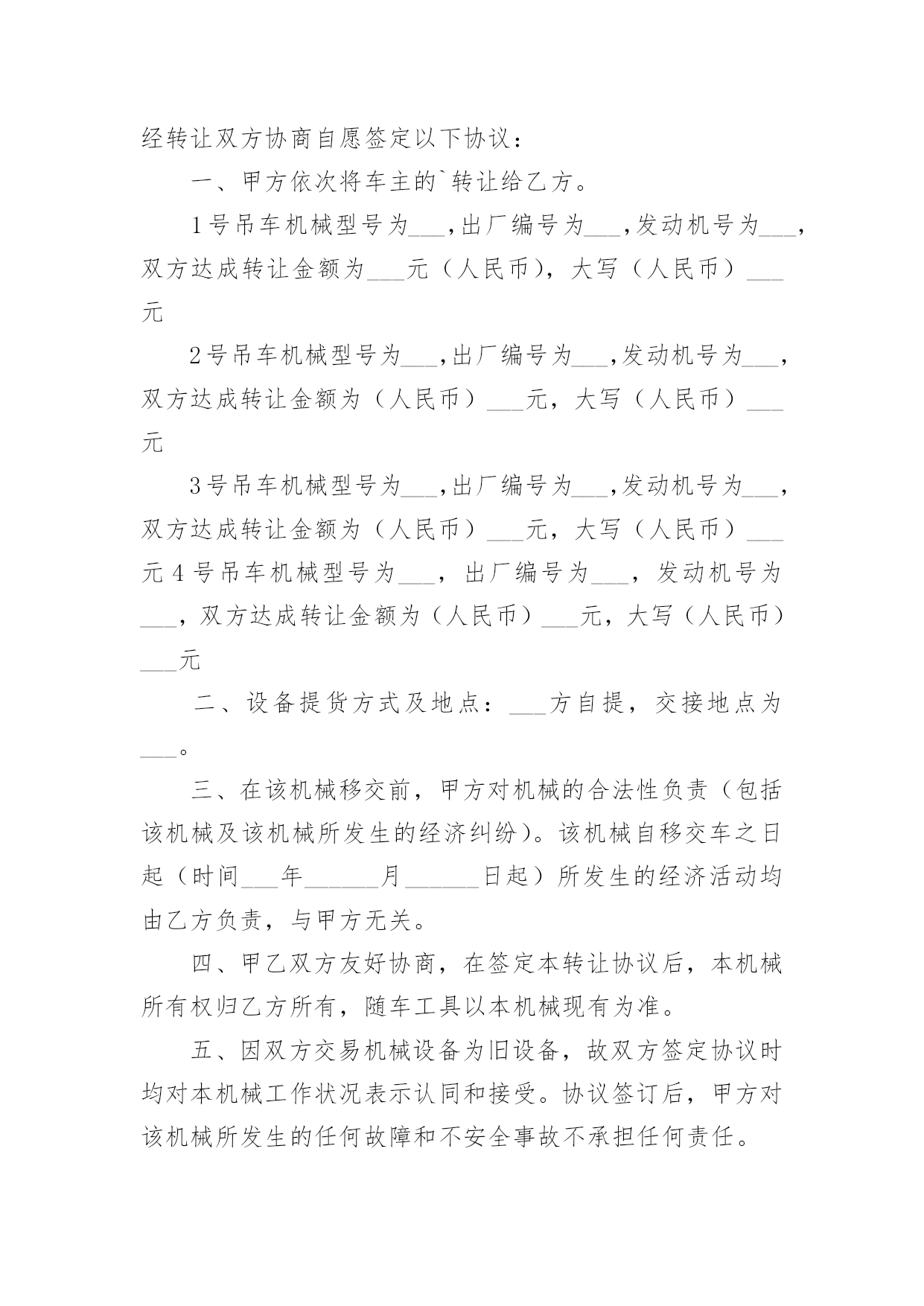 机械转让合同机械转让合同16篇(热门)随着广大人民群众法律意识的普遍提高,合同对我们的帮助越来越大,它可以保护民事法律关系。相信大家又在为写合同犯愁了吧,以下是小编为大家收集的机械转让合同,欢迎阅读,希望大家能够喜欢。机械转让合同1设备转让方:_______(甲方)身份证号码:_______设备接收方:_______(乙方)身份证号码:_______现经甲乙双方共同商定达成如下协议:(1)因甲方设备多余,现转让台设备给乙方,设备名称/型号:出厂编号为:经乙方负责人及技术人员现场看机试机后,甲乙双方达成协商价为人民币¥_______,大写(_______)。乙方本着互相信任的情况下预付现金人民币______元¥______。于__年__月__日将货提走。如在订金预付时间范围内甲方把货物处理他人或其他原因不卖给乙方,甲方将承担订金的`3倍作为违约金,赔偿给乙方的作为损失。(2)甲方出售该设备提供该机;出厂格证、购机发票等有效证件备注:(3)如该机是甲方偷盗或来路不明的,甲方将负全部法律责任。(4)如合格证、购机发票丢失,需在当地公安机关或者派出所开据证明:证明该设备属甲方所有。(4)如甲方以前和他人或合伙人有经济纠纷,产权问题将与乙方无关。(5)甲方若购机时在银行按揭款未缴纳完,私自出售给乙方后,银行要追缴任何责任和尾款补清由甲方负责。(6)甲方在自己的场地上负责将该机设备安全装上乙方的运输车上。保证乙方顺利离开,乙方将一次性付清余款,该机产权属乙方所有。(7)为了双方共同遵守特订立此协议。甲方需提供身份证复印件附合同上。(8)此协议一式两份,甲乙双方各执一份,签字按手印后立即生效。(9)如该设备属于两人合伙制经营或多人合伙制经营,需所有人共同签字,按手印生效。甲方姓名:_______乙方姓名:_______电话:_______电话:_______单位:_______签定日期:__年__月__日机械转让合同2售设备方(简称为甲方):购设备方(简称为乙方):为了明确机械买卖双方各自应承担的法律责任及义务,经转让双方协商自愿签定以下协议:一、甲方依次将车主的`转让给乙方。1号吊车机械型号为___,出厂编号为___,发动机号为___,双方达成转让金额为___元(人民币),大写(人民币)___元2号吊车机械型号为___,出厂编号为___,发动机号为___,双方达成转让金额为(人民币)___元,大写(人民币)___元3号吊车机械型号为___,出厂编号为___,发动机号为___,双方达成转让金额为(人民币)___元,大写(人民币)___元4号吊车机械型号为___,出厂编号为___,发动机号为___,双方达成转让金额为(人民币)___元,大写(人民币)___元二、设备提货方式及地点:___方自提,交接地点为___。三、在该机械移交前,甲方对机械的合法性负责(包括该机械及该机械所发生的经济纠纷)。该机械自移交车之日起(时间___年______月______日起)所发生的经济活动均由乙方负责,与甲方无关。四、甲乙双方友好协商,在签定本转让协议后,本机械所有权归乙方所有,随车工具以本机械现有为准。五、因双方交易机械设备为旧设备,故双方签定协议时均对本机械工作状况表示认同和接受。协议签订后,甲方对该机械所发生的任何故障和不安全事故不承担任何责任。六、未尽事宜,经双方协商可以签订补充条款,补充条款与本协议具有同等法律效力。七、该协议书一式两份,双方签字后生效,双方不得违约,不得对成交金额及其他事项提出异议。甲方(公章):_________乙方(公章):_________法定代表人(签字):_________法定代表人(签字):__________________年____月____日_________年____月____日机械转让合同3甲方(出售方):身份证号码:联系电话:乙方(购买方):身份证号码:联系电话:经平等友好协商,甲方有一辆50铲车转让给乙方,达成协议如下:一、铲车概况:品牌:50成工,车驾号:________,发动机号:________。二、转让价格:人民币壹拾伍万捌仟元整。三、乙方应在__年__月__日前一次性付清,铲车归乙方所有,交付后即视为验收合格。以后铲车无论出现任何问题,由乙方自己承担,与甲方无关。四、自合同签订后乙方享有铲车的合法所有权。五、本合同经双方签字后盖章生效,本合同一式二份,甲乙双方各执一份。甲方:乙方:__年__月__日机械转让合同4受让方:(以下称甲方)转让方:(以下称乙方)为实现生产经营需要,甲方拟定收购乙方拥有机械设备,经甲乙双方协商一致,特签订本协议:第一条设备名称、规格、数量、价格乙方转让给甲方的设备装载机,该设备型号,经双方约定价格为_____元(含税价格);第二条付款方式:一次性付清第三条设备交付时