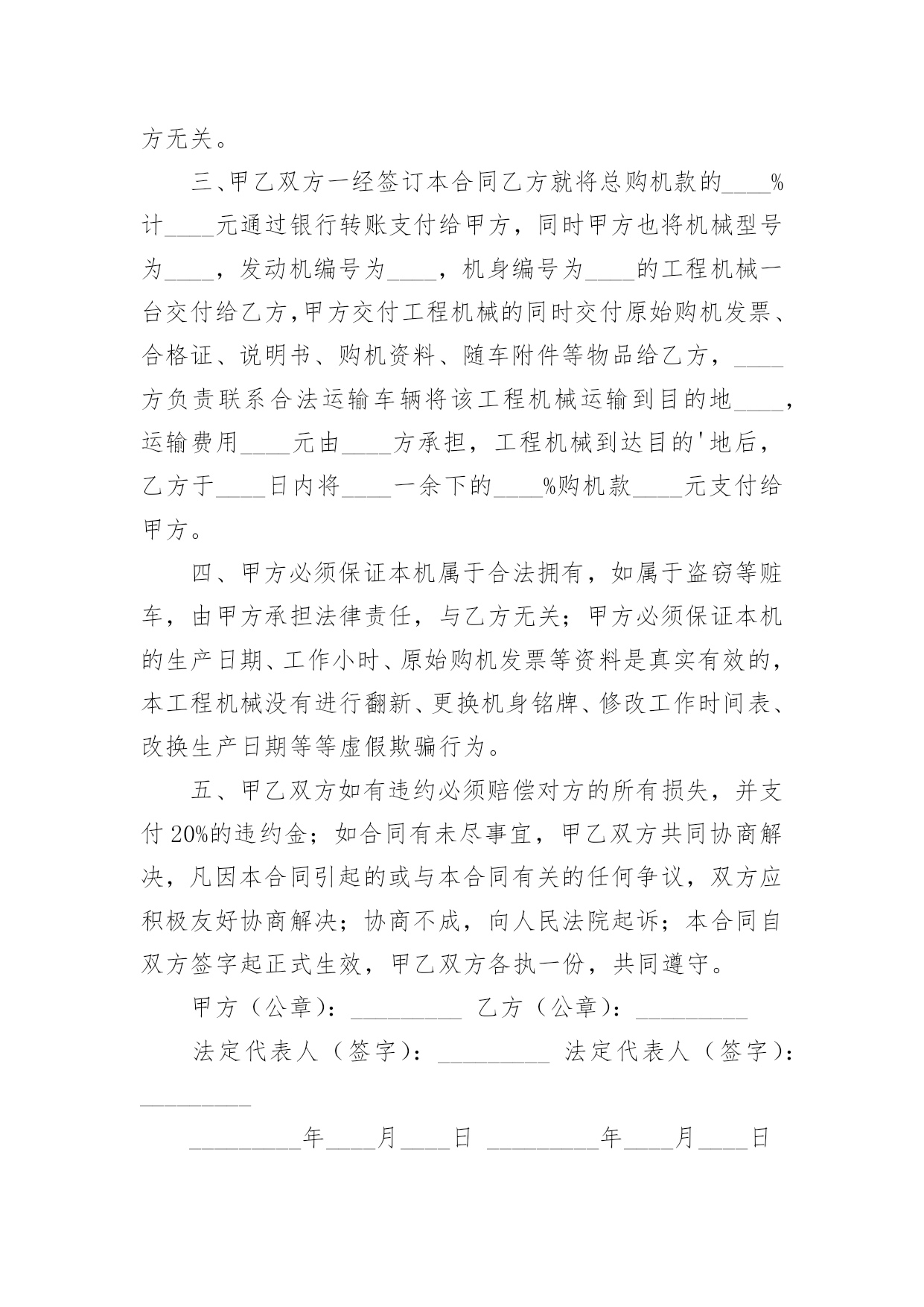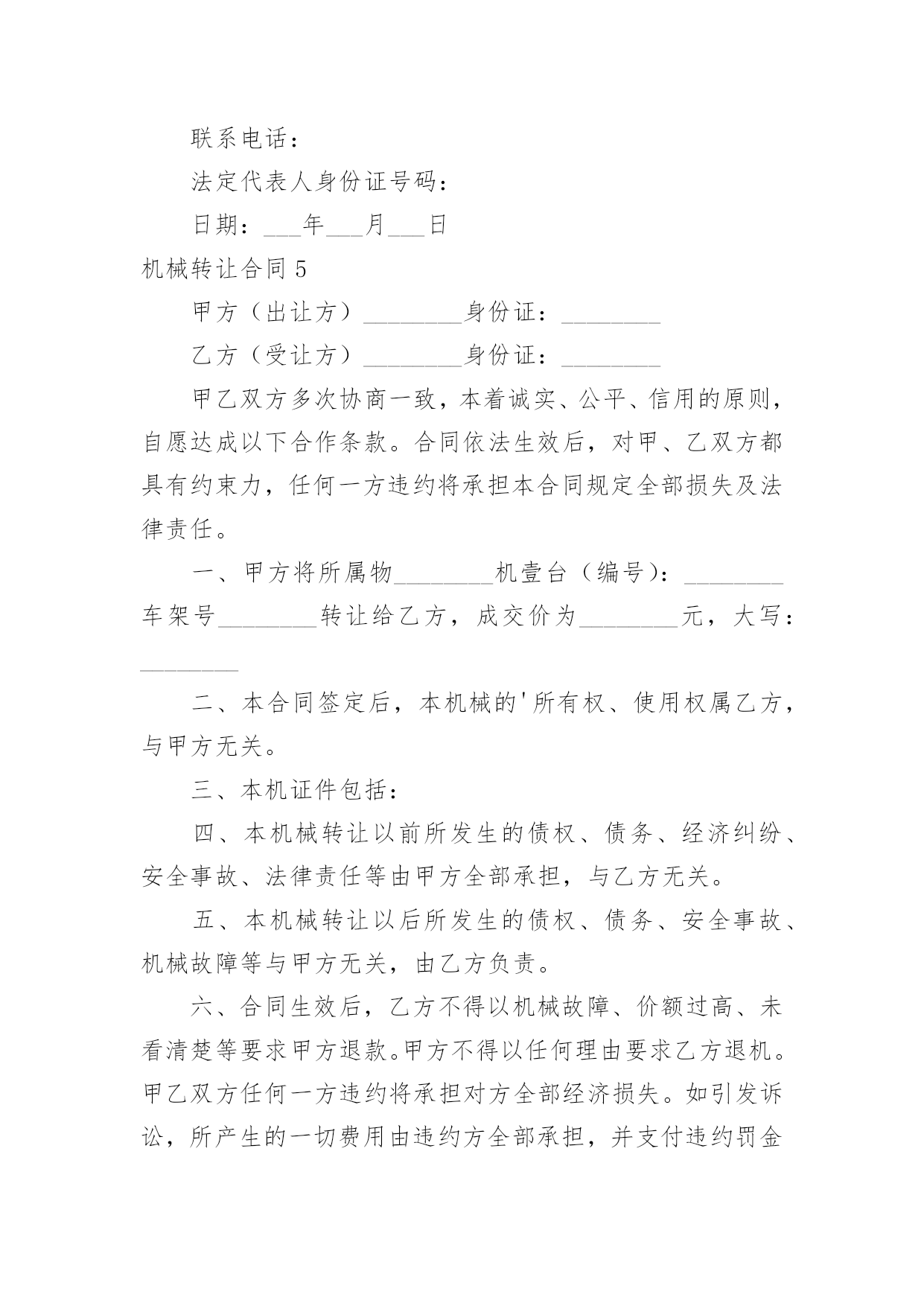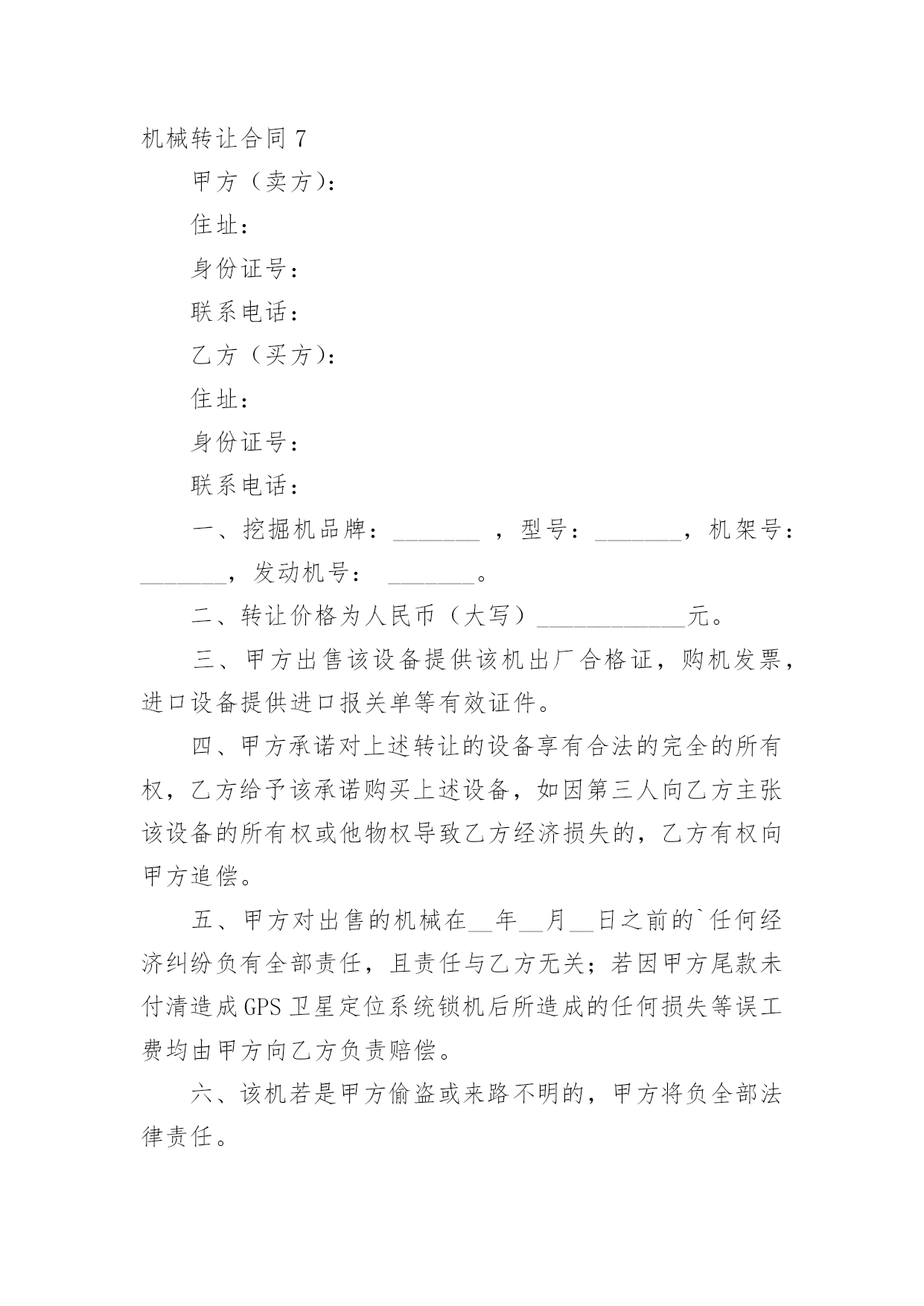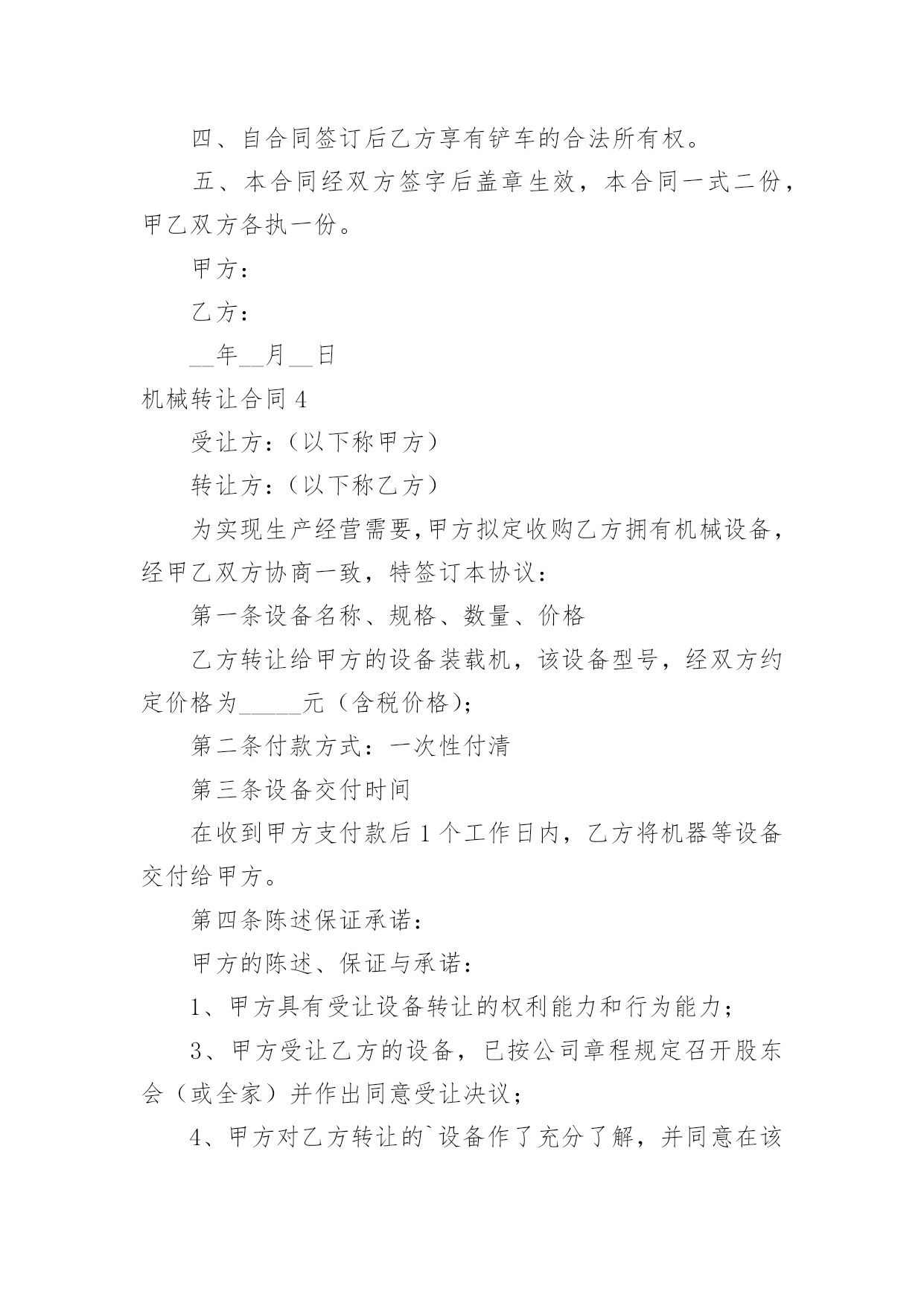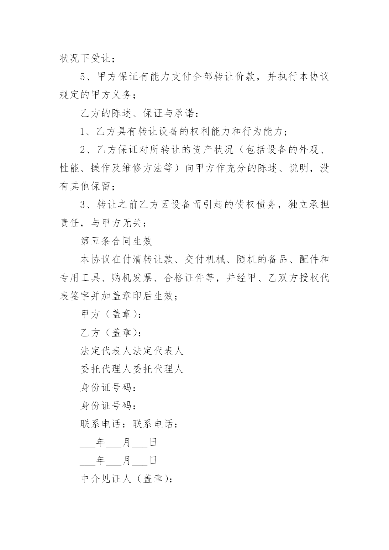 机械转让合同机械转让合同16篇(热门)随着广大人民群众法律意识的普遍提高,合同对我们的帮助越来越大,它可以保护民事法律关系。相信大家又在为写合同犯愁了吧,以下是小编为大家收集的机械转让合同,欢迎阅读,希望大家能够喜欢。机械转让合同1设备转让方:_______(甲方)身份证号码:_______设备接收方:_______(乙方)身份证号码:_______现经甲乙双方共同商定达成如下协议:(1)因甲方设备多余,现转让台设备给乙方,设备名称/型号:出厂编号为:经乙方负责人及技术人员现场看机试机后,甲乙双方达成协商价为人民币¥_______,大写(_______)。乙方本着互相信任的情况下预付现金人民币______元¥______。于__年__月__日将货提走。如在订金预付时间范围内甲方把货物处理他人或其他原因不卖给乙方,甲方将承担订金的`3倍作为违约金,赔偿给乙方的作为损失。(2)甲方出售该设备提供该机;出厂格证、购机发票等有效证件备注:(3)如该机是甲方偷盗或来路不明的,甲方将负全部法律责任。(4)如合格证、购机发票丢失,需在当地公安机关或者派出所开据证明:证明该设备属甲方所有。(4)如甲方以前和他人或合伙人有经济纠纷,产权问题将与乙方无关。(5)甲方若购机时在银行按揭款未缴纳完,私自出售给乙方后,银行要追缴任何责任和尾款补清由甲方负责。(6)甲方在自己的场地上负责将该机设备安全装上乙方的运输车上。保证乙方顺利离开,乙方将一次性付清余款,该机产权属乙方所有。(7)为了双方共同遵守特订立此协议。甲方需提供身份证复印件附合同上。(8)此协议一式两份,甲乙双方各执一份,签字按手印后立即生效。(9)如该设备属于两人合伙制经营或多人合伙制经营,需所有人共同签字,按手印生效。甲方姓名:_______乙方姓名:_______电话:_______电话:_______单位:_______签定日期:__年__月__日机械转让合同2售设备方(简称为甲方):购设备方(简称为乙方):为了明确机械买卖双方各自应承担的法律责任及义务,经转让双方协商自愿签定以下协议:一、甲方依次将车主的`转让给乙方。1号吊车机械型号为___,出厂编号为___,发动机号为___,双方达成转让金额为___元(人民币),大写(人民币)___元2号吊车机械型号为___,出厂编号为___,发动机号为___,双方达成转让金额为(人民币)___元,大写(人民币)___元3号吊车机械型号为___,出厂编号为___,发动机号为___,双方达成转让金额为(人民币)___元,大写(人民币)___元4号吊车机械型号为___,出厂编号为___,发动机号为___,双方达成转让金额为(人民币)___元,大写(人民币)___元二、设备提货方式及地点:___方自提,交接地点为___。三、在该机械移交前,甲方对机械的合法性负责(包括该机械及该机械所发生的经济纠纷)。该机械自移交车之日起(时间___年______月______日起)所发生的经济活动均由乙方负责,与甲方无关。四、甲乙双方友好协商,在签定本转让协议后,本机械所有权归乙方所有,随车工具以本机械现有为准。五、因双方交易机械设备为旧设备,故双方签定协议时均对本机械工作状况表示认同和接受。协议签订后,甲方对该机械所发生的任何故障和不安全事故不承担任何责任。六、未尽事宜,经双方协商可以签订补充条款,补充条款与本协议具有同等法律效力。七、该协议书一式两份,双方签字后生效,双方不得违约,不得对成交金额及其他事项提出异议。甲方(公章):_________乙方(公章):_________法定代表人(签字):_________法定代表人(签字):__________________年____月____日_________年____月____日机械转让合同3甲方(出售方):身份证号码:联系电话:乙方(购买方):身份证号码:联系电话:经平等友好协商,甲方有一辆50铲车转让给乙方,达成协议如下:一、铲车概况:品牌:50成工,车驾号:________,发动机号:________。二、转让价格:人民币壹拾伍万捌仟元整。三、乙方应在__年__月__日前一次性付清,铲车归乙方所有,交付后即视为验收合格。以后铲车无论出现任何问题,由乙方自己承担,与甲方无关。四、自合同签订后乙方享有铲车的合法所有权。五、本合同经双方签字后盖章生效,本合同一式二份,甲乙双方各执一份。甲方:乙方:__年__月__日机械转让合同4受让方:(以下称甲方)转让方:(以下称乙方)为实现生产经营需要,甲方拟定收购乙方拥有机械设备,经甲乙双方协商一致,特签订本协议:第一条设备名称、规格、数量、价格乙方转让给甲方的设备装载机,该设备型号,经双方约定价格为_____元(含税价格);第二条付款方式:一次性付清第三条设备交付时