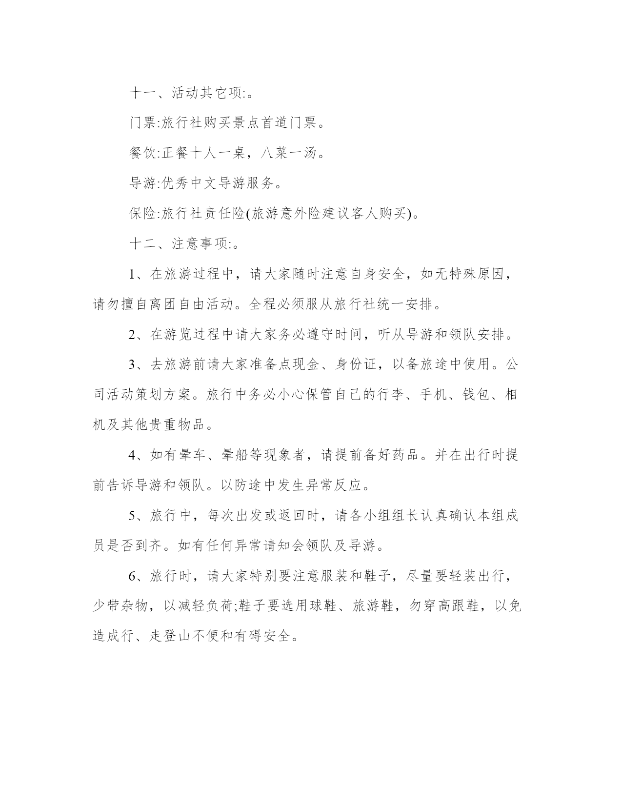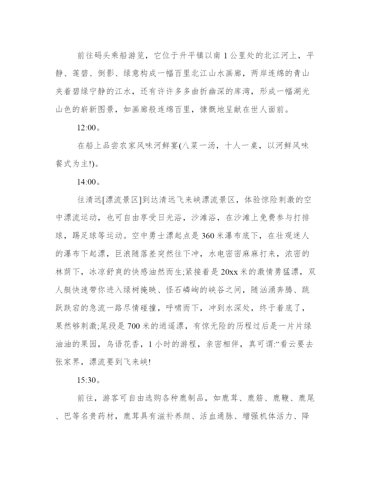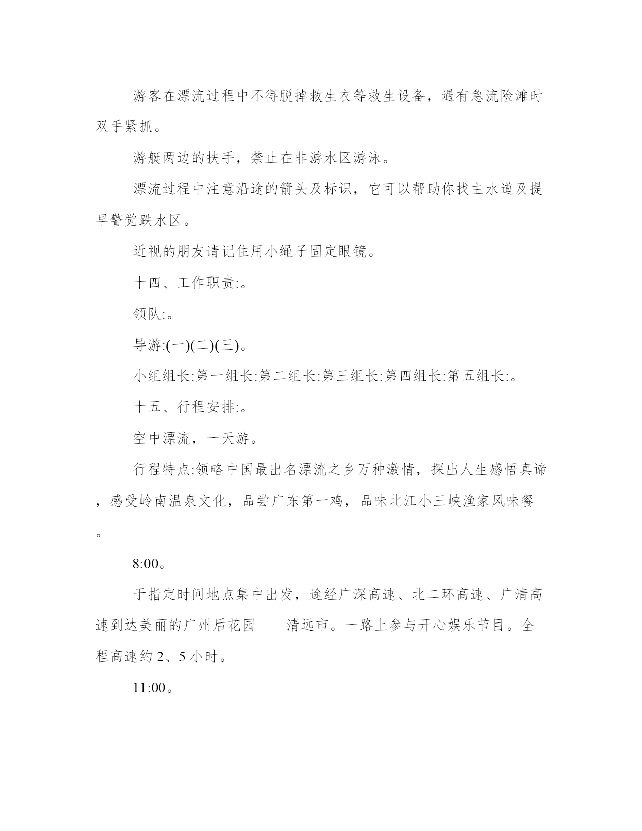 旅游从业者的旅游策划(通用18篇)发表一篇总结,不仅可以让我们更好地反思,还可以与他人交流心得。学会适度放松,调节自己的身心状态。在范文中,可以看到总结时对自己的优点和不足进行了客观评价,有助于自我提高。旅游从业者的旅游策划篇一一、活动主题:。20xx相约,清凉一夏。二、活动目的:。为了丰富广大员工的文化生活、完善公司福利,感谢各位员工辛勤的付出和努力的工作。通过本次活动促进员工之间的相互了解,增强相互之间的团结及友谊。三、活动宗旨:。1、加强团队凝聚力与团队协作能力;。2、激发职员参与公司各项活动的热情;。3、加强和巩固职员对公司的管理制度、企业理念、产品知识等的熟悉;。4、休闲娱乐,缓解工作疲劳;。四、活动项目:。漂流,一天游(仅作参考)。五、活动时间:。20xx年5月1日。六、参与范围:。全体职员工。七、主办部门:。行政管理部。八、协办单位:。东莞市明珠旅行社。九:活动安排:。1、在东莞驶往两个钟头的路程中,在车上组织全体职员及领导猜谜、男女同事集体对歌;。2、就地组织全体参与的娱乐活动,包括文艺节目表演、企业知识竞答;。十:活动流程:。1、车上2小时的猜谜与唱歌由导游及领队主持,全体同仁积极互动;。2、首先到达景区后跟随导游游览美丽的湖光山色,欣赏青山夹着碧绿宁静的江水,仿佛沉静在美的画中,全身心的放松,感受这一刻的宁静吧。公司活动策划方案。3、午餐后在导游的带领下来到漂流景区,依次先更换好衣服,在指定地点按顺序登车,前往漂流起点,经验票后领取救生设备、划桨、头盔。并按要求穿好救生衣,在救生员指引下开始漂流。漂流过程请服从救生员指挥。十一、活动其它项:。门票:旅行社购买景点首道门票。餐饮:正餐十人一桌,八菜一汤。导游:优秀中文导游服务。保险:旅行社责任险(旅游意外险建议客人购买)。十二、注意事项:。1、在旅游过程中,请大家随时注意自身安全,如无特殊原因,请勿擅自离团自由活动。全程必须服从旅行社统一安排。2、在游览过程中请大家务必遵守时间,听从导游和领队安排。3、去旅游前请大家准备点现金、身份证,以备旅途中使用。公司活动策划方案。旅行中务必小心保管自己的行李、手机、钱包、相机及其他贵重物品。4、如有晕车、晕船等现象者,请提前备好药品。并在出行时提前告诉导游和领队。以防途中发生异常反应。5、旅行中,每次出发或返回时,请各小组组长认真确认本组成员是否到齐。如有任何异常请知会领队及导游。6、旅行时,请大家特别要注意服装和鞋子,尽量要轻装出行,少带杂物,以减轻负荷;鞋子要选用球鞋、旅游鞋,勿穿高跟鞋,以免造成行、走登山不便和有碍安全。7、大家在游览景区、景点时应注意无照游商围追兜售和宰客欺客的现象。这些无照商贩经常向过往行人和旅游团队兜售水果、饮料和小纪念品,请大家谨慎购买。8、大家在景区游览时要注意景区内的各个标识牌,避免造成走失或迷路等不必要的麻烦。必要时请用笔记录下来,以便查看。9、大家在景区游览时如果要暂时离开团队,如去洗手间,请告知导游、带团负责人、组长或其他团友。十三:漂流前的准备:。1、多带套衣服:漂流不可避免会“湿身”,上岸后没有干衣服换是很难受的。参加漂流不要穿皮鞋,平底拖鞋、塑料凉鞋和旅游鞋都可以。坏天气水上冷,好天气水上晒,要注意防寒防晒,太名贵的服装鞋帽最好不要用于漂流。2、上筏只带饮用水,另手机、证件和现金……怕水的东西都不要带。漂流注意事项。游客参与漂流请先更换好衣服,在指定地点按顺序登车,前往漂流起点,经验票后领取救生设备、划桨、头盔。并按要求穿好救生衣,在救生员指引下开始漂流。漂流过程请服从救生员指挥。游客漂流前请将自己的贵重物品保管好或交保管室保管,一切怕湿物品不要随身携带。游客在漂流过程中不得脱掉救生衣等救生设备,遇有急流险滩时双手紧抓。游艇两边的扶手,禁止在非游水区游泳。漂流过程中注意沿途的箭头及标识,它可以帮助你找主水道及提早警觉跌水区。近视的朋友请记住用小绳子固定眼镜。十四、工作职责:。领队:。导游:(一)(二)(三)。小组组长:第一组长:第二组长:第三组长:第四组长:第五组长:。十五、行程安排:。空中漂流,一天游。行程特点:领略中国最出名漂流之乡万种激情,探出人生感悟真谛,感受岭南温泉文化,品尝广东第一鸡,品味北江小三峡渔家风味餐。8:00。于指定时间地点集中出发,途经广深高速、北二环高速、广清高速到达美丽的广州后花园——清远市。一路上参与开心娱乐节目。全程高速约2、5小时。11:00。前往码头乘船游览,它位于升平镇以南1公里处的北江河上,平静、莲碧、倒影、绿意构成一幅百里北江山水画廊,两岸连绵的青山夹着碧绿宁静的江水,还有许许多多曲折幽深的库湾,形成一幅湖光