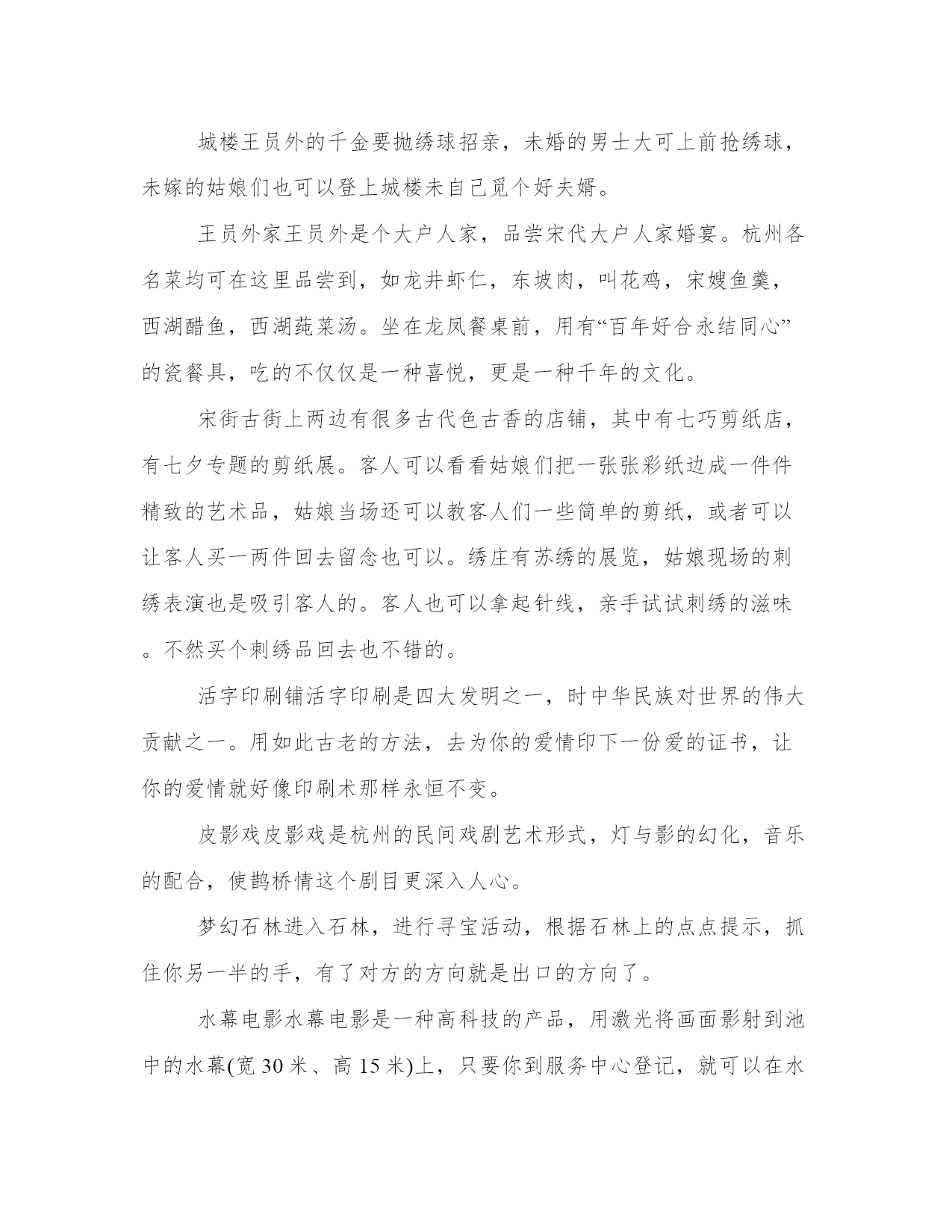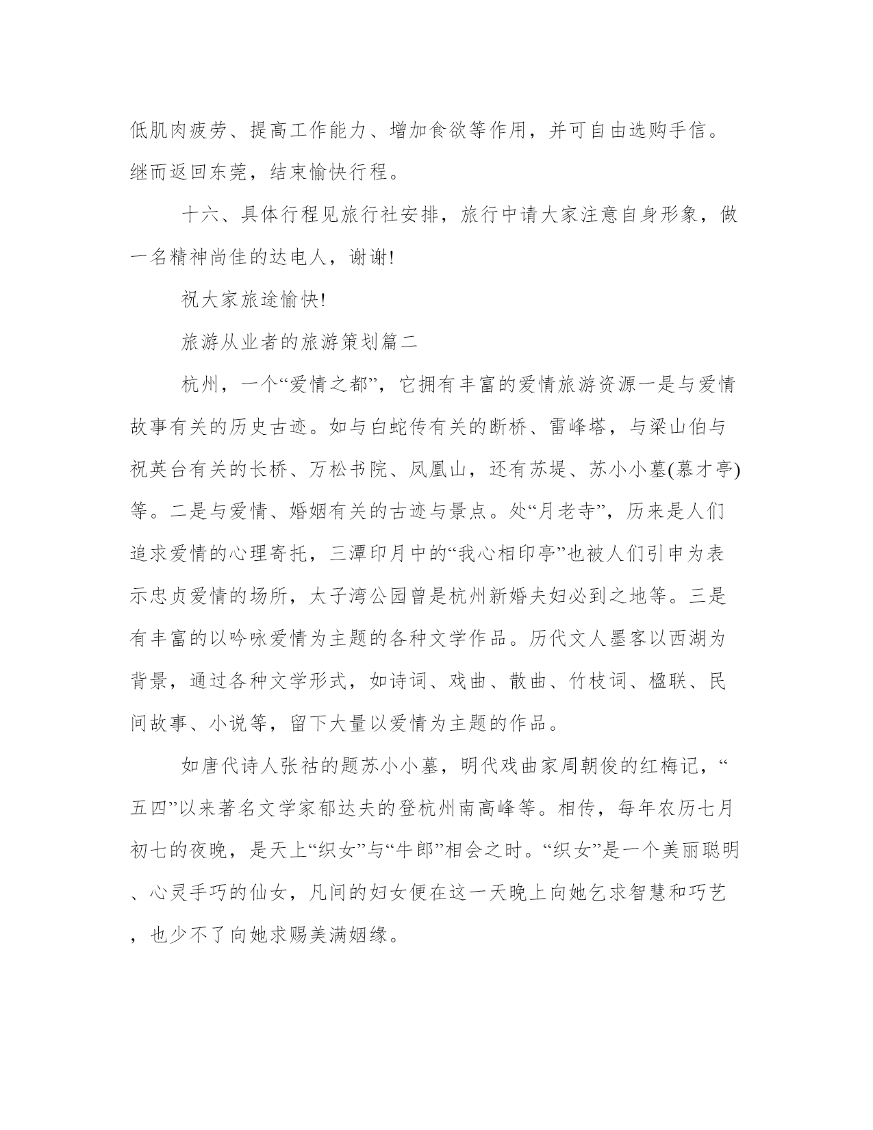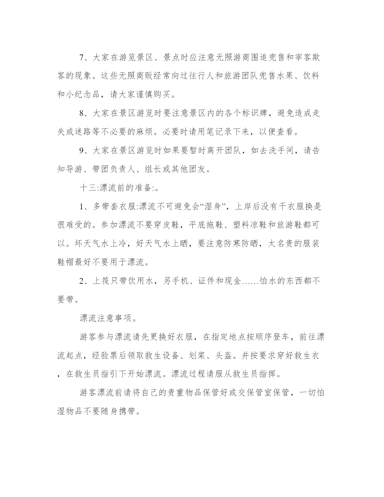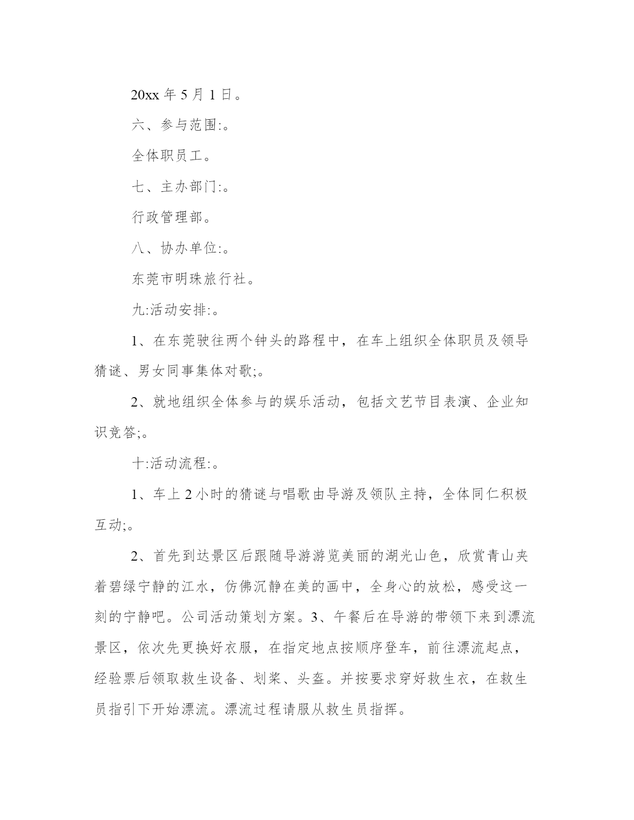 旅游从业者的旅游策划(通用18篇)发表一篇总结,不仅可以让我们更好地反思,还可以与他人交流心得。学会适度放松,调节自己的身心状态。在范文中,可以看到总结时对自己的优点和不足进行了客观评价,有助于自我提高。旅游从业者的旅游策划篇一一、活动主题:。20xx相约,清凉一夏。二、活动目的:。为了丰富广大员工的文化生活、完善公司福利,感谢各位员工辛勤的付出和努力的工作。通过本次活动促进员工之间的相互了解,增强相互之间的团结及友谊。三、活动宗旨:。1、加强团队凝聚力与团队协作能力;。2、激发职员参与公司各项活动的热情;。3、加强和巩固职员对公司的管理制度、企业理念、产品知识等的熟悉;。4、休闲娱乐,缓解工作疲劳;。四、活动项目:。漂流,一天游(仅作参考)。五、活动时间:。20xx年5月1日。六、参与范围:。全体职员工。七、主办部门:。行政管理部。八、协办单位:。东莞市明珠旅行社。九:活动安排:。1、在东莞驶往两个钟头的路程中,在车上组织全体职员及领导猜谜、男女同事集体对歌;。2、就地组织全体参与的娱乐活动,包括文艺节目表演、企业知识竞答;。十:活动流程:。1、车上2小时的猜谜与唱歌由导游及领队主持,全体同仁积极互动;。2、首先到达景区后跟随导游游览美丽的湖光山色,欣赏青山夹着碧绿宁静的江水,仿佛沉静在美的画中,全身心的放松,感受这一刻的宁静吧。公司活动策划方案。3、午餐后在导游的带领下来到漂流景区,依次先更换好衣服,在指定地点按顺序登车,前往漂流起点,经验票后领取救生设备、划桨、头盔。并按要求穿好救生衣,在救生员指引下开始漂流。漂流过程请服从救生员指挥。十一、活动其它项:。门票:旅行社购买景点首道门票。餐饮:正餐十人一桌,八菜一汤。导游:优秀中文导游服务。保险:旅行社责任险(旅游意外险建议客人购买)。十二、注意事项:。1、在旅游过程中,请大家随时注意自身安全,如无特殊原因,请勿擅自离团自由活动。全程必须服从旅行社统一安排。2、在游览过程中请大家务必遵守时间,听从导游和领队安排。3、去旅游前请大家准备点现金、身份证,以备旅途中使用。公司活动策划方案。旅行中务必小心保管自己的行李、手机、钱包、相机及其他贵重物品。4、如有晕车、晕船等现象者,请提前备好药品。并在出行时提前告诉导游和领队。以防途中发生异常反应。5、旅行中,每次出发或返回时,请各小组组长认真确认本组成员是否到齐。如有任何异常请知会领队及导游。6、旅行时,请大家特别要注意服装和鞋子,尽量要轻装出行,少带杂物,以减轻负荷;鞋子要选用球鞋、旅游鞋,勿穿高跟鞋,以免造成行、走登山不便和有碍安全。7、大家在游览景区、景点时应注意无照游商围追兜售和宰客欺客的现象。这些无照商贩经常向过往行人和旅游团队兜售水果、饮料和小纪念品,请大家谨慎购买。8、大家在景区游览时要注意景区内的各个标识牌,避免造成走失或迷路等不必要的麻烦。必要时请用笔记录下来,以便查看。9、大家在景区游览时如果要暂时离开团队,如去洗手间,请告知导游、带团负责人、组长或其他团友。十三:漂流前的准备:。1、多带套衣服:漂流不可避免会“湿身”,上岸后没有干衣服换是很难受的。参加漂流不要穿皮鞋,平底拖鞋、塑料凉鞋和旅游鞋都可以。坏天气水上冷,好天气水上晒,要注意防寒防晒,太名贵的服装鞋帽最好不要用于漂流。2、上筏只带饮用水,另手机、证件和现金……怕水的东西都不要带。漂流注意事项。游客参与漂流请先更换好衣服,在指定地点按顺序登车,前往漂流起点,经验票后领取救生设备、划桨、头盔。并按要求穿好救生衣,在救生员指引下开始漂流。漂流过程请服从救生员指挥。游客漂流前请将自己的贵重物品保管好或交保管室保管,一切怕湿物品不要随身携带。游客在漂流过程中不得脱掉救生衣等救生设备,遇有急流险滩时双手紧抓。游艇两边的扶手,禁止在非游水区游泳。漂流过程中注意沿途的箭头及标识,它可以帮助你找主水道及提早警觉跌水区。近视的朋友请记住用小绳子固定眼镜。十四、工作职责:。领队:。导游:(一)(二)(三)。小组组长:第一组长:第二组长:第三组长:第四组长:第五组长:。十五、行程安排:。空中漂流,一天游。行程特点:领略中国最出名漂流之乡万种激情,探出人生感悟真谛,感受岭南温泉文化,品尝广东第一鸡,品味北江小三峡渔家风味餐。8:00。于指定时间地点集中出发,途经广深高速、北二环高速、广清高速到达美丽的广州后花园——清远市。一路上参与开心娱乐节目。全程高速约2、5小时。11:00。前往码头乘船游览,它位于升平镇以南1公里处的北江河上,平静、莲碧、倒影、绿意构成一幅百里北江山水画廊,两岸连绵的青山夹着碧绿宁静的江水,还有许许多多曲折幽深的库湾,形成一幅湖光