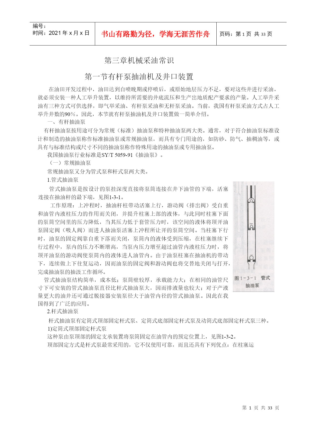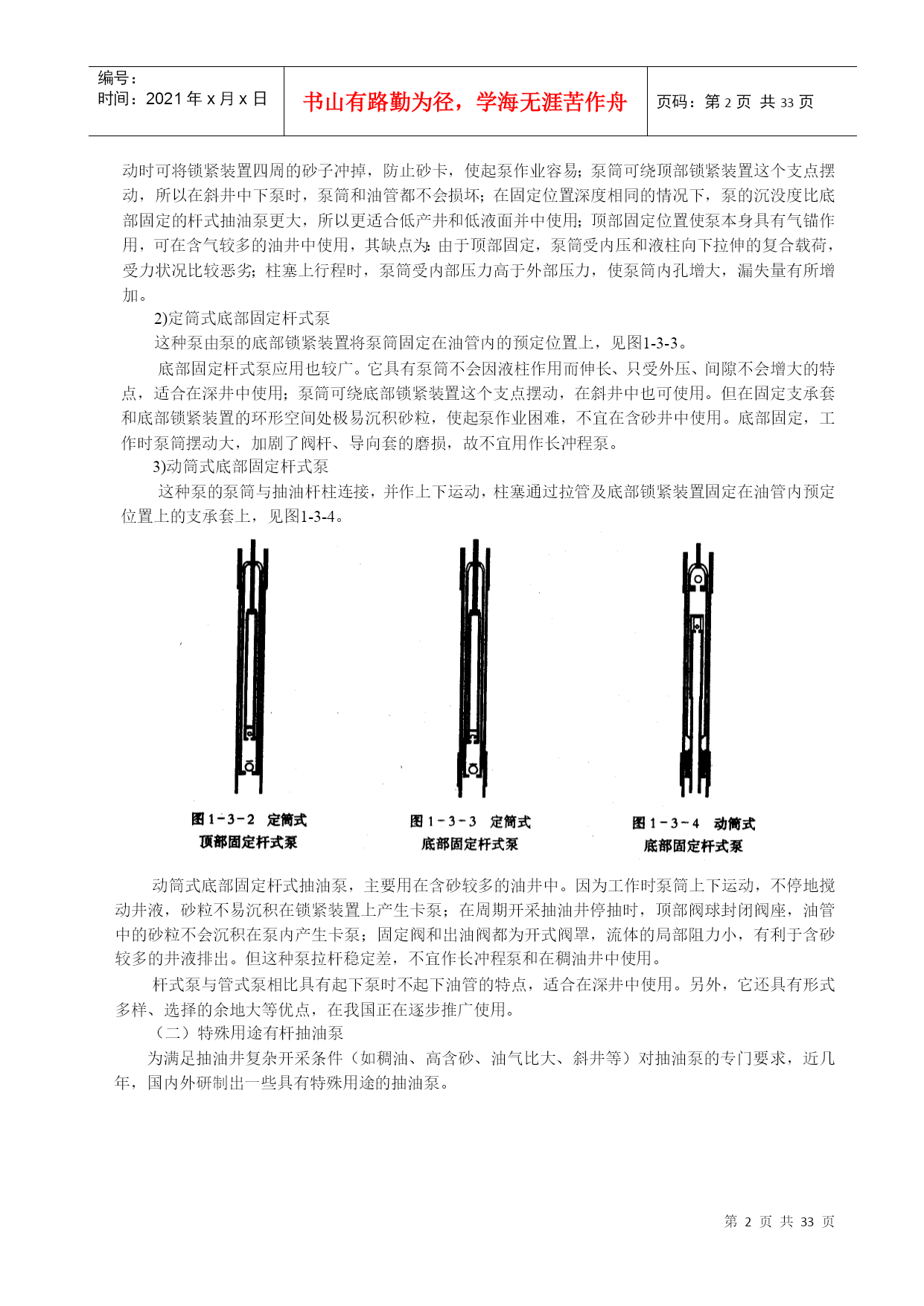 编号:时间:2021年x月x日书山有路勤为径,学海无涯苦作舟页码:第PAGE33页共NUMPAGES33页第PAGE\*MERGEFORMAT33页共NUMPAGES\*MERGEFORMAT33页第三章机械采油常识第一节有杆泵抽油机及井口装置在油田开发过程中,油田达到自喷晚期或停喷后,或原始地层压力不足,要对这些井进行采油,就必须安装一种人工举升装置,以维持所需要的井底流压和生产出地质配产要求的产量。人工举升采油有三种方式可供选择,即气举采油、有杆泵采油和无杆泵采油。当前,我国有杆泵采油方式占人工举升井数的90%。因此,本节就有杆泵抽油机及井口装置做一简单介绍。一、有杆抽油泵有杆抽油泵按用途可分为常规(标准)抽油泵和特种抽油泵两大类。通常,对于符合抽油泵标准设计和制造的抽油泵称作标准抽油泵或常规抽油泵,而具有专门用途的,如防砂、防气、抽稠油等,或具有与标准结构或尺寸不同的抽油泵称作特殊用途的抽油泵或专用抽油泵。我国抽油泵行业标准是SY/T5059-91《抽油泵》。(一)常规抽油泵常规抽油泵又分为管式泵和杆式泵两大类。1.管式抽油泵管式抽油泵是按设计的泵挂深度直接将泵筒连接在井下油管的下端,活塞连接在抽油杆的最下端,见图1-3-1。工作原理:上冲程时,抽油杆柱带动活塞上行,游动阀(排出阀)受自重和油管内液柱压力的作用而关闭,并提升柱塞上部的液体,与此同时柱塞下面的泵筒空间里的压力降低,当其压力低于套管压力时,该空间的液体将顶开油泵固定阀(吸人阀)而进人抽油泵活塞上冲程所让开的泵筒空间。当柱塞下行时,油泵的固定阀靠自重下落而关闭,泵筒内的液体受到压缩,在柱塞继续下行过程中,泵内的压力不断增高,当泵内压力增至超过油管内液柱压力时,将顶开油泵的游动阀使泵筒内的液体进人油管内。由于油泵柱塞在抽油机的带动下,连续做上下往复运动,因而油泵的固定阀和游动阀也将交替地关闭与打开,完成抽油泵的抽汲工作循环。管式抽油泵结构简单,成本低;泵筒壁较厚,承载能力大;在相同的油管尺寸下可安装的管式抽油泵直径比杆式抽油泵大,因而排液量也较大;对于产液量更大的油井还可通过脱接器安装泵径大于油管内径的管式抽油泵。因此在我国得到了广泛的应用。2.杆式抽油泵杆式抽油泵有定筒式顶部固定杆式泵、定筒式底部固定杆式泵及动筒式底部固定杆式泵三种。1)定筒式顶部固定杆式泵这种泵由泵顶部的固定支承装置将泵筒固定在油管内的预定位置上,见图1-3-2。顶部固定方式是杆式泵最常采用的,它不仅使用可靠,而且还具有下列优点:在柱塞运动时可将锁紧装置四周的砂子冲掉,防止砂卡,使起泵作业容易;泵筒可绕顶部锁紧装置这个支点摆动,所以在斜井中下泵时,泵筒和油管都不会损坏;在固定位置深度相同的情况下,泵的沉没度比底部固定的杆式抽油泵更大,所以更适合低产井和低液面并中使用;顶部固定位置使泵本身具有气锚作用,可在含气较多的油井中使用,其缺点为:由于顶部固定,泵筒受内压和液柱向下拉伸的复合载荷,受力状况比较恶劣;柱塞上行程时,泵筒受内部压力高于外部压力,使泵筒内孔增大,漏失量有所增加。2)定筒式底部固定杆式泵这种泵由泵的底部锁紧装置将泵筒固定在油管内的预定位置上,见图1-3-3。底部固定杆式泵应用也较广。它具有泵筒不会因液柱作用而伸长、只受外压、间隙不会增大的特点,适合在深井中使用;泵筒可绕底部锁紧装置这个支点摆动,在斜井中也可使用。但在固定支承套和底部锁紧装置的环形空间处极易沉积砂粒,使起泵作业困难,不宜在含砂井中使用。底部固定,工作时泵筒摆动大,加剧了阀杆、导向套的磨损,故不宜用作长冲程泵。3)动筒式底部固定杆式泵这种泵的泵筒与抽油杆柱连接,并作上下运动,柱塞通过拉管及底部锁紧装置固定在油管内预定位置上的支承套上,见图1-3-4。动筒式底部固定杆式抽油泵,主要用在含砂较多的油井中。因为工作时泵筒上下运动,不停地搅动井液,砂粒不易沉积在锁紧装置上产生卡泵;在周期开采抽油井停抽时,顶部阀球封闭阀座,油管中的砂粒不会沉积在泵内产生卡泵;固定阀和出油阀都为开式阀罩,流体的局部阻力小,有利于含砂较多的井液排出。但这种泵拉杆稳定差,不宜作长冲程泵和在稠油井中使用。杆式泵与管式泵相比具有起下泵时不起下油管的特点,适合在深井中使用。另外,它还具有形式多样、选择的余地大等优点,在我国正在逐步推广使用。(二)特殊用途有杆抽油泵为满足抽油井复杂开采条件(如稠油、高含砂、油气比大、斜井等)对抽油泵的专门要求,近几年,国内外研制出一些具有特殊用途的抽油泵。1.抽稠油泵稠油的粘度很高,阻力很大,用常规抽油泵无法使抽吸过程顺利进行,为此设计以下几种专门开采稠油的抽油泵。1)流线型管式抽油泵这种泵的结构与管式泵相比,有如下特点:(