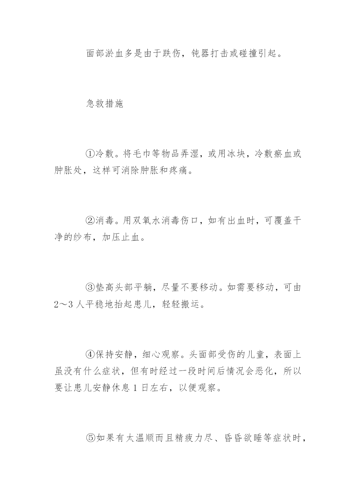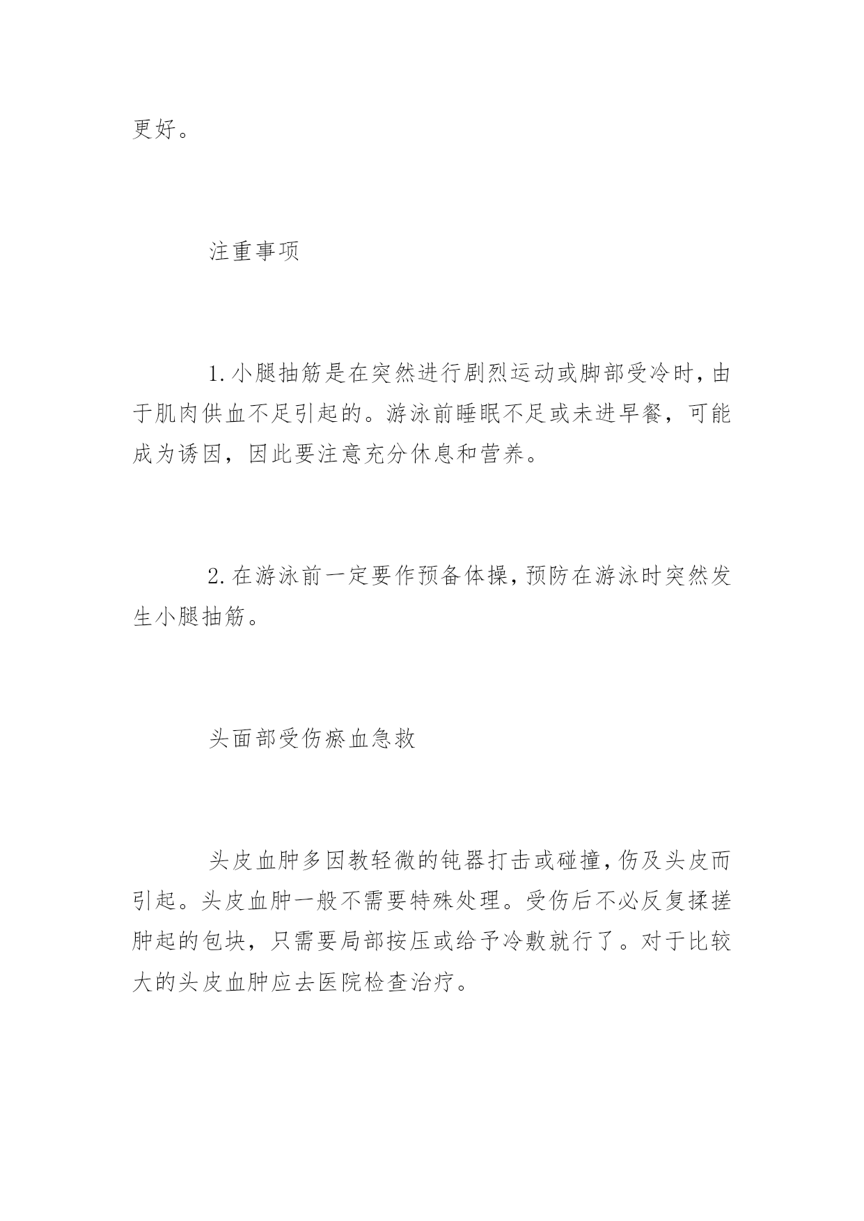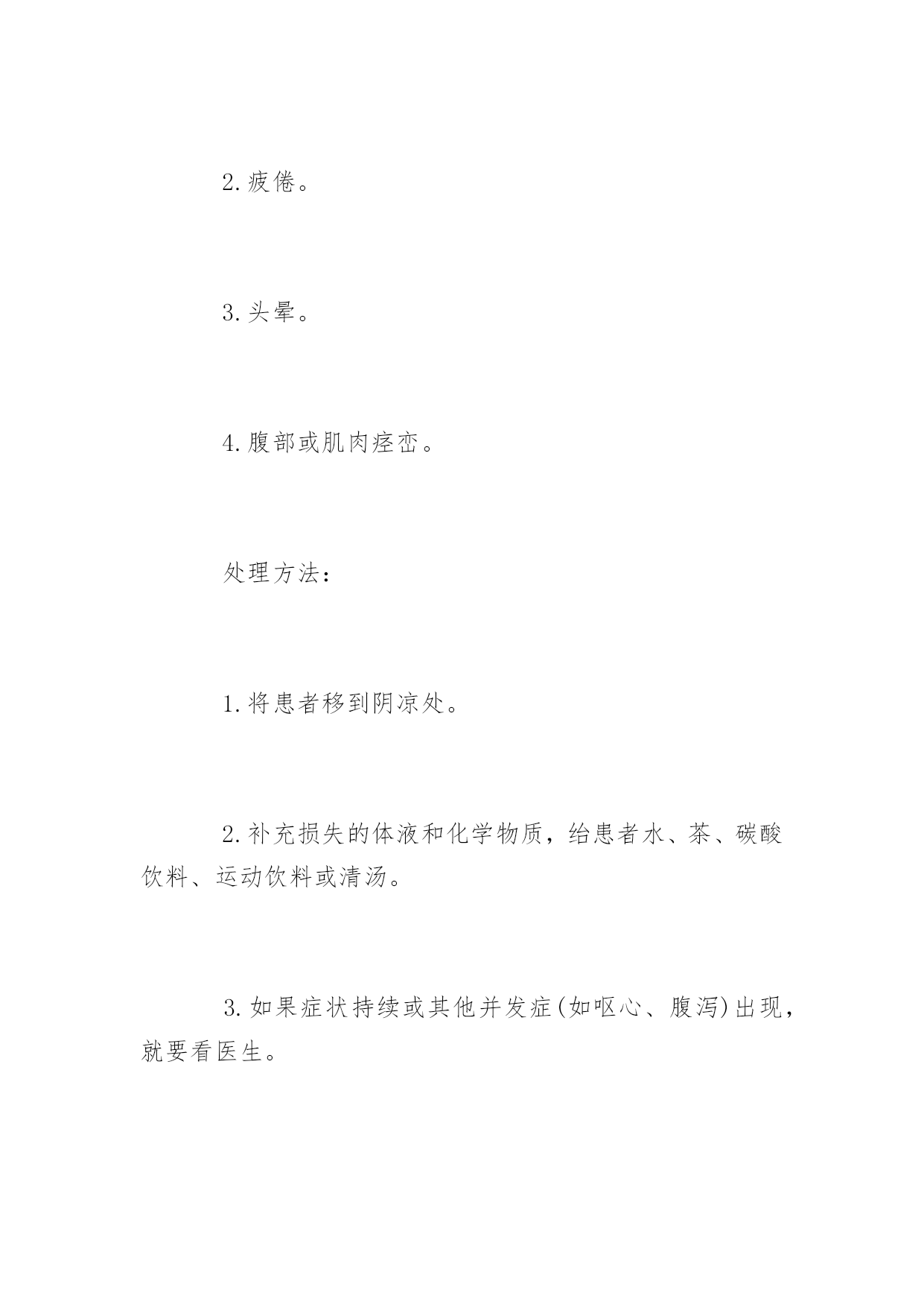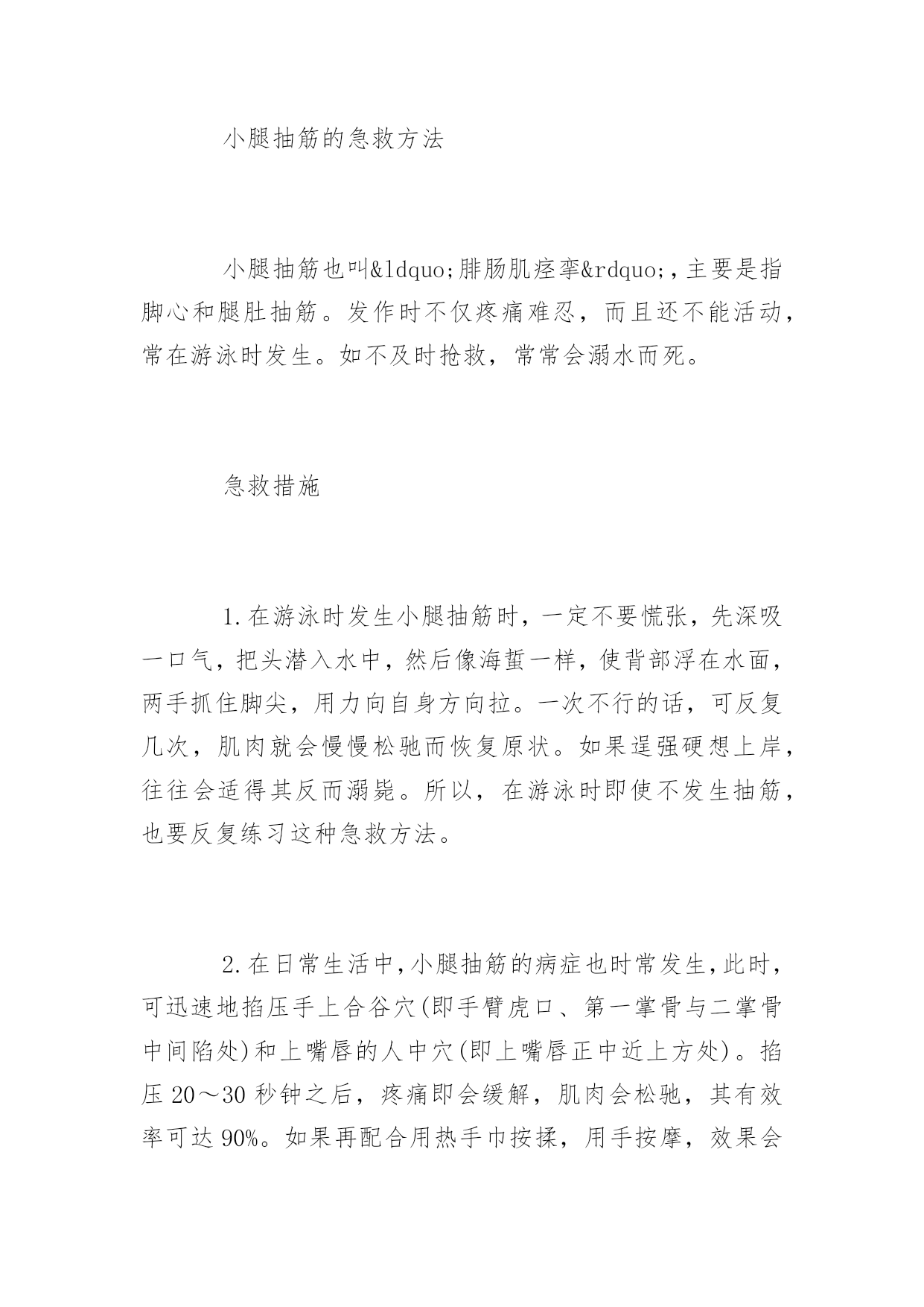 旅游保健小常识旅游保健小常识出门旅游一定要保护好自己的身体,以下是旅游保健小常识,希望对你们有所帮助。旅游途中脱水了怎么办?脱水是体内缺乏足够的水份所造成。呕吐、高烧、出汗、腹泻或缺乏水及食物都会导致严重脱水症。脱水是紧急的状况并且可能致命,这种毛病经常发生在年纪大的人身上,也常发生在婴幼儿身上。症状:1.极度口渴,患者可能无法解渴。2.疲倦。3.头晕。4.腹部或肌肉痉峦。处理方法:1.将患者移到阴凉处。2.补充损失的体液和化学物质,绐患者水、茶、碳酸饮料、运动饮料或清汤。3.如果症状持续或其他并发症(如呕心、腹泻)出现,就要看医生。小腿抽筋的急救方法小腿抽筋也叫“腓肠肌痉挛”,主要是指脚心和腿肚抽筋。发作时不仅疼痛难忍,而且还不能活动,常在游泳时发生。如不及时抢救,常常会溺水而死。急救措施1.在游泳时发生小腿抽筋时,一定不要慌张,先深吸一口气,把头潜入水中,然后像海蜇一样,使背部浮在水面,两手抓住脚尖,用力向自身方向拉。一次不行的话,可反复几次,肌肉就会慢慢松驰而恢复原状。如果逞强硬想上岸,往往会适得其反而溺毙。所以,在游泳时即使不发生抽筋,也要反复练习这种急救方法。2.在日常生活中,小腿抽筋的病症也时常发生,此时,可迅速地掐压手上合谷穴(即手臂虎口、第一掌骨与二掌骨中间陷处)和上嘴唇的人中穴(即上嘴唇正中近上方处)。掐压20~30秒钟之后,疼痛即会缓解,肌肉会松驰,其有效率可达90%。如果再配合用热手巾按揉,用手按摩,效果会更好。注重事项1.小腿抽筋是在突然进行剧烈运动或脚部受冷时,由于肌肉供血不足引起的。游泳前睡眠不足或未进早餐,可能成为诱因,因此要注意充分休息和营养。2.在游泳前一定要作预备体操,预防在游泳时突然发生小腿抽筋。头面部受伤瘀血急救头皮血肿多因教轻微的钝器打击或碰撞,伤及头皮而引起。头皮血肿一般不需要特殊处理。受伤后不必反复揉搓肿起的包块,只需要局部按压或给予冷敷就行了。对于比较大的头皮血肿应去医院检查治疗。面部淤血多是由于跌伤,钝器打击或碰撞引起。急救措施①冷敷。将毛巾等物品弄湿,或用冰块,冷敷瘀血或肿胀处,这样可消除肿胀和疼痛。②消毒。用双氧水消毒伤口,如有出血时,可覆盖干净的纱布,加压止血。③垫高头部平躺,尽量不要移动。如需要移动,可由2~3人平稳地抬起患儿,轻轻搬运。④保持安静,细心观察。头面部受伤的儿童,表面上虽没有什么症状,但有时经过一段时间后情况会恶化,所以要让患儿安静休息1日左右,以便观察。⑤如果有太温顺而且精疲力尽、昏昏欲睡等症状时,应立即送医院进行抢救。