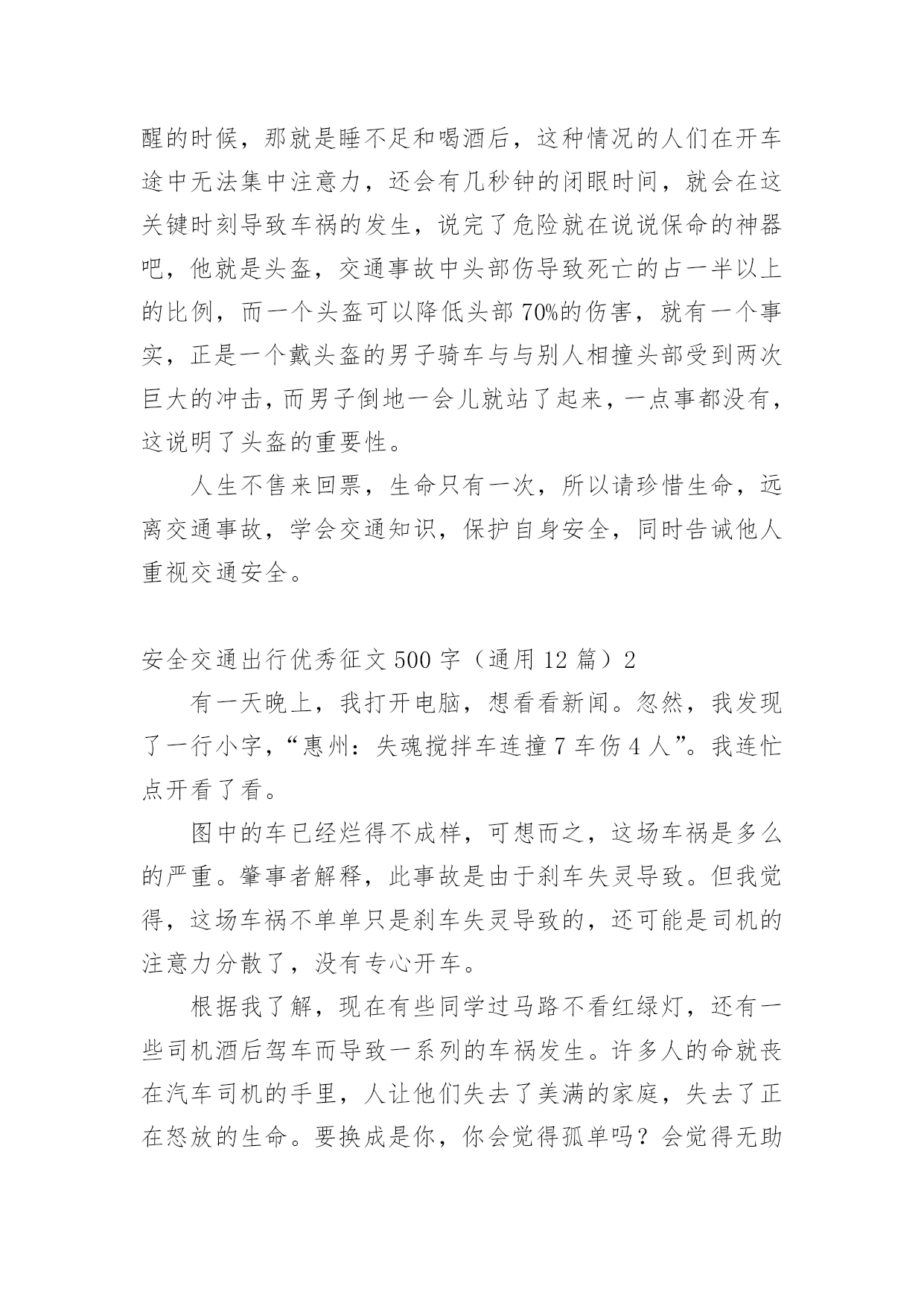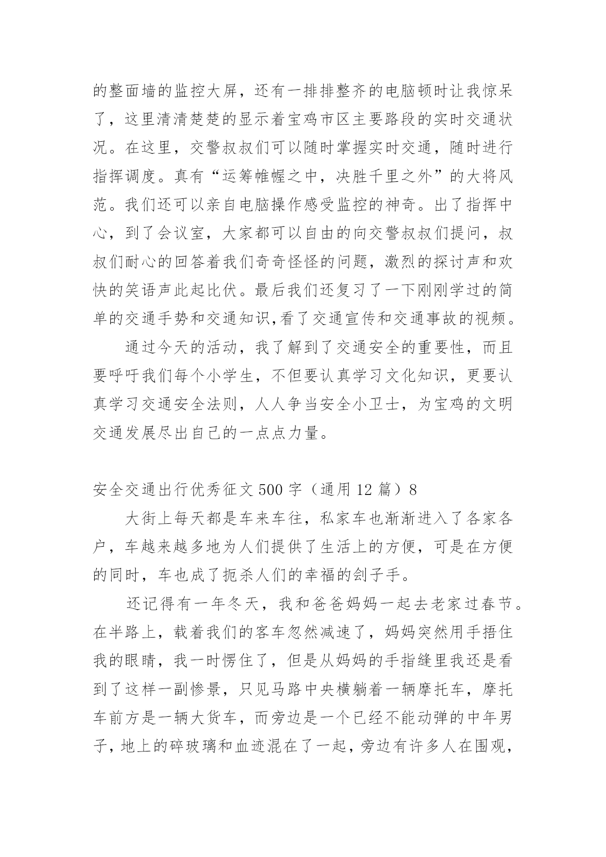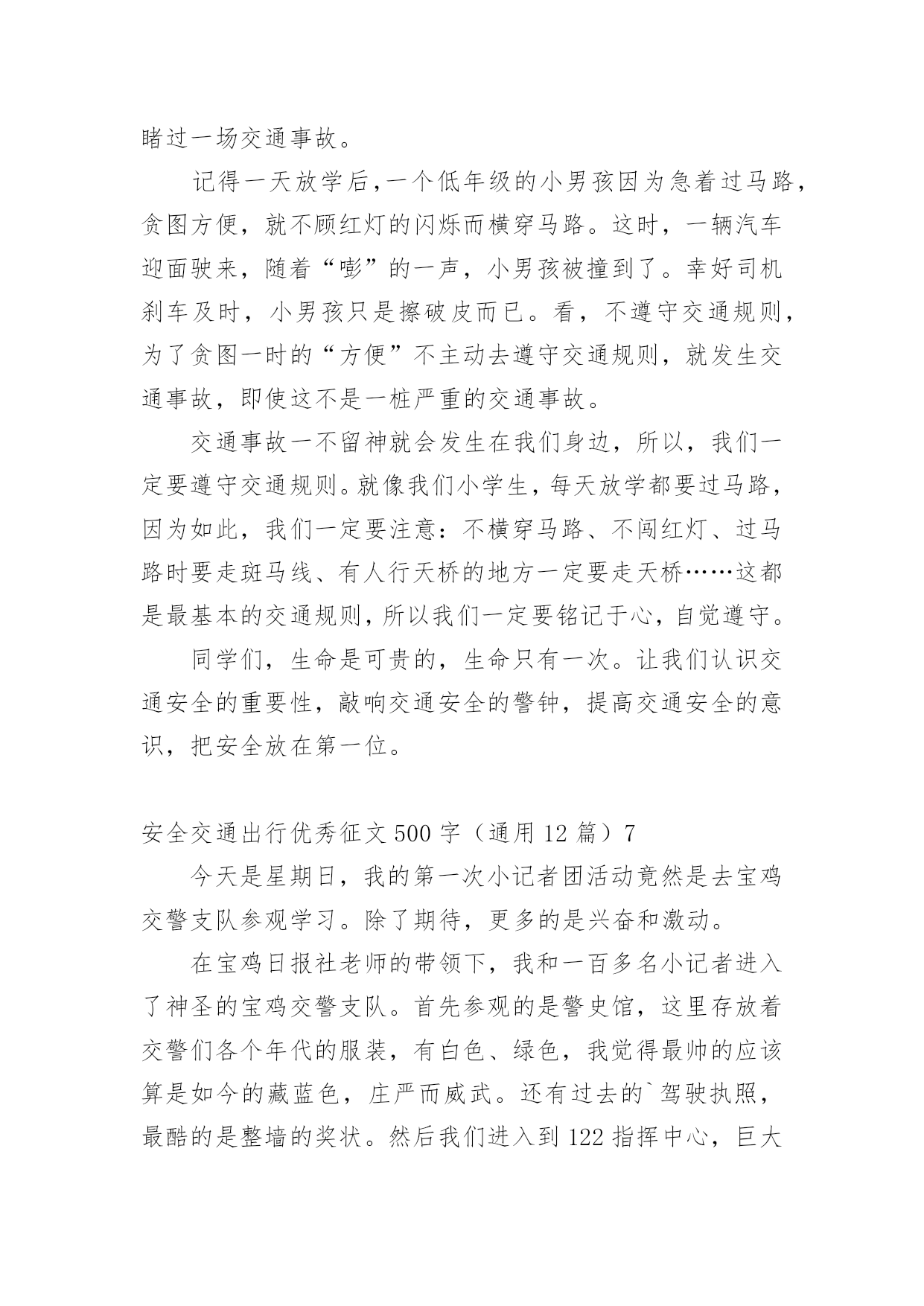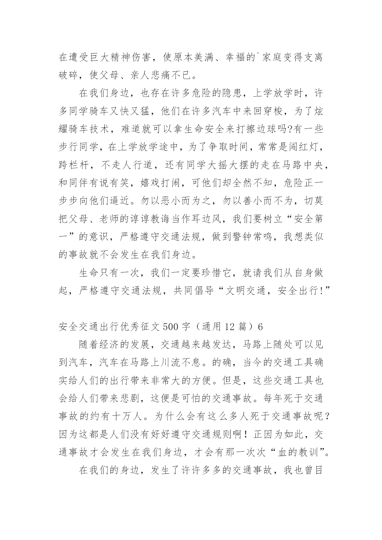 安全交通出行优秀征文安全交通出行优秀征文500字(通用12篇)在日常学习、工作和生活中,大家对征文都不陌生吧,征文没有题目、题材、格式的限定,与作文大体上一样。为了让您在写征文时更加简单方便,下面是小编精心整理的安全交通出行优秀征文500字(通用12篇),希望对大家有所帮助。安全交通出行优秀征文500字(通用12篇)1交通安全是每个人都要面临的问题。每一次出门都有可能遇到交通事故,可又不能一直不出门,所以交通安全是我们必须注意的问题,就让我们来聊聊吧。最近晋城交警发布了关于交通安全的短片,让我们来看看吧,他主要讲了等车的站位,汽车的盲区,什么年龄段可以骑的车,酒驾的危害,头盔的作用等方面等车时应离大货车远一些,如果太近会因为两个轮胎的差距而超出只预测的道路会被擦伤,每辆汽车都有盲区,尤其是大货车,因为大货车几乎有80%的盲区,而这个问题出现的原因就是大货车驾驶座位太高,说完大货车就再说说学生骑的车吧,初中生可以骑的是自行车,到了18岁拥有驾驶证才可以驾驶机动车。而现在有些中学生偷偷骑电动车上下学,这就是一个巨大的隐患,中学生遇事会慌慌张张,而大人们也有意识不清醒的时候,那就是睡不足和喝酒后,这种情况的人们在开车途中无法集中注意力,还会有几秒钟的闭眼时间,就会在这关键时刻导致车祸的发生,说完了危险就在说说保命的神器吧,他就是头盔,交通事故中头部伤导致死亡的占一半以上的比例,而一个头盔可以降低头部70%的伤害,就有一个事实,正是一个戴头盔的男子骑车与与别人相撞头部受到两次巨大的冲击,而男子倒地一会儿就站了起来,一点事都没有,这说明了头盔的重要性。人生不售来回票,生命只有一次,所以请珍惜生命,远离交通事故,学会交通知识,保护自身安全,同时告诫他人重视交通安全。安全交通出行优秀征文500字(通用12篇)2有一天晚上,我打开电脑,想看看新闻。忽然,我发现了一行小字,“惠州:失魂搅拌车连撞7车伤4人”。我连忙点开看了看。图中的车已经烂得不成样,可想而之,这场车祸是多么的严重。肇事者解释,此事故是由于刹车失灵导致。但我觉得,这场车祸不单单只是刹车失灵导致的,还可能是司机的注意力分散了,没有专心开车。根据我了解,现在有些同学过马路不看红绿灯,还有一些司机酒后驾车而导致一系列的车祸发生。许多人的命就丧在汽车司机的手里,人让他们失去了美满的家庭,失去了正在怒放的生命。要换成是你,你会觉得孤单吗?会觉得无助吗?你想让你的家人、朋友为你流下悲痛欲绝的眼泪吗?一个个生命消失在车飞驰的瞬间,他们的家人不是跟着痛苦一瞬间,而是痛苦一辈子!生命不是儿戏!生命只有一次!我们要珍惜生命!那些血腥的事实让我们体会到失去亲人的痛苦,也明白了交通安全的重要性。难道你要在车费吃的一瞬间才清醒过来吗?到那时你才明白什么是安全、什么是生命吗?所以,作为莲湖区沣惠路小学生的我,在此呼吁大家牢记交通安全顺口溜:红灯停,绿灯行,交通安全要牢记。街头标志要遵守,警察手势要看懂。拐弯时,要打灯,街头巷尾要慢行。酒后驾驶真不好,赔了车子又蹲狱。高速路莫超车,切记车速要控好。客车货车忌超载,交通安全你我他。安全交通出行优秀征文500字(通用12篇)3我对交警支队这个地方充满了好奇,交警叔叔们是怎样工作的?他们是怎样抓拍交通违法行为的?他们是如何处理重大交通事故的……带着好奇,我来到了市交警支队。进入支队的“神经中枢”——122指挥中心!首先映入眼帘的是墙上比电影院银幕还要大的电子液晶显示屏,上面各个路段的交通状况一目了然。通过交警叔叔的介绍,我知道了这个液晶显示屏由48个小屏幕组成,可以清楚地看出市区主要路段的交通状况,我也看到了火炬路、经二路、太白路等我比较熟悉的路段。啊!火炬路禁停路段上怎么会有车停放呢?我正在疑惑时,交警叔叔已经拍照取证了,真是“天网恢恢,疏而不漏”呀!接下来,我们观看了交警支队的纪录片,随着科技的发展和信息化的应用,他们利用122指挥中心这一平台,及时发现并查获了多起毒驾案和套牌违法案件,交警叔叔可真“神通广大”呀!最后,我们参观了警史馆。凝望着一个个奖牌,我心潮澎湃,不管春夏秋冬,严寒酷暑,交警叔叔们兢兢业业始终坚守在工作岗位上,我对他们的敬意油然而生。通过参观交警支队的工作,我对于交通管理法规有了进一步了解。作为一名学生代表和小记者,我也应该向身边的人宣传交通安全常识,从我做起,从身边做起,理解交警叔叔们的辛勤工作,做一名遵纪守法的好公民,让我们的交通秩序和出行环境更加美好!安全交通出行优秀征文500字(通用12篇)4安全,它时常在我们身边,可是没有人认真留意它,结果却酿成大祸。安全有时发生在校园里,有时发生在公路上,这次,我要谈谈交通安全。交通安全在所有安全事故中最为严重。在雾天和下雪天应该更加重视,因为浓雾会导致司机视线模糊,很可能出现两车相撞的事故,