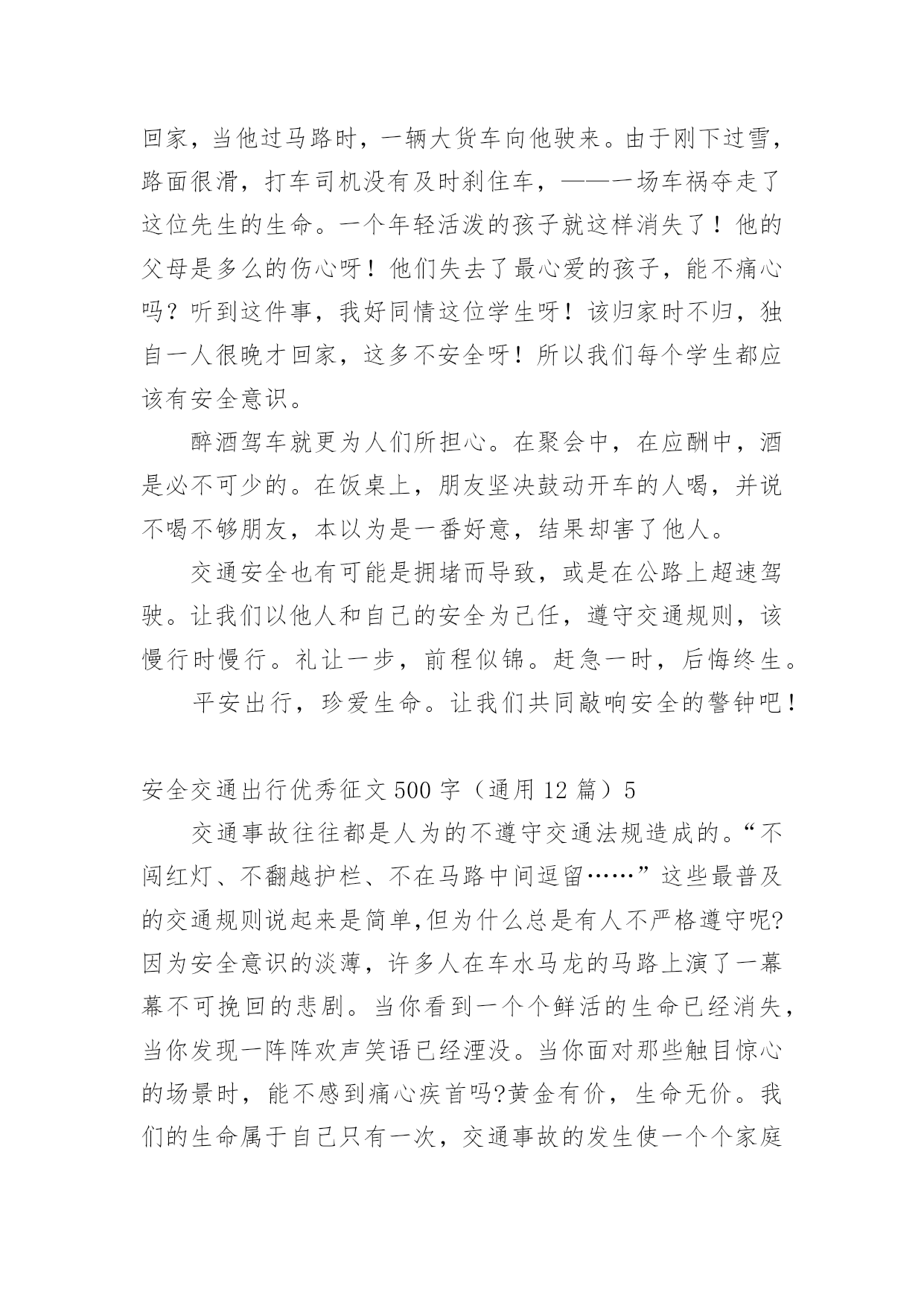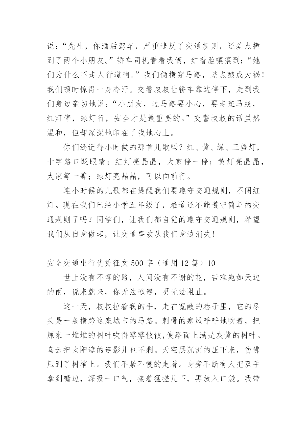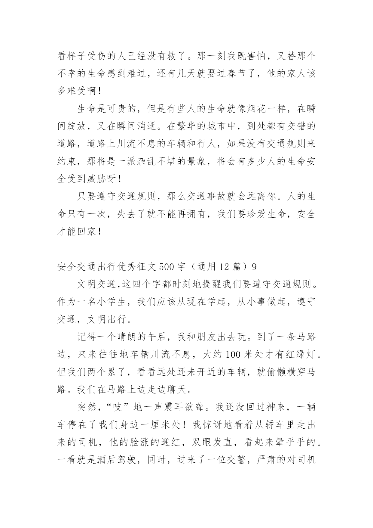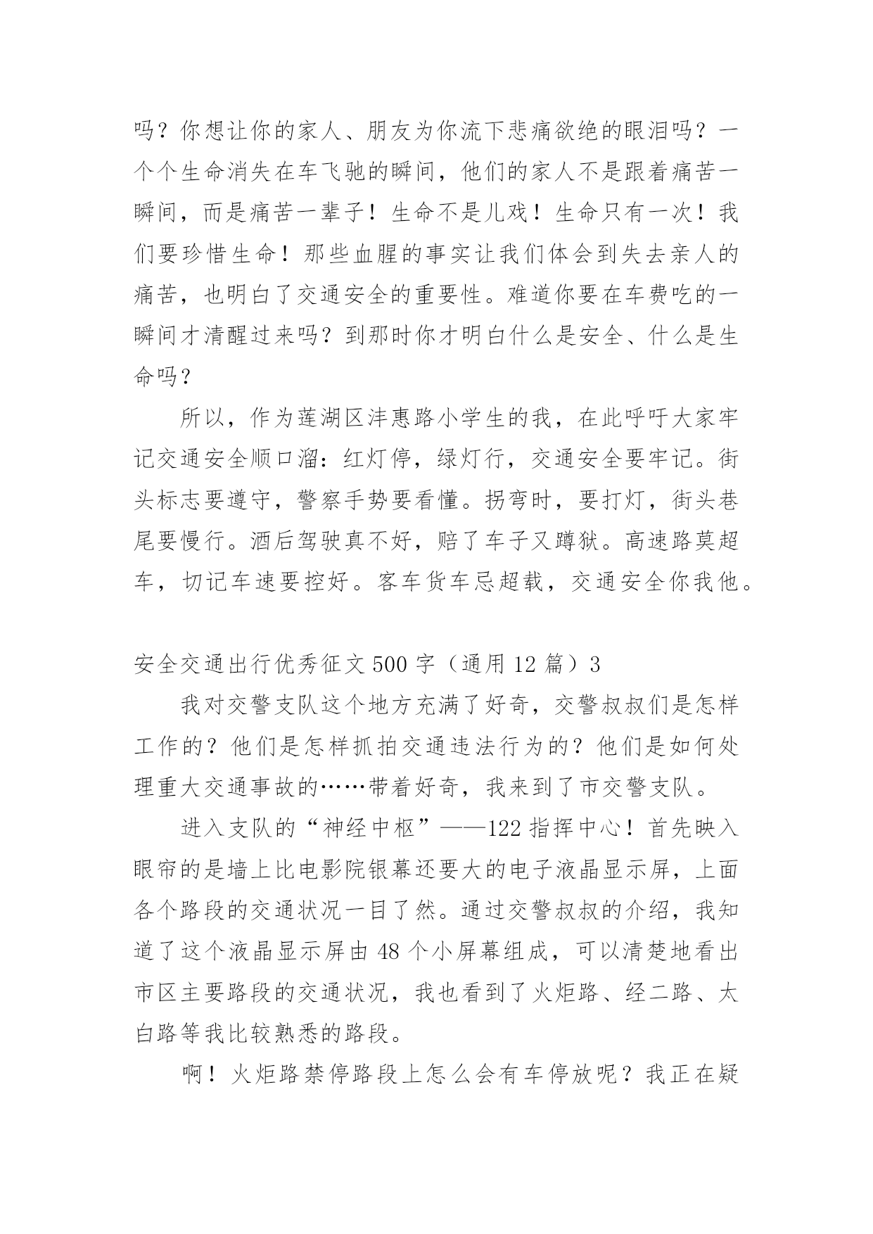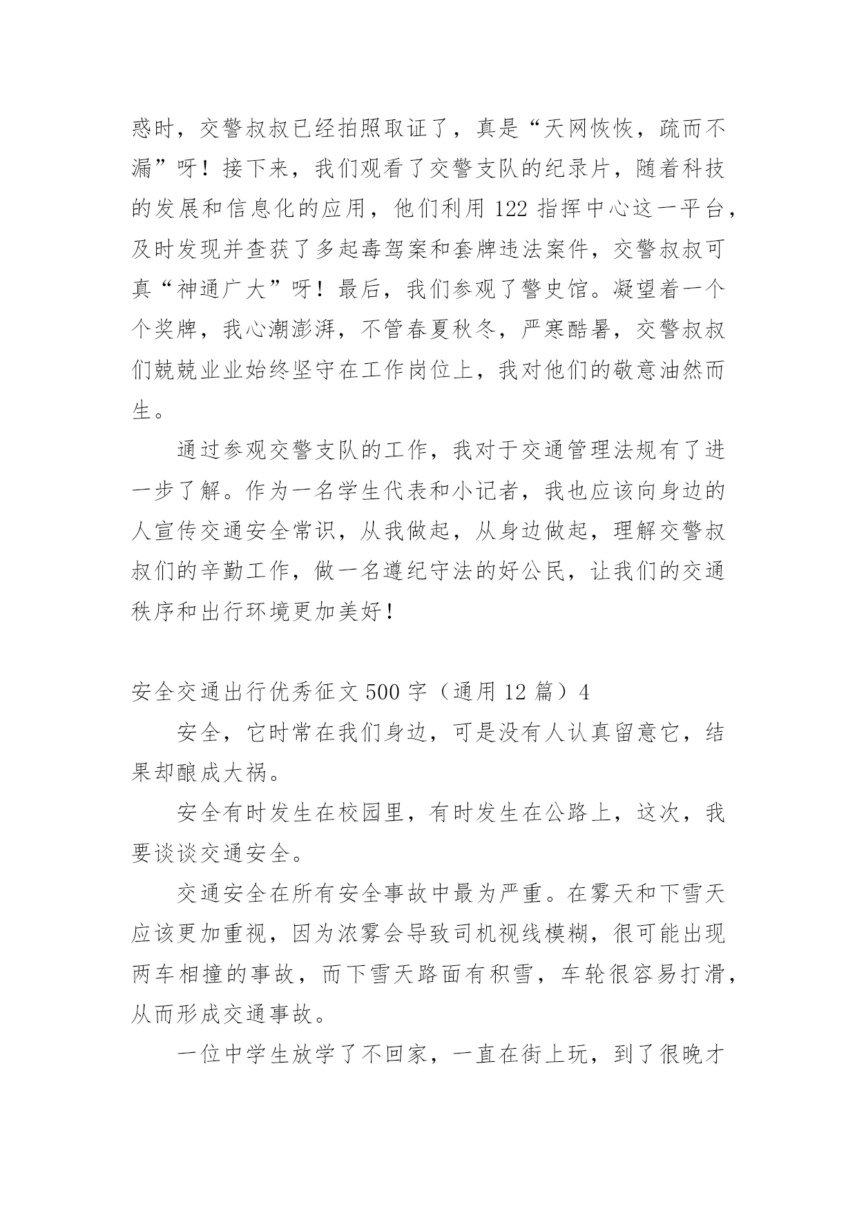 安全交通出行优秀征文安全交通出行优秀征文500字(通用12篇)在日常学习、工作和生活中,大家对征文都不陌生吧,征文没有题目、题材、格式的限定,与作文大体上一样。为了让您在写征文时更加简单方便,下面是小编精心整理的安全交通出行优秀征文500字(通用12篇),希望对大家有所帮助。安全交通出行优秀征文500字(通用12篇)1交通安全是每个人都要面临的问题。每一次出门都有可能遇到交通事故,可又不能一直不出门,所以交通安全是我们必须注意的问题,就让我们来聊聊吧。最近晋城交警发布了关于交通安全的短片,让我们来看看吧,他主要讲了等车的站位,汽车的盲区,什么年龄段可以骑的车,酒驾的危害,头盔的作用等方面等车时应离大货车远一些,如果太近会因为两个轮胎的差距而超出只预测的道路会被擦伤,每辆汽车都有盲区,尤其是大货车,因为大货车几乎有80%的盲区,而这个问题出现的原因就是大货车驾驶座位太高,说完大货车就再说说学生骑的车吧,初中生可以骑的是自行车,到了18岁拥有驾驶证才可以驾驶机动车。而现在有些中学生偷偷骑电动车上下学,这就是一个巨大的隐患,中学生遇事会慌慌张张,而大人们也有意识不清醒的时候,那就是睡不足和喝酒后,这种情况的人们在开车途中无法集中注意力,还会有几秒钟的闭眼时间,就会在这关键时刻导致车祸的发生,说完了危险就在说说保命的神器吧,他就是头盔,交通事故中头部伤导致死亡的占一半以上的比例,而一个头盔可以降低头部70%的伤害,就有一个事实,正是一个戴头盔的男子骑车与与别人相撞头部受到两次巨大的冲击,而男子倒地一会儿就站了起来,一点事都没有,这说明了头盔的重要性。人生不售来回票,生命只有一次,所以请珍惜生命,远离交通事故,学会交通知识,保护自身安全,同时告诫他人重视交通安全。安全交通出行优秀征文500字(通用12篇)2有一天晚上,我打开电脑,想看看新闻。忽然,我发现了一行小字,“惠州:失魂搅拌车连撞7车伤4人”。我连忙点开看了看。图中的车已经烂得不成样,可想而之,这场车祸是多么的严重。肇事者解释,此事故是由于刹车失灵导致。但我觉得,这场车祸不单单只是刹车失灵导致的,还可能是司机的注意力分散了,没有专心开车。根据我了解,现在有些同学过马路不看红绿灯,还有一些司机酒后驾车而导致一系列的车祸发生。许多人的命就丧在汽车司机的手里,人让他们失去了美满的家庭,失去了正在怒放的生命。要换成是你,你会觉得孤单吗?会觉得无助吗?你想让你的家人、朋友为你流下悲痛欲绝的眼泪吗?一个个生命消失在车飞驰的瞬间,他们的家人不是跟着痛苦一瞬间,而是痛苦一辈子!生命不是儿戏!生命只有一次!我们要珍惜生命!那些血腥的事实让我们体会到失去亲人的痛苦,也明白了交通安全的重要性。难道你要在车费吃的一瞬间才清醒过来吗?到那时你才明白什么是安全、什么是生命吗?所以,作为莲湖区沣惠路小学生的我,在此呼吁大家牢记交通安全顺口溜:红灯停,绿灯行,交通安全要牢记。街头标志要遵守,警察手势要看懂。拐弯时,要打灯,街头巷尾要慢行。酒后驾驶真不好,赔了车子又蹲狱。高速路莫超车,切记车速要控好。客车货车忌超载,交通安全你我他。安全交通出行优秀征文500字(通用12篇)3我对交警支队这个地方充满了好奇,交警叔叔们是怎样工作的?他们是怎样抓拍交通违法行为的?他们是如何处理重大交通事故的……带着好奇,我来到了市交警支队。进入支队的“神经中枢”——122指挥中心!首先映入眼帘的是墙上比电影院银幕还要大的电子液晶显示屏,上面各个路段的交通状况一目了然。通过交警叔叔的介绍,我知道了这个液晶显示屏由48个小屏幕组成,可以清楚地看出市区主要路段的交通状况,我也看到了火炬路、经二路、太白路等我比较熟悉的路段。啊!火炬路禁停路段上怎么会有车停放呢?我正在疑惑时,交警叔叔已经拍照取证了,真是“天网恢恢,疏而不漏”呀!接下来,我们观看了交警支队的纪录片,随着科技的发展和信息化的应用,他们利用122指挥中心这一平台,及时发现并查获了多起毒驾案和套牌违法案件,交警叔叔可真“神通广大”呀!最后,我们参观了警史馆。凝望着一个个奖牌,我心潮澎湃,不管春夏秋冬,严寒酷暑,交警叔叔们兢兢业业始终坚守在工作岗位上,我对他们的敬意油然而生。通过参观交警支队的工作,我对于交通管理法规有了进一步了解。作为一名学生代表和小记者,我也应该向身边的人宣传交通安全常识,从我做起,从身边做起,理解交警叔叔们的辛勤工作,做一名遵纪守法的好公民,让我们的交通秩序和出行环境更加美好!安全交通出行优秀征文500字(通用12篇)4安全,它时常在我们身边,可是没有人认真留意它,结果却酿成大祸。安全有时发生在校园里,有时发生在公路上,这次,我要谈谈交通安全。交通安全在所有安全事故中最为严重。在雾天和下雪天应该更加重视,因为浓雾会导致司机视线模糊,很可能出现两车相撞的事故,