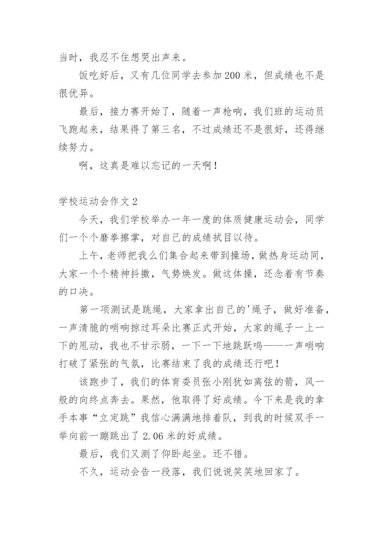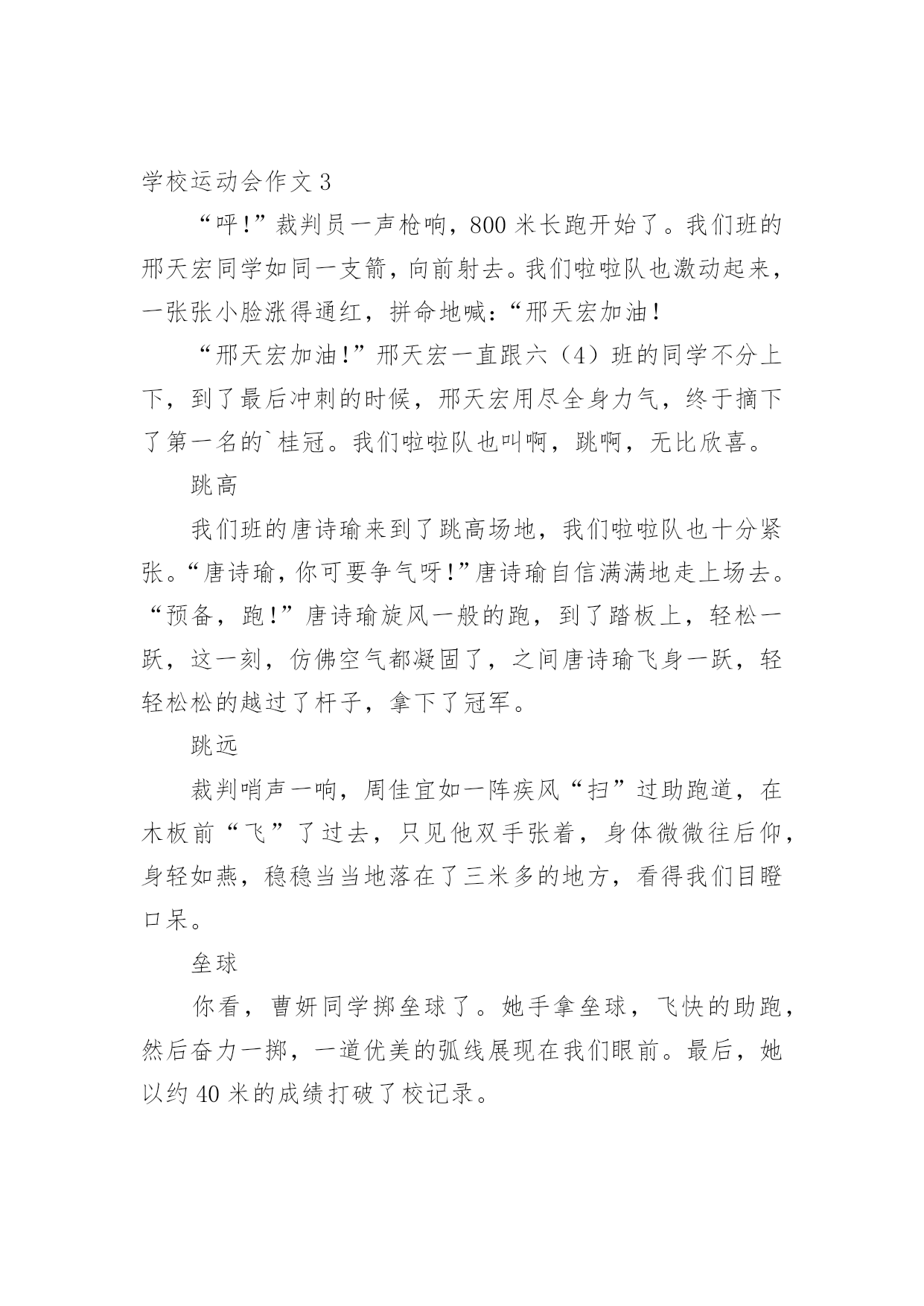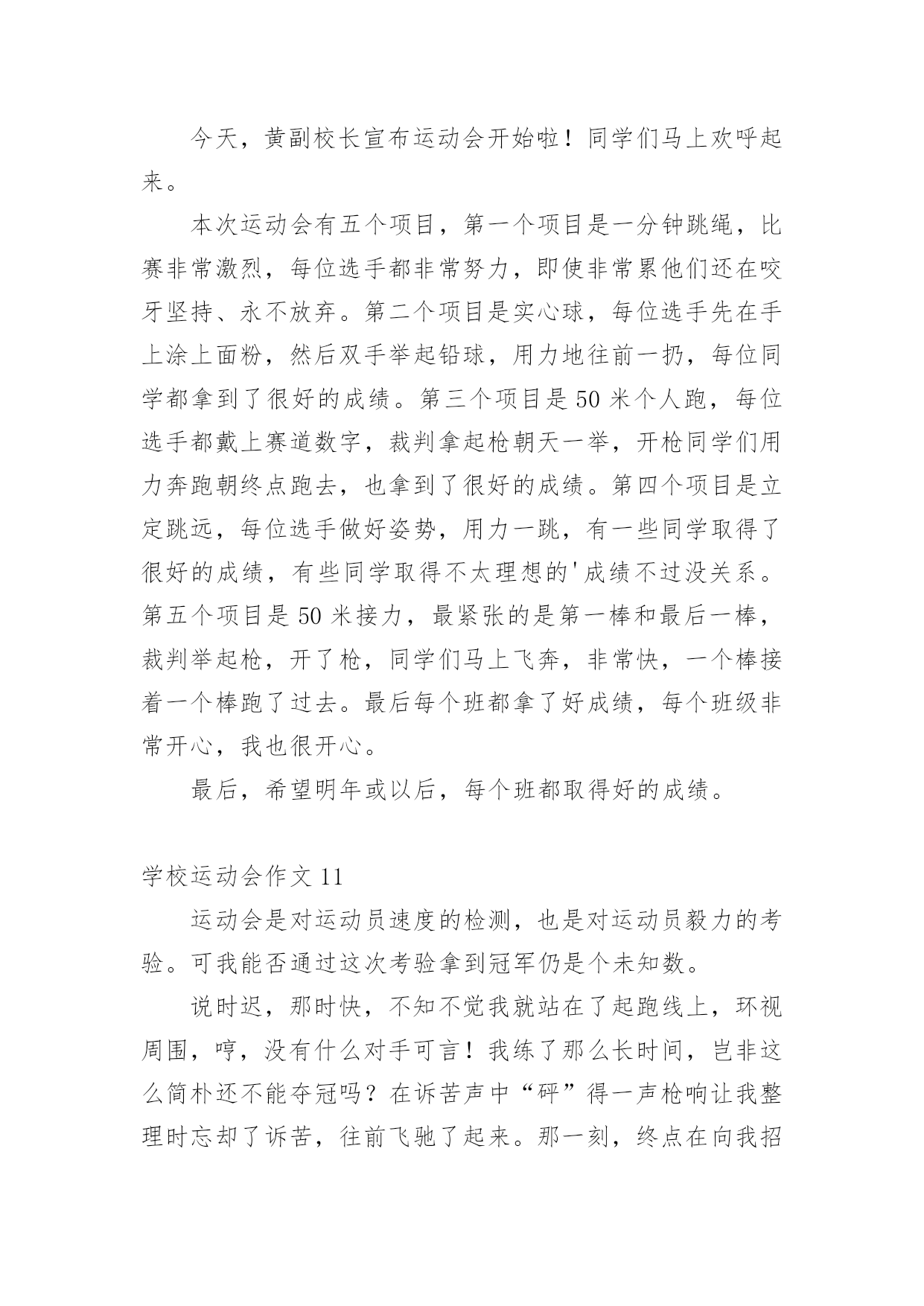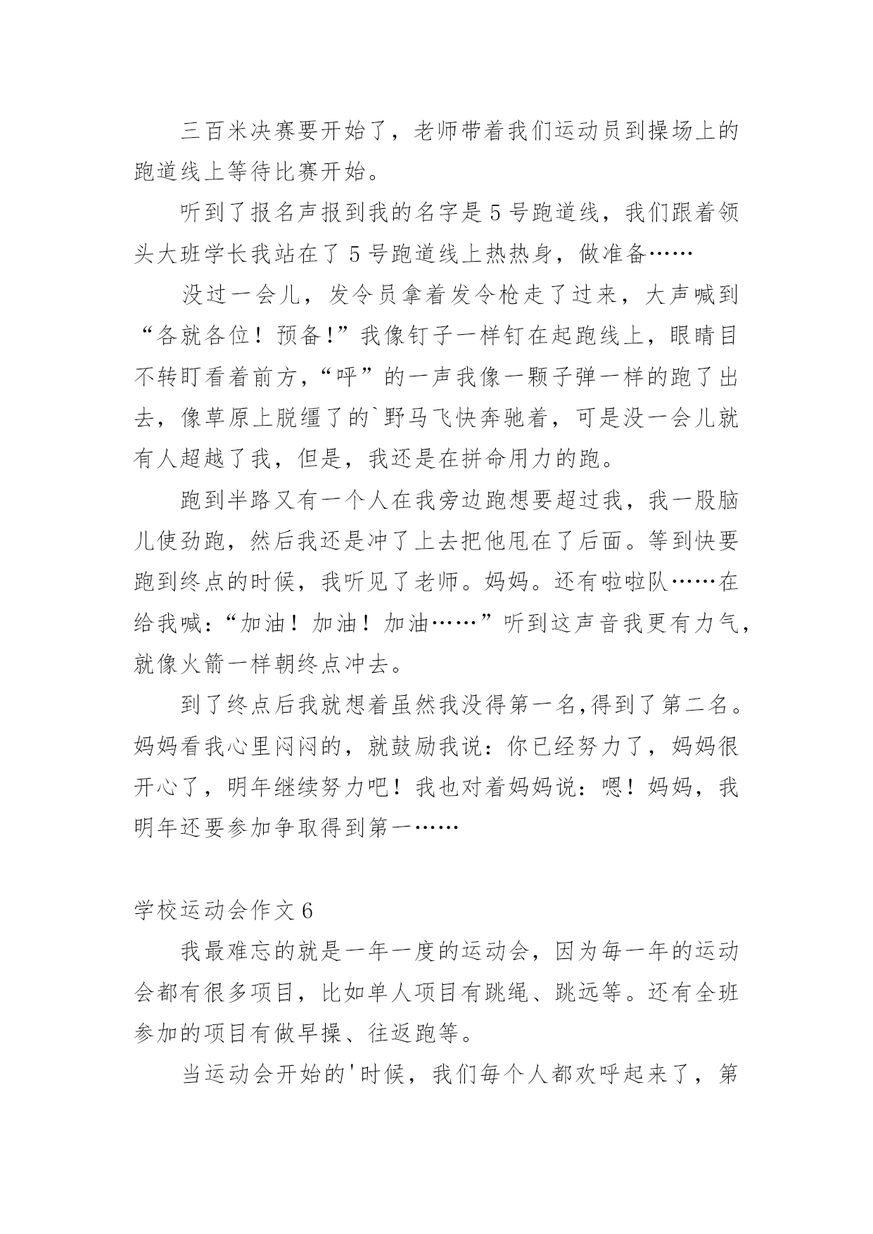 学校运动会作文1学校运动会作文无论是身处学校还是步入社会,许多人都有过写作文的经历,对作文都不陌生吧,作文是由文字组成,经过人的思想考虑,通过语言组织来表达一个主题意义的文体。如何写一篇有思想、有文采的作文呢?下面是小编为大家整理的学校运动会作文,欢迎阅读,希望大家能够喜欢。学校运动会作文1今天,我们广济小学一至三年级举行了一次运动会。早上,我早早地来到海曙区实险学校,到了那里,我坐在位子上,等着比赛的开始。比赛之前先做了一遍广播体xxx,做完广播xxx,我又踏着步走到了自己的座位上,当老师说到二年级男子60米跑的同学来报到的`时候,我看见虞哲等同学在家长的带领下走进了xxx场,我静静地等着60米跑的开始。突然,枪声一响,接着我看到虞哲正飞快地跑着,也许太紧张了,当我再一次为虞哲加油助威时,我看到他已非常落后了,我心里有种失望的心情。后来,我又看了100米、垒球、跳远,不过这些运动员的成绩都不是非常出色,我心里难受极了。快到中午时,吴悠祺去参加跳高,一个小时过去了,吴悠祺终于回来了,我问了一下她的成绩,她说只有第六名,当时,我忍不住想哭出声来。饭吃好后,又有几位同学去参加200米,但成绩也不是很优异。最后,接力赛开始了,随着一声枪响,我们班的运动员飞跑起来,结果得了第三名,不过成绩还不是很好,还得继续努力。啊,这真是难以忘记的一天啊!学校运动会作文2今天,我们学校举办一年一度的体质健康运动会,同学们一个个磨拳擦掌,对自己的成绩拭目以待。上午,老师把我么们集合起来带到操场,做热身运动同,大家一个个精神抖擞,气势焕发。做这体操,还念着有节奏的口决。第一项测试是跳绳,大家拿出自己的'绳子,做好准备,一声清脆的哨响掠过耳朵比赛正式开始,大家的绳子一上一下的甩动,我也不甘示弱,一下一下地跳跃呜——一声哨响打破了紧张的气氛,比赛结束了我的成绩还行吧!该跑步了,我们的体育委员张小刚犹如离弦的箭,风一般的向终点奔去。果然,他取得了好成绩。今下来是我的拿手本事“立定跳”我信心满满地排着队,到我的时候双手一举向前一蹦跳出了2.06米的好成绩。最后,我们又测了仰卧起坐。还不错。不久,运动会告一段落,我们说说笑笑地回家了。学校运动会作文3“呯!”裁判员一声枪响,800米长跑开始了。我们班的邢天宏同学如同一支箭,向前射去。我们啦啦队也激动起来,一张张小脸涨得通红,拼命地喊:“邢天宏加油!“邢天宏加油!”邢天宏一直跟六(4)班的同学不分上下,到了最后冲刺的时候,邢天宏用尽全身力气,终于摘下了第一名的`桂冠。我们啦啦队也叫啊,跳啊,无比欣喜。跳高我们班的唐诗瑜来到了跳高场地,我们啦啦队也十分紧张。“唐诗瑜,你可要争气呀!”唐诗瑜自信满满地走上场去。“预备,跑!”唐诗瑜旋风一般的跑,到了踏板上,轻松一跃,这一刻,仿佛空气都凝固了,之间唐诗瑜飞身一跃,轻轻松松的越过了杆子,拿下了冠军。跳远裁判哨声一响,周佳宜如一阵疾风“扫”过助跑道,在木板前“飞”了过去,只见他双手张着,身体微微往后仰,身轻如燕,稳稳当当地落在了三米多的地方,看得我们目瞪口呆。垒球你看,曹妍同学掷垒球了。她手拿垒球,飞快的助跑,然后奋力一掷,一道优美的弧线展现在我们眼前。最后,她以约40米的成绩打破了校记录。学校运动会作文4一年一度的运动会终于来临了,我踏着愉快的心情走进学校,我看到五彩缤纷的气球和风车,装饰每个角落、开始我们心中所期待的运动大会。运动会开始了,首先饰三、四、五、六年级的进场,第一个节目是由四、五、六年级带来的健康操,他们个个精神抖擞,赢的全场乐列的掌声。下一个节目就是一百米个人赛,希望我可以得第一名,“好家伙”!我得了第三名,我高兴极了,因为这是我第一次一百米个人赛获得前三名。接下来是最好完的趣味竞赛,我们名称是“人肉陀螺”,看到每个同学咬完糖果回来时脸上白白的面粉,我忍不住哈哈大笑。午餐时同学肚子一定很饿,饭一抬上来,美为同学都冲上去盛饭,个个同学狼吞虎咽。吃饱了休息一下下午的'节目就开始了,首先是最刺激的大对接力,可惜我们班上的最后一名。运动会所有的节目中让我印象最深刻的就是团体接力和一百米个人竞赛,因为我是第一次个人赛得前三名,所以让我印象深刻。运动会结束了是回家的时候,虽然玩的汗流浃背,可是都玩的很快乐,我依依不舍的离开学校,回响起今天的点点滴滴,还真是意犹未尽,我们也要有运动家的风度,“胜不骄,败不馁”,努力到最后,希望明年的运动会会更好玩。学校运动会作文5三百米决赛要开始了,老师带着我们运动员到操场上的跑道线上等待比赛开始。听到了报名声报到我的名字是5号跑道线,我们跟着领头大班学长我站在了5号跑道线上热热身,做准备……没过一会儿,发令员拿着发令枪走了过来,大声喊到“各就各位!预备!”我像钉子一样钉在起跑线上,眼睛目不转盯看着前方,“呯”的一声我像一颗子弹一样的