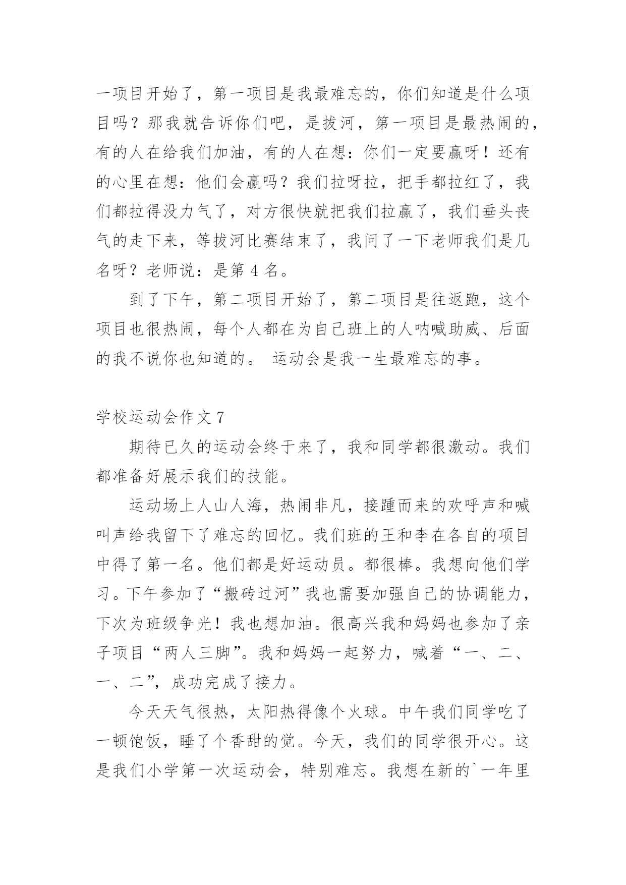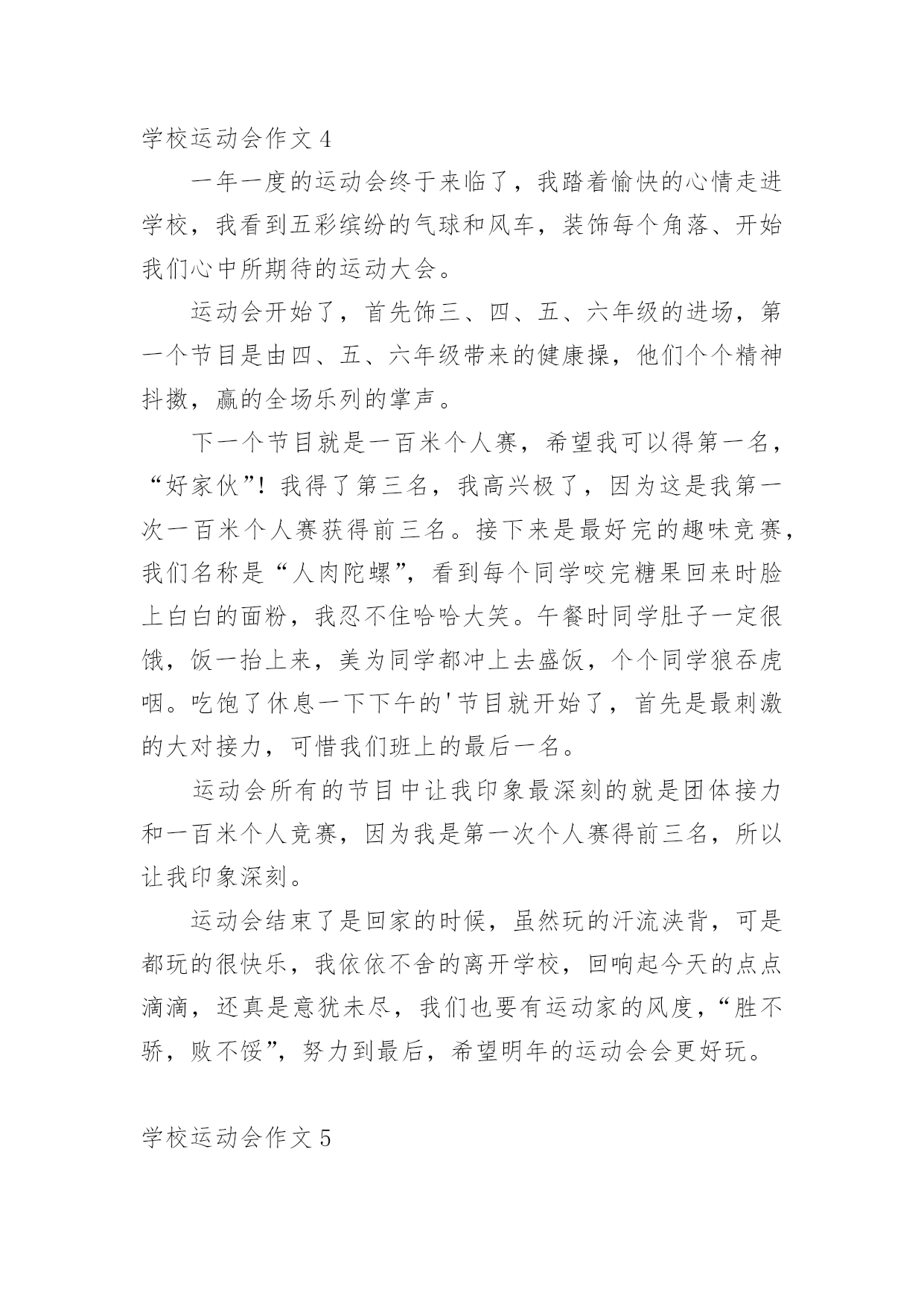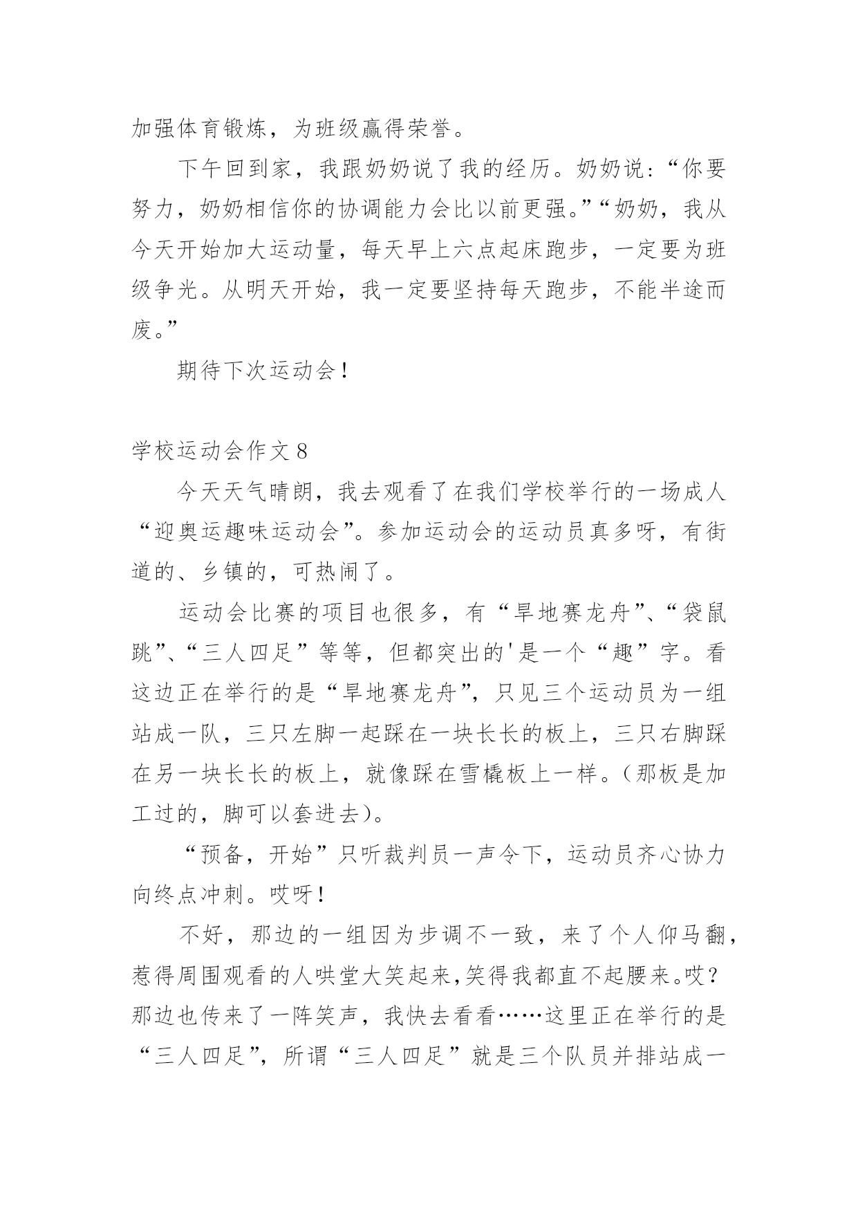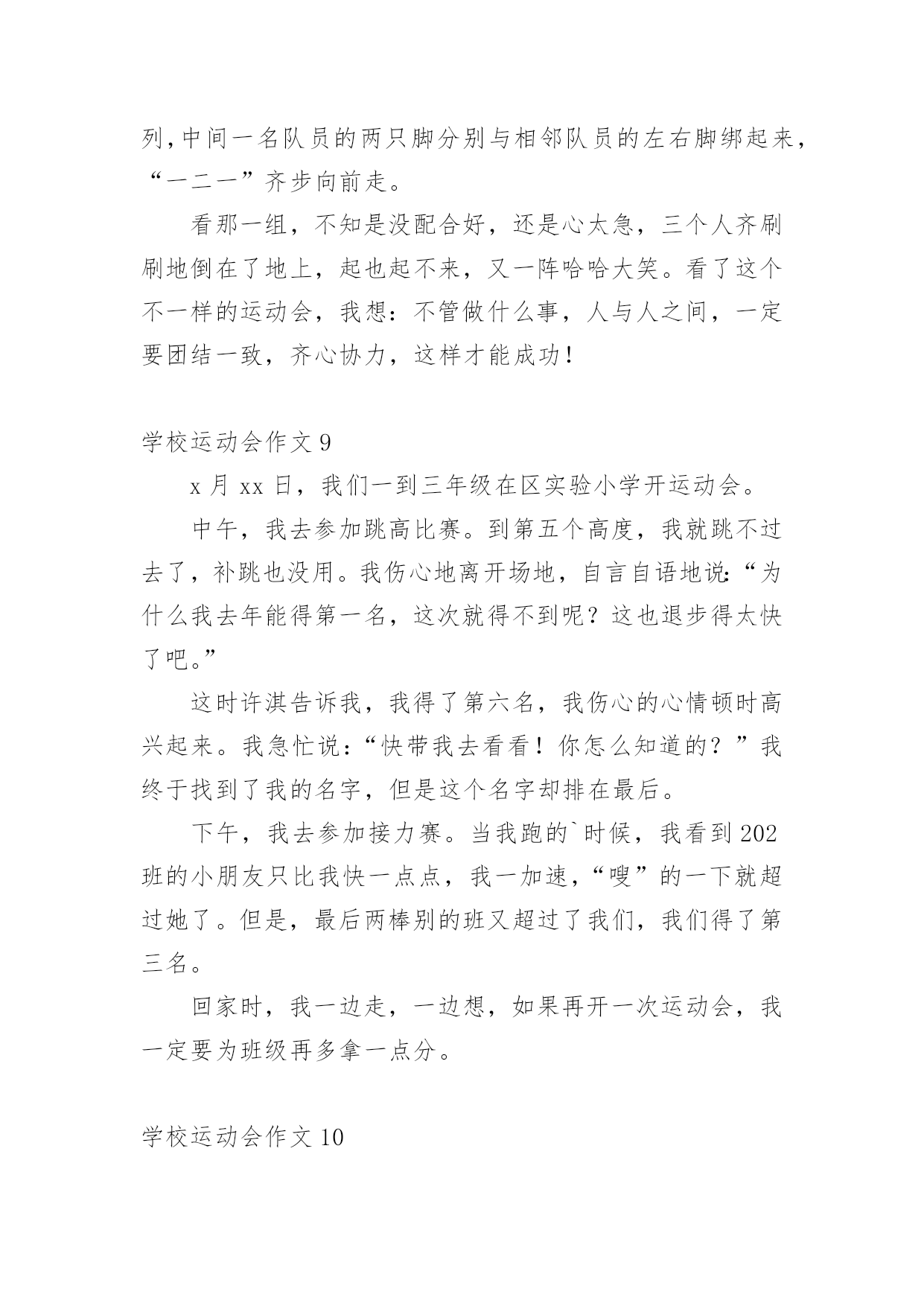 学校运动会作文1学校运动会作文无论是身处学校还是步入社会,许多人都有过写作文的经历,对作文都不陌生吧,作文是由文字组成,经过人的思想考虑,通过语言组织来表达一个主题意义的文体。如何写一篇有思想、有文采的作文呢?下面是小编为大家整理的学校运动会作文,欢迎阅读,希望大家能够喜欢。学校运动会作文1今天,我们广济小学一至三年级举行了一次运动会。早上,我早早地来到海曙区实险学校,到了那里,我坐在位子上,等着比赛的开始。比赛之前先做了一遍广播体xxx,做完广播xxx,我又踏着步走到了自己的座位上,当老师说到二年级男子60米跑的同学来报到的`时候,我看见虞哲等同学在家长的带领下走进了xxx场,我静静地等着60米跑的开始。突然,枪声一响,接着我看到虞哲正飞快地跑着,也许太紧张了,当我再一次为虞哲加油助威时,我看到他已非常落后了,我心里有种失望的心情。后来,我又看了100米、垒球、跳远,不过这些运动员的成绩都不是非常出色,我心里难受极了。快到中午时,吴悠祺去参加跳高,一个小时过去了,吴悠祺终于回来了,我问了一下她的成绩,她说只有第六名,当时,我忍不住想哭出声来。饭吃好后,又有几位同学去参加200米,但成绩也不是很优异。最后,接力赛开始了,随着一声枪响,我们班的运动员飞跑起来,结果得了第三名,不过成绩还不是很好,还得继续努力。啊,这真是难以忘记的一天啊!学校运动会作文2今天,我们学校举办一年一度的体质健康运动会,同学们一个个磨拳擦掌,对自己的成绩拭目以待。上午,老师把我么们集合起来带到操场,做热身运动同,大家一个个精神抖擞,气势焕发。做这体操,还念着有节奏的口决。第一项测试是跳绳,大家拿出自己的'绳子,做好准备,一声清脆的哨响掠过耳朵比赛正式开始,大家的绳子一上一下的甩动,我也不甘示弱,一下一下地跳跃呜——一声哨响打破了紧张的气氛,比赛结束了我的成绩还行吧!该跑步了,我们的体育委员张小刚犹如离弦的箭,风一般的向终点奔去。果然,他取得了好成绩。今下来是我的拿手本事“立定跳”我信心满满地排着队,到我的时候双手一举向前一蹦跳出了2.06米的好成绩。最后,我们又测了仰卧起坐。还不错。不久,运动会告一段落,我们说说笑笑地回家了。学校运动会作文3“呯!”裁判员一声枪响,800米长跑开始了。我们班的邢天宏同学如同一支箭,向前射去。我们啦啦队也激动起来,一张张小脸涨得通红,拼命地喊:“邢天宏加油!“邢天宏加油!”邢天宏一直跟六(4)班的同学不分上下,到了最后冲刺的时候,邢天宏用尽全身力气,终于摘下了第一名的`桂冠。我们啦啦队也叫啊,跳啊,无比欣喜。跳高我们班的唐诗瑜来到了跳高场地,我们啦啦队也十分紧张。“唐诗瑜,你可要争气呀!”唐诗瑜自信满满地走上场去。“预备,跑!”唐诗瑜旋风一般的跑,到了踏板上,轻松一跃,这一刻,仿佛空气都凝固了,之间唐诗瑜飞身一跃,轻轻松松的越过了杆子,拿下了冠军。跳远裁判哨声一响,周佳宜如一阵疾风“扫”过助跑道,在木板前“飞”了过去,只见他双手张着,身体微微往后仰,身轻如燕,稳稳当当地落在了三米多的地方,看得我们目瞪口呆。垒球你看,曹妍同学掷垒球了。她手拿垒球,飞快的助跑,然后奋力一掷,一道优美的弧线展现在我们眼前。最后,她以约40米的成绩打破了校记录。学校运动会作文4一年一度的运动会终于来临了,我踏着愉快的心情走进学校,我看到五彩缤纷的气球和风车,装饰每个角落、开始我们心中所期待的运动大会。运动会开始了,首先饰三、四、五、六年级的进场,第一个节目是由四、五、六年级带来的健康操,他们个个精神抖擞,赢的全场乐列的掌声。下一个节目就是一百米个人赛,希望我可以得第一名,“好家伙”!我得了第三名,我高兴极了,因为这是我第一次一百米个人赛获得前三名。接下来是最好完的趣味竞赛,我们名称是“人肉陀螺”,看到每个同学咬完糖果回来时脸上白白的面粉,我忍不住哈哈大笑。午餐时同学肚子一定很饿,饭一抬上来,美为同学都冲上去盛饭,个个同学狼吞虎咽。吃饱了休息一下下午的'节目就开始了,首先是最刺激的大对接力,可惜我们班上的最后一名。运动会所有的节目中让我印象最深刻的就是团体接力和一百米个人竞赛,因为我是第一次个人赛得前三名,所以让我印象深刻。运动会结束了是回家的时候,虽然玩的汗流浃背,可是都玩的很快乐,我依依不舍的离开学校,回响起今天的点点滴滴,还真是意犹未尽,我们也要有运动家的风度,“胜不骄,败不馁”,努力到最后,希望明年的运动会会更好玩。学校运动会作文5三百米决赛要开始了,老师带着我们运动员到操场上的跑道线上等待比赛开始。听到了报名声报到我的名字是5号跑道线,我们跟着领头大班学长我站在了5号跑道线上热热身,做准备……没过一会儿,发令员拿着发令枪走了过来,大声喊到“各就各位!预备!”我像钉子一样钉在起跑线上,眼睛目不转盯看着前方,“呯”的一声我像一颗子弹一样的