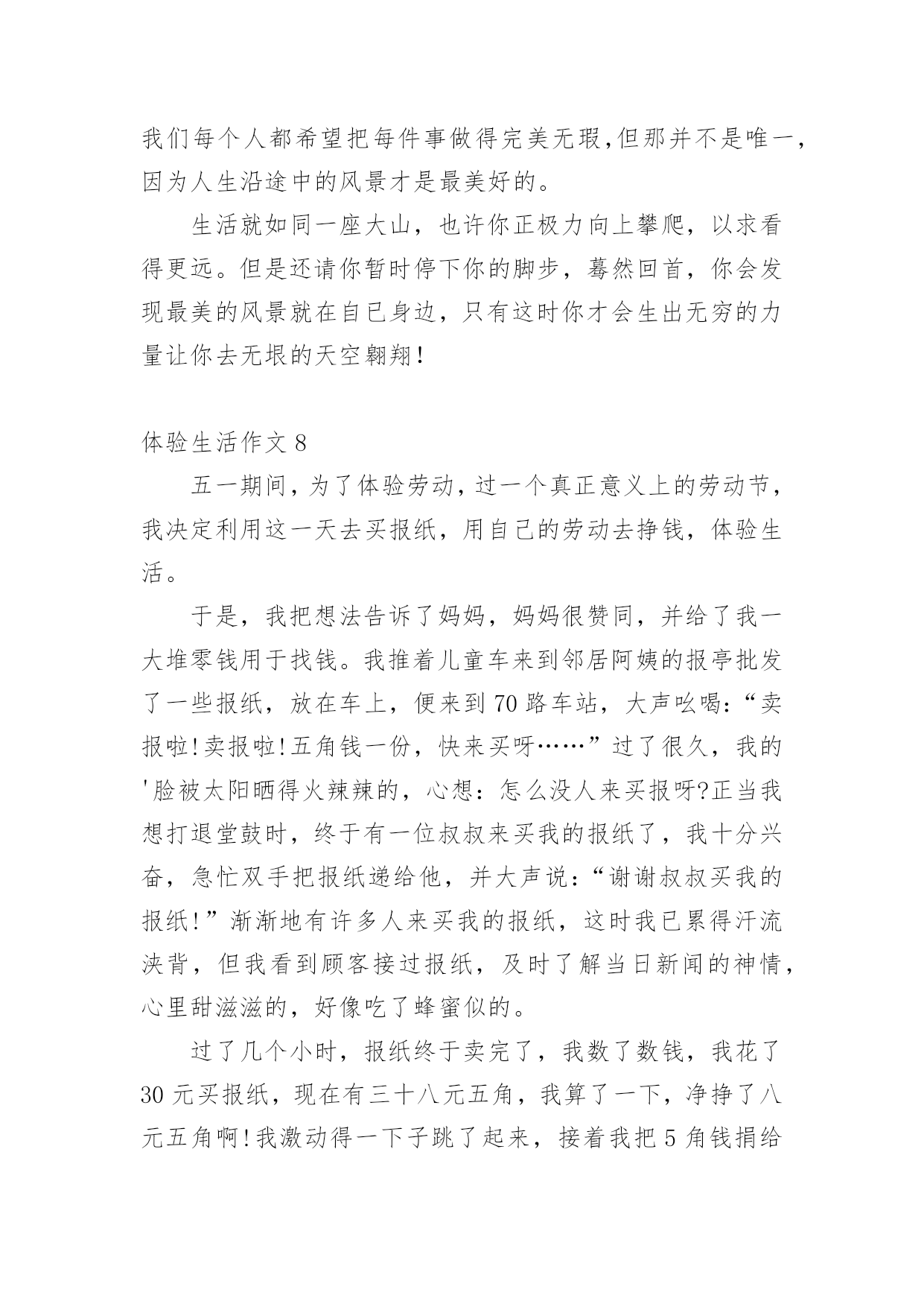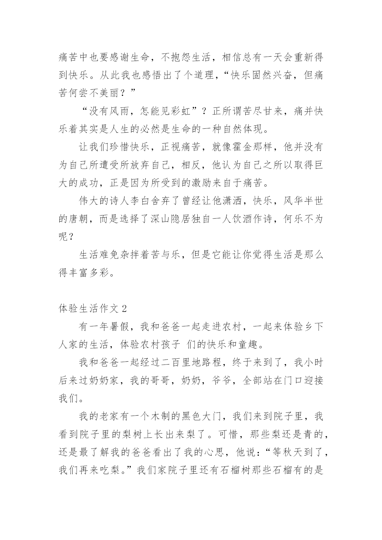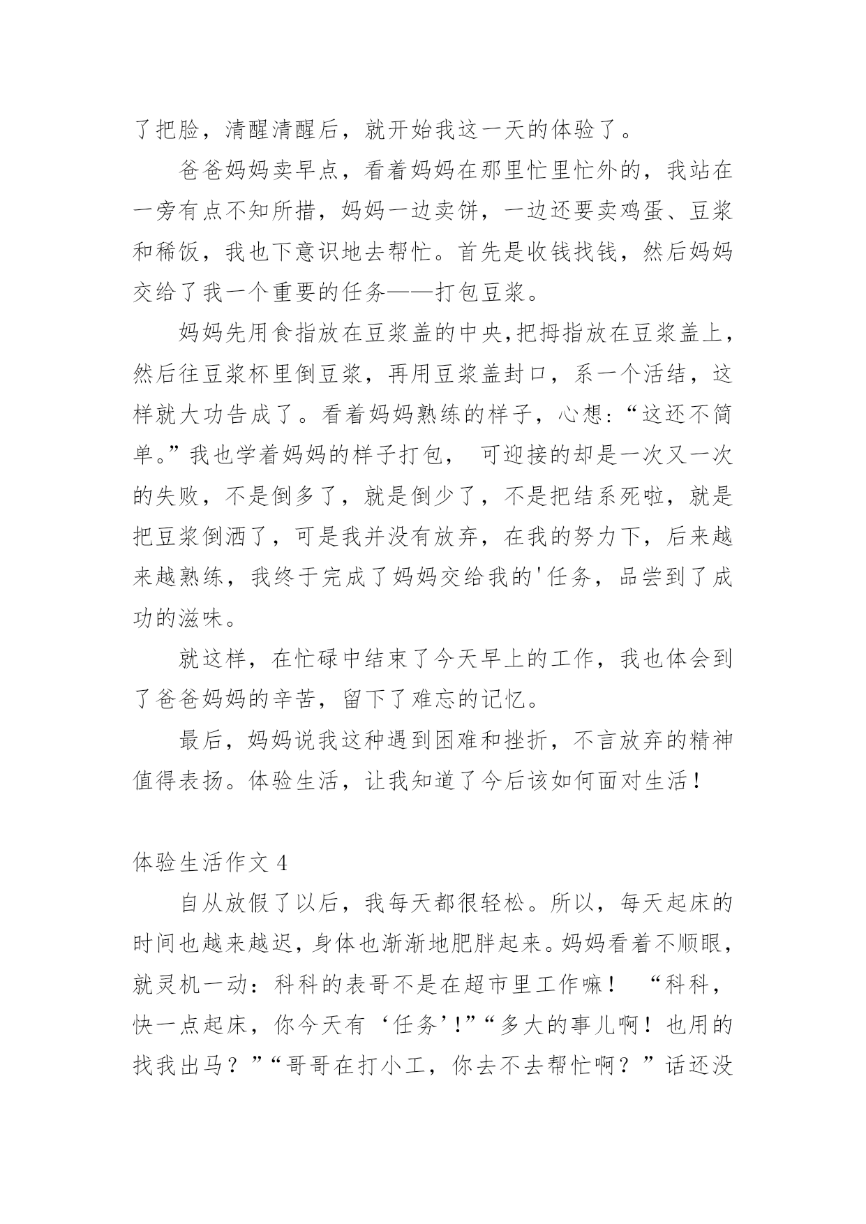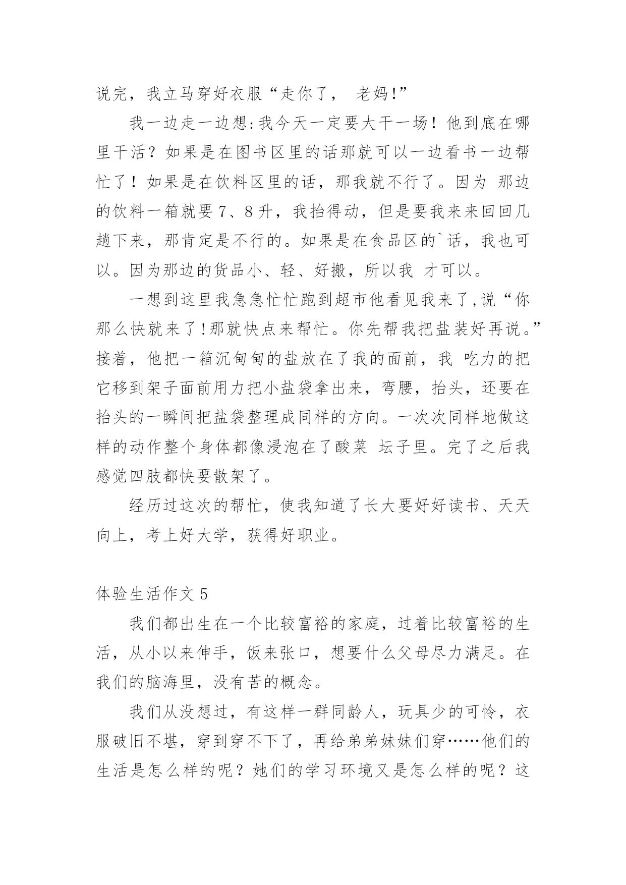 体验生活作文体验生活作文[优选15篇]在日常学习、工作抑或是生活中,说到作文,大家肯定都不陌生吧,作文是人们把记忆中所存储的有关知识、经验和思想用书面形式表达出来的记叙方式。那么你有了解过作文吗?以下是小编精心整理的体验生活作文,欢迎大家借鉴与参考,希望对大家有所帮助。体验生活作文1快乐,人人追求;痛苦,人人讨厌。然而,正如光与阴一样,快乐与痛苦也相伴,因当我体验快乐时,也种有痛苦陪伴。放荡不羁的李白在朝廷做官时,不畏权贵。“力士脱靴,玉环磨墨”已成为千古奇潭。但昏庸无能的朝廷却让他失望。无奈的他离开了繁华的长安城,去深山过隐居生活去了。我终于明白他为何如此爱饮酒,因为只有在醉酒中,他才能在痛苦昏庸的社会中,找到属于他想要的`快乐与安分。伟大的物理学家霍金也是如此。尽管上天并没有给他一个健全的身体,但是他凭借自己的毅力和坚持不懈的奋斗取得了举世无双的成就与他的梦想。瘦小的身躯虽然只能躺在轮椅上,但是霍金的性格,思维是象征着自由的,快乐的。这也是在痛苦的磨练中得到的快乐与自作文豪。正如作家冰心所说的一样,在快乐中,我们要感谢生命,庆幸自己;在痛苦中也要感谢生命,不抱怨生活,相信总有一天会重新得到快乐。从此我也感悟出了个道理,“快乐固然兴奋,但痛苦何尝不美丽?”“没有风雨,怎能见彩虹”?正所谓苦尽甘来,痛并快乐着其实是人生的必然是生命的一种自然体现。让我们珍惜快乐,正视痛苦,就像霍金那样,他并没有为自己所遭受所放弃自己,相反,他认为自己之所以取得巨大的成功,正是因为所受到的激励来自于痛苦。伟大的诗人李白舍弃了曾经让他潇洒,快乐,风华半世的唐朝,而是选择了深山隐居独自一人饮酒作诗,何乐不为呢?生活难免杂拌着苦与乐,但是它能让你觉得生活是那么得丰富多彩。体验生活作文2有一年暑假,我和爸爸一起走进农村,一起来体验乡下人家的生活,体验农村孩子们的快乐和童趣。我和爸爸一起经过二百里地路程,终于来到了,我小时后来过奶奶家,我的哥哥,奶奶,爷爷,全部站在门口迎接我们。我的老家有一个木制的黑色大门,我们来到院子里,我看到院子里的梨树上长出来梨了。可惜,那些梨还是青的,还是最了解我的爸爸看出了我的心思,他说:“等秋天到了,我们再来吃梨。”我们家院子里还有石榴树那些石榴有的是青的,有的是青里透黄,还有的是紫皮的。我们家不仅有梨树。石榴树,而且还有核桃树和枣树。走出我家的小院,我看到门前宽阔的'水泥路,往远处张望是辽阔无垠的麦田,转过身来是看是拔地而起的高山美丽极了,明天我还要准备去爬山呢!农村的车辆少,空气好清新啊!我们家养着三只母鸡和三只公鸡,并且还有十几只小鸡。那些母鸡和公鸡,总是给对方相互争夺食物,还养着几只老母猪呢!那些猪真的很像猪八戒,它们非常的肥。并且膘肥体壮,爸爸说人们过年的时候总杀几只猪和几只鸡呢!到了晚上,我们都该吃晚餐了,我们搬一张桌子到门前,然后大家把饭菜都端了上来,不一会儿,我们招来了许多人,大家都一边吃饭,一边谈天说地,非常快乐。在这个小小的乡镇里,虽然比不过城市那样繁华富有,但可以比得过城市的朴素。体验生活作文3暑假过去了一个月,这个月都在补课,本来以为补课结束可以到爸爸妈妈工作的地方——武汉痛痛快快地玩一个月,可是妈妈提前告诉我,今年到武汉要让我体验生活,就是给他们帮忙做事。第一天,我睡到自然醒。可第二天,我五点钟就被妈妈给“轰”了起来,妈妈看着我一副没睡醒的样子,让我去洗了把脸,清醒清醒后,就开始我这一天的体验了。爸爸妈妈卖早点,看着妈妈在那里忙里忙外的,我站在一旁有点不知所措,妈妈一边卖饼,一边还要卖鸡蛋、豆浆和稀饭,我也下意识地去帮忙。首先是收钱找钱,然后妈妈交给了我一个重要的任务——打包豆浆。妈妈先用食指放在豆浆盖的中央,把拇指放在豆浆盖上,然后往豆浆杯里倒豆浆,再用豆浆盖封口,系一个活结,这样就大功告成了。看着妈妈熟练的样子,心想:“这还不简单。”我也学着妈妈的样子打包,可迎接的却是一次又一次的失败,不是倒多了,就是倒少了,不是把结系死啦,就是把豆浆倒洒了,可是我并没有放弃,在我的努力下,后来越来越熟练,我终于完成了妈妈交给我的'任务,品尝到了成功的滋味。就这样,在忙碌中结束了今天早上的工作,我也体会到了爸爸妈妈的辛苦,留下了难忘的记忆。最后,妈妈说我这种遇到困难和挫折,不言放弃的精神值得表扬。体验生活,让我知道了今后该如何面对生活!体验生活作文4自从放假了以后,我每天都很轻松。所以,每天起床的时间也越来越迟,身体也渐渐地肥胖起来。妈妈看着不顺眼,就灵机一动:科科的表哥不是在超市里工作嘛!“科科,快一点起床,你今天有‘任务’!”“多大的事儿啊!也用的找我出马?”“哥哥在打小工,你去不去帮忙啊?”话还没说完,我立马穿好衣服“走你了,老妈!”我一边走一边想:我今天一定要大干一场!他到底在哪里干活?如果是在图书区