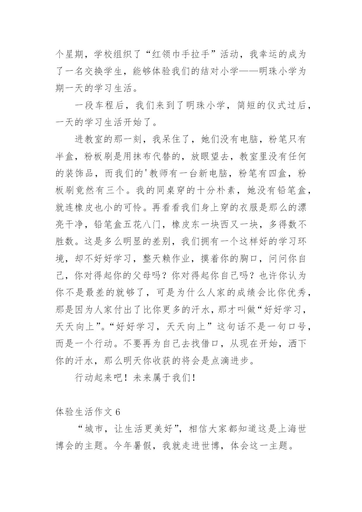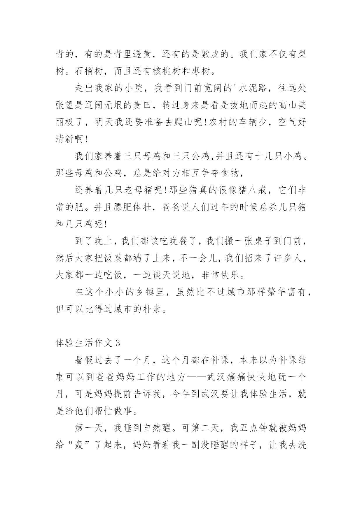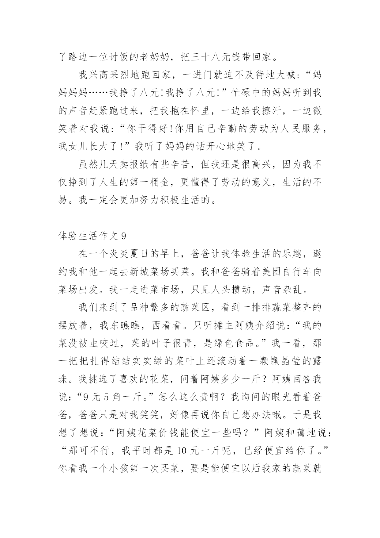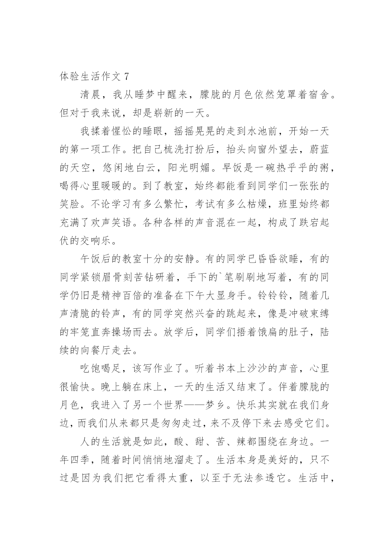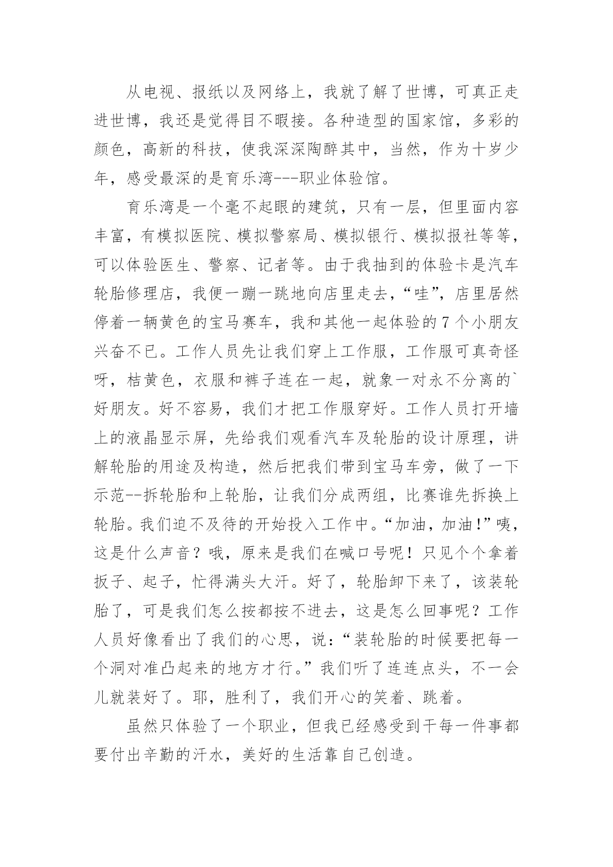 体验生活作文体验生活作文[优选15篇]在日常学习、工作抑或是生活中,说到作文,大家肯定都不陌生吧,作文是人们把记忆中所存储的有关知识、经验和思想用书面形式表达出来的记叙方式。那么你有了解过作文吗?以下是小编精心整理的体验生活作文,欢迎大家借鉴与参考,希望对大家有所帮助。体验生活作文1快乐,人人追求;痛苦,人人讨厌。然而,正如光与阴一样,快乐与痛苦也相伴,因当我体验快乐时,也种有痛苦陪伴。放荡不羁的李白在朝廷做官时,不畏权贵。“力士脱靴,玉环磨墨”已成为千古奇潭。但昏庸无能的朝廷却让他失望。无奈的他离开了繁华的长安城,去深山过隐居生活去了。我终于明白他为何如此爱饮酒,因为只有在醉酒中,他才能在痛苦昏庸的社会中,找到属于他想要的`快乐与安分。伟大的物理学家霍金也是如此。尽管上天并没有给他一个健全的身体,但是他凭借自己的毅力和坚持不懈的奋斗取得了举世无双的成就与他的梦想。瘦小的身躯虽然只能躺在轮椅上,但是霍金的性格,思维是象征着自由的,快乐的。这也是在痛苦的磨练中得到的快乐与自作文豪。正如作家冰心所说的一样,在快乐中,我们要感谢生命,庆幸自己;在痛苦中也要感谢生命,不抱怨生活,相信总有一天会重新得到快乐。从此我也感悟出了个道理,“快乐固然兴奋,但痛苦何尝不美丽?”“没有风雨,怎能见彩虹”?正所谓苦尽甘来,痛并快乐着其实是人生的必然是生命的一种自然体现。让我们珍惜快乐,正视痛苦,就像霍金那样,他并没有为自己所遭受所放弃自己,相反,他认为自己之所以取得巨大的成功,正是因为所受到的激励来自于痛苦。伟大的诗人李白舍弃了曾经让他潇洒,快乐,风华半世的唐朝,而是选择了深山隐居独自一人饮酒作诗,何乐不为呢?生活难免杂拌着苦与乐,但是它能让你觉得生活是那么得丰富多彩。体验生活作文2有一年暑假,我和爸爸一起走进农村,一起来体验乡下人家的生活,体验农村孩子们的快乐和童趣。我和爸爸一起经过二百里地路程,终于来到了,我小时后来过奶奶家,我的哥哥,奶奶,爷爷,全部站在门口迎接我们。我的老家有一个木制的黑色大门,我们来到院子里,我看到院子里的梨树上长出来梨了。可惜,那些梨还是青的,还是最了解我的爸爸看出了我的心思,他说:“等秋天到了,我们再来吃梨。”我们家院子里还有石榴树那些石榴有的是青的,有的是青里透黄,还有的是紫皮的。我们家不仅有梨树。石榴树,而且还有核桃树和枣树。走出我家的小院,我看到门前宽阔的'水泥路,往远处张望是辽阔无垠的麦田,转过身来是看是拔地而起的高山美丽极了,明天我还要准备去爬山呢!农村的车辆少,空气好清新啊!我们家养着三只母鸡和三只公鸡,并且还有十几只小鸡。那些母鸡和公鸡,总是给对方相互争夺食物,还养着几只老母猪呢!那些猪真的很像猪八戒,它们非常的肥。并且膘肥体壮,爸爸说人们过年的时候总杀几只猪和几只鸡呢!到了晚上,我们都该吃晚餐了,我们搬一张桌子到门前,然后大家把饭菜都端了上来,不一会儿,我们招来了许多人,大家都一边吃饭,一边谈天说地,非常快乐。在这个小小的乡镇里,虽然比不过城市那样繁华富有,但可以比得过城市的朴素。体验生活作文3暑假过去了一个月,这个月都在补课,本来以为补课结束可以到爸爸妈妈工作的地方——武汉痛痛快快地玩一个月,可是妈妈提前告诉我,今年到武汉要让我体验生活,就是给他们帮忙做事。第一天,我睡到自然醒。可第二天,我五点钟就被妈妈给“轰”了起来,妈妈看着我一副没睡醒的样子,让我去洗了把脸,清醒清醒后,就开始我这一天的体验了。爸爸妈妈卖早点,看着妈妈在那里忙里忙外的,我站在一旁有点不知所措,妈妈一边卖饼,一边还要卖鸡蛋、豆浆和稀饭,我也下意识地去帮忙。首先是收钱找钱,然后妈妈交给了我一个重要的任务——打包豆浆。妈妈先用食指放在豆浆盖的中央,把拇指放在豆浆盖上,然后往豆浆杯里倒豆浆,再用豆浆盖封口,系一个活结,这样就大功告成了。看着妈妈熟练的样子,心想:“这还不简单。”我也学着妈妈的样子打包,可迎接的却是一次又一次的失败,不是倒多了,就是倒少了,不是把结系死啦,就是把豆浆倒洒了,可是我并没有放弃,在我的努力下,后来越来越熟练,我终于完成了妈妈交给我的'任务,品尝到了成功的滋味。就这样,在忙碌中结束了今天早上的工作,我也体会到了爸爸妈妈的辛苦,留下了难忘的记忆。最后,妈妈说我这种遇到困难和挫折,不言放弃的精神值得表扬。体验生活,让我知道了今后该如何面对生活!体验生活作文4自从放假了以后,我每天都很轻松。所以,每天起床的时间也越来越迟,身体也渐渐地肥胖起来。妈妈看着不顺眼,就灵机一动:科科的表哥不是在超市里工作嘛!“科科,快一点起床,你今天有‘任务’!”“多大的事儿啊!也用的找我出马?”“哥哥在打小工,你去不去帮忙啊?”话还没说完,我立马穿好衣服“走你了,老妈!”我一边走一边想:我今天一定要大干一场!他到底在哪里干活?如果是在图书区