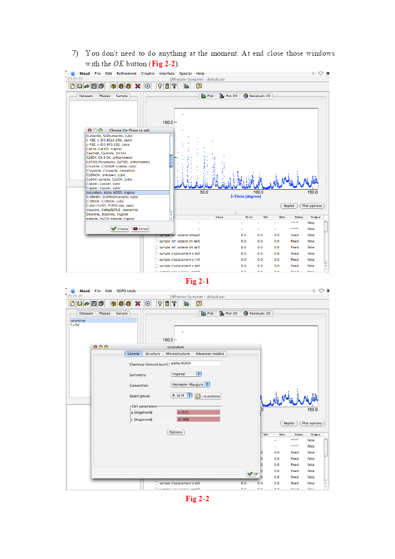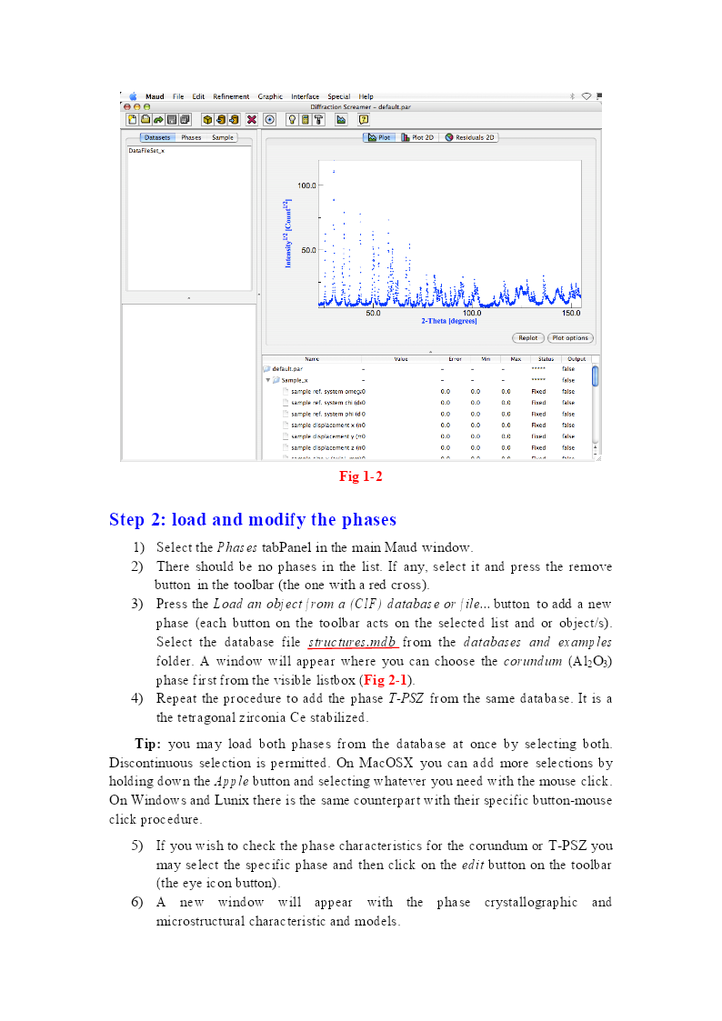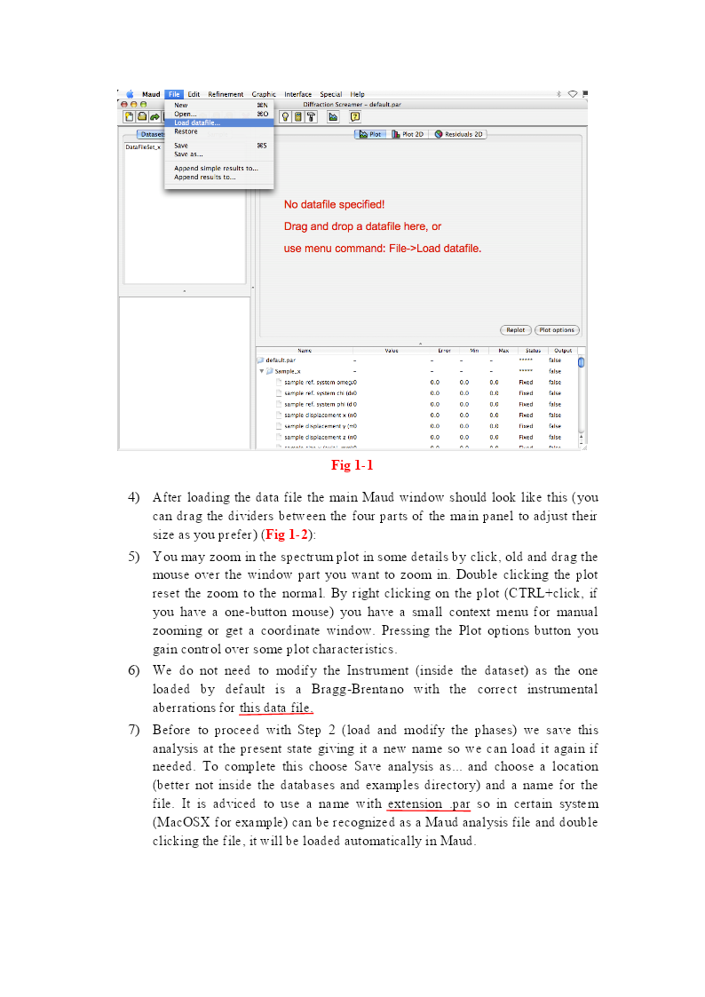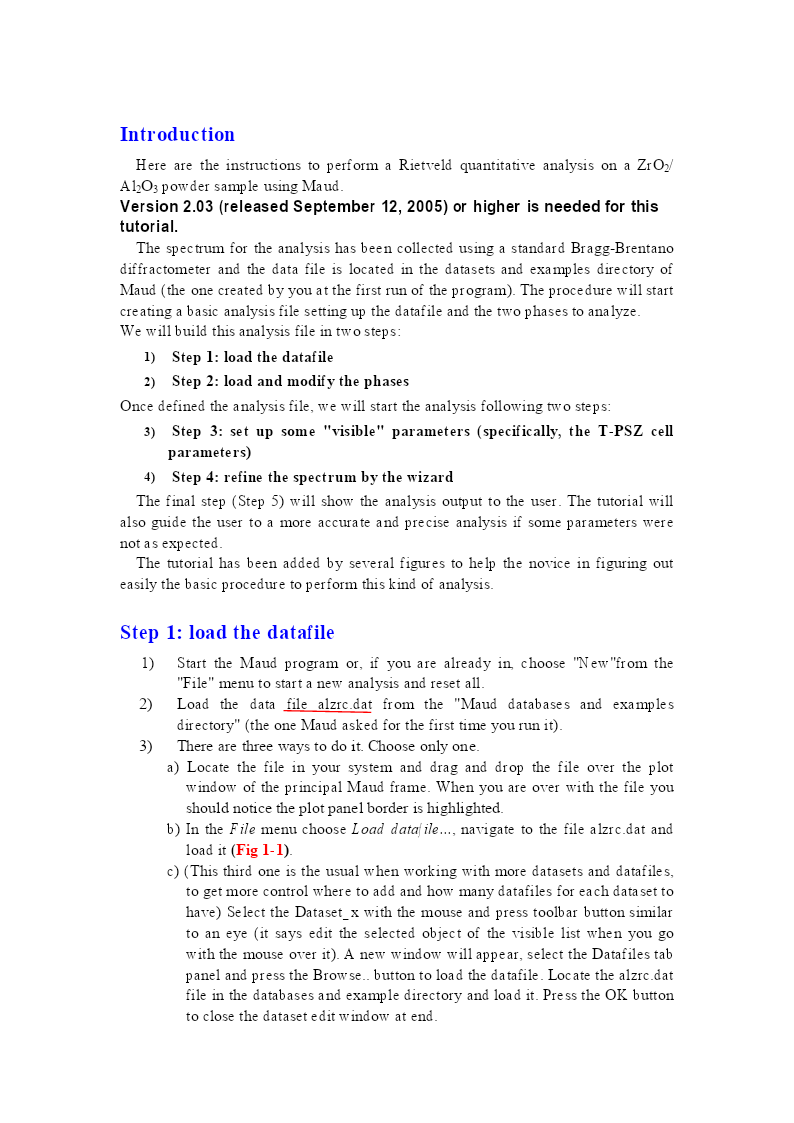 Maud2.0定量教程宋党育整理河南理工大学2007-6Email:dangyusong@gmail.comTel:0391-3987976QQ:48096753IntroductionHerearetheinstructionstoperformaRietveldquantitativeanalysisonaZrO2/Al2O3powdersampleusingMaud.Version2.03(releasedSeptember12,2005)orhigherisneededforthistutorial.ThespectrumfortheanalysishasbeencollectedusingastandardBragg-BrentanodiffractometerandthedatafileislocatedinthedatasetsandexamplesdirectoryofMaud(theonecreatedbyyouatthefirstrunoftheprogram).Theprocedurewillstartcreatingabasicanalysisfilesettingupthedatafileandthetwophasestoanalyze.Wewillbuildthisanalysisfileintwosteps:1)Step1:loadthedatafile2)Step2:loadandmodifythephasesOncedefinedtheanalysisfile,wewillstarttheanalysisfollowingtwosteps:3)Step3:setupsome"visible"parameters(specifically,theT-PSZcellparameters)4)Step4:refinethespectrumbythewizardThefinalstep(Step5)willshowtheanalysisoutputtotheuser.Thetutorialwillalsoguidetheusertoamoreaccurateandpreciseanalysisifsomeparameterswerenotasexpected.Thetutorialhasbeenaddedbyseveralfigurestohelpthenoviceinfiguringouteasilythebasicproceduretoperformthiskindofanalysis.Step1:loadthedatafile1)StarttheMaudprogramor,ifyouarealreadyin,choose"New"fromthe"File"menutostartanewanalysisandresetall.2)Loadthedatafilealzrc.datfromthe"Mauddatabasesandexamplesdirectory"(theoneMaudaskedforthefirsttimeyourunit).3)Therearethreewaystodoit.Chooseonlyone.a)LocatethefileinyoursystemanddraganddropthefileovertheplotwindowoftheprincipalMaudframe.Whenyouareoverwiththefileyoushouldnoticetheplotpanelborderishighlighted.b)IntheFilemenuchooseLoaddatafile...,navigatetothefilealzrc.datandloadit(Fig1-1).c)(Thisthirdoneistheusualwhenworkingwithmoredatasetsanddatafiles,togetmorecontrolwheretoaddandhowmanydatafilesforeachdatasettohave)SelecttheDataset_xwiththemouseandpresstoolbarbuttonsimilartoaneye(itsaysedittheselectedobjectofthevisiblelistwhenyougowiththemouseoverit).Anewwindowwillappear,selecttheDatafilestabpanelandpresstheBrowse..buttont