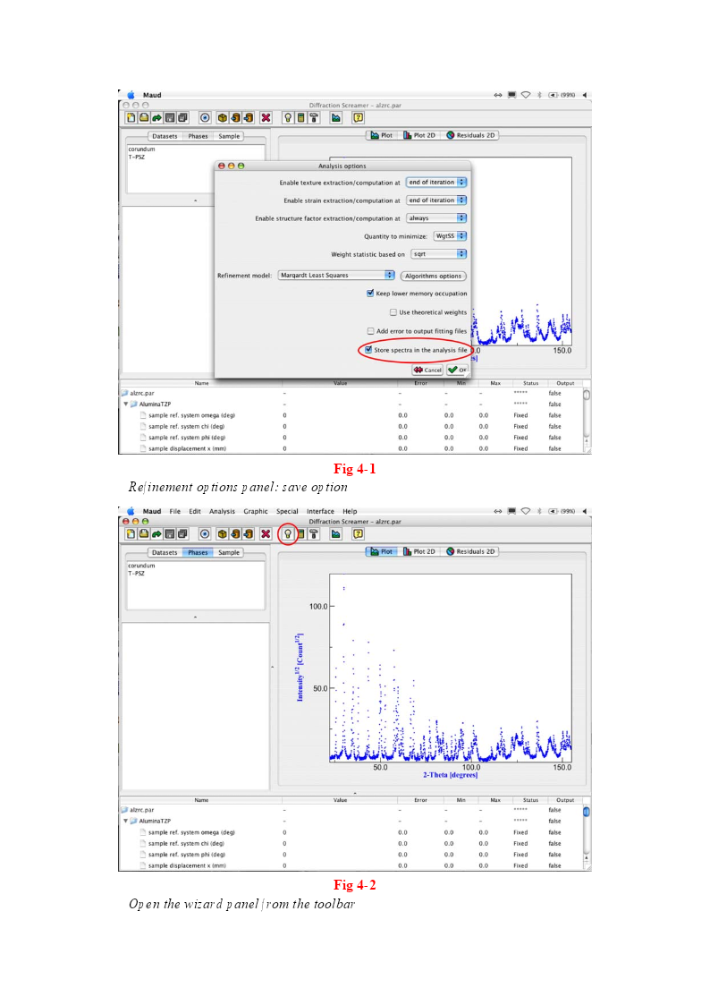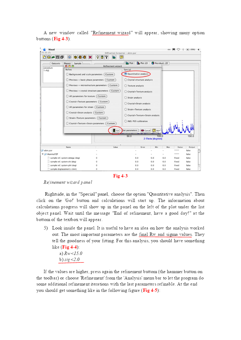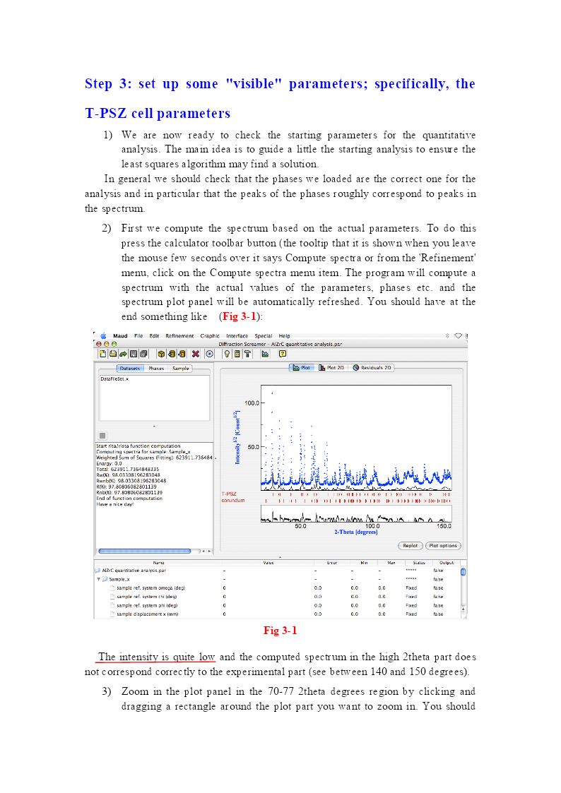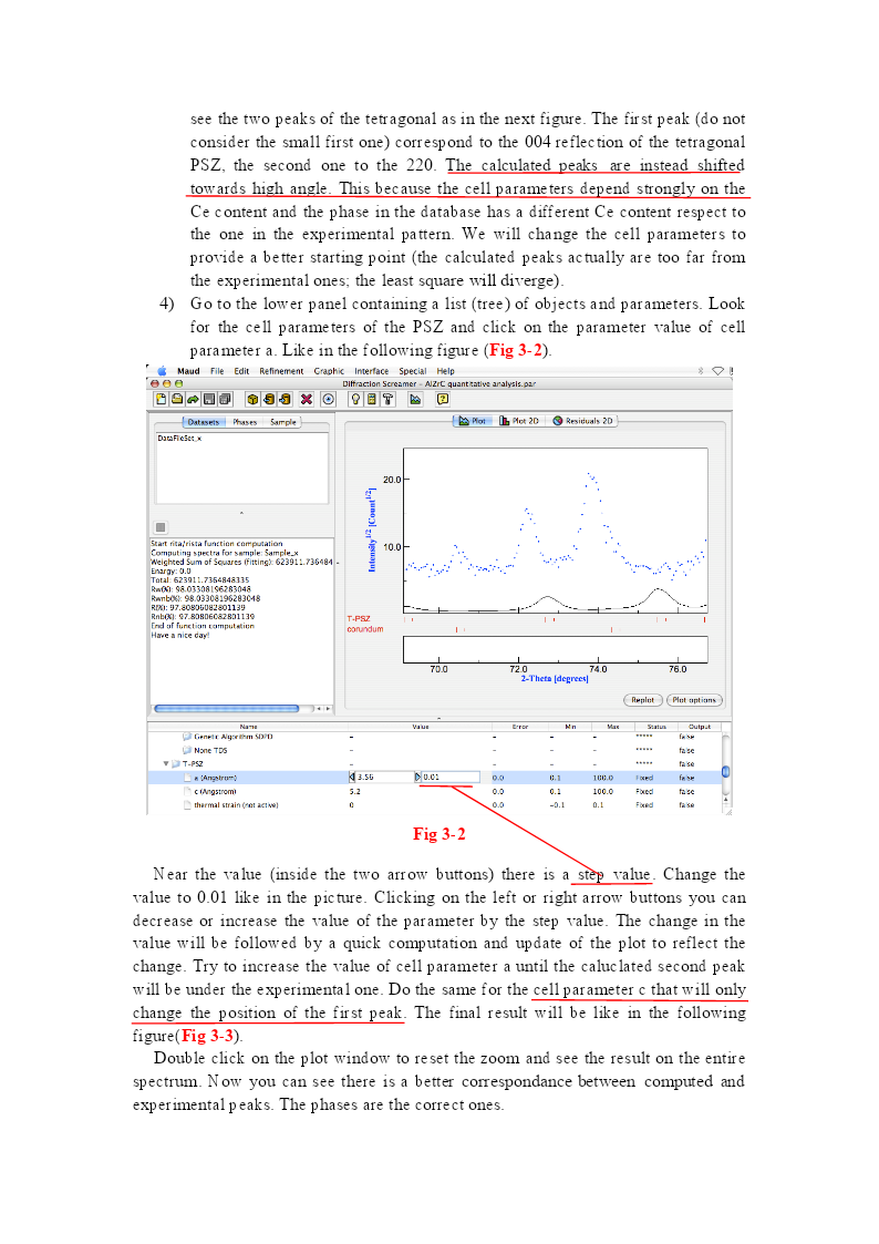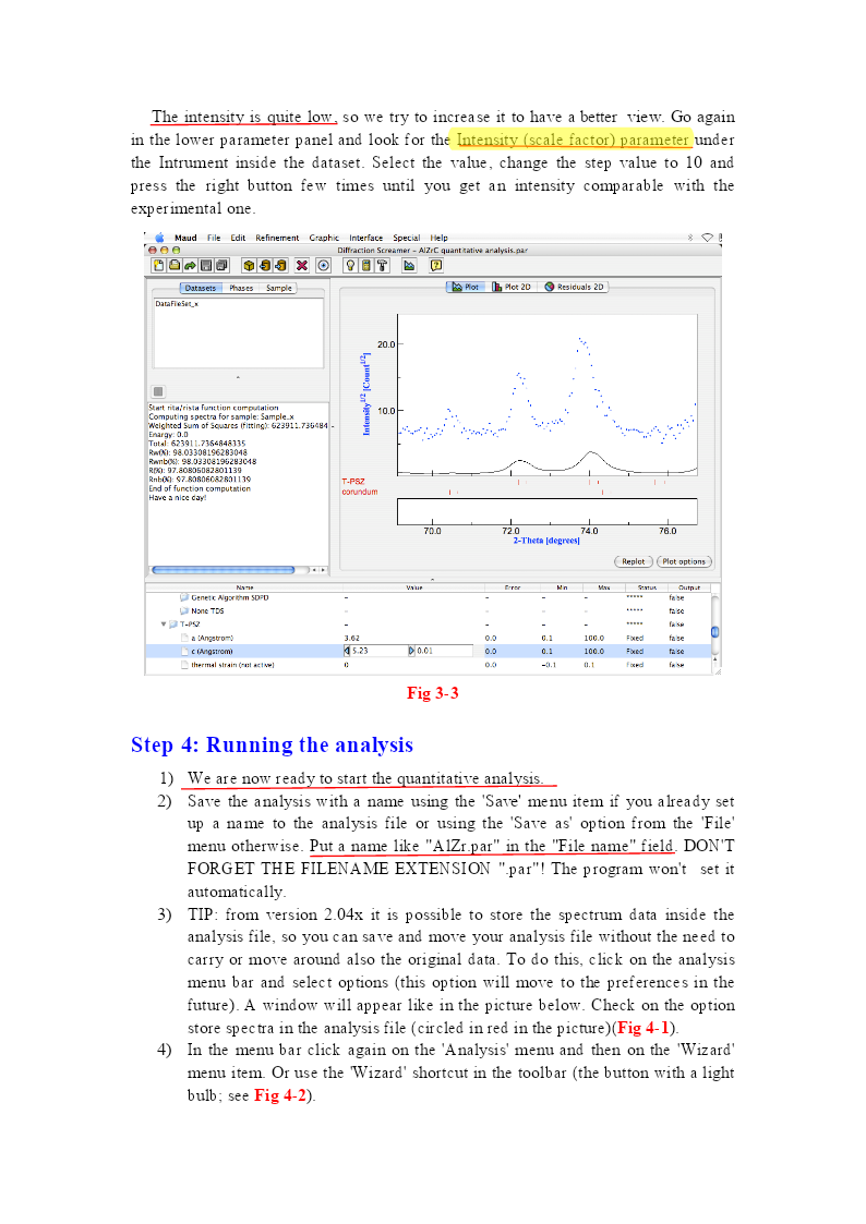 Maud2.0定量教程宋党育整理河南理工大学2007-6Email:dangyusong@gmail.comTel:0391-3987976QQ:48096753IntroductionHerearetheinstructionstoperformaRietveldquantitativeanalysisonaZrO2/Al2O3powdersampleusingMaud.Version2.03(releasedSeptember12,2005)orhigherisneededforthistutorial.ThespectrumfortheanalysishasbeencollectedusingastandardBragg-BrentanodiffractometerandthedatafileislocatedinthedatasetsandexamplesdirectoryofMaud(theonecreatedbyyouatthefirstrunoftheprogram).Theprocedurewillstartcreatingabasicanalysisfilesettingupthedatafileandthetwophasestoanalyze.Wewillbuildthisanalysisfileintwosteps:1)Step1:loadthedatafile2)Step2:loadandmodifythephasesOncedefinedtheanalysisfile,wewillstarttheanalysisfollowingtwosteps:3)Step3:setupsome"visible"parameters(specifically,theT-PSZcellparameters)4)Step4:refinethespectrumbythewizardThefinalstep(Step5)willshowtheanalysisoutputtotheuser.Thetutorialwillalsoguidetheusertoamoreaccurateandpreciseanalysisifsomeparameterswerenotasexpected.Thetutorialhasbeenaddedbyseveralfigurestohelpthenoviceinfiguringouteasilythebasicproceduretoperformthiskindofanalysis.Step1:loadthedatafile1)StarttheMaudprogramor,ifyouarealreadyin,choose"New"fromthe"File"menutostartanewanalysisandresetall.2)Loadthedatafilealzrc.datfromthe"Mauddatabasesandexamplesdirectory"(theoneMaudaskedforthefirsttimeyourunit).3)Therearethreewaystodoit.Chooseonlyone.a)LocatethefileinyoursystemanddraganddropthefileovertheplotwindowoftheprincipalMaudframe.Whenyouareoverwiththefileyoushouldnoticetheplotpanelborderishighlighted.b)IntheFilemenuchooseLoaddatafile...,navigatetothefilealzrc.datandloadit(Fig1-1).c)(Thisthirdoneistheusualwhenworkingwithmoredatasetsanddatafiles,togetmorecontrolwheretoaddandhowmanydatafilesforeachdatasettohave)SelecttheDataset_xwiththemouseandpresstoolbarbuttonsimilartoaneye(itsaysedittheselectedobjectofthevisiblelistwhenyougowiththemouseoverit).Anewwindowwillappear,selecttheDatafilestabpanelandpresstheBrowse..buttont