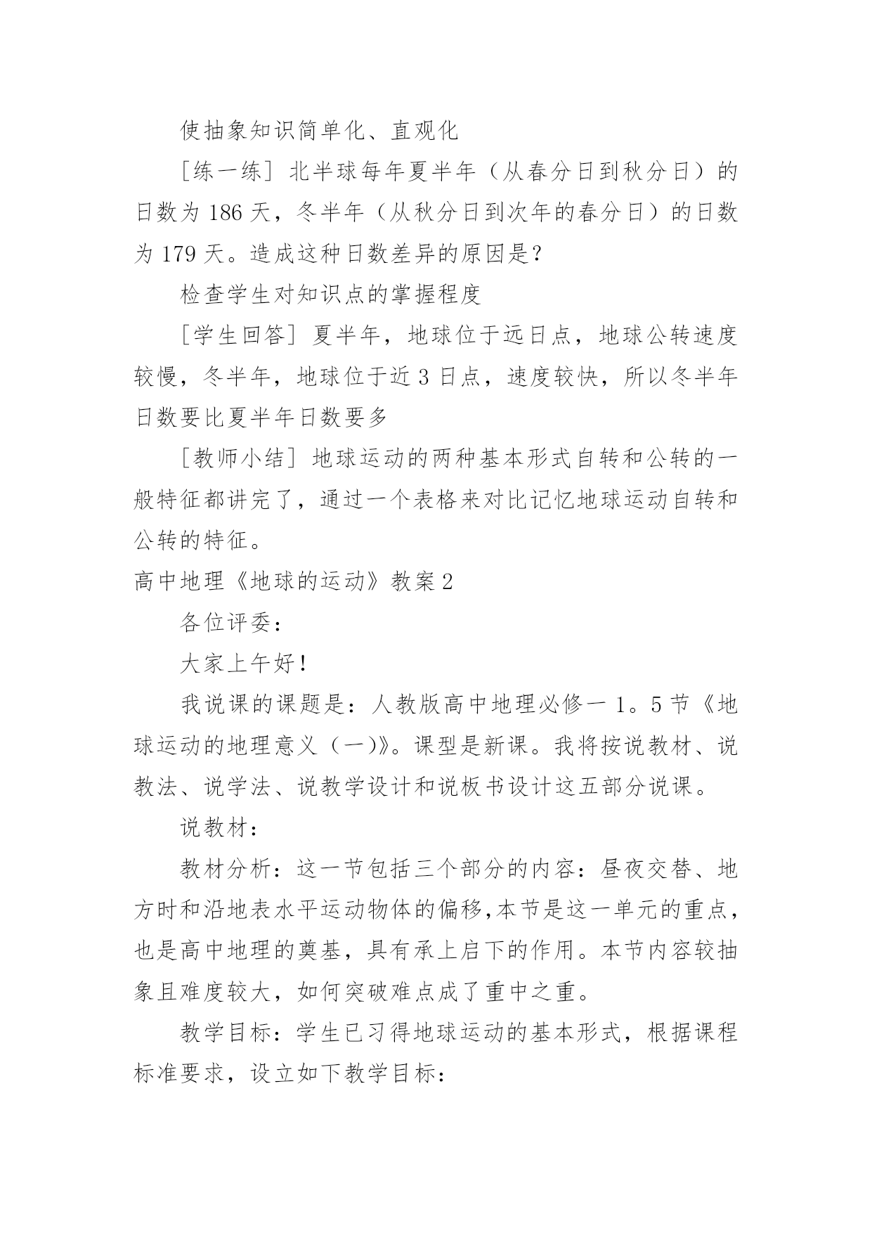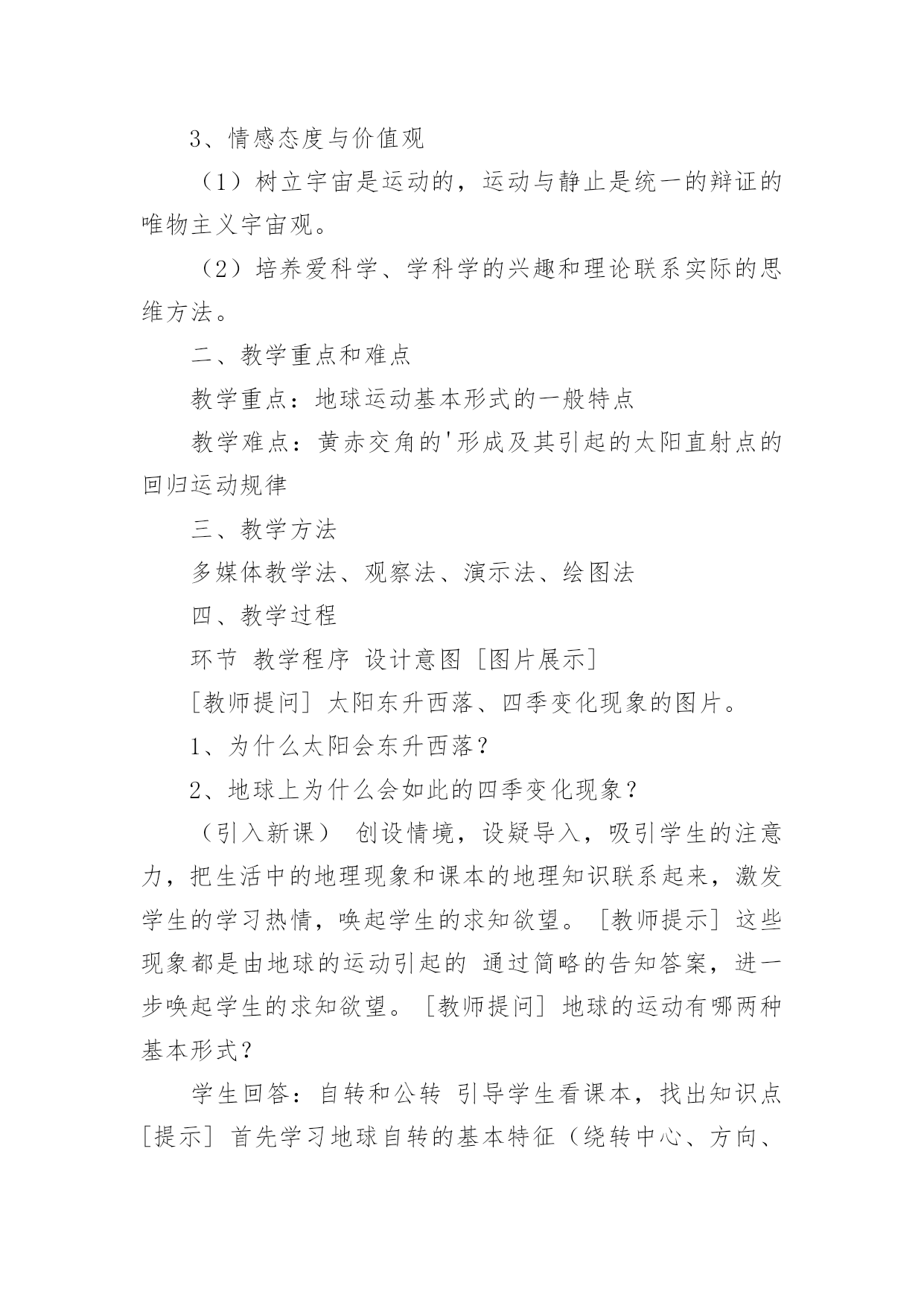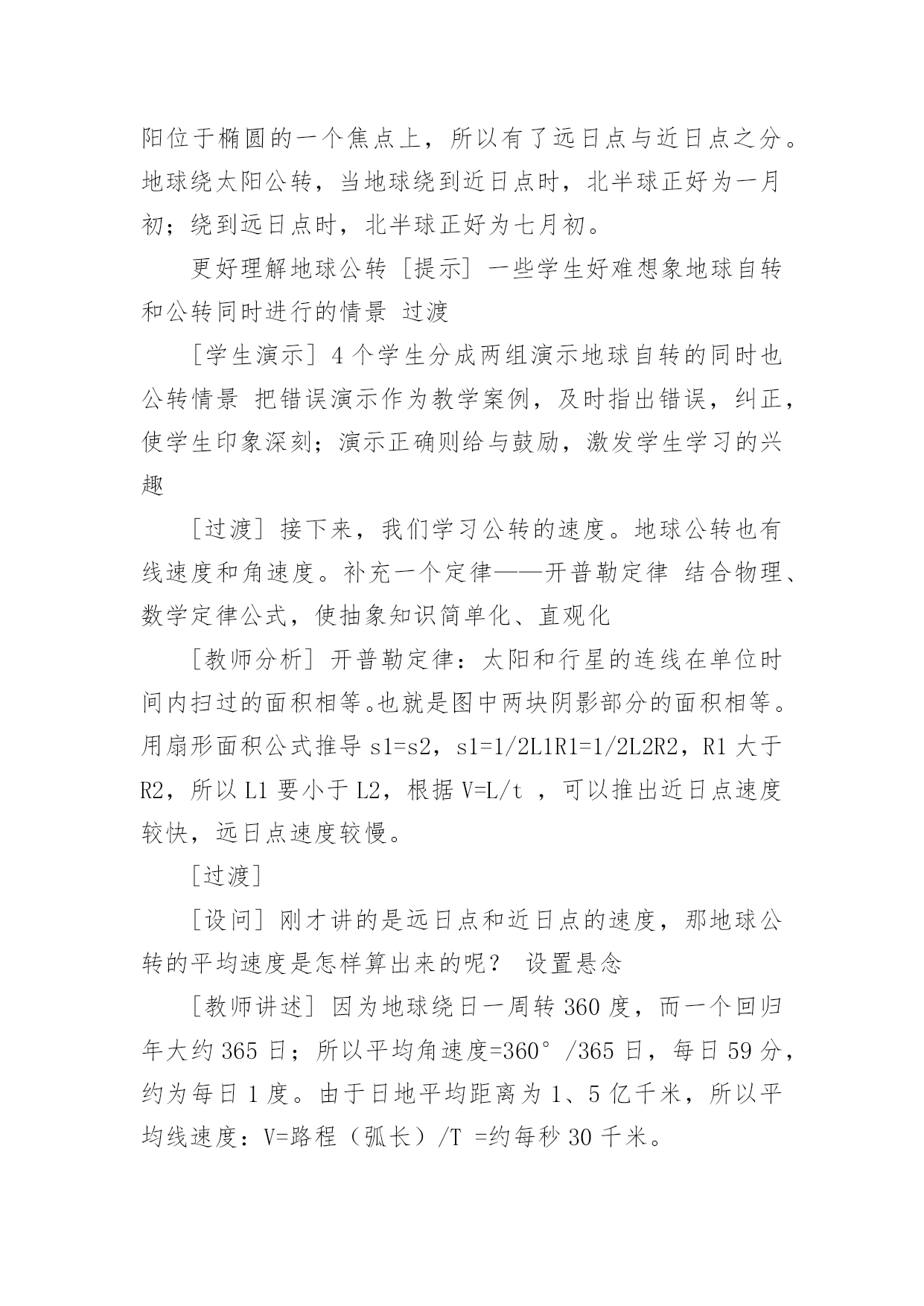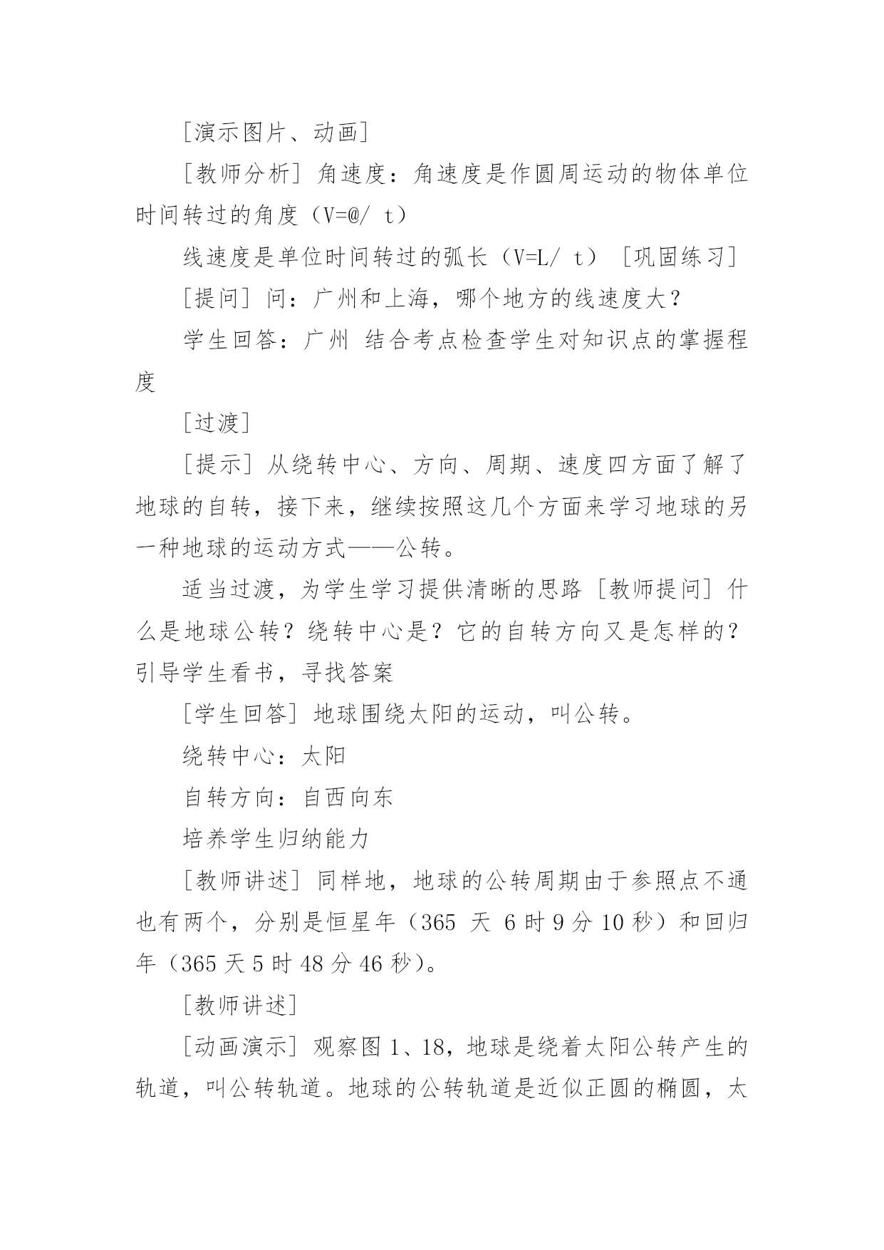 高中地理《地球的运动》教案高中地理《地球的运动》教案作为一位杰出的老师,可能需要进行教案编写工作,编写教案有利于我们弄通教材内容,进而选择科学、恰当的教学方法。那么应当如何写教案呢?以下是小编为大家整理的高中地理《地球的运动》教案,仅供参考,欢迎大家阅读。高中地理《地球的运动》教案1一、教学目标1、知识与技能(1)了解和对比地球自转和公转的方向、周期、轨道、速度等基本特征;(2)理解黄赤交角的形式及其导致的太阳直射点的回归运动;(3)对学生进行学法指导,培养学生观察、理解、想象和创新的思维能力2、过程与方法(1)学会运用地球仪演示或者通过播放地球的自转与公转现象的视频,培养学生的观察能力和概括能力,形成空间想象能力。(2)运用比较的方法,使学生更深入地理解、掌握地球自转和公转的知识,从中可培养学生的思维能力。3、情感态度与价值观(1)树立宇宙是运动的,运动与静止是统一的辩证的唯物主义宇宙观。(2)培养爱科学、学科学的兴趣和理论联系实际的思维方法。二、教学重点和难点教学重点:地球运动基本形式的一般特点教学难点:黄赤交角的'形成及其引起的太阳直射点的回归运动规律三、教学方法多媒体教学法、观察法、演示法、绘图法四、教学过程环节教学程序设计意图[图片展示][教师提问]太阳东升西落、四季变化现象的图片。1、为什么太阳会东升西落?2、地球上为什么会如此的四季变化现象?(引入新课)创设情境,设疑导入,吸引学生的注意力,把生活中的地理现象和课本的地理知识联系起来,激发学生的学习热情,唤起学生的求知欲望。[教师提示]这些现象都是由地球的运动引起的通过简略的告知答案,进一步唤起学生的求知欲望。[教师提问]地球的运动有哪两种基本形式?学生回答:自转和公转引导学生看课本,找出知识点[提示]首先学习地球自转的基本特征(绕转中心、方向、周期、速度)让学生进入状态,大致了解教师授课的逻辑顺序,便于学生掌握[教师提问][过渡]简单温故一下初中地理课本学习过地球运动的基本知识,回答:(概念、绕转中心、方向)温故而知新,为更好地学习新知识。[教师点评](1)地球围绕其自转轴的旋转运动,叫自转。(2)绕转中心:地轴(3)方向:自西向东,北极看:逆时针;南极看:顺时针(南顺北逆)[地球仪演示]分别从侧面、北极上空、南极上空看地球自转的旋转方向培养学生的观察能力,发现式的教学,更利于学生掌握[教师讲述]地球自转的周期,有参考点的不一样,一日的时间长度也略又差异,有恒星日(23h56′4″)和太阳日(24h)教学难点,简单讲解,不要求学生深入理解。[教师讲述][教师设问]地球的速度可以用角速度和线速度来描述,设问:什么是角速度和线速度,它们又是怎么计算的呢?培养学生对实物模型的观察能力和空间思维能力,结合数学公式来分析,引出角速度和线速度存在的规律,有利于学生更好地掌握知识点[演示图片、动画][教师分析]角速度:角速度是作圆周运动的物体单位时间转过的角度(V=@/t)线速度是单位时间转过的弧长(V=L/t)[巩固练习][提问]问:广州和上海,哪个地方的线速度大?学生回答:广州结合考点检查学生对知识点的掌握程度[过渡][提示]从绕转中心、方向、周期、速度四方面了解了地球的自转,接下来,继续按照这几个方面来学习地球的另一种地球的运动方式——公转。适当过渡,为学生学习提供清晰的思路[教师提问]什么是地球公转?绕转中心是?它的自转方向又是怎样的?引导学生看书,寻找答案[学生回答]地球围绕太阳的运动,叫公转。绕转中心:太阳自转方向:自西向东培养学生归纳能力[教师讲述]同样地,地球的公转周期由于参照点不通也有两个,分别是恒星年(365天6时9分10秒)和回归年(365天5时48分46秒)。[教师讲述][动画演示]观察图1、18,地球是绕着太阳公转产生的轨道,叫公转轨道。地球的公转轨道是近似正圆的椭圆,太阳位于椭圆的一个焦点上,所以有了远日点与近日点之分。地球绕太阳公转,当地球绕到近日点时,北半球正好为一月初;绕到远日点时,北半球正好为七月初。更好理解地球公转[提示]一些学生好难想象地球自转和公转同时进行的情景过渡[学生演示]4个学生分成两组演示地球自转的同时也公转情景把错误演示作为教学案例,及时指出错误,纠正,使学生印象深刻;演示正确则给与鼓励,激发学生学习的兴趣[过渡]接下来,我们学习公转的速度。地球公转也有线速度和角速度。补充一个定律——开普勒定律结合物理、数学定律公式,使抽象知识简单化、直观化[教师分析]开普勒定律:太阳和行星的连线在单位时间内扫过的面积相等。也就是图中两块阴影部分的面积相等。用扇形面积公式推导s1=s2,s1=1/2L1R1=1/2L2R2,R1大于R2,所以L1要小于L2,根据V=L/t,可以推出近日点速度较快,远日点速度较慢。[过渡][设问]刚才讲的