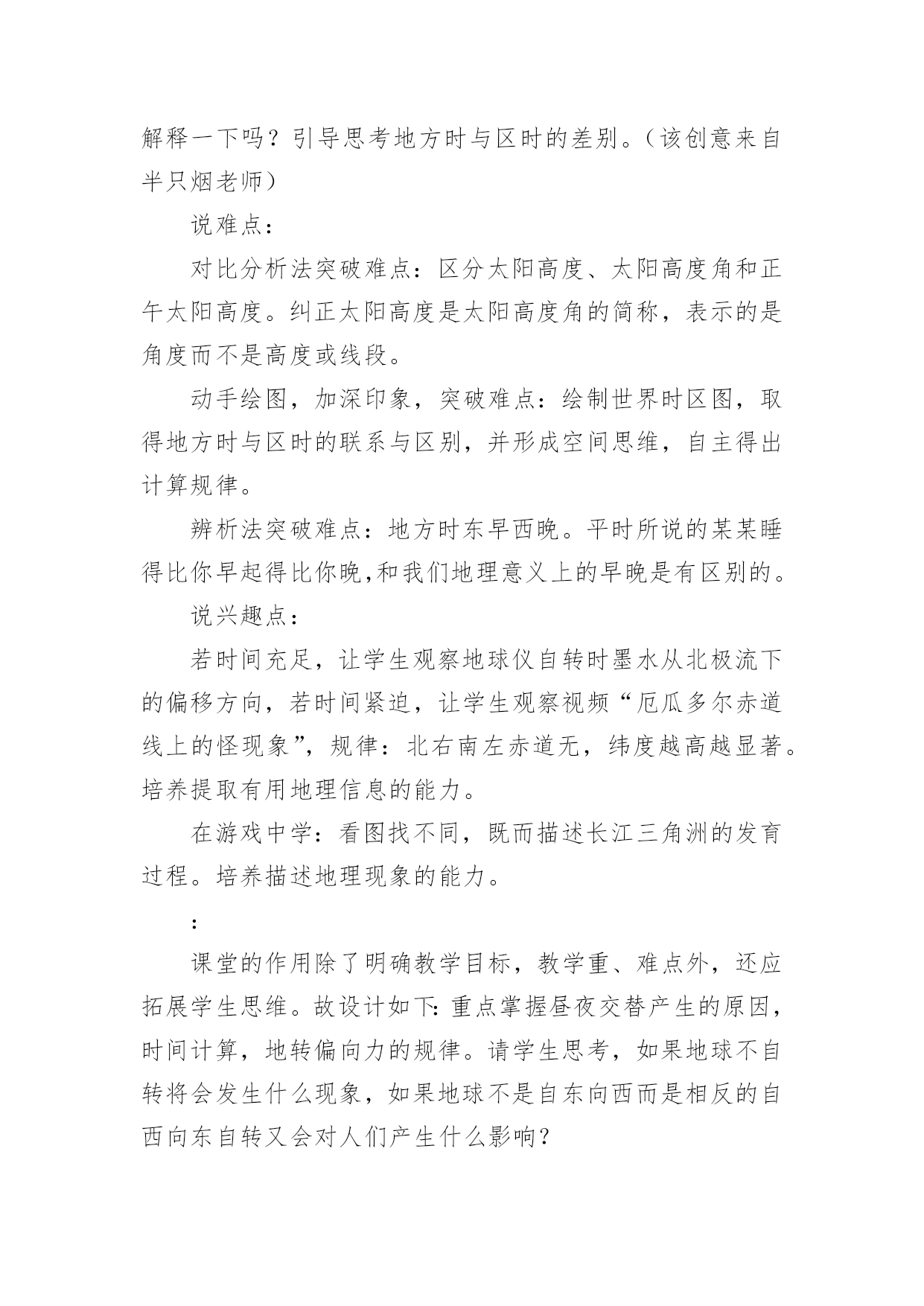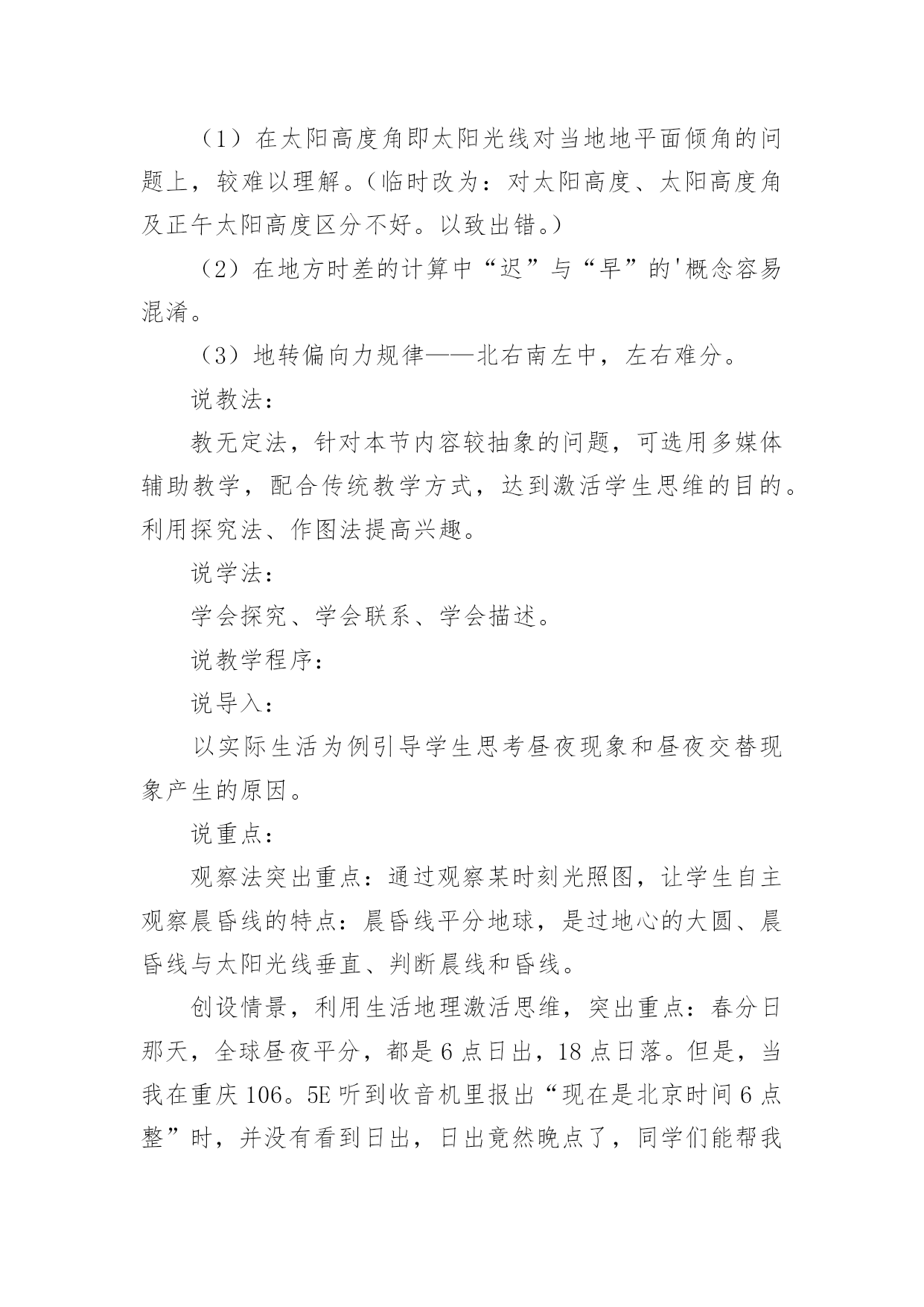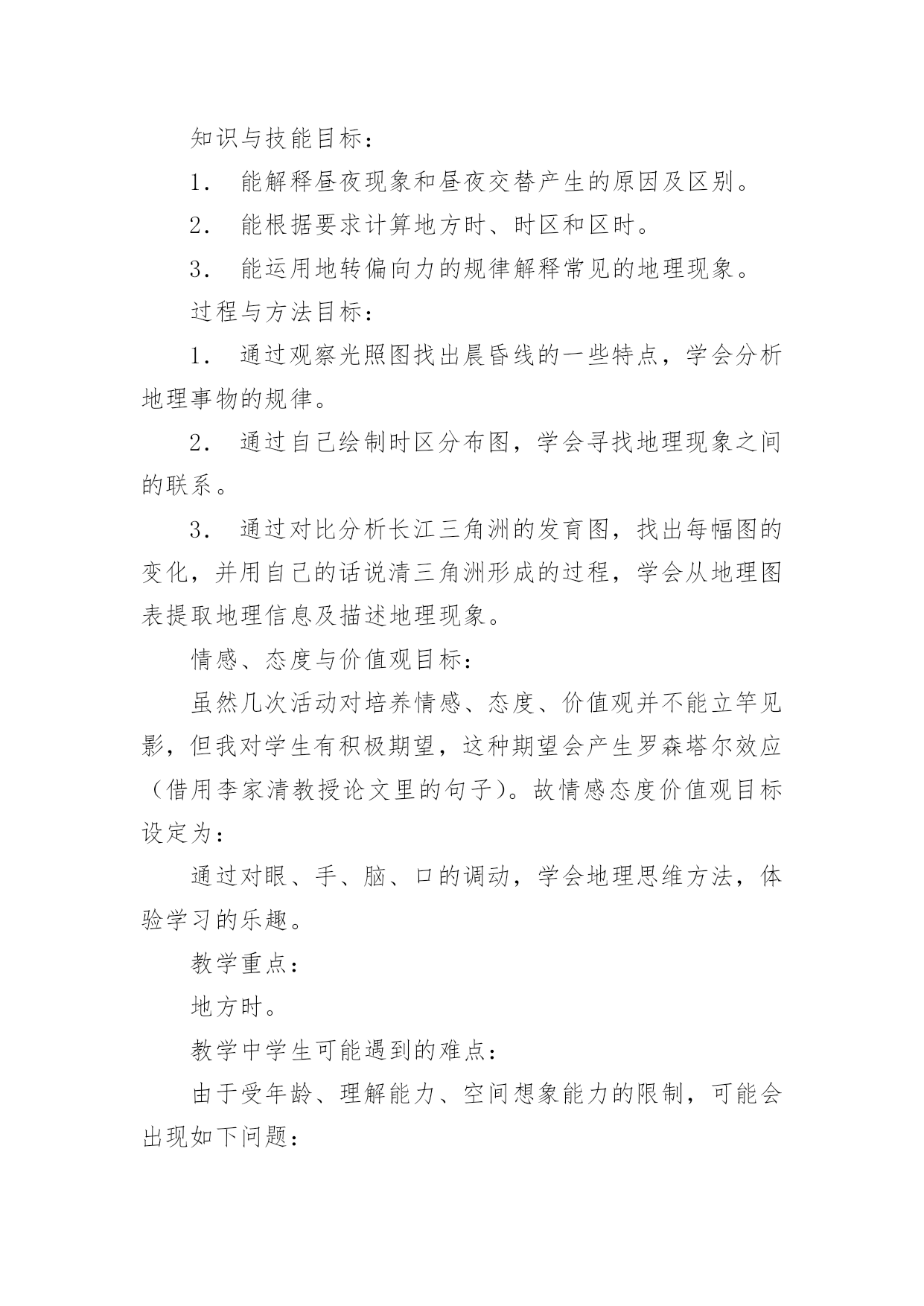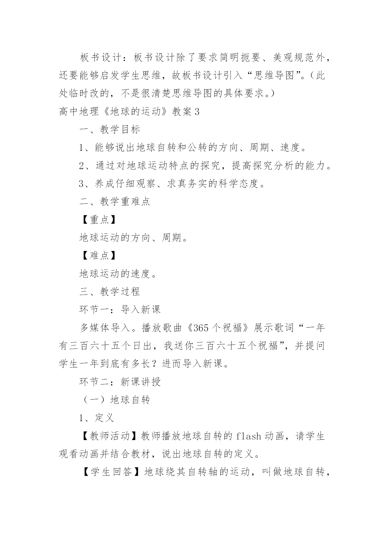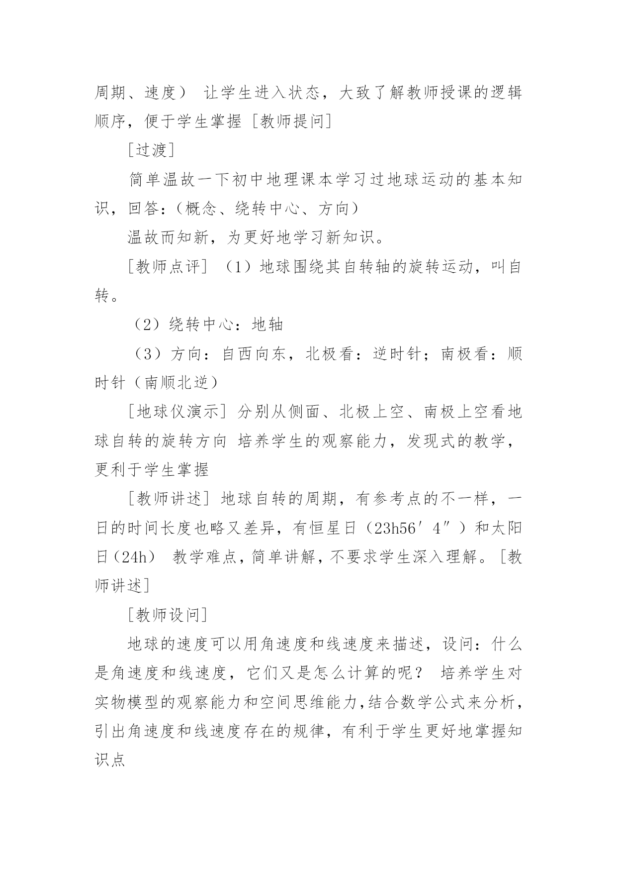 高中地理《地球的运动》教案高中地理《地球的运动》教案作为一位杰出的老师,可能需要进行教案编写工作,编写教案有利于我们弄通教材内容,进而选择科学、恰当的教学方法。那么应当如何写教案呢?以下是小编为大家整理的高中地理《地球的运动》教案,仅供参考,欢迎大家阅读。高中地理《地球的运动》教案1一、教学目标1、知识与技能(1)了解和对比地球自转和公转的方向、周期、轨道、速度等基本特征;(2)理解黄赤交角的形式及其导致的太阳直射点的回归运动;(3)对学生进行学法指导,培养学生观察、理解、想象和创新的思维能力2、过程与方法(1)学会运用地球仪演示或者通过播放地球的自转与公转现象的视频,培养学生的观察能力和概括能力,形成空间想象能力。(2)运用比较的方法,使学生更深入地理解、掌握地球自转和公转的知识,从中可培养学生的思维能力。3、情感态度与价值观(1)树立宇宙是运动的,运动与静止是统一的辩证的唯物主义宇宙观。(2)培养爱科学、学科学的兴趣和理论联系实际的思维方法。二、教学重点和难点教学重点:地球运动基本形式的一般特点教学难点:黄赤交角的'形成及其引起的太阳直射点的回归运动规律三、教学方法多媒体教学法、观察法、演示法、绘图法四、教学过程环节教学程序设计意图[图片展示][教师提问]太阳东升西落、四季变化现象的图片。1、为什么太阳会东升西落?2、地球上为什么会如此的四季变化现象?(引入新课)创设情境,设疑导入,吸引学生的注意力,把生活中的地理现象和课本的地理知识联系起来,激发学生的学习热情,唤起学生的求知欲望。[教师提示]这些现象都是由地球的运动引起的通过简略的告知答案,进一步唤起学生的求知欲望。[教师提问]地球的运动有哪两种基本形式?学生回答:自转和公转引导学生看课本,找出知识点[提示]首先学习地球自转的基本特征(绕转中心、方向、周期、速度)让学生进入状态,大致了解教师授课的逻辑顺序,便于学生掌握[教师提问][过渡]简单温故一下初中地理课本学习过地球运动的基本知识,回答:(概念、绕转中心、方向)温故而知新,为更好地学习新知识。[教师点评](1)地球围绕其自转轴的旋转运动,叫自转。(2)绕转中心:地轴(3)方向:自西向东,北极看:逆时针;南极看:顺时针(南顺北逆)[地球仪演示]分别从侧面、北极上空、南极上空看地球自转的旋转方向培养学生的观察能力,发现式的教学,更利于学生掌握[教师讲述]地球自转的周期,有参考点的不一样,一日的时间长度也略又差异,有恒星日(23h56′4″)和太阳日(24h)教学难点,简单讲解,不要求学生深入理解。[教师讲述][教师设问]地球的速度可以用角速度和线速度来描述,设问:什么是角速度和线速度,它们又是怎么计算的呢?培养学生对实物模型的观察能力和空间思维能力,结合数学公式来分析,引出角速度和线速度存在的规律,有利于学生更好地掌握知识点[演示图片、动画][教师分析]角速度:角速度是作圆周运动的物体单位时间转过的角度(V=@/t)线速度是单位时间转过的弧长(V=L/t)[巩固练习][提问]问:广州和上海,哪个地方的线速度大?学生回答:广州结合考点检查学生对知识点的掌握程度[过渡][提示]从绕转中心、方向、周期、速度四方面了解了地球的自转,接下来,继续按照这几个方面来学习地球的另一种地球的运动方式——公转。适当过渡,为学生学习提供清晰的思路[教师提问]什么是地球公转?绕转中心是?它的自转方向又是怎样的?引导学生看书,寻找答案[学生回答]地球围绕太阳的运动,叫公转。绕转中心:太阳自转方向:自西向东培养学生归纳能力[教师讲述]同样地,地球的公转周期由于参照点不通也有两个,分别是恒星年(365天6时9分10秒)和回归年(365天5时48分46秒)。[教师讲述][动画演示]观察图1、18,地球是绕着太阳公转产生的轨道,叫公转轨道。地球的公转轨道是近似正圆的椭圆,太阳位于椭圆的一个焦点上,所以有了远日点与近日点之分。地球绕太阳公转,当地球绕到近日点时,北半球正好为一月初;绕到远日点时,北半球正好为七月初。更好理解地球公转[提示]一些学生好难想象地球自转和公转同时进行的情景过渡[学生演示]4个学生分成两组演示地球自转的同时也公转情景把错误演示作为教学案例,及时指出错误,纠正,使学生印象深刻;演示正确则给与鼓励,激发学生学习的兴趣[过渡]接下来,我们学习公转的速度。地球公转也有线速度和角速度。补充一个定律——开普勒定律结合物理、数学定律公式,使抽象知识简单化、直观化[教师分析]开普勒定律:太阳和行星的连线在单位时间内扫过的面积相等。也就是图中两块阴影部分的面积相等。用扇形面积公式推导s1=s2,s1=1/2L1R1=1/2L2R2,R1大于R2,所以L1要小于L2,根据V=L/t,可以推出近日点速度较快,远日点速度较慢。[过渡][设问]刚才讲的