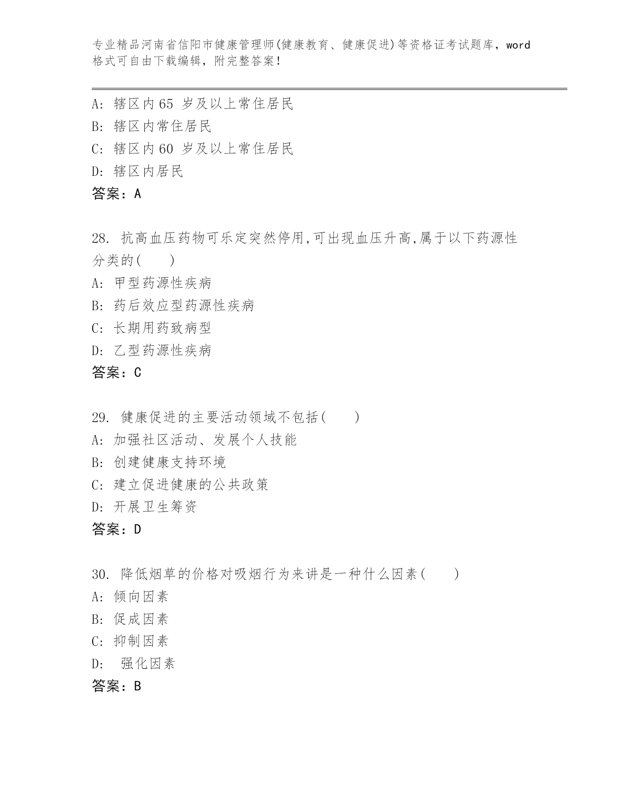 精心整理河南省信阳市健康管理师(健康教育、健康促进)等资格证考试精选题库(精品)
