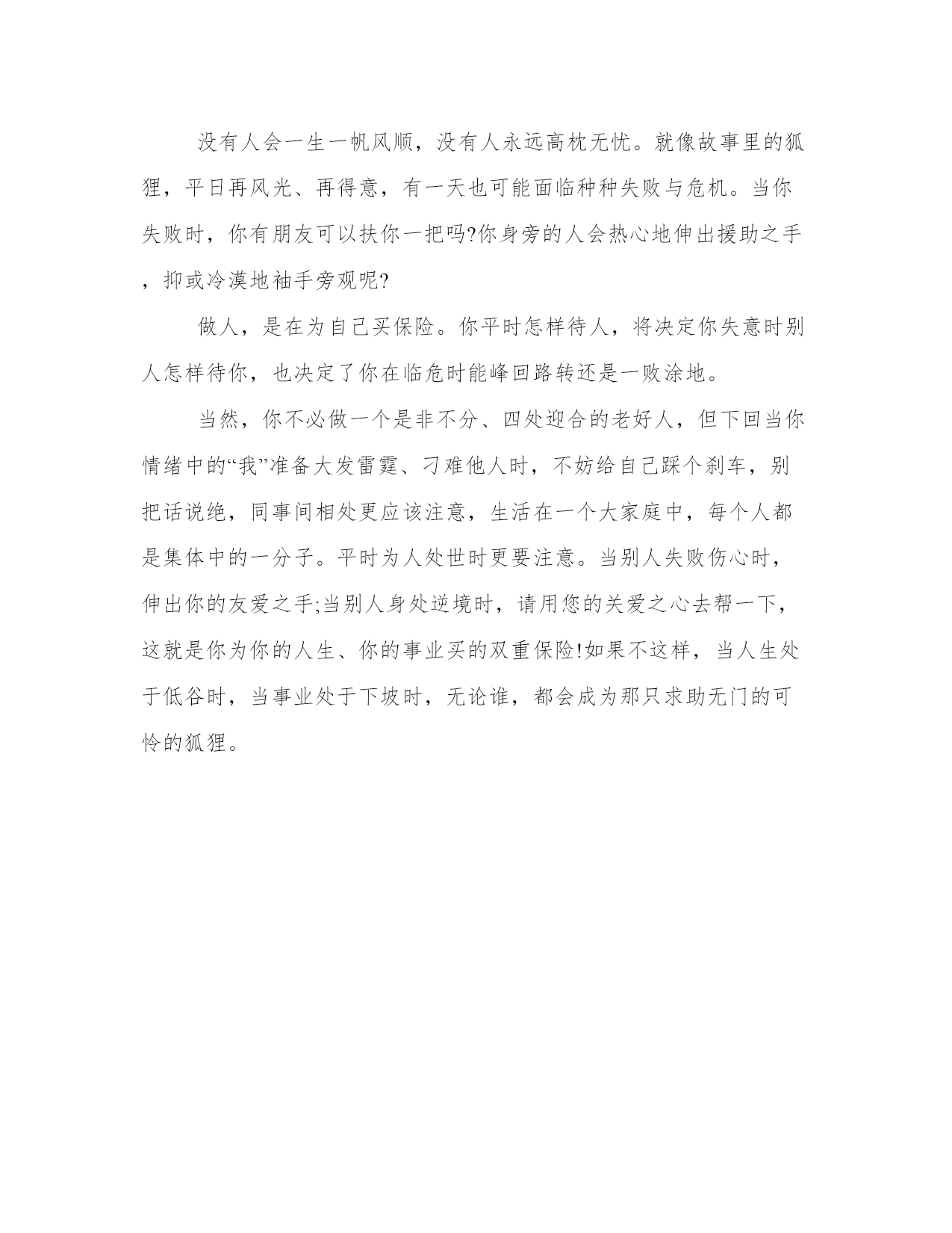 寓言故事《为失败买保险》狐狸一脸惶恐地说:“后……后面有一大群猎犬在追我!”鹦鹉听了心急地大叫:“哎呀!那你赶快到村口玛丽大婶家里躲一躲吧。她人最好,一定会收留你的。”狐狸一听,说:“玛丽大婶?不行,前两天我还偷了她的鸡,她不会收留我的。”鹦鹉想了想,又说:“没关系,史密斯大爷的家离这里也不远,你赶快跑到他那儿躲起来呀!”狐狸却说:“史密斯大爷也不行,几天前我趁他不在家时,偷吃了他孙女养的金丝雀,他们一家正痛恨我呢!”鹦鹉又说:“那么,你去投靠杰弗逊大夫吧,他是这村里惟一的医生,非常有爱心,一定不忍心看你被抓的。”狐狸尴尬地说:“那个杰弗逊大夫呀?上次我到他家里,把他存的肉片给吃得一干二净,还把他院子里种的郁金香给踩烂了……我没脸再去找他。”鹦鹉无奈地问:“难道这个村里就没有你可以投靠的人了吗?”狐狸回答:“没有,我平时可没少害他们啊!”鹦鹉摇摇头,说:“唉,那么我也救不了你了。”最后,这只平日里耀武扬威的狐狸,被猎犬给抓住了。没有人会一生一帆风顺,没有人永远高枕无忧。就像故事里的狐狸,平日再风光、再得意,有一天也可能面临种种失败与危机。当你失败时,你有朋友可以扶你一把吗?你身旁的人会热心地伸出援助之手,抑或冷漠地袖手旁观呢?做人,是在为自己买保险。你平时怎样待人,将决定你失意时别人怎样待你,也决定了你在临危时能峰回路转还是一败涂地。当然,你不必做一个是非不分、四处迎合的老好人,但下回当你情绪中的“我”准备大发雷霆、刁难他人时,不妨给自己踩个刹车,别把话说绝,同事间相处更应该注意,生活在一个大家庭中,每个人都是集体中的一分子。平时为人处世时更要注意。当别人失败伤心时,伸出你的友爱之手;当别人身处逆境时,请用您的关爱之心去帮一下,这就是你为你的人生、你的事业买的双重保险!如果不这样,当人生处于低谷时,当事业处于下坡时,无论谁,都会成为那只求助无门的可怜的狐狸。