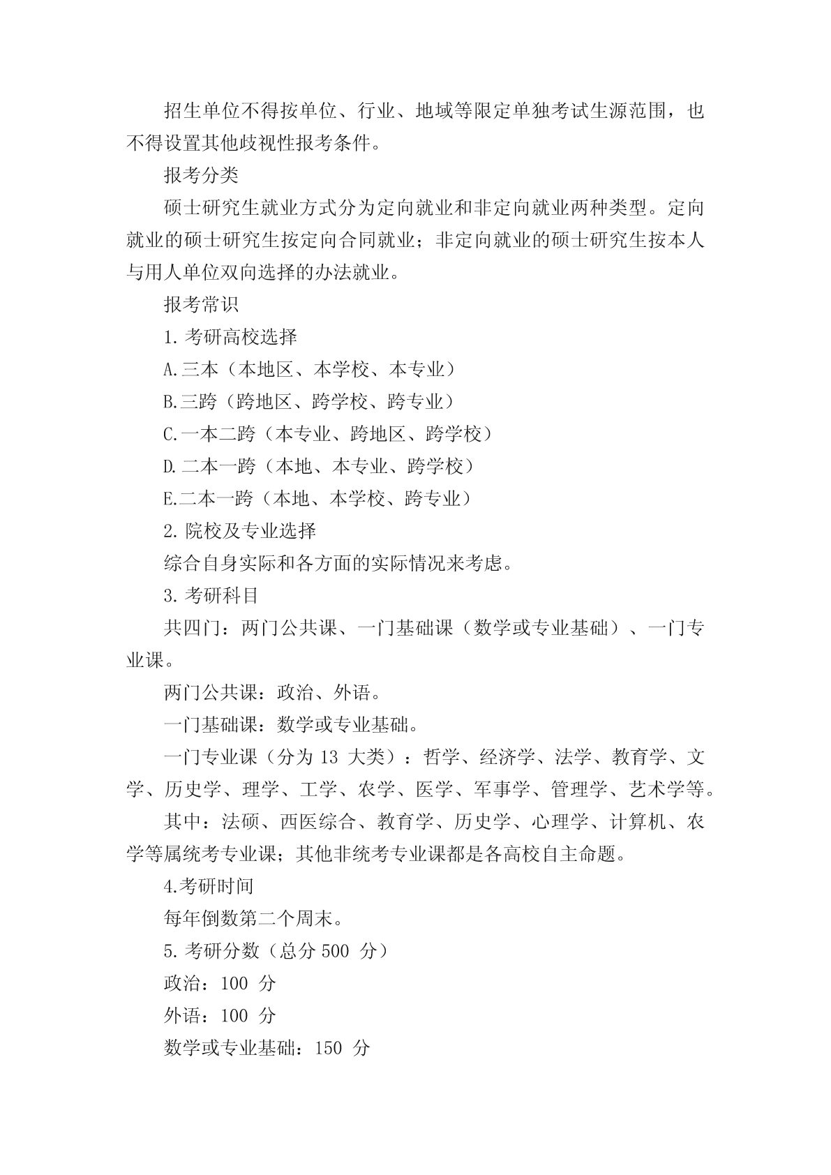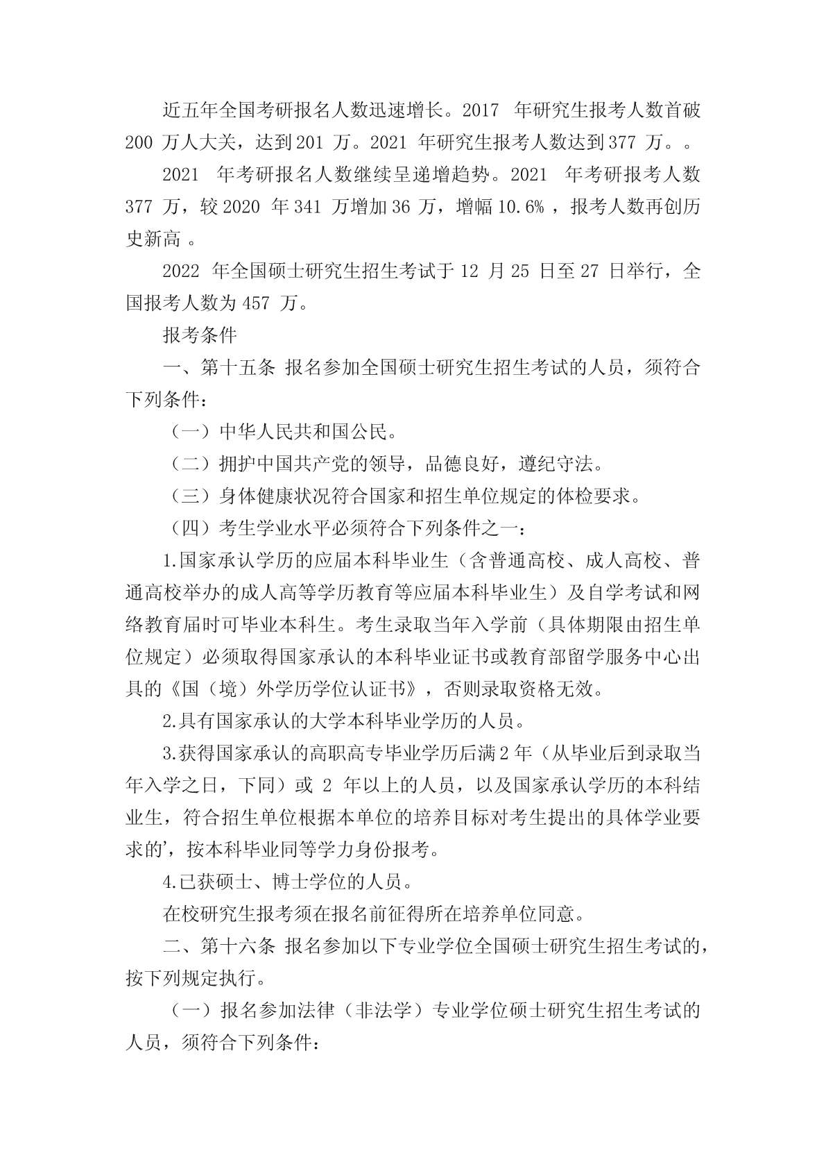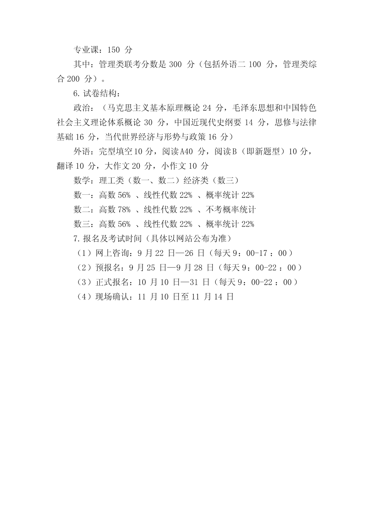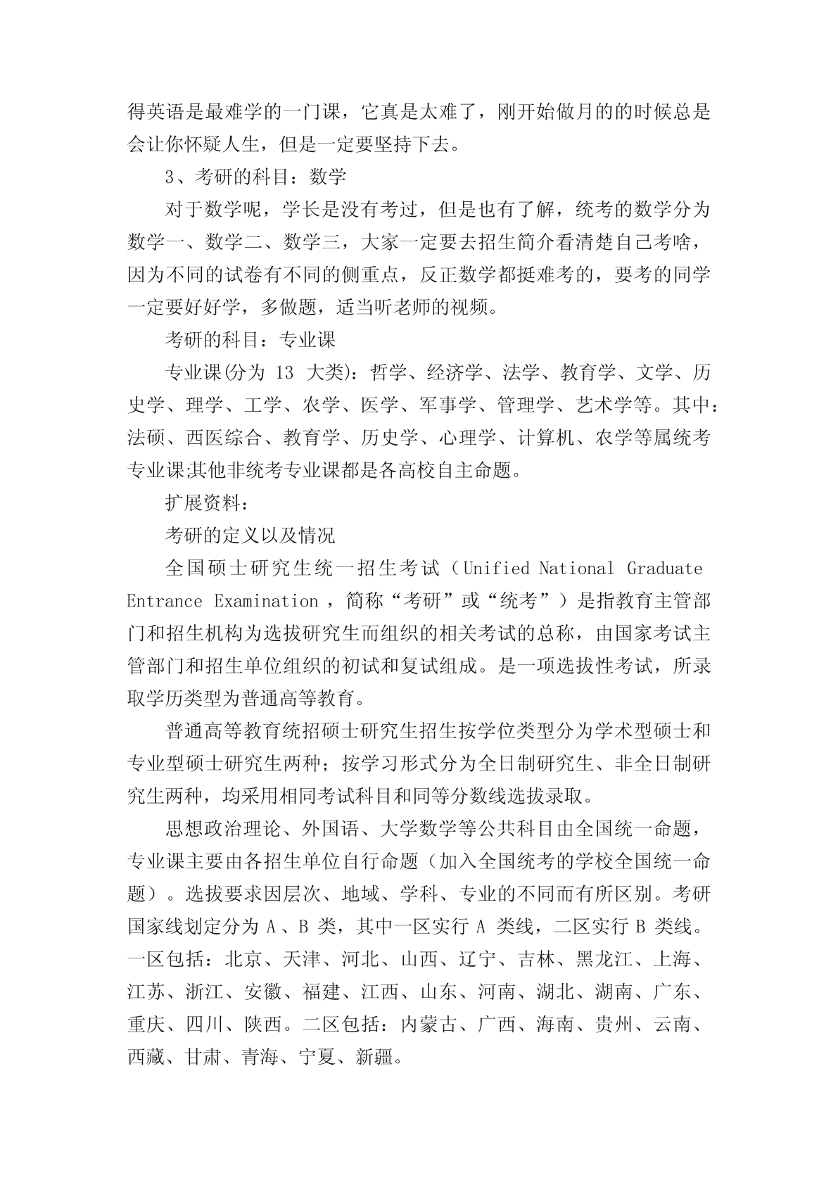 考研究生要考哪些科目考研究生要考哪些科目目前在职研究生的报考方式有两种,分别是一月联考和同等学力申硕,这两种方式涉及的专业和考试科目都是不一样的,考生可以根据自己的情况选择适合自己的方式。以下小编为大家整理了考研究生要考哪些科目的相关内容,希望对大家有所帮助!一般情况下,考研初试一般情况下考四门,分别为政治、英语、数学或专业课。数学、英语和政治这三门科目的试卷是由国家统一命题的,考研专业课的考试由各大招生单位自主命题。考研初试是考察各学科的基础知识和学科专业知识。总分为500分,一般分两天考完。1、考研的科目:政治政治是大家必考的科目,满分100分,考试时间180分钟。单项选择题16分,16小题,每小题一分;多项选择题34分,17小题,每小题2分;分析题50分,5大题,每大题10分。其实大家都说政治是考研中最容易考的科目,这个科目有个特点,那就是得高分很难,得低分也很难,如果你要得到80分以上,那还真得下苦功夫,即使下苦功夫也很难得高分,但是你想低于50分,那也是一件比较困难得事情。这一科目准备其实也不用太早吧,主要花费时间是在最后冲刺阶段,我个人认为在暑假开始最好不过了,前期就看看视频,做一点练习,到了差不多十一二月份那就要开始背了,每天都背,狂背。2、考研的科目:英语对于英语分为英语一和英语二,基本上呢大家都说英语一会比英语二难,而学长考的是英语一,那么就以英语一举例子,英语二以此类推就行。英语一的体型有完形填空、四篇阅读理解、七选五或排序、英文翻译中文、小作文、大作文,具体题型就是这样,大家后面做了真题就知道了。英语的复习可以说是一场持久战,从开始准备考研到考完,你都必须每天学习英语,特别是英语不是很好的同学,英语一定要认真学,不然很难过线,特别是北上广英语要求更是高。学长觉得英语是最难学的一门课,它真是太难了,刚开始做月的的时候总是会让你怀疑人生,但是一定要坚持下去。3、考研的科目:数学对于数学呢,学长是没有考过,但是也有了解,统考的数学分为数学一、数学二、数学三,大家一定要去招生简介看清楚自己考啥,因为不同的试卷有不同的侧重点,反正数学都挺难考的,要考的同学一定要好好学,多做题,适当听老师的视频。考研的科目:专业课专业课(分为13大类):哲学、经济学、法学、教育学、文学、历史学、理学、工学、农学、医学、军事学、管理学、艺术学等。其中:法硕、西医综合、教育学、历史学、心理学、计算机、农学等属统考专业课;其他非统考专业课都是各高校自主命题。扩展资料:考研的定义以及情况全国硕士研究生统一招生考试(UnifiedNationalGraduateEntranceExamination,简称“考研”或“统考”)是指教育主管部门和招生机构为选拔研究生而组织的相关考试的总称,由国家考试主管部门和招生单位组织的初试和复试组成。是一项选拔性考试,所录取学历类型为普通高等教育。普通高等教育统招硕士研究生招生按学位类型分为学术型硕士和专业型硕士研究生两种;按学习形式分为全日制研究生、非全日制研究生两种,均采用相同考试科目和同等分数线选拔录取。思想政治理论、外国语、大学数学等公共科目由全国统一命题,专业课主要由各招生单位自行命题(加入全国统考的学校全国统一命题)。选拔要求因层次、地域、学科、专业的不同而有所区别。考研国家线划定分为A、B类,其中一区实行A类线,二区实行B类线。一区包括:北京、天津、河北、山西、辽宁、吉林、黑龙江、上海、江苏、浙江、安徽、福建、江西、山东、河南、湖北、湖南、广东、重庆、四川、陕西。二区包括:内蒙古、广西、海南、贵州、云南、西藏、甘肃、青海、宁夏、新疆。近五年全国考研报名人数迅速增长。2017年研究生报考人数首破200万人大关,达到201万。2021年研究生报考人数达到377万。。2021年考研报名人数继续呈递增趋势。2021年考研报考人数377万,较2020年341万增加36万,增幅10.6%,报考人数再创历史新高。2022年全国硕士研究生招生考试于12月25日至27日举行,全国报考人数为457万。报考条件一、第十五条报名参加全国硕士研究生招生考试的人员,须符合下列条件:(一)中华人民共和国公民。(二)拥护中国共产党的领导,品德良好,遵纪守法。(三)身体健康状况符合国家和招生单位规定的体检要求。(四)考生学业水平必须符合下列条件之一:1.国家承认学历的应届本科毕业生(含普通高校、成人高校、普通高校举办的成人高等学历教育等应届本科毕业生)及自学考试和网络教育届时可毕业本科生。考生录取当年入学前(具体期限由招生单位规定)必须取得国家承认的本科毕业证书或教育部留学