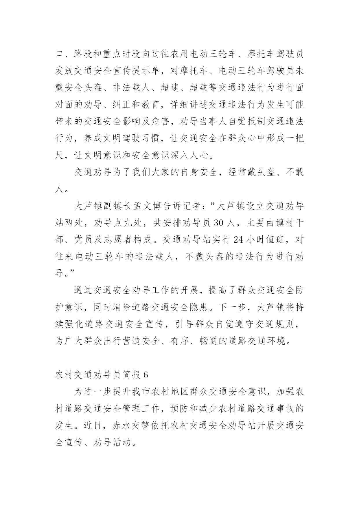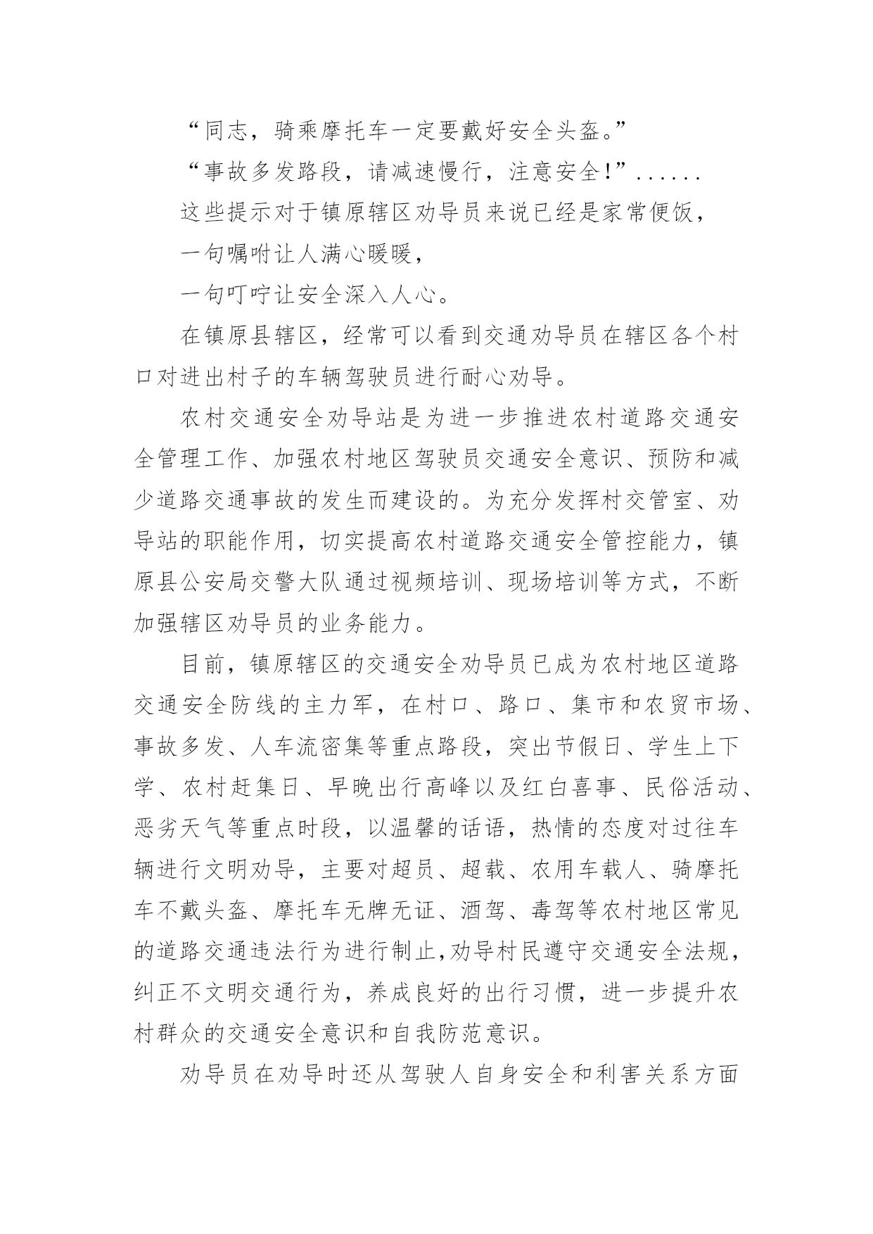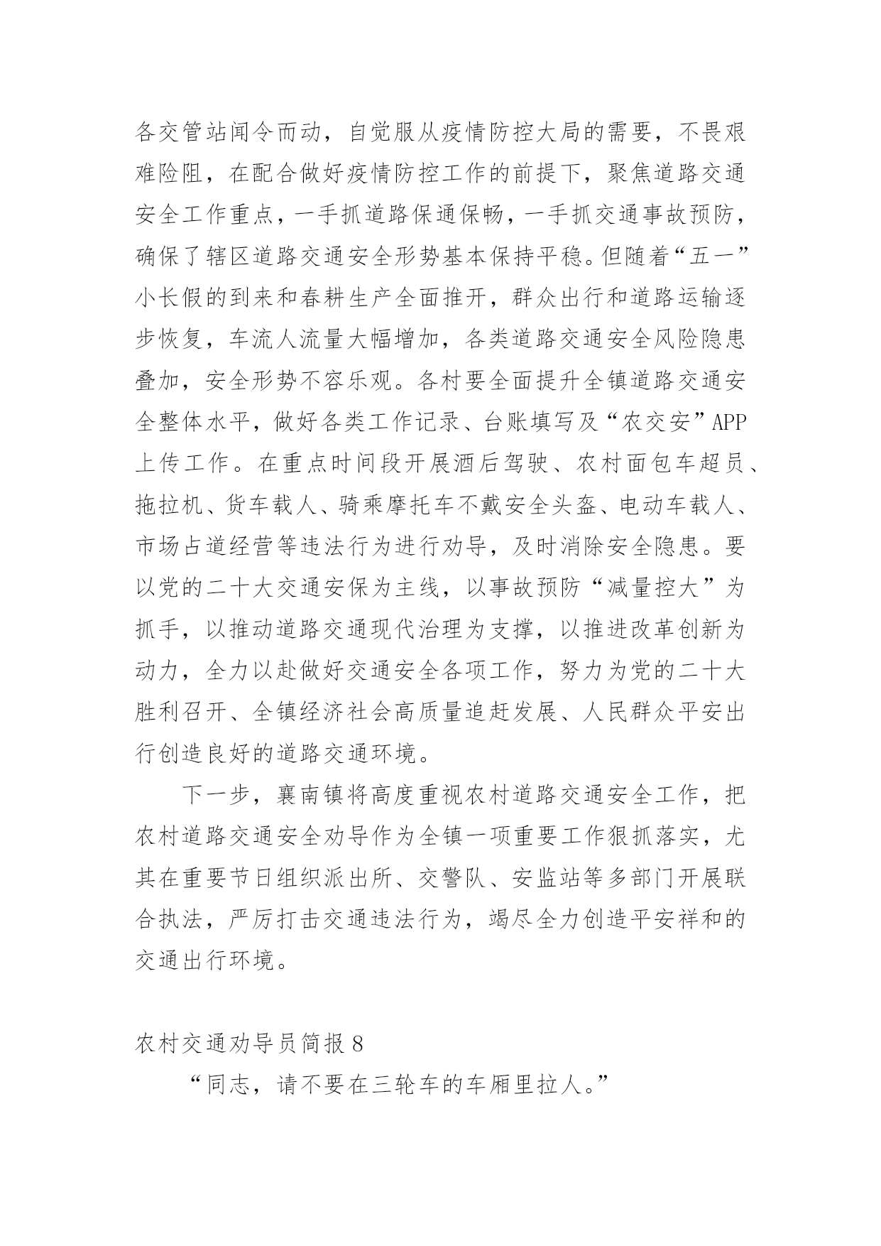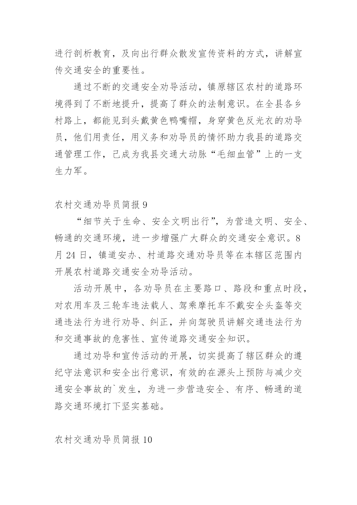 农村交通劝导员简报在现实生活或工作学习中,越来越多地方需要用到简报,简报是传递某方面信息的简短的内部小报。那么,怎么去写简报呢?以下是小编收集整理的农村交通劝导员简报(通用22篇),欢迎大家分享。农村交通劝导员简报1为认真开展国务院“安全生产月”和甘肃省“安全陇原行”活动,切实做好道路交通安全工作,近日,我镇在辖区内集中开展了道路交通安全宣传、劝导工作。镇交管站结合辖区实际情况和特点,通过张贴安全宣传标语,在微信、QQ群等平台向群众推送交通安全知识、通报交通事故等形式开展有针对性的系列宣传教育活动,截至目前共组织交通安全宣传活动5次,悬挂横幅9条,发放资料300多份,营造了浓厚的道路交通安全氛围。各村交管室在镇交管站的统一安排下,在主干道路沿线、人流密集区域、事故易发路段开展了道路交通安全劝导工作。此次检查劝导工作重点针对农用车三轮车、非法载人、驾乘摩托车不戴安全头盔等行为。劝导期间,共出动人力200余人次、车辆35台次,检查劝导车辆160起,发现农用车摩托车电动车非法载人90起,现场劝导整改90起,对发现违规行为进行批评教育并登记备案,情节严重的交由公安部门处理。通过道路交通安全宣传、劝导工作的开展,进一步提高了广大群众的安全出行意识,营造了良好的交通环境。农村交通劝导员简报2为强力推动“强担当、除隐患、防事故、保安全”道路交通安全集中整治行动深入开展。连日来,白杨镇扎实开展农村道路交通安全宣传劝导工作。积极安排部署。我镇始终把农村道路交通安全劝导作为日常工作重点来抓,多次组织召开专题会议,专题安排部署,进一步靠实责任,强化措施,推动工作落实。加强宣传教育。通过微信群、微信公众号、村民大会、入户宣传等方式向群众宣传道路交通安全知识。进一步提高群众安全出行意识,预防和减少交通事故的发生,并教育引导广大群众自觉遵守交通法律法规。扎实开展劝导。积极组织道路交通安全劝导员发挥职能作用,每日对沿路过往的农用三轮车、电动车、摩托车等车辆进行劝导,并上传道路交通劝导APP。针对农用车违规载人、不戴头盔上路、无牌无证行驶等交通违法行为现场劝导,向驾驶员讲解交通违法行为和交通事故的危害性,自觉抵制交通违法行为,养成良好的文明驾驶习惯。道路交通安全,事关千家万户。下一步,我镇将持续加大道路交通安全劝导力度,努力营造安全、有序、畅通的道路交通环境,筑牢农村道路交通安全第一防线。农村交通劝导员简报3为进一步营造安全、文明、和谐的.道路交通环境,提升群众道路交通安全意识,有效预防道路交通事故。近日,淅川县盛湾镇联合镇派出所、公路站、应急办等相关部门,联合行动、主动出击、积极应对,迅速开展整治道路交通安全各类问题,为辖区群众创造良好的道路交通安全环境,引导群众自觉遵守交通法律法规。活动中,工作人员通过联合交通安全劝导员,张贴宣传海报、发放交通安全宣传资料等形式,对驾驶员和乘客进行道路交通安全法律法规等相关安全知识进行耐心细致讲解。针对驾驶摩托车不按规定佩戴头盔,驾驶车辆未系安全带、人货混装等重点违法行为,及时劝导、纠正,制止交通违法行为。对于超速行驶、占道行驶等不规范驾驶行为,进行严格的批评教育,并现场学习道路交通安全法律法规。引导驾驶员与群众一起共同参与到抵制各种交通违法行为,为了家人和大家的安全,劝导驾驶员规范驾驶车辆,消除道路安全隐患,争做一名道路交通安全文明先行者。道路千万条,安全第一条。下一步,盛湾镇将持续加大道路交通安全执法检查力度,形成齐抓共管、人人参与浓厚氛围,营造安全、有序、畅通、便捷的道路交通安全环境,筑牢农村道路交通安全第一防线。农村交通劝导员简报4为迅速贯彻落实农村道路交通秩序百日整治会议精神,切实加强农村道路交通秩序整治,全面预防和遏制重特大道路交通事故的发生,东安县公安局交警大队多措并举,深入开展道路交通秩序整治行动,扎实做好交通事故预防工作,铸就生命安全防线。昨日,石期市镇中队与大庙口中队均深入农村开展了道路交通整治行动。整治行动中,严查了农村摩托车、面包车、三轮车、拖拉机、电动车等车辆未戴安全头盔、超员载客、违法载人、人货混装、无牌无证等交通违法行为。对无证驾驶、无牌、无证、超员超载等严重交通违法行为现场开具处罚决定书,并对驾驶员进行交通安全宣传教育。以处罚和劝导相结合的方式,让农村道路交通秩序深入人心。在此次整治行动中,石期市镇中队与大庙口中队共查获酒后驾驶3起,未带头盔26起,客车超员1起,三轮车载客5起,整治行动起到良好的效果。东安交警大队将继续扩大整治力度,全面深入开展农村道路交通秩序整治行动,切实改善农村道路交通环境。农村交通劝导员简报5为营造安全、文明、和谐的农村道路交通环境,提升群众交通安全意识,有效预防道路交通事故,连日来,大芦镇积极组织开展了农村道路交通安全检查劝导工作,充分发挥镇村干部、交通劝导员