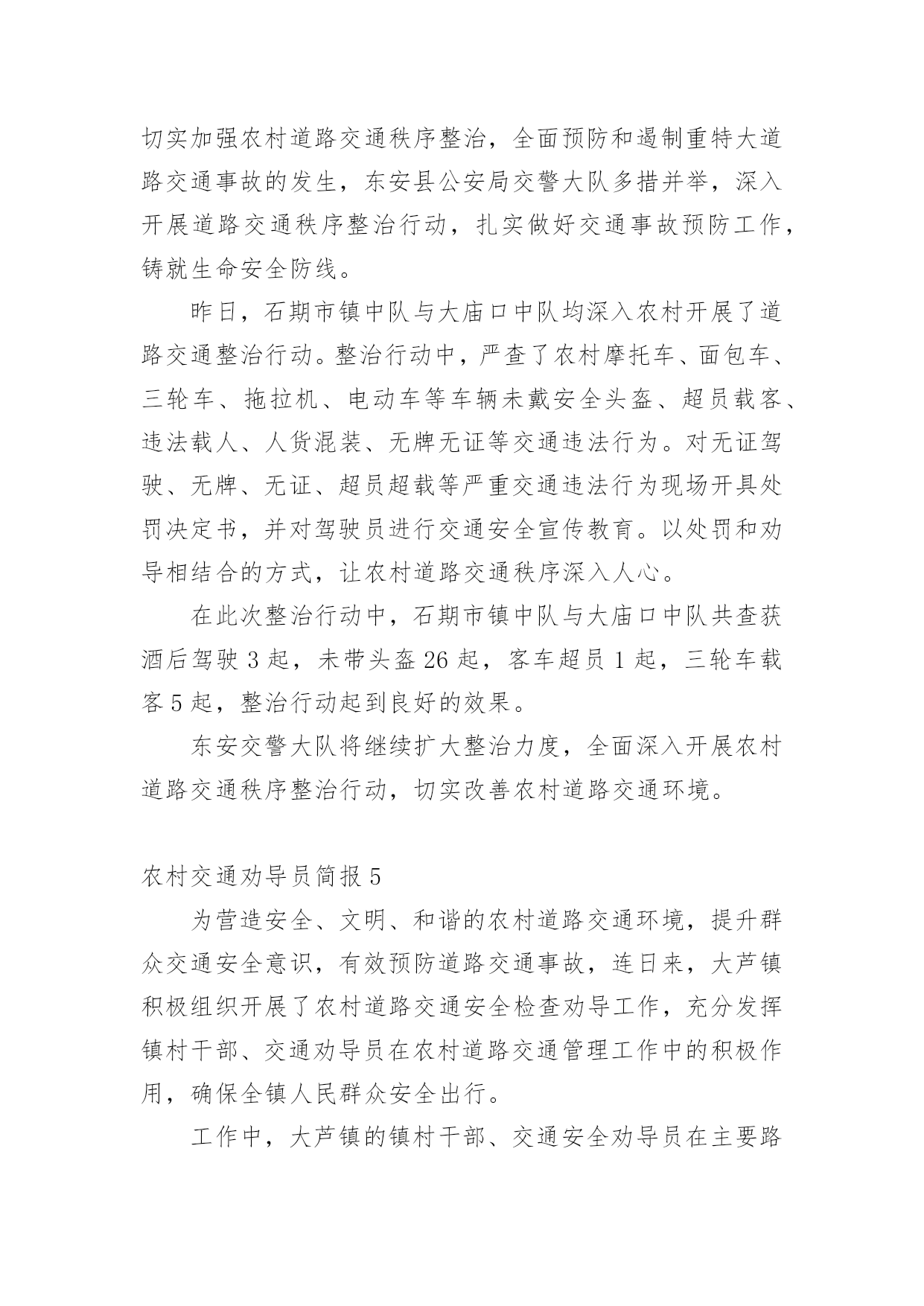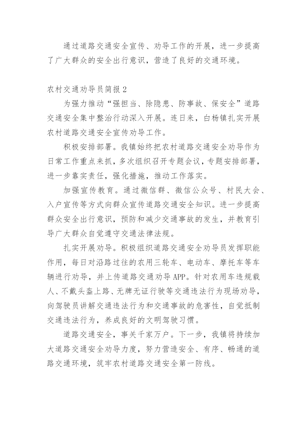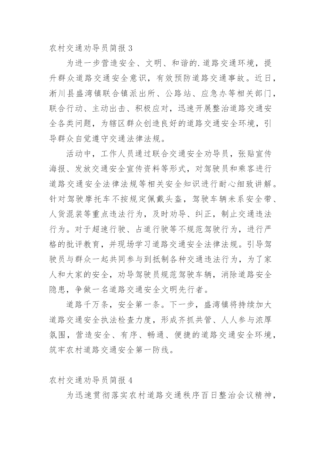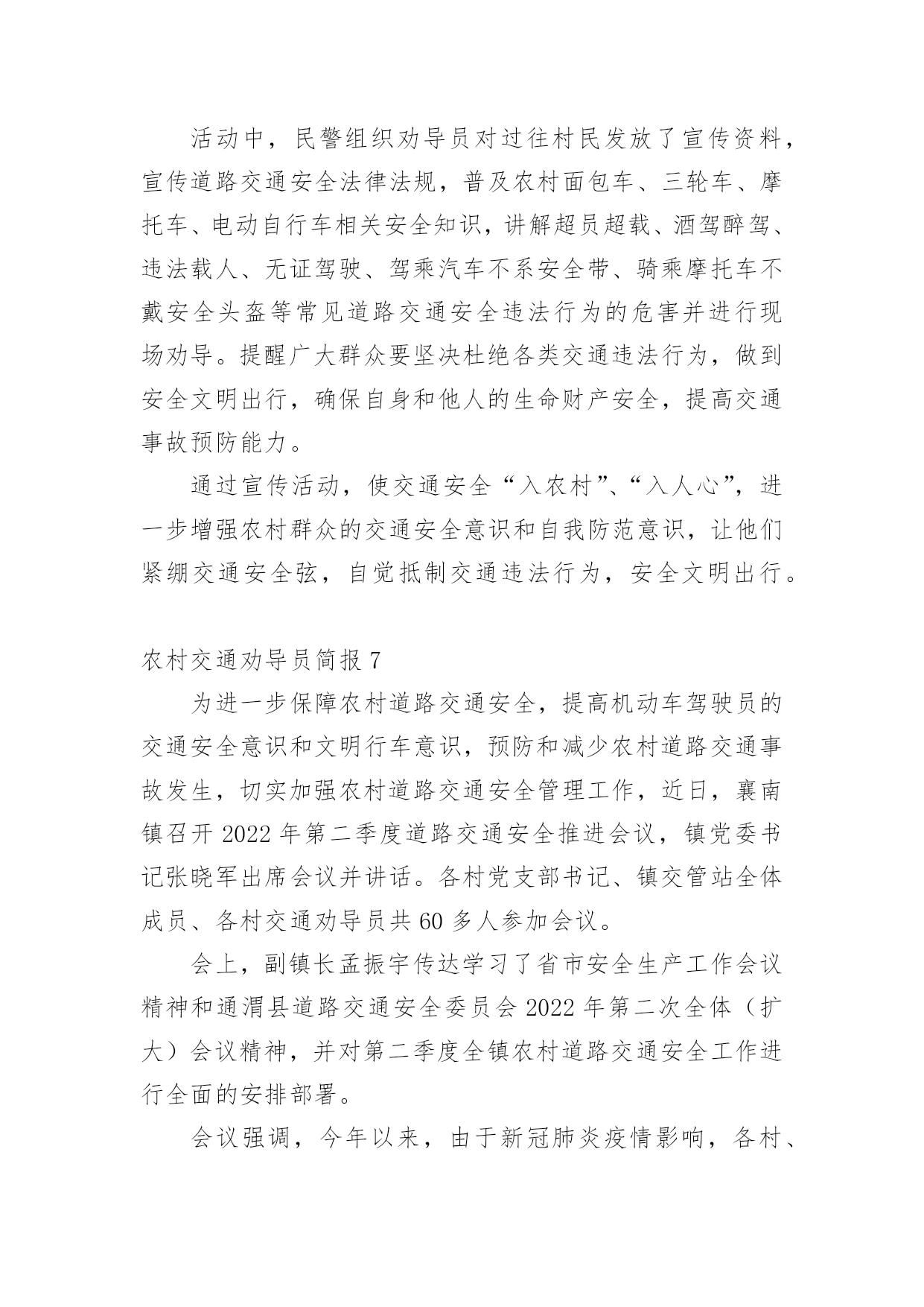 农村交通劝导员简报在现实生活或工作学习中,越来越多地方需要用到简报,简报是传递某方面信息的简短的内部小报。那么,怎么去写简报呢?以下是小编收集整理的农村交通劝导员简报(通用22篇),欢迎大家分享。农村交通劝导员简报1为认真开展国务院“安全生产月”和甘肃省“安全陇原行”活动,切实做好道路交通安全工作,近日,我镇在辖区内集中开展了道路交通安全宣传、劝导工作。镇交管站结合辖区实际情况和特点,通过张贴安全宣传标语,在微信、QQ群等平台向群众推送交通安全知识、通报交通事故等形式开展有针对性的系列宣传教育活动,截至目前共组织交通安全宣传活动5次,悬挂横幅9条,发放资料300多份,营造了浓厚的道路交通安全氛围。各村交管室在镇交管站的统一安排下,在主干道路沿线、人流密集区域、事故易发路段开展了道路交通安全劝导工作。此次检查劝导工作重点针对农用车三轮车、非法载人、驾乘摩托车不戴安全头盔等行为。劝导期间,共出动人力200余人次、车辆35台次,检查劝导车辆160起,发现农用车摩托车电动车非法载人90起,现场劝导整改90起,对发现违规行为进行批评教育并登记备案,情节严重的交由公安部门处理。通过道路交通安全宣传、劝导工作的开展,进一步提高了广大群众的安全出行意识,营造了良好的交通环境。农村交通劝导员简报2为强力推动“强担当、除隐患、防事故、保安全”道路交通安全集中整治行动深入开展。连日来,白杨镇扎实开展农村道路交通安全宣传劝导工作。积极安排部署。我镇始终把农村道路交通安全劝导作为日常工作重点来抓,多次组织召开专题会议,专题安排部署,进一步靠实责任,强化措施,推动工作落实。加强宣传教育。通过微信群、微信公众号、村民大会、入户宣传等方式向群众宣传道路交通安全知识。进一步提高群众安全出行意识,预防和减少交通事故的发生,并教育引导广大群众自觉遵守交通法律法规。扎实开展劝导。积极组织道路交通安全劝导员发挥职能作用,每日对沿路过往的农用三轮车、电动车、摩托车等车辆进行劝导,并上传道路交通劝导APP。针对农用车违规载人、不戴头盔上路、无牌无证行驶等交通违法行为现场劝导,向驾驶员讲解交通违法行为和交通事故的危害性,自觉抵制交通违法行为,养成良好的文明驾驶习惯。道路交通安全,事关千家万户。下一步,我镇将持续加大道路交通安全劝导力度,努力营造安全、有序、畅通的道路交通环境,筑牢农村道路交通安全第一防线。农村交通劝导员简报3为进一步营造安全、文明、和谐的.道路交通环境,提升群众道路交通安全意识,有效预防道路交通事故。近日,淅川县盛湾镇联合镇派出所、公路站、应急办等相关部门,联合行动、主动出击、积极应对,迅速开展整治道路交通安全各类问题,为辖区群众创造良好的道路交通安全环境,引导群众自觉遵守交通法律法规。活动中,工作人员通过联合交通安全劝导员,张贴宣传海报、发放交通安全宣传资料等形式,对驾驶员和乘客进行道路交通安全法律法规等相关安全知识进行耐心细致讲解。针对驾驶摩托车不按规定佩戴头盔,驾驶车辆未系安全带、人货混装等重点违法行为,及时劝导、纠正,制止交通违法行为。对于超速行驶、占道行驶等不规范驾驶行为,进行严格的批评教育,并现场学习道路交通安全法律法规。引导驾驶员与群众一起共同参与到抵制各种交通违法行为,为了家人和大家的安全,劝导驾驶员规范驾驶车辆,消除道路安全隐患,争做一名道路交通安全文明先行者。道路千万条,安全第一条。下一步,盛湾镇将持续加大道路交通安全执法检查力度,形成齐抓共管、人人参与浓厚氛围,营造安全、有序、畅通、便捷的道路交通安全环境,筑牢农村道路交通安全第一防线。农村交通劝导员简报4为迅速贯彻落实农村道路交通秩序百日整治会议精神,切实加强农村道路交通秩序整治,全面预防和遏制重特大道路交通事故的发生,东安县公安局交警大队多措并举,深入开展道路交通秩序整治行动,扎实做好交通事故预防工作,铸就生命安全防线。昨日,石期市镇中队与大庙口中队均深入农村开展了道路交通整治行动。整治行动中,严查了农村摩托车、面包车、三轮车、拖拉机、电动车等车辆未戴安全头盔、超员载客、违法载人、人货混装、无牌无证等交通违法行为。对无证驾驶、无牌、无证、超员超载等严重交通违法行为现场开具处罚决定书,并对驾驶员进行交通安全宣传教育。以处罚和劝导相结合的方式,让农村道路交通秩序深入人心。在此次整治行动中,石期市镇中队与大庙口中队共查获酒后驾驶3起,未带头盔26起,客车超员1起,三轮车载客5起,整治行动起到良好的效果。东安交警大队将继续扩大整治力度,全面深入开展农村道路交通秩序整治行动,切实改善农村道路交通环境。农村交通劝导员简报5为营造安全、文明、和谐的农村道路交通环境,提升群众交通安全意识,有效预防道路交通事故,连日来,大芦镇积极组织开展了农村道路交通安全检查劝导工作,充分发挥镇村干部、交通劝导员