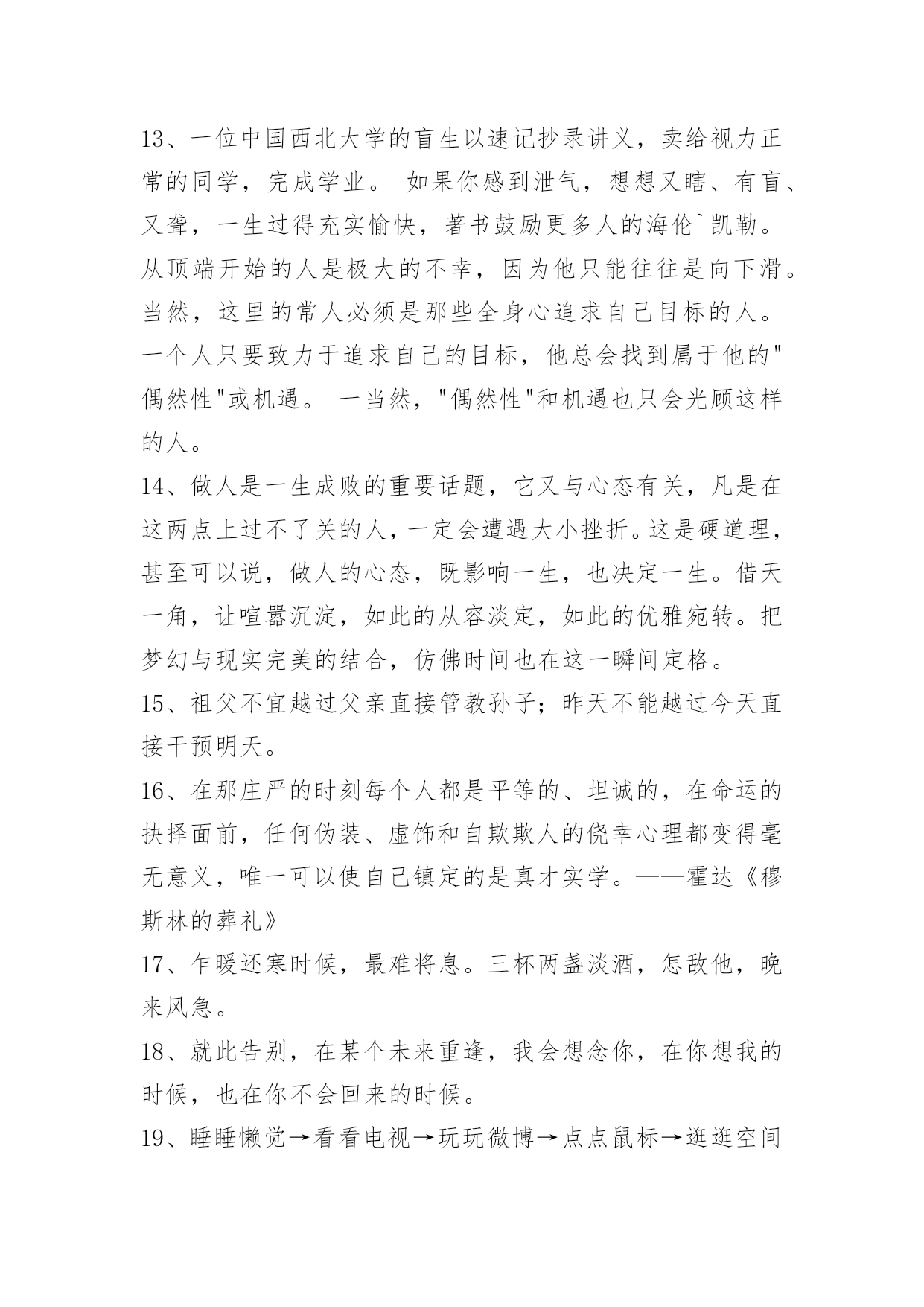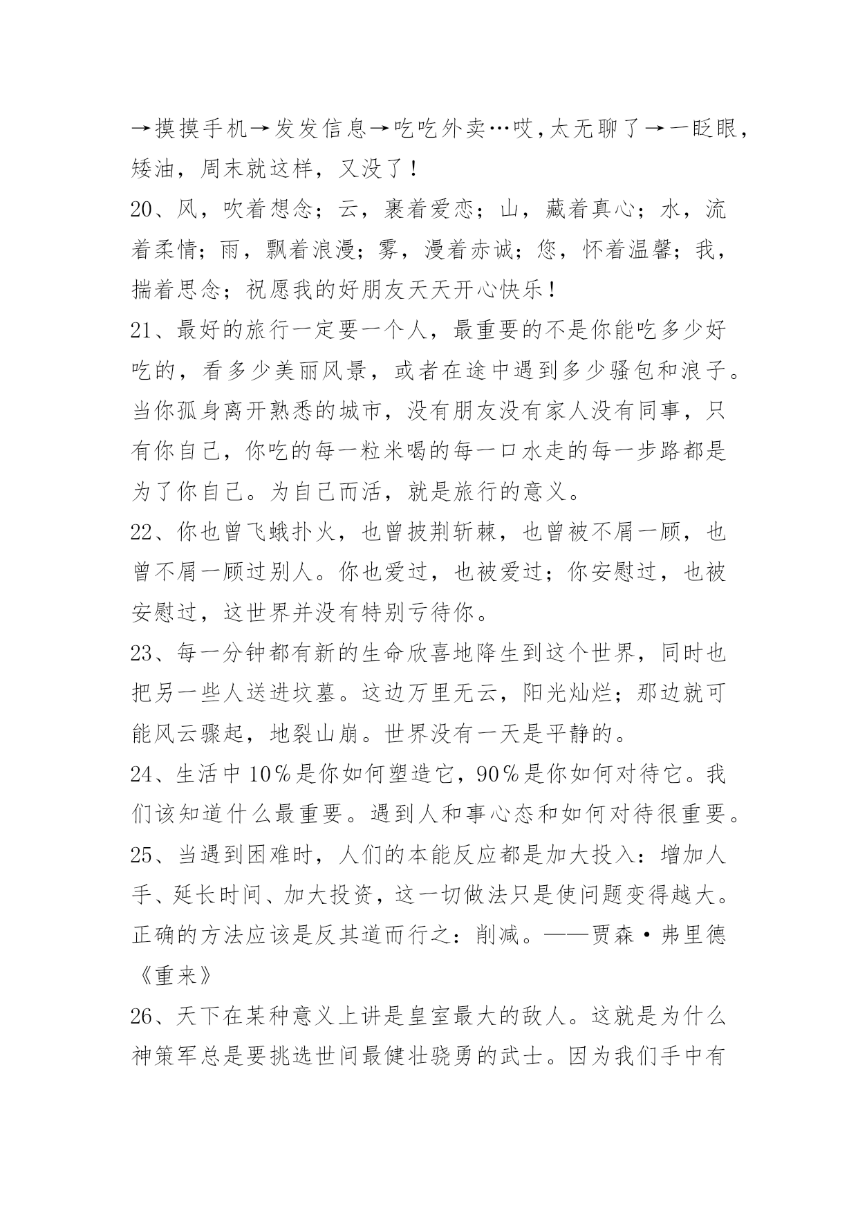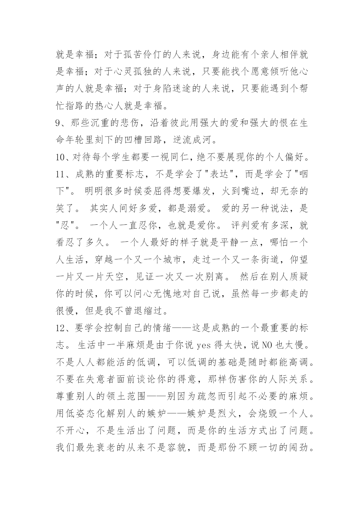 人生的哲理语录48条【推荐】2023年人生的经典哲理语录集锦48条一个人不再自我成长,觉得自己没有什么可以学习的时候,我就为他感到非常可悲。下面是小编帮大家整理的人生的经典哲理语录48条,仅供参考,大家一起来看看吧。1、秋风十里充满了君的片片柔情,夜月朦胧中有炫美的一帘幽梦,臣妾对君的思念如满城风絮点点时雨。雨滴不尽相思绵绵,古槐深巷叶满画楼,期待和君相伴永远。2、死在回忆城,曾经属于我们的城。3、喝了很多水,却填不满每个夜晚对梦想的饥渴。4、如果你注定一生都要哭泣,我愿意陪你哭泣一生!所以拜托了,哪怕是最后一次,你一定要相信我!"5、岂知千仞坠,只为一毫差。6、人生只有经历才会懂得,只有懂得才知道珍惜。一生中,总会有一个人让你笑得最甜,也总会有一个人让你痛得最深,忘记,是善待自己。人人都有痛苦,伤疤,经常去揭,会添新疮。学会忘却,才有阳光,才有欢乐。年华,不是埋葬在光阴里,而是淹没在无尽的牵挂里。7、如果坦白是一种伤害,选择谎言。如果谎言也是伤害,选择沉默。8、对于幸福,不同的人在不同的处境中会有不同的看法和感受。对于饥寒交迫的人来说,只要有一顿饱饭就是最大的幸福;对于疲惫不堪的人来说,只要能美美地睡上一会儿,就是幸福;对于孤苦伶仃的人来说,身边能有个亲人相伴就是幸福;对于心灵孤独的人来说,只要能找个愿意倾听他心声的人就是幸福;对于身陷迷途的人来说,只要能遇到个帮忙指路的热心人就是幸福。9、那些沉重的悲伤,沿着彼此用强大的爱和强大的恨在生命年轮里刻下的凹槽回路,逆流成河。10、对待每个学生都要一视同仁,绝不要展现你的个人偏好。11、成熟的重要标志,不是学会了"表达",而是学会了"咽下"。明明很多时候委屈得想要爆发,火到嘴边,却无奈的笑了。其实人间好多爱,都是溺爱。爱的另一种说法,是"忍"。一个人一直忍你,也就是爱你。评判爱有多深,就看忍了多久。一个人最好的样子就是平静一点,哪怕一个人生活,穿越一个又一个城市,走过一个又一条街道,仰望一片又一片天空,见证一次又一次别离。然后在别人质疑你的时候,你可以问心无愧地对自己说,虽然每一步都走的很慢,但是我不曾退缩过。12、要学会控制自己的情绪——这是成熟的一个最重要的标志。生活中一半麻烦是由于你说yes得太快,说NO也太慢。不是人人都能活的低调,可以低调的基础是随时都能高调。不要在失意者面前谈论你的得意,那样伤害你的人际关系。尊重别人的领土范围——别因为疏忽而引起不必要的麻烦。用低姿态化解别人的嫉妒——嫉妒是烈火,会烧毁一个人。不开心,不是生活出了问题,而是你的生活方式出了问题。我们最先衰老的从来不是容貌,而是那份不顾一切的闯劲。13、一位中国西北大学的盲生以速记抄录讲义,卖给视力正常的同学,完成学业。如果你感到泄气,想想又瞎、有盲、又聋,一生过得充实愉快,著书鼓励更多人的海伦`凯勒。从顶端开始的人是极大的不幸,因为他只能往往是向下滑。当然,这里的常人必须是那些全身心追求自己目标的人。一个人只要致力于追求自己的目标,他总会找到属于他的"偶然性"或机遇。一当然,"偶然性"和机遇也只会光顾这样的人。14、做人是一生成败的重要话题,它又与心态有关,凡是在这两点上过不了关的人,一定会遭遇大小挫折。这是硬道理,甚至可以说,做人的心态,既影响一生,也决定一生。借天一角,让喧嚣沉淀,如此的从容淡定,如此的优雅宛转。把梦幻与现实完美的结合,仿佛时间也在这一瞬间定格。15、祖父不宜越过父亲直接管教孙子;昨天不能越过今天直接干预明天。16、在那庄严的时刻每个人都是平等的、坦诚的,在命运的抉择面前,任何伪装、虚饰和自欺欺人的侥幸心理都变得毫无意义,唯一可以使自己镇定的是真才实学。——霍达《穆斯林的葬礼》17、乍暖还寒时候,最难将息。三杯两盏淡酒,怎敌他,晚来风急。18、就此告别,在某个未来重逢,我会想念你,在你想我的时候,也在你不会回来的时候。19、睡睡懒觉→看看电视→玩玩微博→点点鼠标→逛逛空间→摸摸手机→发发信息→吃吃外卖…哎,太无聊了→一眨眼,矮油,周末就这样,又没了!20、风,吹着想念;云,裹着爱恋;山,藏着真心;水,流着柔情;雨,飘着浪漫;雾,漫着赤诚;您,怀着温馨;我,揣着思念;祝愿我的好朋友天天开心快乐!21、最好的旅行一定要一个人,最重要的不是你能吃多少好吃的,看多少美丽风景,或者在途中遇到多少骚包和浪子。当你孤身离开熟悉的城市,没有朋友没有家人没有同事,只有你自己,你吃的每一粒米喝的每一口水走的每一步路都是为了你自己。为自己而活,就是旅行的意义。22、你也曾飞蛾扑火,也曾披荆斩棘,也曾被不屑一顾,也曾不屑一顾过别人。你也爱过,也被爱过;你安慰过,也被安慰过,这世界并没有特别亏待你。23、每一分钟都有新的生命欣喜地降生到这个世界,同时也把另一些人送进坟墓。这边万里无云,阳光灿烂;那边就可