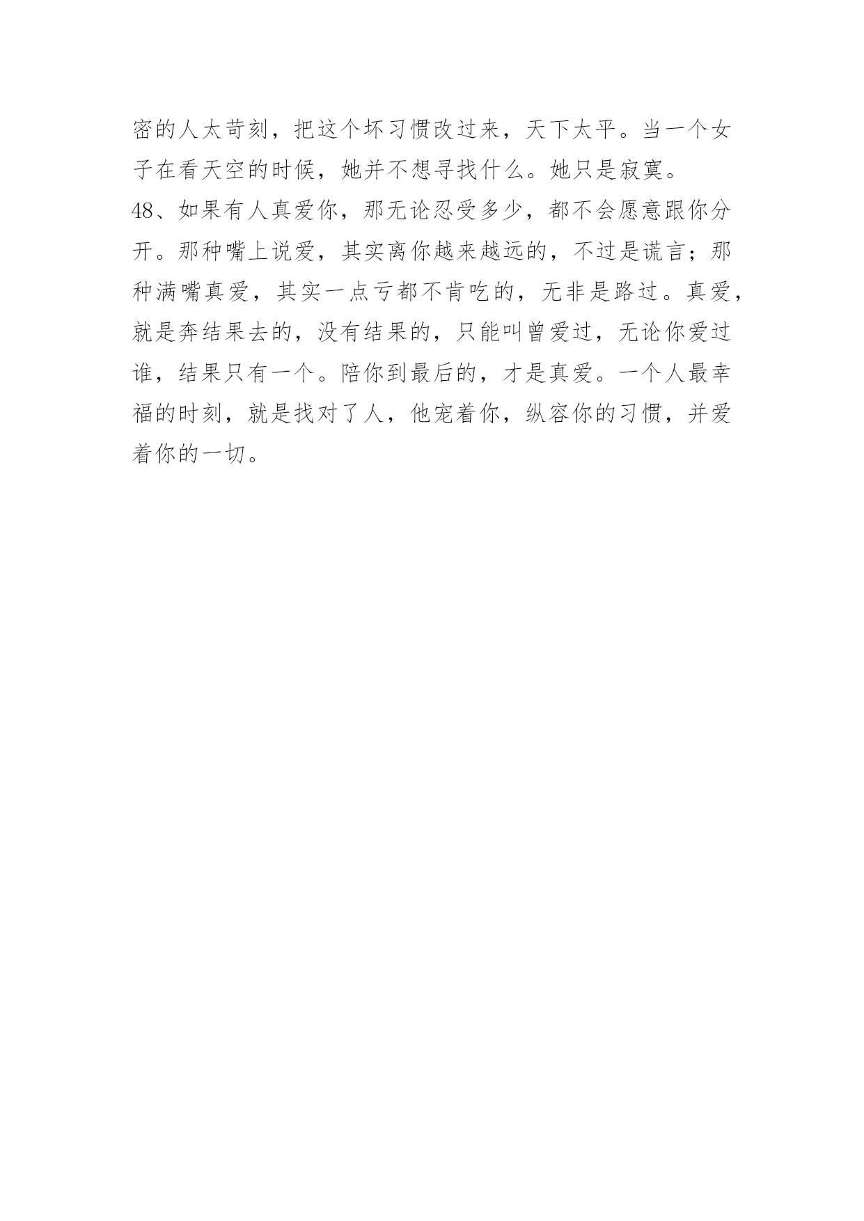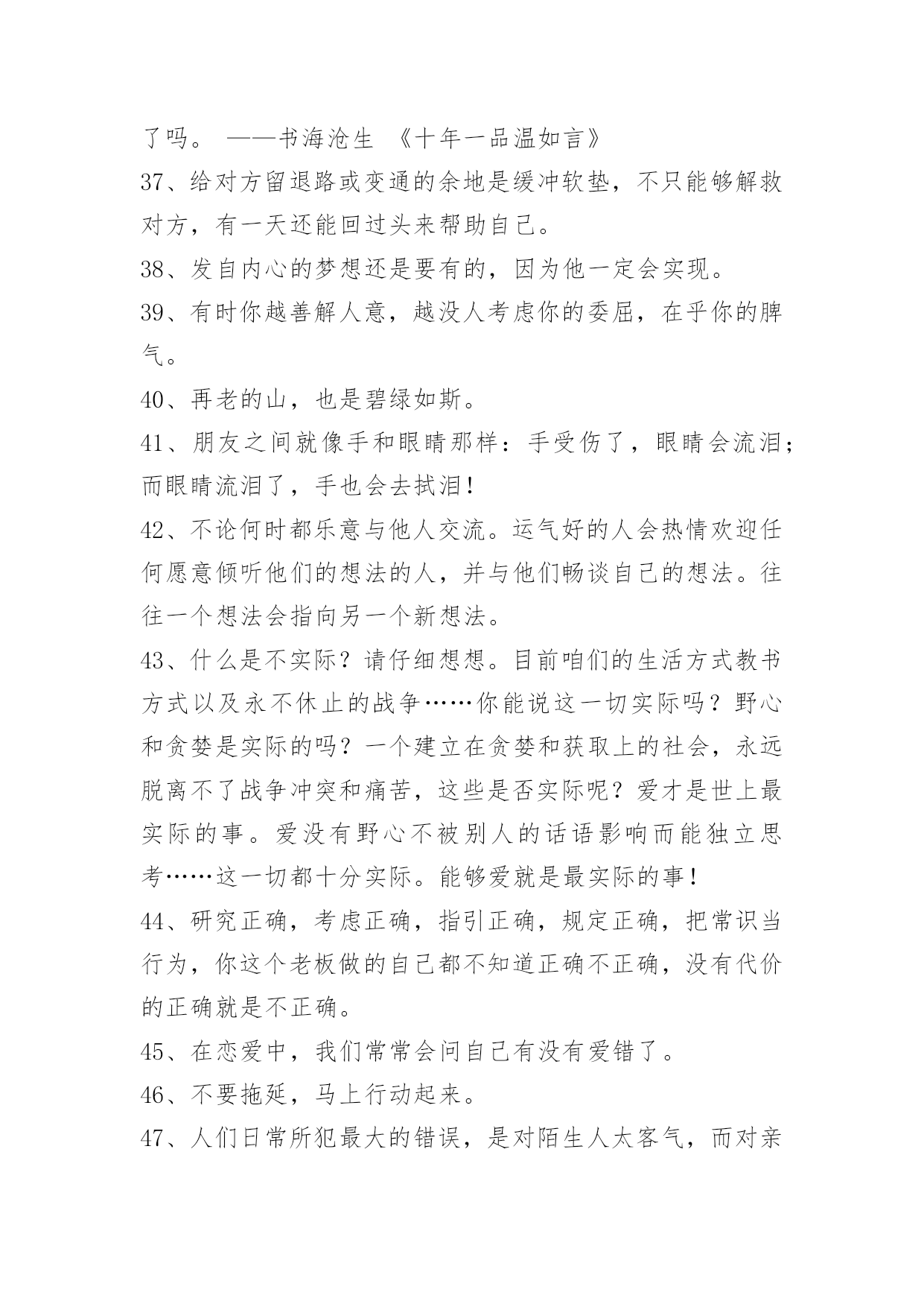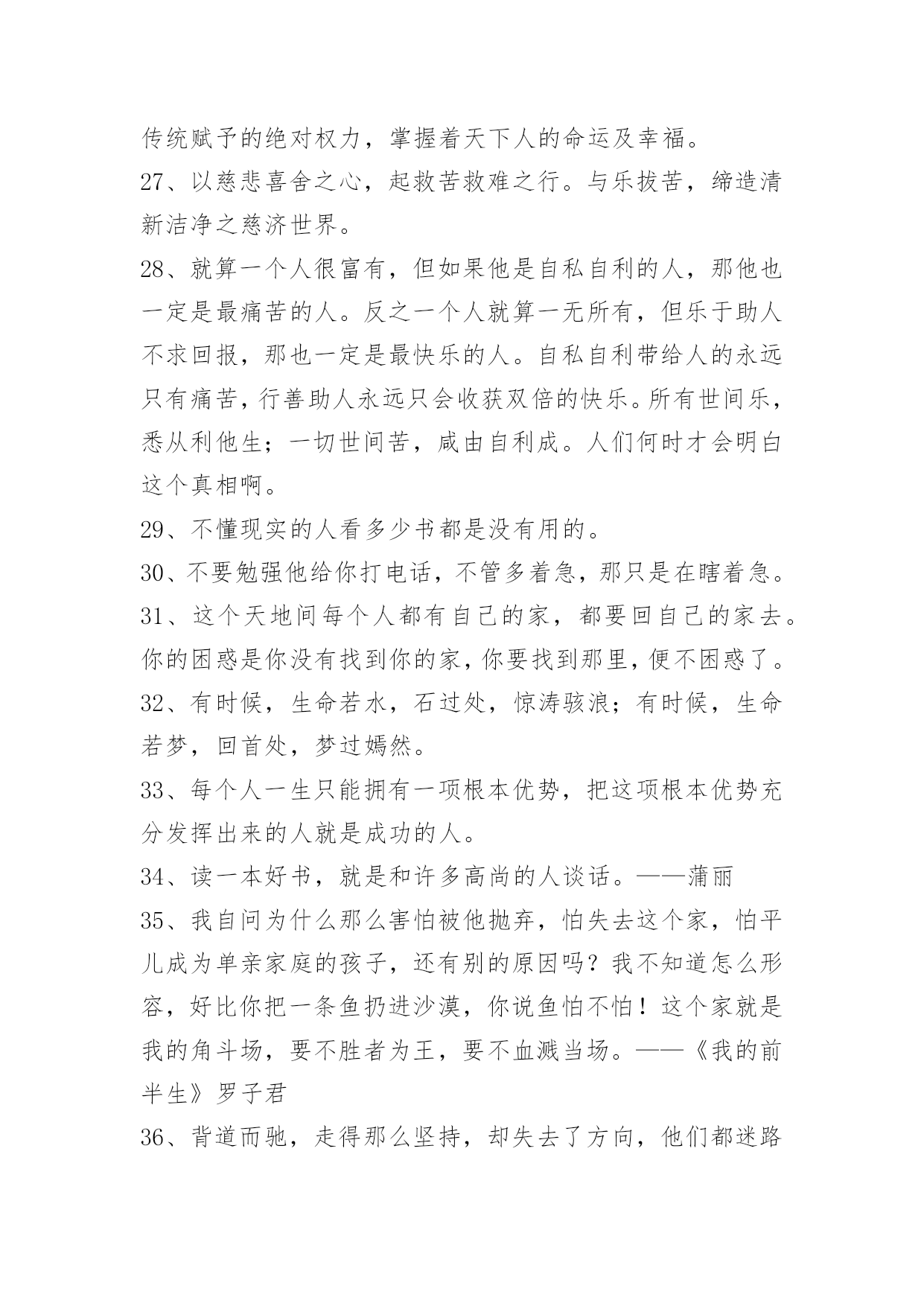 人生的哲理语录48条【推荐】2023年人生的经典哲理语录集锦48条一个人不再自我成长,觉得自己没有什么可以学习的时候,我就为他感到非常可悲。下面是小编帮大家整理的人生的经典哲理语录48条,仅供参考,大家一起来看看吧。1、秋风十里充满了君的片片柔情,夜月朦胧中有炫美的一帘幽梦,臣妾对君的思念如满城风絮点点时雨。雨滴不尽相思绵绵,古槐深巷叶满画楼,期待和君相伴永远。2、死在回忆城,曾经属于我们的城。3、喝了很多水,却填不满每个夜晚对梦想的饥渴。4、如果你注定一生都要哭泣,我愿意陪你哭泣一生!所以拜托了,哪怕是最后一次,你一定要相信我!"5、岂知千仞坠,只为一毫差。6、人生只有经历才会懂得,只有懂得才知道珍惜。一生中,总会有一个人让你笑得最甜,也总会有一个人让你痛得最深,忘记,是善待自己。人人都有痛苦,伤疤,经常去揭,会添新疮。学会忘却,才有阳光,才有欢乐。年华,不是埋葬在光阴里,而是淹没在无尽的牵挂里。7、如果坦白是一种伤害,选择谎言。如果谎言也是伤害,选择沉默。8、对于幸福,不同的人在不同的处境中会有不同的看法和感受。对于饥寒交迫的人来说,只要有一顿饱饭就是最大的幸福;对于疲惫不堪的人来说,只要能美美地睡上一会儿,就是幸福;对于孤苦伶仃的人来说,身边能有个亲人相伴就是幸福;对于心灵孤独的人来说,只要能找个愿意倾听他心声的人就是幸福;对于身陷迷途的人来说,只要能遇到个帮忙指路的热心人就是幸福。9、那些沉重的悲伤,沿着彼此用强大的爱和强大的恨在生命年轮里刻下的凹槽回路,逆流成河。10、对待每个学生都要一视同仁,绝不要展现你的个人偏好。11、成熟的重要标志,不是学会了"表达",而是学会了"咽下"。明明很多时候委屈得想要爆发,火到嘴边,却无奈的笑了。其实人间好多爱,都是溺爱。爱的另一种说法,是"忍"。一个人一直忍你,也就是爱你。评判爱有多深,就看忍了多久。一个人最好的样子就是平静一点,哪怕一个人生活,穿越一个又一个城市,走过一个又一条街道,仰望一片又一片天空,见证一次又一次别离。然后在别人质疑你的时候,你可以问心无愧地对自己说,虽然每一步都走的很慢,但是我不曾退缩过。12、要学会控制自己的情绪——这是成熟的一个最重要的标志。生活中一半麻烦是由于你说yes得太快,说NO也太慢。不是人人都能活的低调,可以低调的基础是随时都能高调。不要在失意者面前谈论你的得意,那样伤害你的人际关系。尊重别人的领土范围——别因为疏忽而引起不必要的麻烦。用低姿态化解别人的嫉妒——嫉妒是烈火,会烧毁一个人。不开心,不是生活出了问题,而是你的生活方式出了问题。我们最先衰老的从来不是容貌,而是那份不顾一切的闯劲。13、一位中国西北大学的盲生以速记抄录讲义,卖给视力正常的同学,完成学业。如果你感到泄气,想想又瞎、有盲、又聋,一生过得充实愉快,著书鼓励更多人的海伦`凯勒。从顶端开始的人是极大的不幸,因为他只能往往是向下滑。当然,这里的常人必须是那些全身心追求自己目标的人。一个人只要致力于追求自己的目标,他总会找到属于他的"偶然性"或机遇。一当然,"偶然性"和机遇也只会光顾这样的人。14、做人是一生成败的重要话题,它又与心态有关,凡是在这两点上过不了关的人,一定会遭遇大小挫折。这是硬道理,甚至可以说,做人的心态,既影响一生,也决定一生。借天一角,让喧嚣沉淀,如此的从容淡定,如此的优雅宛转。把梦幻与现实完美的结合,仿佛时间也在这一瞬间定格。15、祖父不宜越过父亲直接管教孙子;昨天不能越过今天直接干预明天。16、在那庄严的时刻每个人都是平等的、坦诚的,在命运的抉择面前,任何伪装、虚饰和自欺欺人的侥幸心理都变得毫无意义,唯一可以使自己镇定的是真才实学。——霍达《穆斯林的葬礼》17、乍暖还寒时候,最难将息。三杯两盏淡酒,怎敌他,晚来风急。18、就此告别,在某个未来重逢,我会想念你,在你想我的时候,也在你不会回来的时候。19、睡睡懒觉→看看电视→玩玩微博→点点鼠标→逛逛空间→摸摸手机→发发信息→吃吃外卖…哎,太无聊了→一眨眼,矮油,周末就这样,又没了!20、风,吹着想念;云,裹着爱恋;山,藏着真心;水,流着柔情;雨,飘着浪漫;雾,漫着赤诚;您,怀着温馨;我,揣着思念;祝愿我的好朋友天天开心快乐!21、最好的旅行一定要一个人,最重要的不是你能吃多少好吃的,看多少美丽风景,或者在途中遇到多少骚包和浪子。当你孤身离开熟悉的城市,没有朋友没有家人没有同事,只有你自己,你吃的每一粒米喝的每一口水走的每一步路都是为了你自己。为自己而活,就是旅行的意义。22、你也曾飞蛾扑火,也曾披荆斩棘,也曾被不屑一顾,也曾不屑一顾过别人。你也爱过,也被爱过;你安慰过,也被安慰过,这世界并没有特别亏待你。23、每一分钟都有新的生命欣喜地降生到这个世界,同时也把另一些人送进坟墓。这边万里无云,阳光灿烂;那边就可
