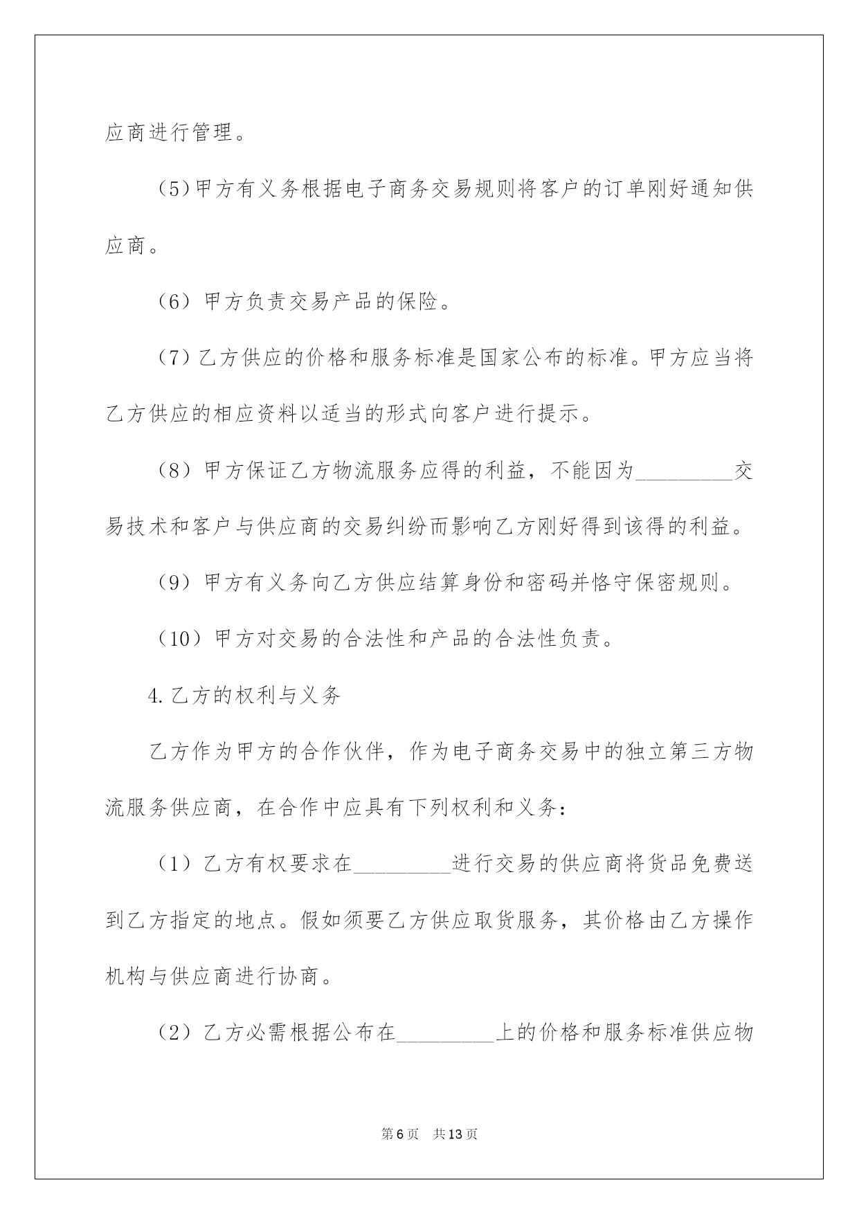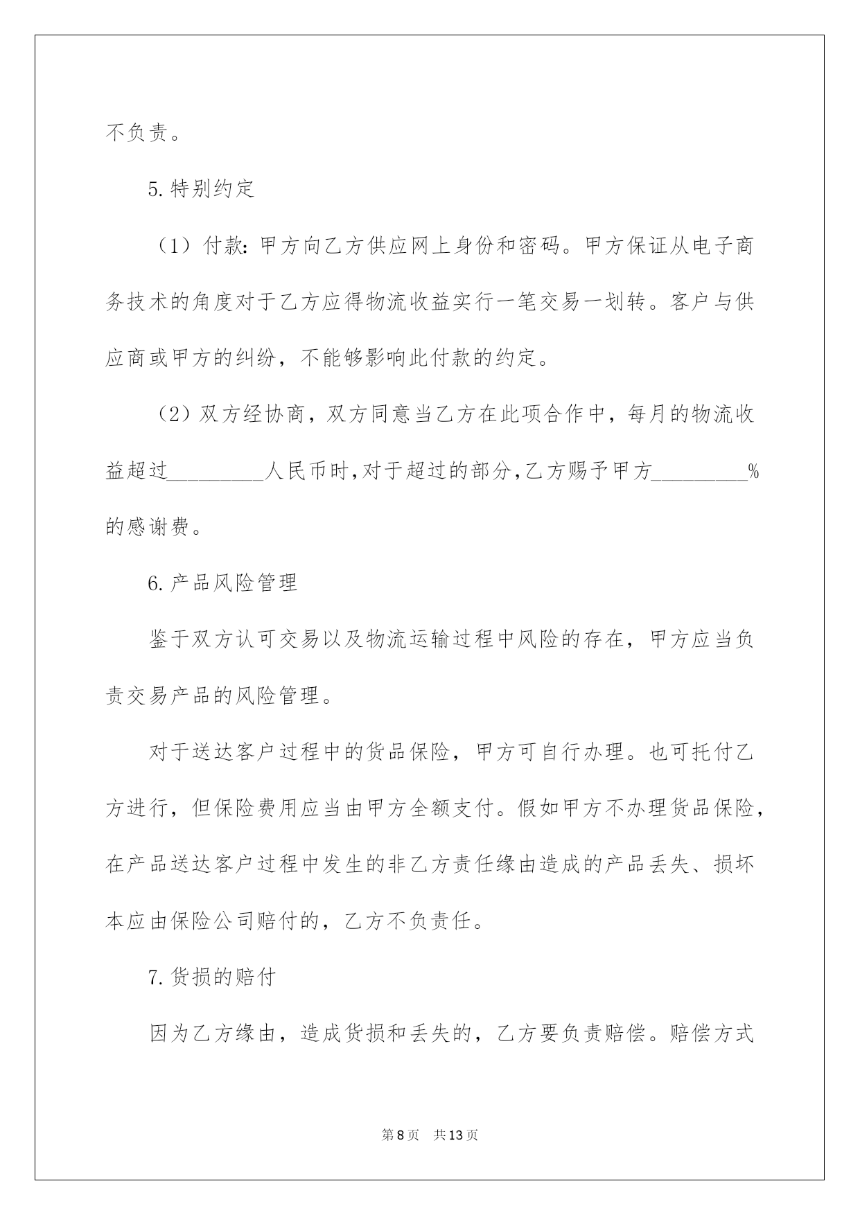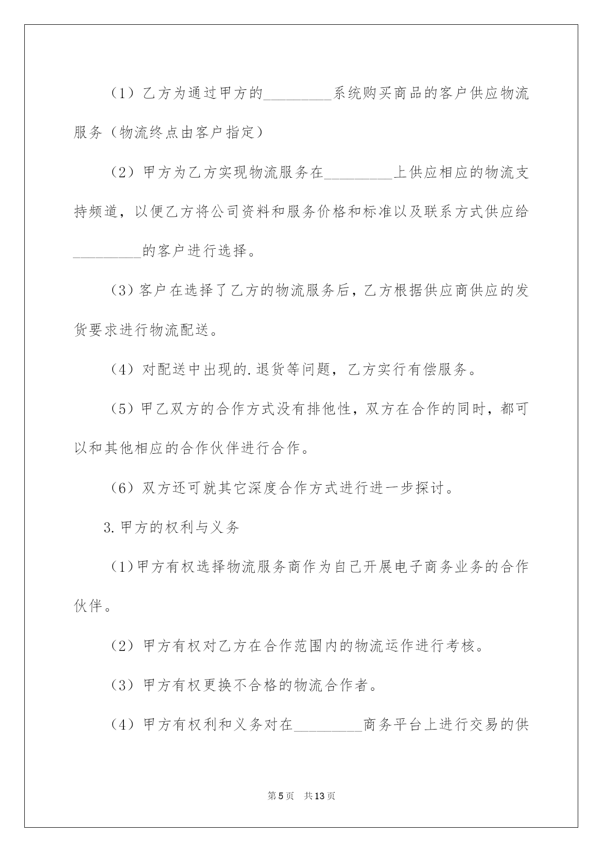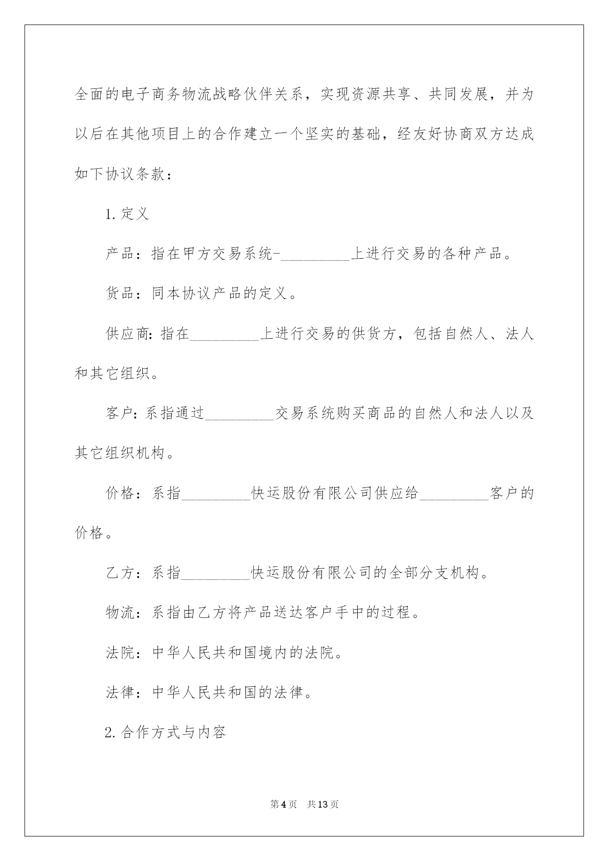 第PAGE\*Arabic\*MERGEFORMAT13页共NUMPAGES\*Arabic\*MERGEFORMAT13页第PAGE\*MERGEFORMAT13页共NUMPAGES\*MERGEFORMAT13页第PAGE\*MERGEFORMAT13页共NUMPAGES\*MERGEFORMAT13页第PAGE\*MERGEFORMAT13页共NUMPAGES\*MERGEFORMAT13页第PAGE\*MERGEFORMAT13页共NUMPAGES\*MERGEFORMAT13页第PAGE\*MERGEFORMAT13页共NUMPAGES\*MERGEFORMAT13页第PAGE\*MERGEFORMAT13页共NUMPAGES\*MERGEFORMAT13页第PAGE\*MERGEFORMAT13页共NUMPAGES\*MERGEFORMAT13页第PAGE\*MERGEFORMAT13页共NUMPAGES\*MERGEFORMAT13页第PAGE\*MERGEFORMAT13页共NUMPAGES\*MERGEFORMAT13页第PAGE\*MERGEFORMAT13页共NUMPAGES\*MERGEFORMAT13页2022合作物流合同合作物流合同范本随着市场经济的发展以及入世后国外领先企业的不断涌入,中国企业面临着越来越困难多变的市场环境,在市场竞争的巨大压力下,企业起先将目光转向物流,希望通过高效的物流管理来提高整个供应链运行效率。以下是合作物流合同范本,欢迎阅读。合作物流合同范本篇一物流合同甲方(即托运方)____________________________乙方(即承运方)___________________________依据甲方与乙方的共同协商,在遵循《合同法》的基础上,就甲方将发往全国各地的货品交给乙方承运事项制定如下条款:一、甲方自愿将发往全国各地的货品交给乙方承运;二、甲方将货品交给乙方承运时,须供应货品运输途中所须要的全部合法手续,以及规范、平安的货品包装,并不得将国家违禁物品(含各种易燃易爆物品)夹带货品中,否则由此造成全部损失由甲方担当;三、甲方将货品交给乙方承运时,须按货品实际价值自行购买保险,或由乙方代为办理购买保险,否则由此产生货损、货丢,乙方不担当全部责任;四、假如货品在运输过程中出现包装损坏、货品损失等状况必需经收货人、送货司机(或者到达货站经手人)共同签字出具书面证明,必要时由收货人扣押送货车辆或扣除到货应收运费等;如未有签字证明,则乙方可拒绝赔偿;五、假如出现货品平安刚好到达甲方指定地点而未能收取运费等应收费用,乙方可视情形扣押货品并达到一个月期限后自行处理;六、货品从承运之日起有效查询日期和索赔期在四十五日内,过期乙方可不担当任何责任;七、货品承运价格以及到货时间可由甲方与乙方依据实际状况加以协商确定,详细数量、金额、送货事宜等以每次乙方提货后所签的由乙方供应的《货品托运单》为准,并以此作为查询、索赔、结算等实际操作的依据;八、补充条款:________________________________________九、本合同书一式两份,甲方乙方各执一份;十、如有出现合同纠纷,在协商解决的基础上按《合同法》处理;十一、本合同自签订之日起即时生效。甲方法人代表:______________甲方单位公章:______________乙方法人代表:______________乙方单位公章:______________________年_______月_______日合作物流合同范本篇二_________有限公司(甲方)是一家位于中国_________的内资企业,是一家特地供应网上交易平台的电子商务公司。_________快运股份有限公司(乙方)经营地在中国,从事中国国内包袱和小件货品快递业务和综合物流服务。甲方已经同意由乙方为其网上交易供应物流配送服务来满意其客户的需求。为了满意上述物流需求,双方同意签订一份物流战略合作协议。因此,甲乙双方本着同等互利、优势互补的原则,就结成长期、全面的电子商务物流战略伙伴关系,实现资源共享、共同发展,并为以后在其他项目上的合作建立一个坚实的基础,经友好协商双方达成如下协议条款:1.定义产品:指在甲方交易系统-_________上进行交易的各种产品。货品:同本协议产品的定义。供应商:指在_________上进行交易的供货方,包括自然人、法人和其它组织。客户:系指通过_________交易系统购买商品的自然人和法人以及其它组织机构。价格:系指_________快运股份有限公司供应给_____
