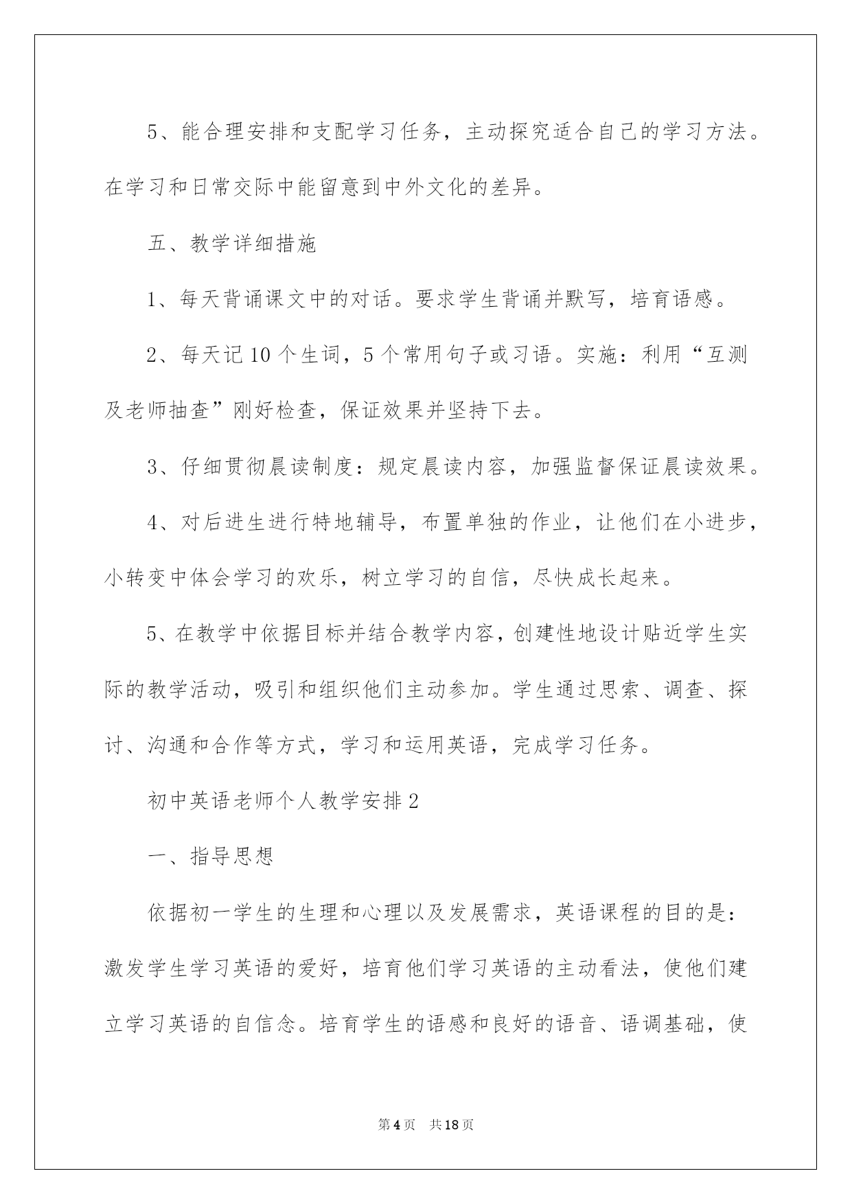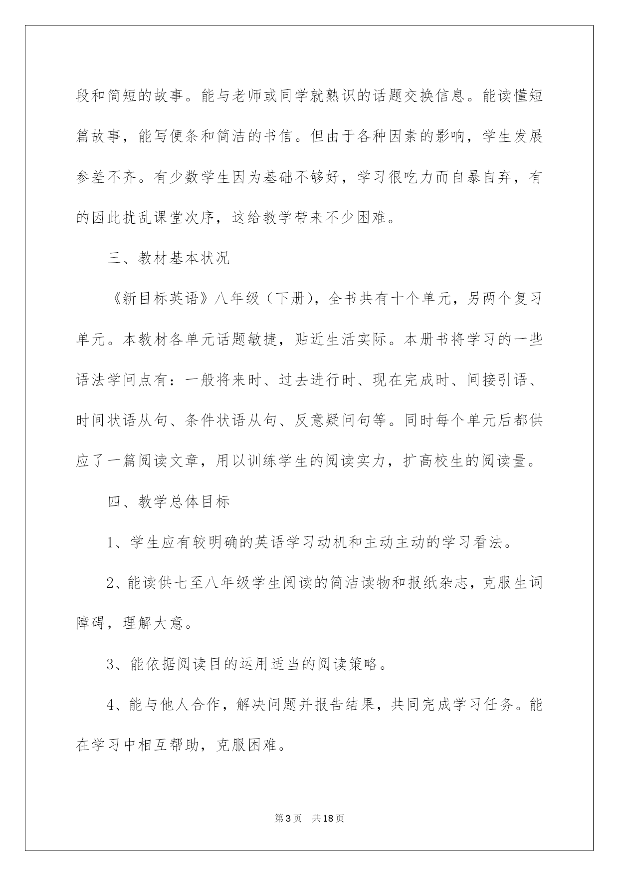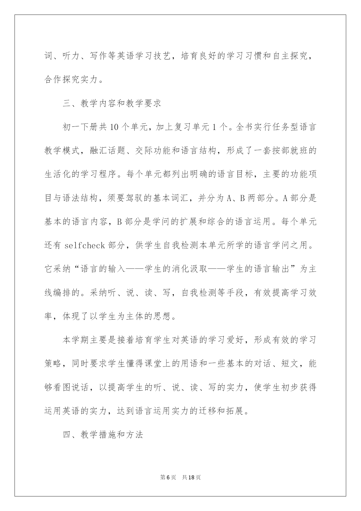 第PAGE\*Arabic\*MERGEFORMAT18页共NUMPAGES\*Arabic\*MERGEFORMAT18页第PAGE\*MERGEFORMAT18页共NUMPAGES\*MERGEFORMAT18页第PAGE\*MERGEFORMAT18页共NUMPAGES\*MERGEFORMAT18页第PAGE\*MERGEFORMAT18页共NUMPAGES\*MERGEFORMAT18页第PAGE\*MERGEFORMAT18页共NUMPAGES\*MERGEFORMAT18页第PAGE\*MERGEFORMAT18页共NUMPAGES\*MERGEFORMAT18页第PAGE\*MERGEFORMAT18页共NUMPAGES\*MERGEFORMAT18页第PAGE\*MERGEFORMAT18页共NUMPAGES\*MERGEFORMAT18页第PAGE\*MERGEFORMAT18页共NUMPAGES\*MERGEFORMAT18页第PAGE\*MERGEFORMAT18页共NUMPAGES\*MERGEFORMAT18页第PAGE\*MERGEFORMAT18页共NUMPAGES\*MERGEFORMAT18页2022初中英语教师个人教学计划2022初中英语老师个人教学安排范文(精选4篇)人生天地之间,若白驹过隙,突然而已,我们的教学工作又迈入新的阶段,是时候写一份具体的教学安排了。那么一份同事都拍手赞扬的教学安排是什么样的呢?以下是我为大家整理的2022初中英语老师个人教学安排范文,希望能够帮助到大家。初中英语老师个人教学安排1八年级的学生对英语学习爱好整体有所下降,简单出现两极分化。在我八(4)班男女生比例相当,要充公的调动中等生和后进生的学习爱好,才能总体提高学生的素养。所以本学期应留意抓好中等生和后进生的学习,尤其本学期,千万不能松手后进生。课堂是面对全体学生,以学生的发展为宗旨,把激发学生的学习爱好放在首位,留意分层次教学,引导学生端正学习看法,驾驭良好的学习方法,培育学生良好的学习习惯。一、本期指导思想在本学期的英语教学中,我将坚持以下理念的应用:1、面对全体学生,关注每个学生的情感,激发他们学习英语的爱好,帮助他们建立学习的成就感和自信念培育创新精神;2、整体设计目标,体现敏捷开放,目标设计以学生技能,语言学问,情感看法,学习策略和文化意识的发展为基础;3、突出学生主体,敬重个体差异;4、采纳活动途径,提倡体验参加,即采纳任务型的教学模式,让学生在老师的指导下通过感知、体验、实践、参加和合作等方式,实现任务的目标,感受胜利;5、注意过程评价,促进学生发展,建立能激励学生学习爱好和自主学习实力发展的评价体系。二、学生状况简要在上学期期末考试中,我任教八年级二个教学班中,初二12班平均分名列年级其次,优生率其次,及格率第十;初二11班,平均分列第六,优秀率第三,及格率第七名。初二12班整体状况较好,有2名满分,但是不及格的人数比较多;11班也是低分率较高,导致平均分没出名列前茅,但是优秀率很高,而且有1位同学满分。通过一年半的英语学习,大多数学生已能听懂有关熟识话题的语段和简短的故事。能与老师或同学就熟识的话题交换信息。能读懂短篇故事,能写便条和简洁的书信。但由于各种因素的影响,学生发展参差不齐。有少数学生因为基础不够好,学习很吃力而自暴自弃,有的因此扰乱课堂次序,这给教学带来不少困难。三、教材基本状况《新目标英语》八年级(下册),全书共有十个单元,另两个复习单元。本教材各单元话题敏捷,贴近生活实际。本册书将学习的一些语法学问点有:一般将来时、过去进行时、现在完成时、间接引语、时间状语从句、条件状语从句、反意疑问句等。同时每个单元后都供应了一篇阅读文章,用以训练学生的阅读实力,扩高校生的阅读量。四、教学总体目标1、学生应有较明确的英语学习动机和主动主动的学习看法。2、能读供七至八年级学生阅读的简洁读物和报纸杂志,克服生词障碍,理解大意。3、能依据阅读目的运用适当的阅读策略。4、能与他人合作,解决问题并报告结果,共同完成学习任务。能在学习中相互帮助,克服困难。5、能合理安排和支配学习任务,主动探究适合自己的学习方法。在学习和日常交际中能留意到中外文化的差异。五、教学详细措施1、每天背诵课文中的对话。要求学生背诵并默写,培育语感。2、每天记10个生词,5个常用句子或习语。实施:利用“互测及老师抽查”刚好检查,保证效果并坚持下去。3、仔细贯彻晨读制度:规定晨读内容,加强监督保证晨读效果。4、对后进生进行特地辅导,布置单独的作业,让他们在小进步,小转变
