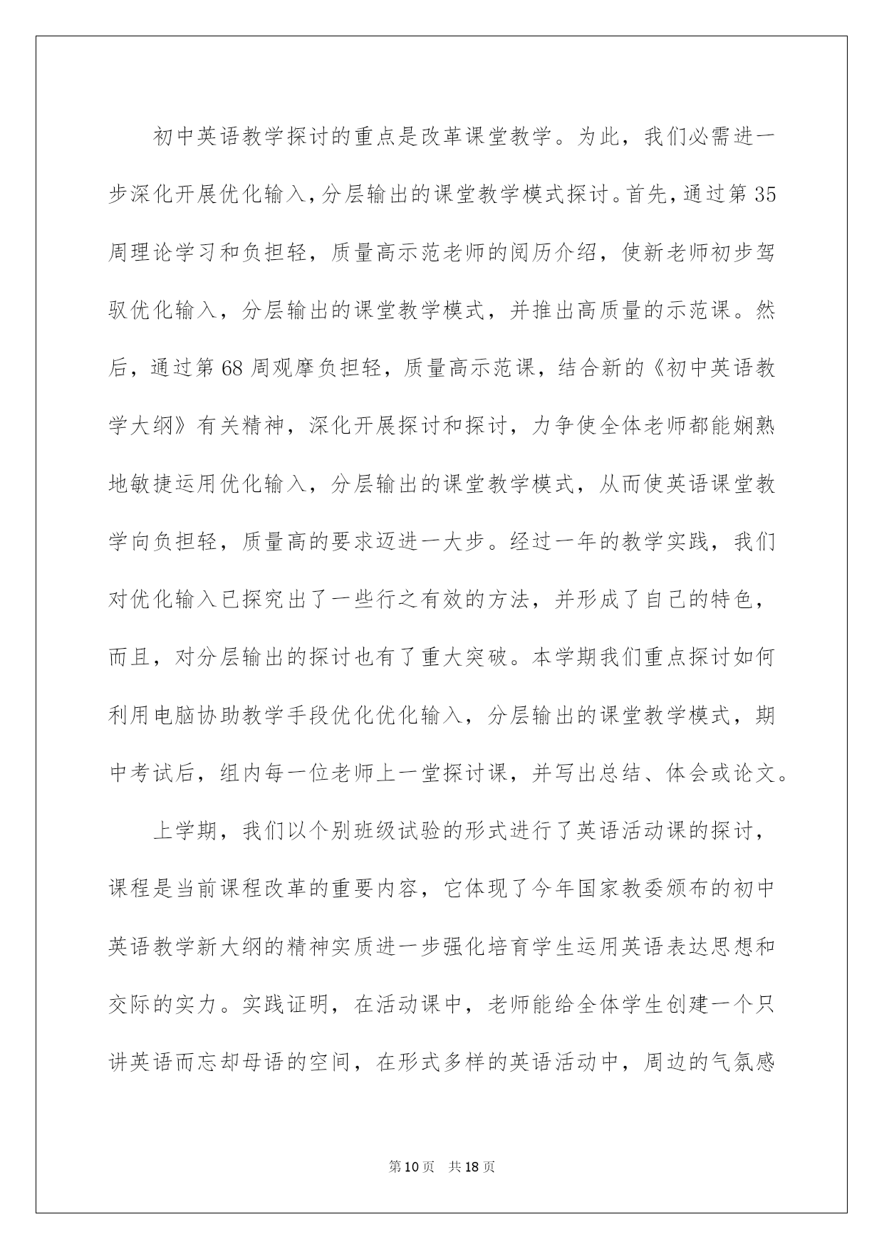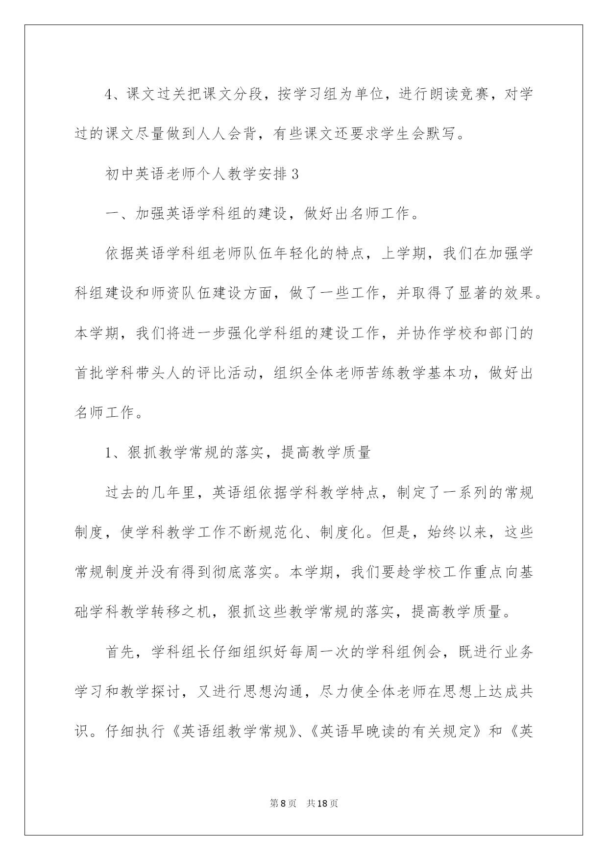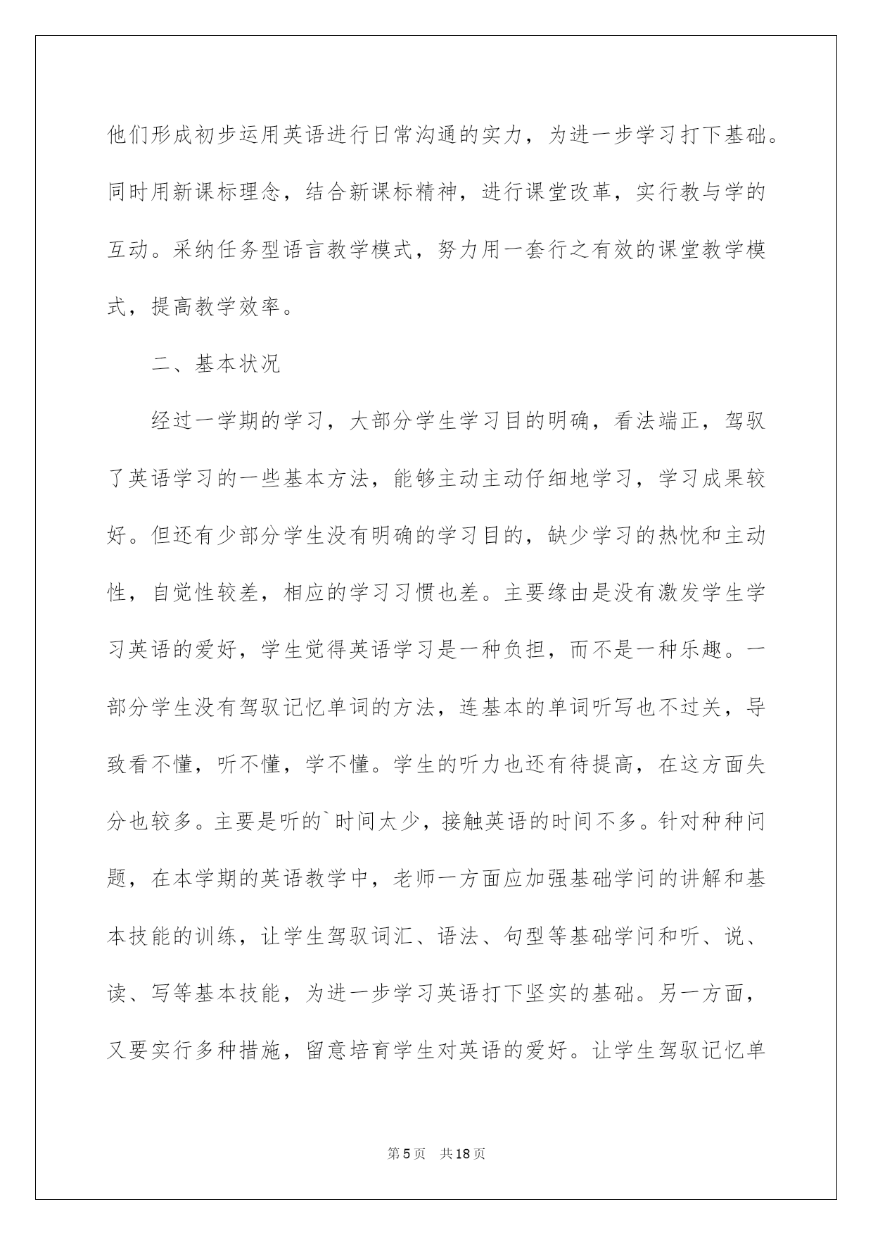 第PAGE\*Arabic\*MERGEFORMAT18页共NUMPAGES\*Arabic\*MERGEFORMAT18页第PAGE\*MERGEFORMAT18页共NUMPAGES\*MERGEFORMAT18页第PAGE\*MERGEFORMAT18页共NUMPAGES\*MERGEFORMAT18页第PAGE\*MERGEFORMAT18页共NUMPAGES\*MERGEFORMAT18页第PAGE\*MERGEFORMAT18页共NUMPAGES\*MERGEFORMAT18页第PAGE\*MERGEFORMAT18页共NUMPAGES\*MERGEFORMAT18页第PAGE\*MERGEFORMAT18页共NUMPAGES\*MERGEFORMAT18页第PAGE\*MERGEFORMAT18页共NUMPAGES\*MERGEFORMAT18页第PAGE\*MERGEFORMAT18页共NUMPAGES\*MERGEFORMAT18页第PAGE\*MERGEFORMAT18页共NUMPAGES\*MERGEFORMAT18页第PAGE\*MERGEFORMAT18页共NUMPAGES\*MERGEFORMAT18页2022初中英语教师个人教学计划2022初中英语老师个人教学安排范文(精选4篇)人生天地之间,若白驹过隙,突然而已,我们的教学工作又迈入新的阶段,是时候写一份具体的教学安排了。那么一份同事都拍手赞扬的教学安排是什么样的呢?以下是我为大家整理的2022初中英语老师个人教学安排范文,希望能够帮助到大家。初中英语老师个人教学安排1八年级的学生对英语学习爱好整体有所下降,简单出现两极分化。在我八(4)班男女生比例相当,要充公的调动中等生和后进生的学习爱好,才能总体提高学生的素养。所以本学期应留意抓好中等生和后进生的学习,尤其本学期,千万不能松手后进生。课堂是面对全体学生,以学生的发展为宗旨,把激发学生的学习爱好放在首位,留意分层次教学,引导学生端正学习看法,驾驭良好的学习方法,培育学生良好的学习习惯。一、本期指导思想在本学期的英语教学中,我将坚持以下理念的应用:1、面对全体学生,关注每个学生的情感,激发他们学习英语的爱好,帮助他们建立学习的成就感和自信念培育创新精神;2、整体设计目标,体现敏捷开放,目标设计以学生技能,语言学问,情感看法,学习策略和文化意识的发展为基础;3、突出学生主体,敬重个体差异;4、采纳活动途径,提倡体验参加,即采纳任务型的教学模式,让学生在老师的指导下通过感知、体验、实践、参加和合作等方式,实现任务的目标,感受胜利;5、注意过程评价,促进学生发展,建立能激励学生学习爱好和自主学习实力发展的评价体系。二、学生状况简要在上学期期末考试中,我任教八年级二个教学班中,初二12班平均分名列年级其次,优生率其次,及格率第十;初二11班,平均分列第六,优秀率第三,及格率第七名。初二12班整体状况较好,有2名满分,但是不及格的人数比较多;11班也是低分率较高,导致平均分没出名列前茅,但是优秀率很高,而且有1位同学满分。通过一年半的英语学习,大多数学生已能听懂有关熟识话题的语段和简短的故事。能与老师或同学就熟识的话题交换信息。能读懂短篇故事,能写便条和简洁的书信。但由于各种因素的影响,学生发展参差不齐。有少数学生因为基础不够好,学习很吃力而自暴自弃,有的因此扰乱课堂次序,这给教学带来不少困难。三、教材基本状况《新目标英语》八年级(下册),全书共有十个单元,另两个复习单元。本教材各单元话题敏捷,贴近生活实际。本册书将学习的一些语法学问点有:一般将来时、过去进行时、现在完成时、间接引语、时间状语从句、条件状语从句、反意疑问句等。同时每个单元后都供应了一篇阅读文章,用以训练学生的阅读实力,扩高校生的阅读量。四、教学总体目标1、学生应有较明确的英语学习动机和主动主动的学习看法。2、能读供七至八年级学生阅读的简洁读物和报纸杂志,克服生词障碍,理解大意。3、能依据阅读目的运用适当的阅读策略。4、能与他人合作,解决问题并报告结果,共同完成学习任务。能在学习中相互帮助,克服困难。5、能合理安排和支配学习任务,主动探究适合自己的学习方法。在学习和日常交际中能留意到中外文化的差异。五、教学详细措施1、每天背诵课文中的对话。要求学生背诵并默写,培育语感。2、每天记10个生词,5个常用句子或习语。实施:利用“互测及老师抽查”刚好检查,保证效果并坚持下去。3、仔细贯彻晨读制度:规定晨读内容,加强监督保证晨读效果。4、对后进生进行特地辅导,布置单独的作业,让他们在小进步,小转变