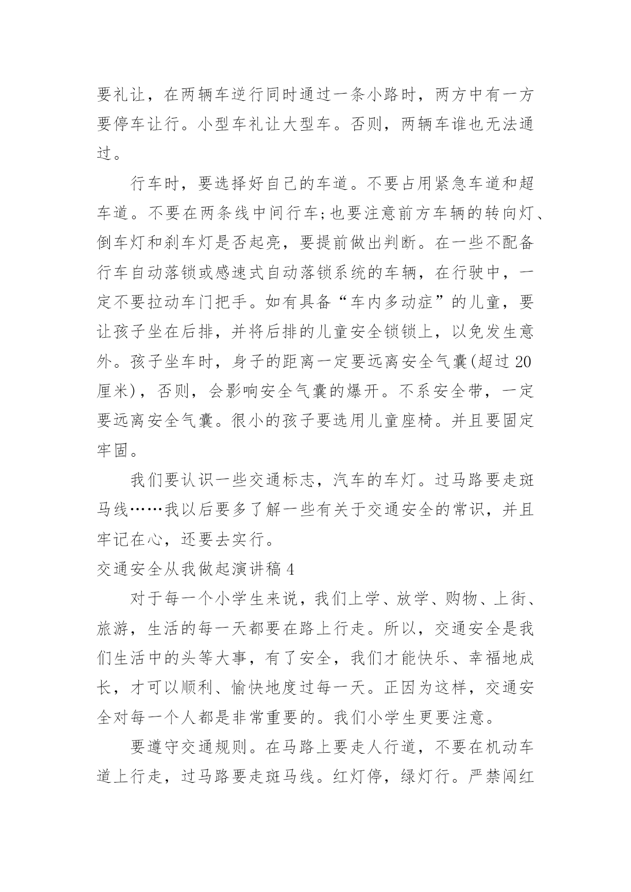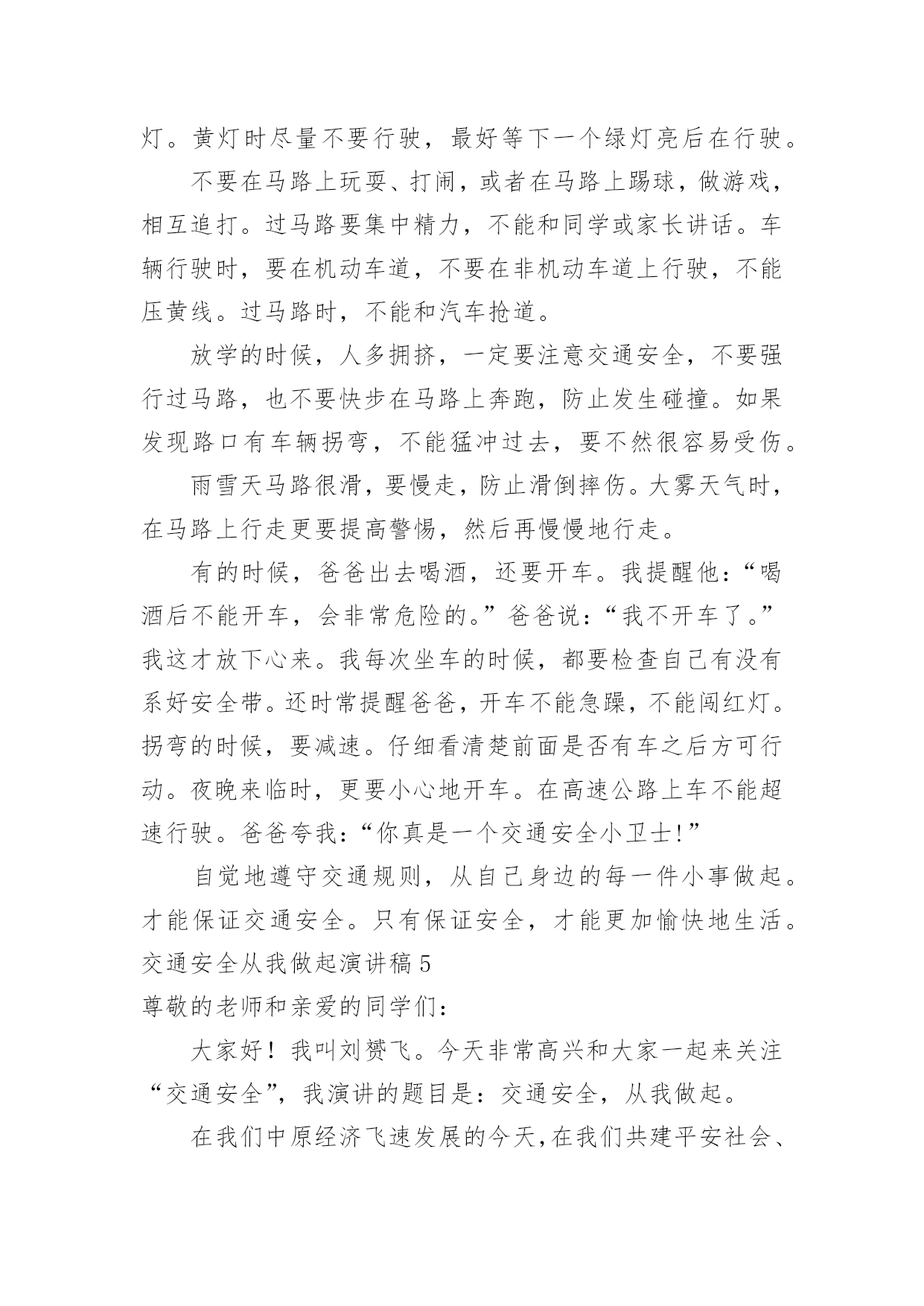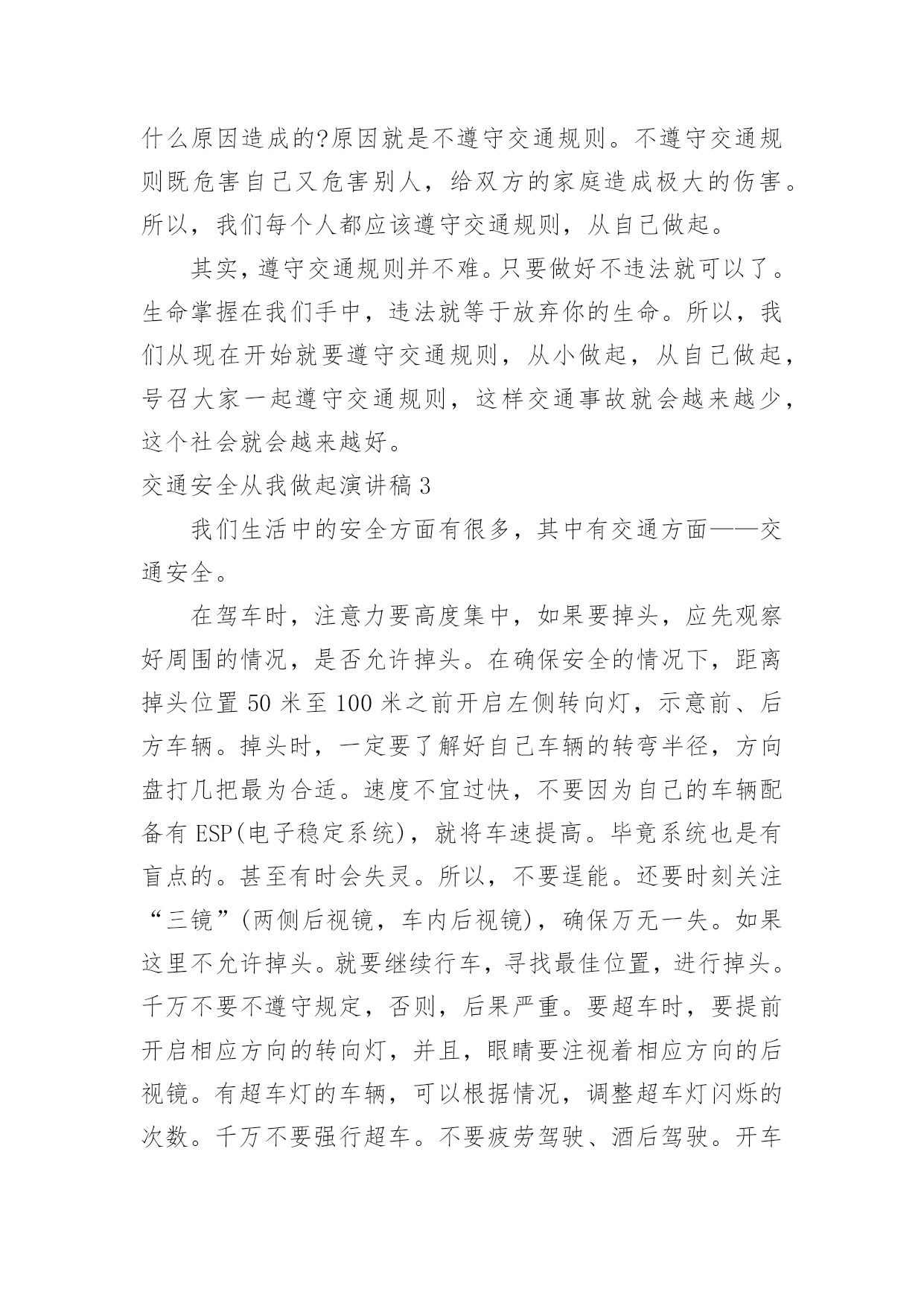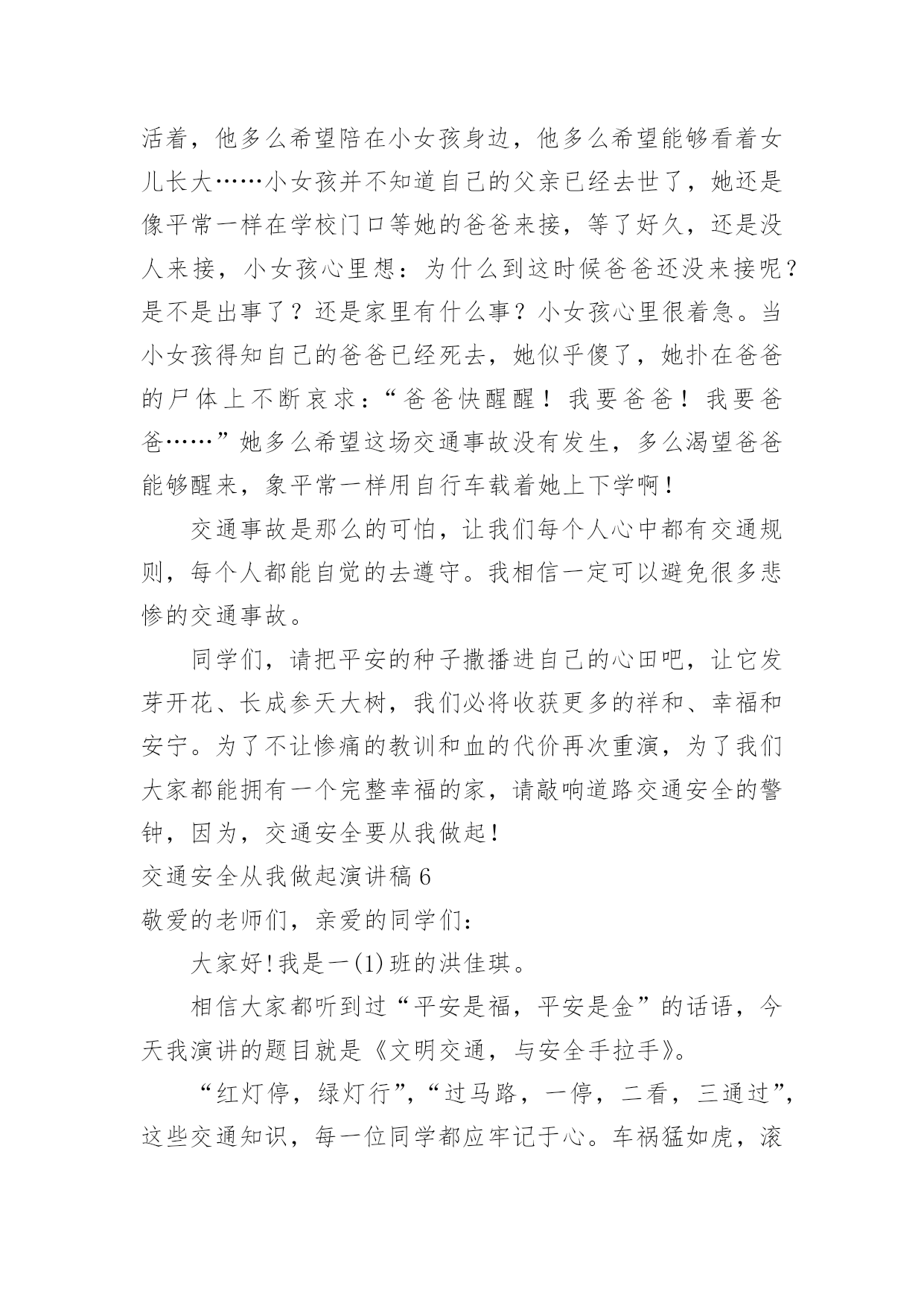 交通安全从我做起演讲稿交通安全从我做起演讲稿演讲稿特别注重结构清楚,层次简明。在社会一步步向前发展的今天,需要使用演讲稿的场合越来越多,如何写一份恰当的演讲稿呢?下面是小编收集整理的交通安全从我做起演讲稿,仅供参考,大家一起来看看吧。交通安全从我做起演讲稿1亲爱的同学们:大家好!朋友们,在这人海如潮、车轮滚滚的现实社会中,我们最需要的是什么?是漂亮的玩具,还是诱人的糕点?我认为我们最需要的是——平安!我们有了平安,爷爷、奶奶才能以休闲的心情漫步在夕阳下;我们有了平安,爸爸、妈妈才能在平凡的岗位上默默地奉献;我们有了平安,才能在优美的学校环境下,孜孜不倦地学习。"孩子,看着脚下的石头。"这是母亲在我蹒跚学步时的指点。"当心路上的汽车啊!"这是父亲在送我上学时身后的叮咛。"高高兴兴上学,平平安安回家",这是你、我、他交通安全的祝福。随着我国经济的飞速发展,道路宽了,车辆多了,我们在享受现代文明带来便利时,也面临着突如其来的灾祸。这就要求我们在出行时增强安全意识,提高自我保护能力,文明出行,这既是做一个文明公民的要求,更是对自己生命的呵护。每当我走在上学、放学的路上,看到"车水马龙","人头攒动"的热闹景象,看到身边飞驰而过的车辆,眼前浮现的一幕幕车毁人亡的画面,让我感到害怕。生命是何等的美好,又有谁不渴望自己拥有一次充满精彩、像花儿一样怒放的生命呢?可是随着道路的日益加宽、车辆的日益增多,美丽的生命也无奈地越发显得脆弱。我们痛楚地看到"交通事故"这个杀手给个人、给家庭、给企业、给社会带来的困扰和伤害。近百余年来,全世界死于车祸的人数已经达到4000多万人,而且每年仍在以超过40万人的速度在递增。中外城市交通事故分析表明,中国道路交通死亡人数居世界第一,每年死于交通事故的人数超过10万人!10万啊!这是一个多么冰冷无情的数字,平均每五分钟就有一个人丧身车轮,平均每一分钟就有一个人因交通事故而伤残!珍贵的生命属于我们每个人只有一次,而灾难的发生却是那样的无情:不论贫富贵贱,不论性别年龄;不论幼小纤弱,不论力壮身强——滚滚的车轮不知碾碎了多少人美丽的梦想,多少幸福的家庭由此而支离破碎!文明是安全的前提,安全是生命的保障。让我们从现在做起,树立自我防范的安全意识,自觉遵守交通规则。把交通法规铭记于心,把"关爱生命,文明出行"作为头脑里最突出的八个字。别让交通事故,成为马路上一道"风景线"。记住:只有珍爱生命,才能拥抱幸福!交通中有你、有我、有他,有我们共同参与;交通文明需要你、需要我、需要他,需要我们共同营造。同学们,让我们积极行动起来,从我做起,从现在做起,告别交通陋习,弘扬文明新风,共同营造和维护安全、畅通、有序的文明交通环境,让交通更文明、更有序,让生活更和谐、更美好!谢谢大家!交通安全从我做起演讲稿2交通安全非常重要,我们时刻都要记住它。健全的身体是做一切事情的根本,所以遵守交通安全,要从自己开始。我先讲讲交通信号灯的知识吧。红灯是表示车辆或行人停下的,绿灯是表示车辆或行人通行的,黄灯是表示车辆或行人等一等的`。还有,开车人不能酒后驾车,酒后驾车会导致非常严重的后果。车辆也不能超速、超载。你们知道什么是超载吗?超载就是本来这辆车能拉1吨的货,结果拉了2吨货,这就叫超载。你们知道什么是超速吗?超速是本来这里规定车速不能超过60脉,结果它的车速是75脉,这就叫超速。行人要走斑马线,自行车在非机动车道上行驶,这些基本的交通常识我们要牢固的掌握。妈妈给我讲了一个关于交通安全事故的小故事。就是一辆小轿车遇到红灯后停在路口,后面来了一辆轿车,可能是超速,也可能是酒后驾车,反正它的就是速度很快,一下子把前面那辆小轿车给撞飞了。前面那辆小轿车上的三个人只救活了一个人。这是一个真实的交通安全事故的.。这样的故事很多很多,或许每天都在发生着。一张张事故图片触目惊心,一个个失去亲人的家庭悲痛交加,让我们大家反思,什么原因造成的?原因就是不遵守交通规则。不遵守交通规则既危害自己又危害别人,给双方的家庭造成极大的伤害。所以,我们每个人都应该遵守交通规则,从自己做起。其实,遵守交通规则并不难。只要做好不违法就可以了。生命掌握在我们手中,违法就等于放弃你的生命。所以,我们从现在开始就要遵守交通规则,从小做起,从自己做起,号召大家一起遵守交通规则,这样交通事故就会越来越少,这个社会就会越来越好。交通安全从我做起演讲稿3我们生活中的安全方面有很多,其中有交通方面——交通安全。在驾车时,注意力要高度集中,如果要掉头,应先观察好周围的情况,是否允许掉头。在确保安全的情况下,距离掉头位置50米至100米之前开启左侧转向灯,示意前、后方车辆。掉头时,一定要了解好自己车辆的转弯半径,方向盘打几把最为合适。速度不宜过快,不要因为自己的车辆配备有ESP(电子稳定系统),就将