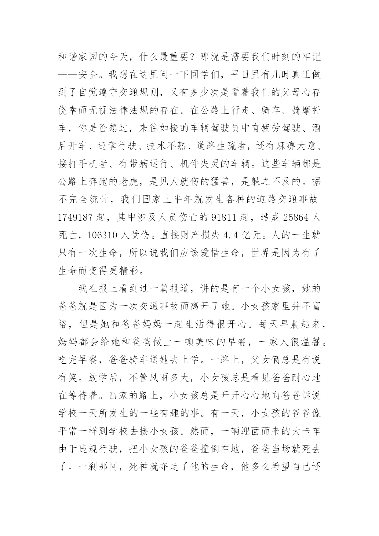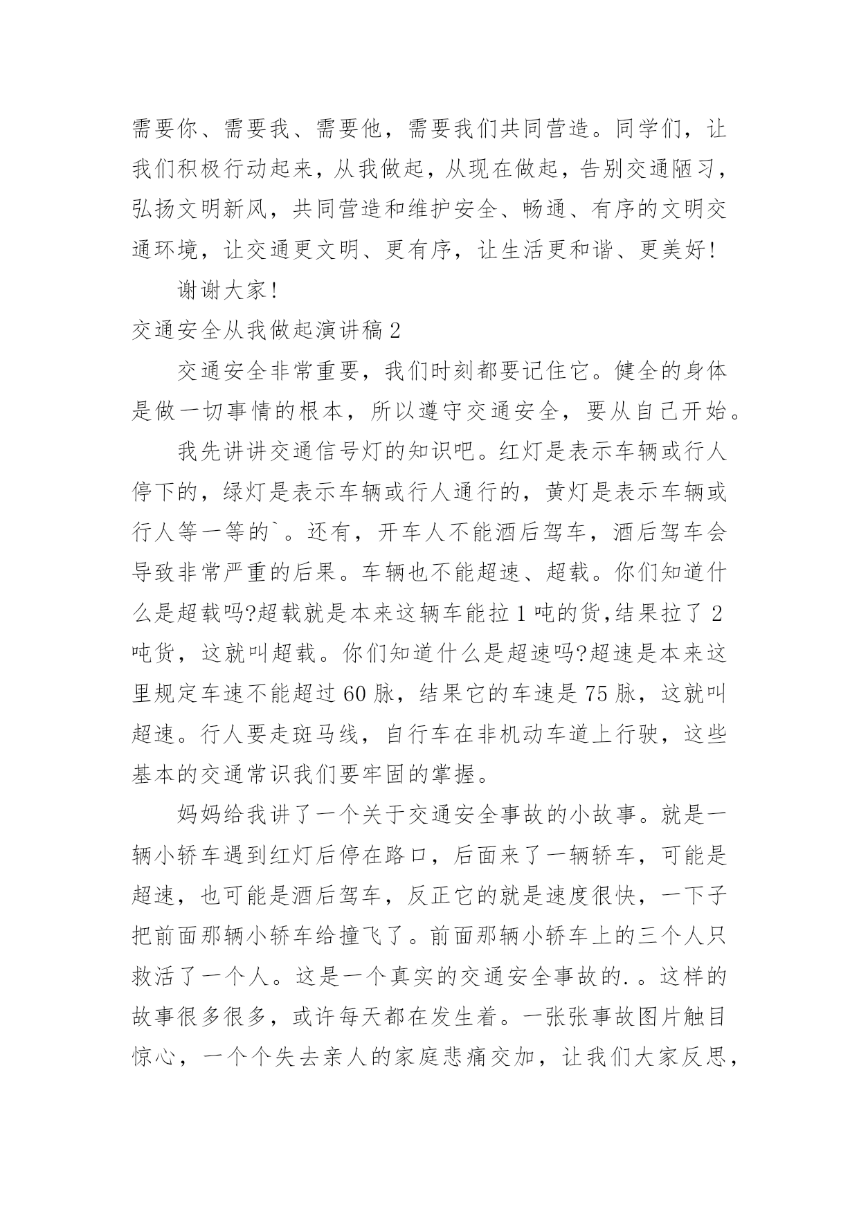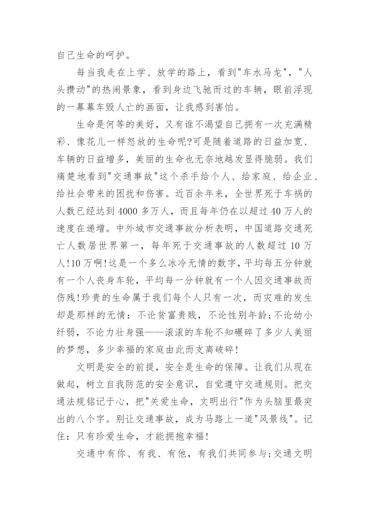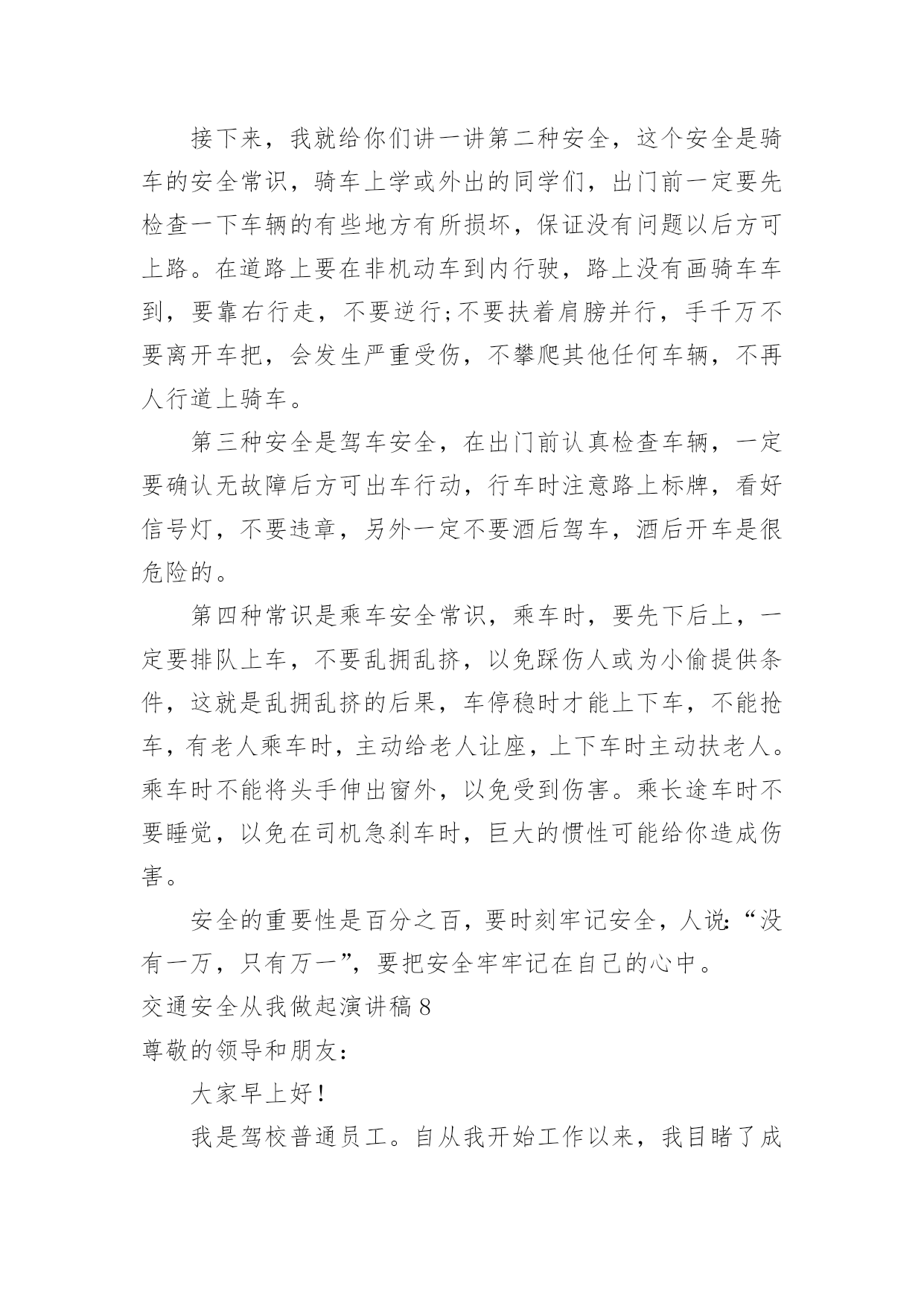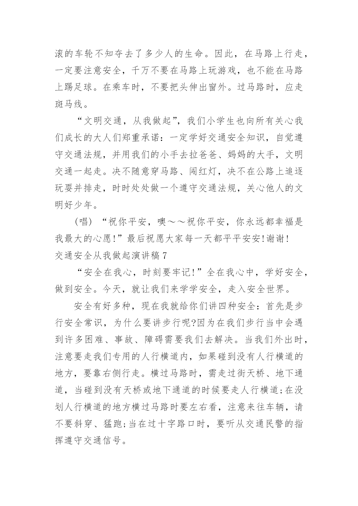 交通安全从我做起演讲稿交通安全从我做起演讲稿演讲稿特别注重结构清楚,层次简明。在社会一步步向前发展的今天,需要使用演讲稿的场合越来越多,如何写一份恰当的演讲稿呢?下面是小编收集整理的交通安全从我做起演讲稿,仅供参考,大家一起来看看吧。交通安全从我做起演讲稿1亲爱的同学们:大家好!朋友们,在这人海如潮、车轮滚滚的现实社会中,我们最需要的是什么?是漂亮的玩具,还是诱人的糕点?我认为我们最需要的是——平安!我们有了平安,爷爷、奶奶才能以休闲的心情漫步在夕阳下;我们有了平安,爸爸、妈妈才能在平凡的岗位上默默地奉献;我们有了平安,才能在优美的学校环境下,孜孜不倦地学习。"孩子,看着脚下的石头。"这是母亲在我蹒跚学步时的指点。"当心路上的汽车啊!"这是父亲在送我上学时身后的叮咛。"高高兴兴上学,平平安安回家",这是你、我、他交通安全的祝福。随着我国经济的飞速发展,道路宽了,车辆多了,我们在享受现代文明带来便利时,也面临着突如其来的灾祸。这就要求我们在出行时增强安全意识,提高自我保护能力,文明出行,这既是做一个文明公民的要求,更是对自己生命的呵护。每当我走在上学、放学的路上,看到"车水马龙","人头攒动"的热闹景象,看到身边飞驰而过的车辆,眼前浮现的一幕幕车毁人亡的画面,让我感到害怕。生命是何等的美好,又有谁不渴望自己拥有一次充满精彩、像花儿一样怒放的生命呢?可是随着道路的日益加宽、车辆的日益增多,美丽的生命也无奈地越发显得脆弱。我们痛楚地看到"交通事故"这个杀手给个人、给家庭、给企业、给社会带来的困扰和伤害。近百余年来,全世界死于车祸的人数已经达到4000多万人,而且每年仍在以超过40万人的速度在递增。中外城市交通事故分析表明,中国道路交通死亡人数居世界第一,每年死于交通事故的人数超过10万人!10万啊!这是一个多么冰冷无情的数字,平均每五分钟就有一个人丧身车轮,平均每一分钟就有一个人因交通事故而伤残!珍贵的生命属于我们每个人只有一次,而灾难的发生却是那样的无情:不论贫富贵贱,不论性别年龄;不论幼小纤弱,不论力壮身强——滚滚的车轮不知碾碎了多少人美丽的梦想,多少幸福的家庭由此而支离破碎!文明是安全的前提,安全是生命的保障。让我们从现在做起,树立自我防范的安全意识,自觉遵守交通规则。把交通法规铭记于心,把"关爱生命,文明出行"作为头脑里最突出的八个字。别让交通事故,成为马路上一道"风景线"。记住:只有珍爱生命,才能拥抱幸福!交通中有你、有我、有他,有我们共同参与;交通文明需要你、需要我、需要他,需要我们共同营造。同学们,让我们积极行动起来,从我做起,从现在做起,告别交通陋习,弘扬文明新风,共同营造和维护安全、畅通、有序的文明交通环境,让交通更文明、更有序,让生活更和谐、更美好!谢谢大家!交通安全从我做起演讲稿2交通安全非常重要,我们时刻都要记住它。健全的身体是做一切事情的根本,所以遵守交通安全,要从自己开始。我先讲讲交通信号灯的知识吧。红灯是表示车辆或行人停下的,绿灯是表示车辆或行人通行的,黄灯是表示车辆或行人等一等的`。还有,开车人不能酒后驾车,酒后驾车会导致非常严重的后果。车辆也不能超速、超载。你们知道什么是超载吗?超载就是本来这辆车能拉1吨的货,结果拉了2吨货,这就叫超载。你们知道什么是超速吗?超速是本来这里规定车速不能超过60脉,结果它的车速是75脉,这就叫超速。行人要走斑马线,自行车在非机动车道上行驶,这些基本的交通常识我们要牢固的掌握。妈妈给我讲了一个关于交通安全事故的小故事。就是一辆小轿车遇到红灯后停在路口,后面来了一辆轿车,可能是超速,也可能是酒后驾车,反正它的就是速度很快,一下子把前面那辆小轿车给撞飞了。前面那辆小轿车上的三个人只救活了一个人。这是一个真实的交通安全事故的.。这样的故事很多很多,或许每天都在发生着。一张张事故图片触目惊心,一个个失去亲人的家庭悲痛交加,让我们大家反思,什么原因造成的?原因就是不遵守交通规则。不遵守交通规则既危害自己又危害别人,给双方的家庭造成极大的伤害。所以,我们每个人都应该遵守交通规则,从自己做起。其实,遵守交通规则并不难。只要做好不违法就可以了。生命掌握在我们手中,违法就等于放弃你的生命。所以,我们从现在开始就要遵守交通规则,从小做起,从自己做起,号召大家一起遵守交通规则,这样交通事故就会越来越少,这个社会就会越来越好。交通安全从我做起演讲稿3我们生活中的安全方面有很多,其中有交通方面——交通安全。在驾车时,注意力要高度集中,如果要掉头,应先观察好周围的情况,是否允许掉头。在确保安全的情况下,距离掉头位置50米至100米之前开启左侧转向灯,示意前、后方车辆。掉头时,一定要了解好自己车辆的转弯半径,方向盘打几把最为合适。速度不宜过快,不要因为自己的车辆配备有ESP(电子稳定系统),就将