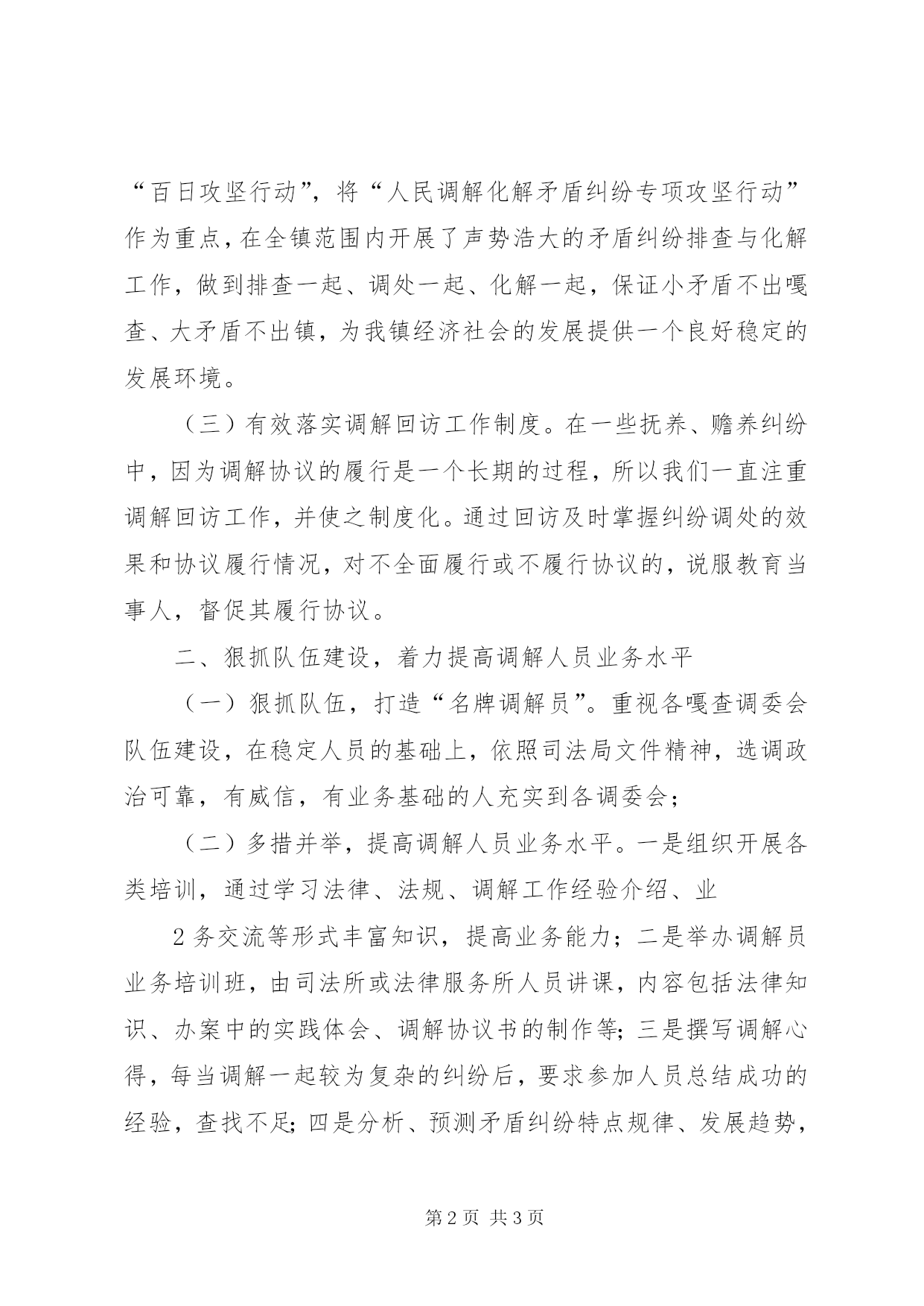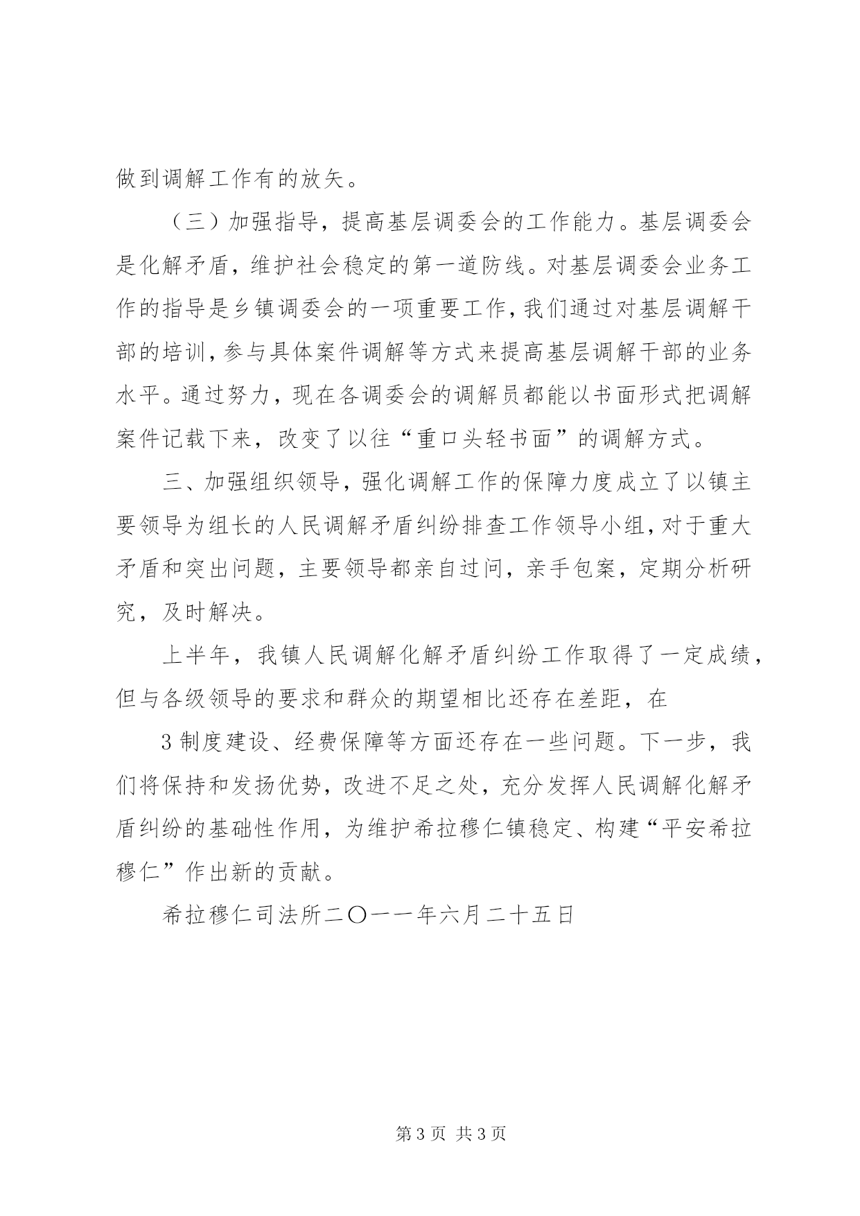 第PAGE\*Arabic\*MERGEFORMAT3页共NUMPAGES\*MERGEFORMAT3页司法、人民调解半年工作总结希拉穆仁司法所2011年上半年人民调解工作总结2011年上半年,人民调解工作在司法局的领导下和旗综治办的正确指导下,我镇人民调解工作形成了以完善制度,提升队伍工作能力为主要内容的做法,取得了一定成效。一、以规范化建设为抓手,促进人民调解工作向纵深发展(一)坚持重大矛盾主动介入调处制度。发生重大矛盾纠纷时,各级调委会都能够在获悉情况后的第一时间组织人员赶赴现场,控制事态扩大,并主动介入纠纷的调处,直至纠纷妥善解决。(二)完善矛盾纠纷排查调处制度。重大疑难纠纷都有一个由小到大的发展过程,密切掌握矛盾的发展动向是调解工作顺利开展的前提,上半年司法所不断完善矛盾纠纷排查制度,每月开展常规排查,在“元旦”、“春节”、“五一”等重大节日前开展定期排查,在“两会”等重要会议等敏感时期进行专项排查,做到定期排查与专门排查相结合。从镇区、嘎查、各旅游接待点扩展到各工矿企业,实现了排查范围的全覆盖。在各嘎查调委会中建立矛盾纠纷情况书面通报1制度,月底各调委会将掌握的矛盾情况向司法所报送。由于排查制度的不断完善,使我们的调解工作掌握了主动,能够在最佳时机介入矛盾纠纷的调处。今年,我镇结合旗综治办开展的“百日攻坚行动”,将“人民调解化解矛盾纠纷专项攻坚行动”作为重点,在全镇范围内开展了声势浩大的矛盾纠纷排查与化解工作,做到排查一起、调处一起、化解一起,保证小矛盾不出嘎查、大矛盾不出镇,为我镇经济社会的发展提供一个良好稳定的发展环境。(三)有效落实调解回访工作制度。在一些抚养、赡养纠纷中,因为调解协议的履行是一个长期的过程,所以我们一直注重调解回访工作,并使之制度化。通过回访及时掌握纠纷调处的效果和协议履行情况,对不全面履行或不履行协议的,说服教育当事人,督促其履行协议。二、狠抓队伍建设,着力提高调解人员业务水平(一)狠抓队伍,打造“名牌调解员”。重视各嘎查调委会队伍建设,在稳定人员的基础上,依照司法局文件精神,选调政治可靠,有威信,有业务基础的人充实到各调委会;(二)多措并举,提高调解人员业务水平。一是组织开展各类培训,通过学习法律、法规、调解工作经验介绍、业2务交流等形式丰富知识,提高业务能力;二是举办调解员业务培训班,由司法所或法律服务所人员讲课,内容包括法律知识、办案中的实践体会、调解协议书的制作等;三是撰写调解心得,每当调解一起较为复杂的纠纷后,要求参加人员总结成功的经验,查找不足;四是分析、预测矛盾纠纷特点规律、发展趋势,做到调解工作有的放矢。(三)加强指导,提高基层调委会的工作能力。基层调委会是化解矛盾,维护社会稳定的第一道防线。对基层调委会业务工作的指导是乡镇调委会的一项重要工作,我们通过对基层调解干部的培训,参与具体案件调解等方式来提高基层调解干部的业务水平。通过努力,现在各调委会的调解员都能以书面形式把调解案件记载下来,改变了以往“重口头轻书面”的调解方式。三、加强组织领导,强化调解工作的保障力度成立了以镇主要领导为组长的人民调解矛盾纠纷排查工作领导小组,对于重大矛盾和突出问题,主要领导都亲自过问,亲手包案,定期分析研究,及时解决。上半年,我镇人民调解化解矛盾纠纷工作取得了一定成绩,但与各级领导的要求和群众的期望相比还存在差距,在3制度建设、经费保障等方面还存在一些问题。下一步,我们将保持和发扬优势,改进不足之处,充分发挥人民调解化解矛盾纠纷的基础性作用,为维护希拉穆仁镇稳定、构建“平安希拉穆仁”作出新的贡献。希拉穆仁司法所二〇一一年六月二十五日