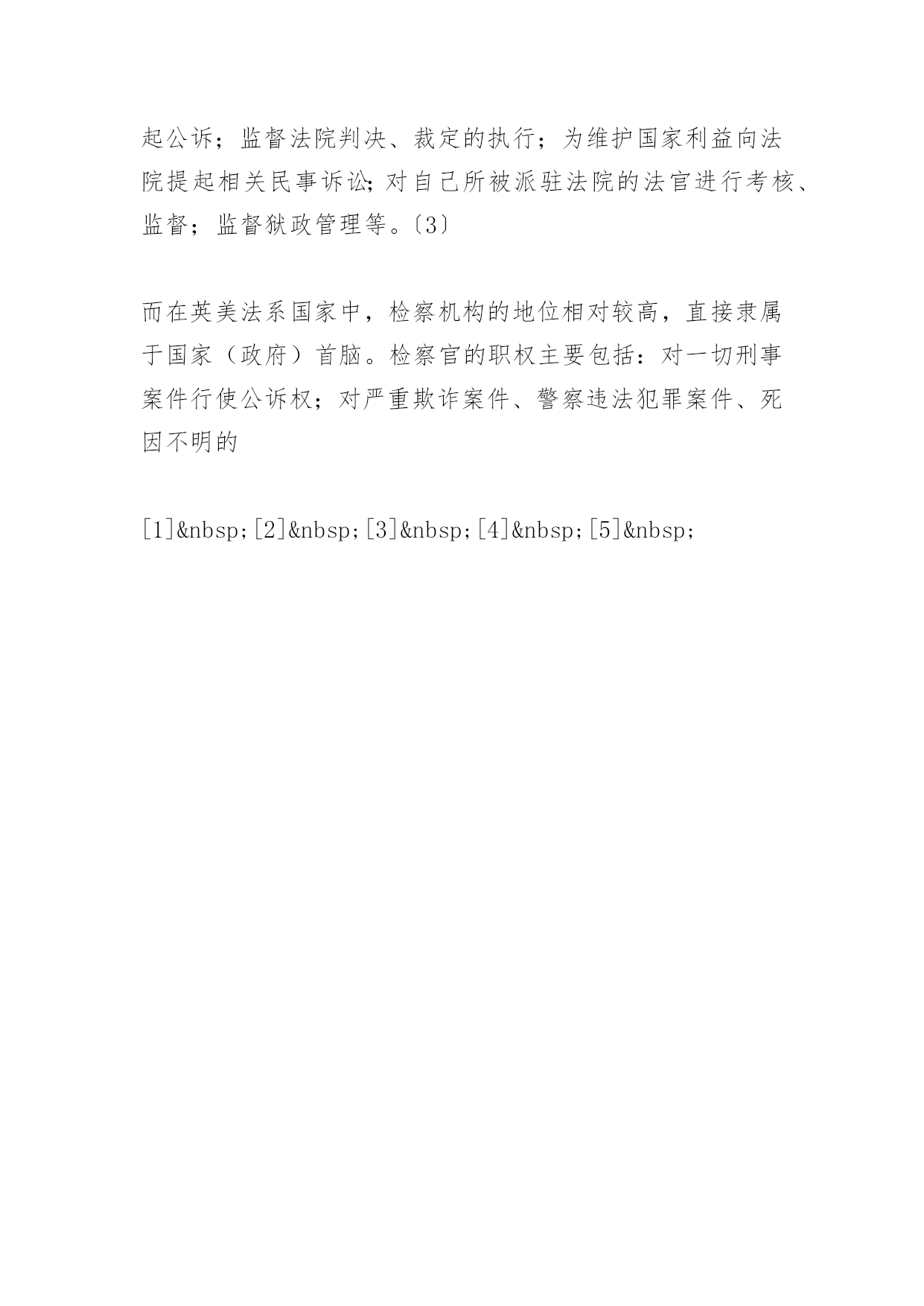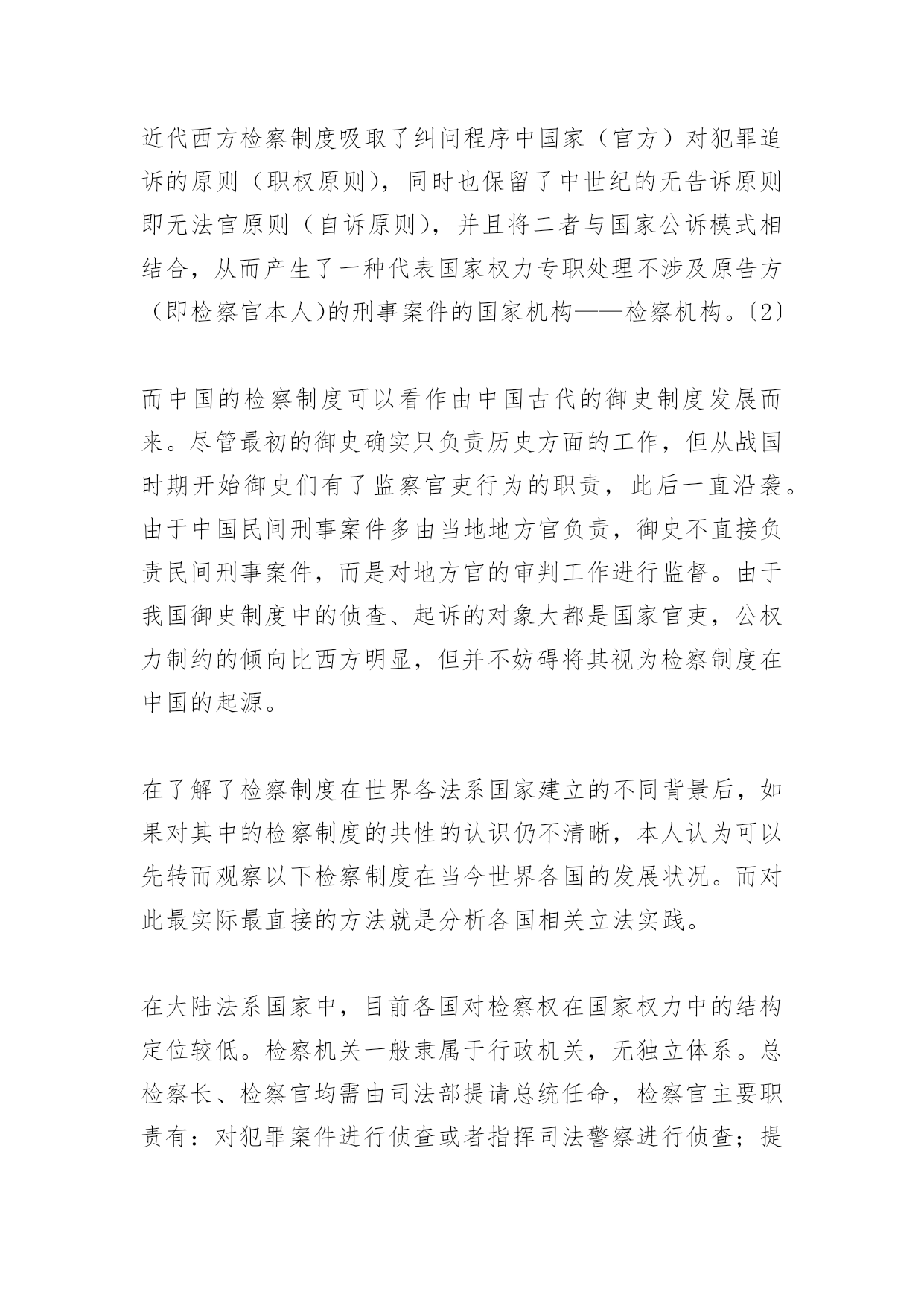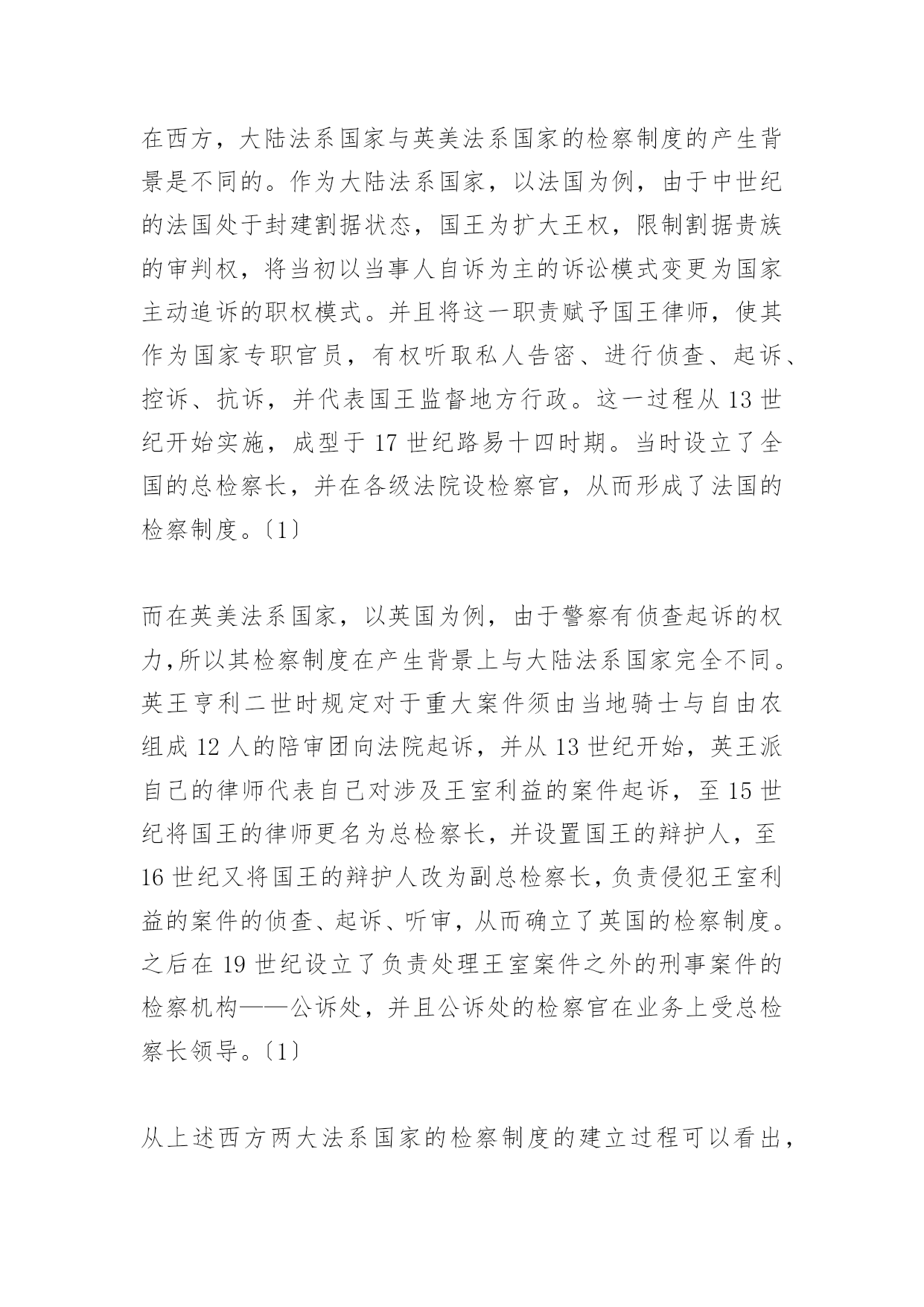 试论检察监督与司法公正论文试论检察监督与司法公正论文内容摘要:检察监督作为我国人民检察院的主要职能,是实现我国的司法公正的重要保障。本文试图从检察制度产生的历史及当代各国立法的角度首先对检察制度进行分析,以探讨检察制度应有之意,进而在将检察制度与监督机制结合的基础上,探讨检察监督的职能范围;并通过讨论公正的涵义、法与公正的关系从而论及司法公正的涵义,最终尝试对检察监督与司法公正应有的相互关系、我国当前立法实践的缺陷及逐步完善的途径做一探讨。关键词:检察制度;正义;司法公正一、论检察监督探究检察监督的涵义,就应首先准确定义两个概念:检察、监督。虽然这两个词在已有各国立法实践的背景下,从表面上不难理解其涵义。但毕竟各国实践不尽相同,故本人认为仍应重新通过检察制度产生的历史对检察制度的立法本意进行探究,之后结合各国当前立法实践,探讨检察制度当前的应有职能。之后再讨论监督的涵义,进而明确检察监督的整体概念。在西方,大陆法系国家与英美法系国家的检察制度的产生背景是不同的。作为大陆法系国家,以法国为例,由于中世纪的法国处于封建割据状态,国王为扩大王权,限制割据贵族的审判权,将当初以当事人自诉为主的诉讼模式变更为国家主动追诉的职权模式。并且将这一职责赋予国王律师,使其作为国家专职官员,有权听取私人告密、进行侦查、起诉、控诉、抗诉,并代表国王监督地方行政。这一过程从13世纪开始实施,成型于17世纪路易十四时期。当时设立了全国的总检察长,并在各级法院设检察官,从而形成了法国的检察制度。〔1〕而在英美法系国家,以英国为例,由于警察有侦查起诉的权力,所以其检察制度在产生背景上与大陆法系国家完全不同。英王亨利二世时规定对于重大案件须由当地骑士与自由农组成12人的陪审团向法院起诉,并从13世纪开始,英王派自己的律师代表自己对涉及王室利益的案件起诉,至15世纪将国王的律师更名为总检察长,并设置国王的辩护人,至16世纪又将国王的辩护人改为副总检察长,负责侵犯王室利益的案件的侦查、起诉、听审,从而确立了英国的检察制度。之后在19世纪设立了负责处理王室案件之外的刑事案件的检察机构——公诉处,并且公诉处的检察官在业务上受总检察长领导。〔1〕从上述西方两大法系国家的检察制度的建立过程可以看出,近代西方检察制度吸取了纠问程序中国家(官方)对犯罪追诉的原则(职权原则),同时也保留了中世纪的无告诉原则即无法官原则(自诉原则),并且将二者与国家公诉模式相结合,从而产生了一种代表国家权力专职处理不涉及原告方(即检察官本人)的刑事案件的国家机构——检察机构。〔2〕而中国的检察制度可以看作由中国古代的御史制度发展而来。尽管最初的御史确实只负责历史方面的工作,但从战国时期开始御史们有了监察官吏行为的职责,此后一直沿袭。由于中国民间刑事案件多由当地地方官负责,御史不直接负责民间刑事案件,而是对地方官的审判工作进行监督。由于我国御史制度中的侦查、起诉的对象大都是国家官吏,公权力制约的倾向比西方明显,但并不妨碍将其视为检察制度在中国的起源。在了解了检察制度在世界各法系国家建立的不同背景后,如果对其中的检察制度的共性的认识仍不清晰,本人认为可以先转而观察以下检察制度在当今世界各国的发展状况。而对此最实际最直接的方法就是分析各国相关立法实践。在大陆法系国家中,目前各国对检察权在国家权力中的结构定位较低。检察机关一般隶属于行政机关,无独立体系。总检察长、检察官均需由司法部提请总统任命,检察官主要职责有:对犯罪案件进行侦查或者指挥司法警察进行侦查;提起公诉;监督法院判决、裁定的执行;为维护国家利益向法院提起相关民事诉讼;对自己所被派驻法院的法官进行考核、监督;监督狱政管理等。〔3〕而在英美法系国家中,检察机构的地位相对较高,直接隶属于国家(政府)首脑。检察官的职权主要包括:对一切刑事案件行使公诉权;对严重欺诈案件、警察违法犯罪案件、死因不明的[1] [2] [3] [4] [5]