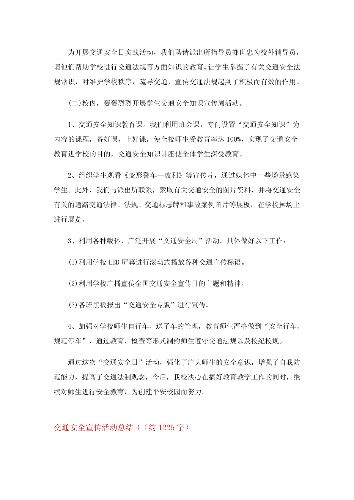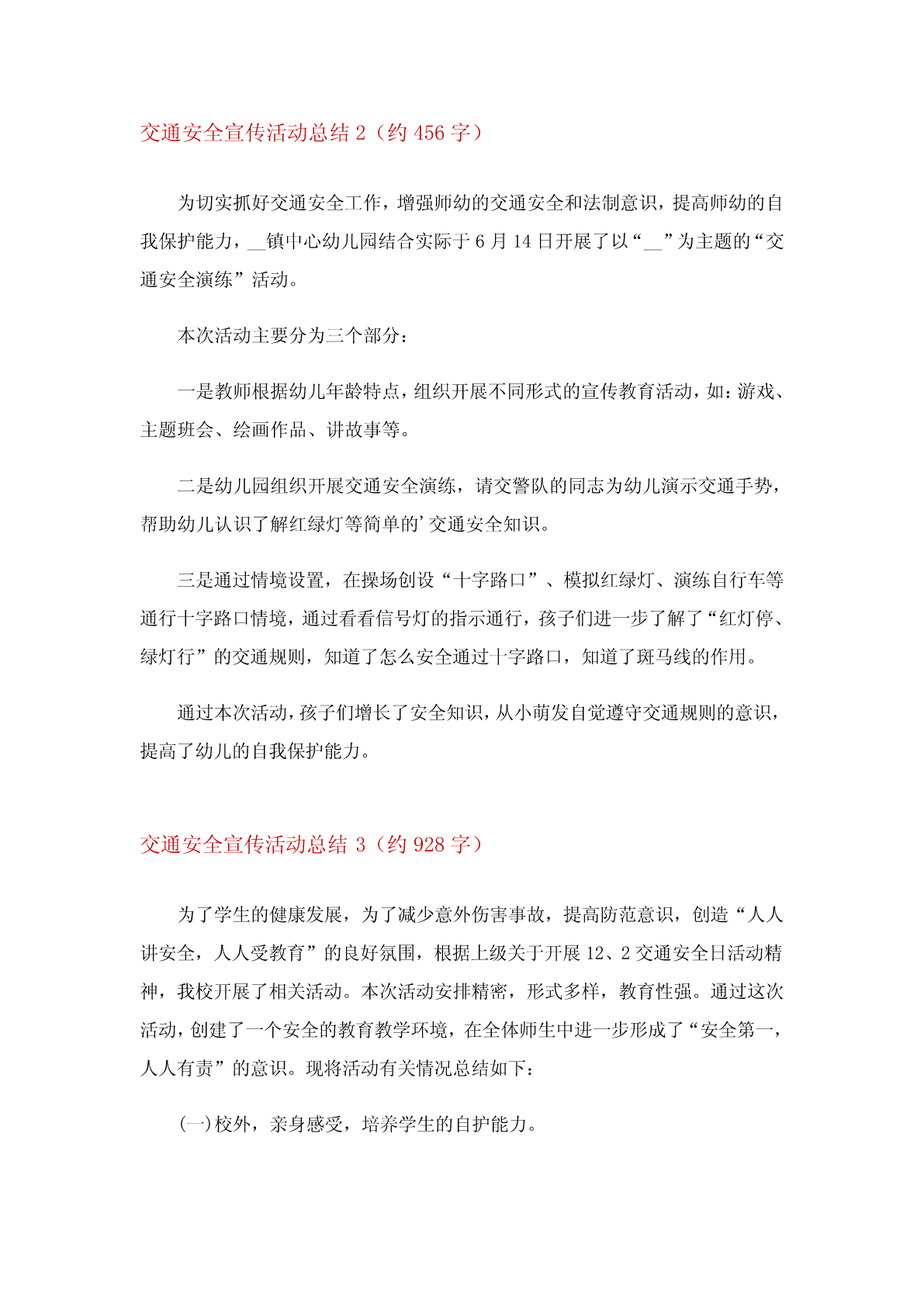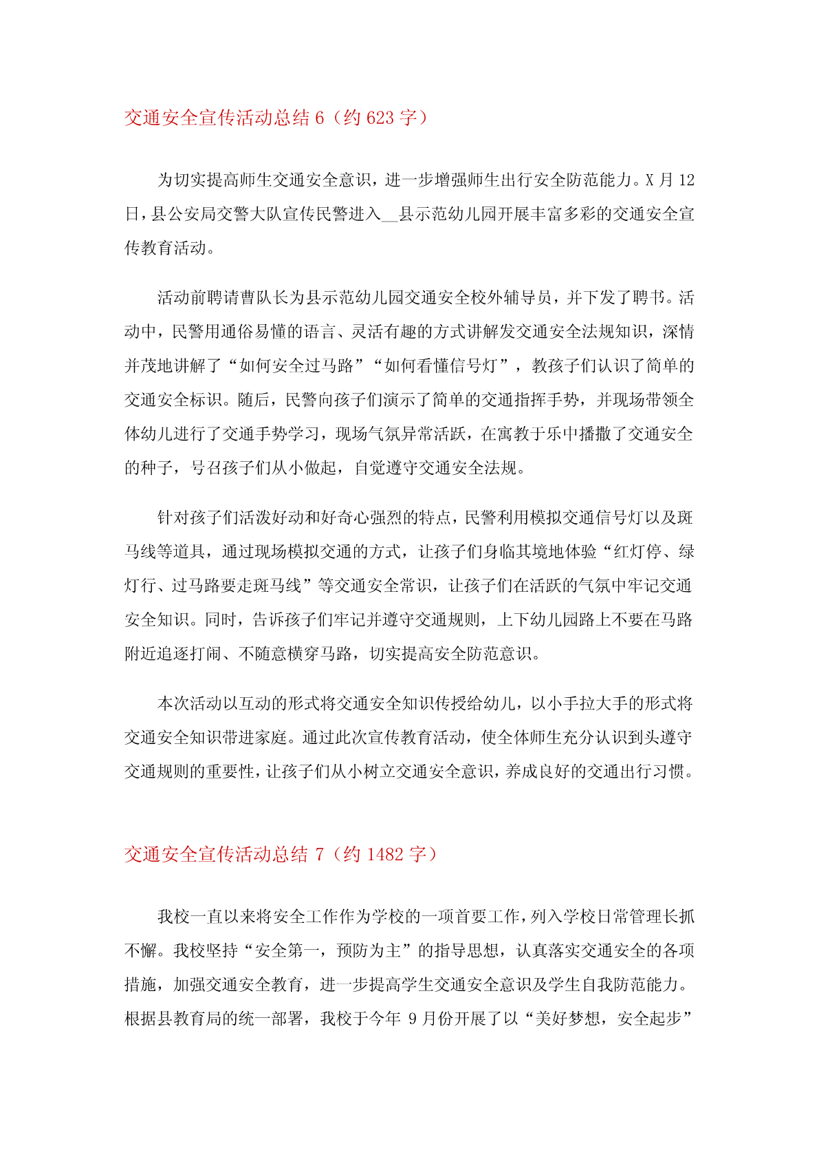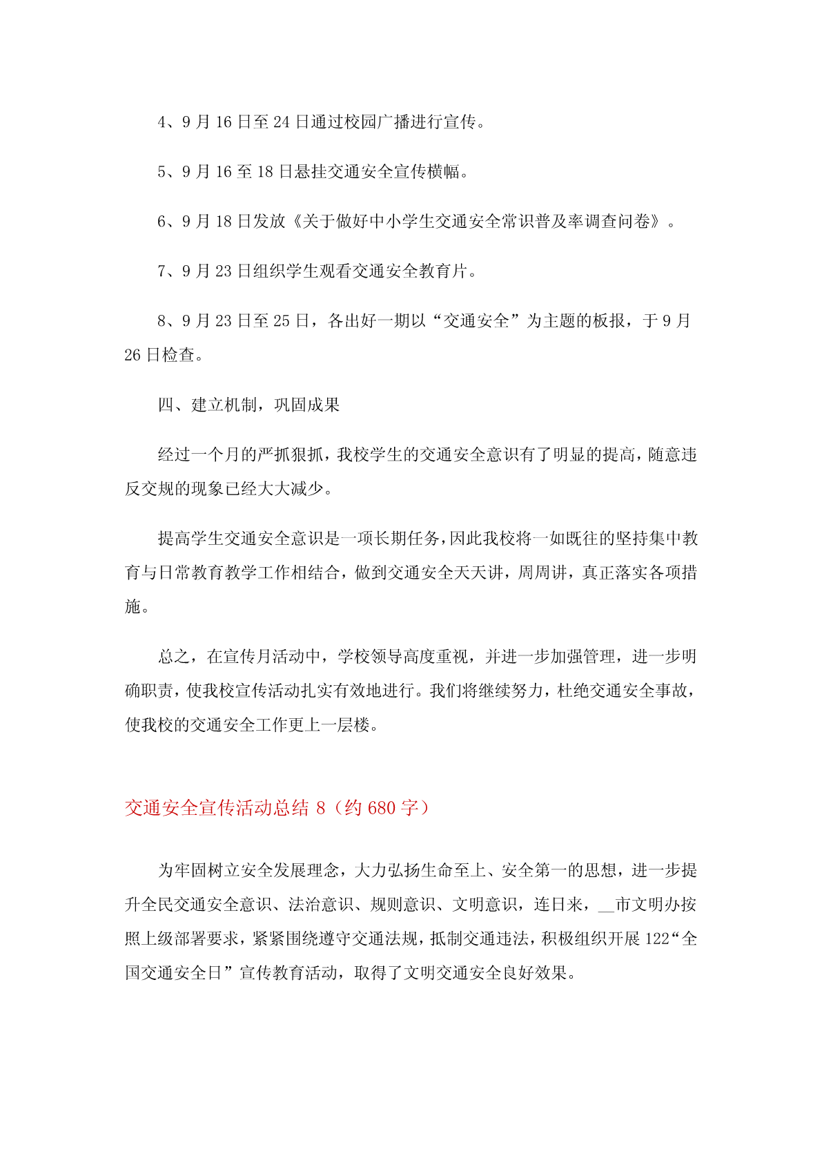交通安全宣传活动总结交通安全宣传活动总结1(约1421字)为深入推进“文明交通行动计划”,切实加强中小学生交通安全宣传教育,提高交通安全意识,在全社会营造关注未成年人交通安全的良好氛围,我校开展了以“倡导文明交通意识,营造校园安全环境”为主题的交通安全宣传教育活动。我校把“稳定、安全”作为学校工作的首要任务,全方位、全过程执行“安全第一,预防为主”的方针,加强对安全工作的领导和管理。一、加强安全工作的领导1、随着学生进入校园,我校领导宣布学校安全教育工作随之同步。在本学期初的会议中,召开“关注安全,关爱生命”道路交通安全宣传教育周活动的工作部署。2、提高教师认识,明确安全工作的重要性、人命关天、责任重大,学校把安全教育提到重要议事日程,每学期制定计划,专题研究安全教育工作,使广大教职员工明确把安全教育纳入素质教育之中,保证教学秩序顺利进行。二、加强常规制度的落实1、加强学生日常行为规范教育。利用晨会课或班队活动时间,对学生进行安全教育,把学生的安全知识教育渗透到日常行为规范教育中。增强学生安全意识,教育学生不要在公路、楼道、扶拦、工地、危险建筑物等地打闹追逐。2、强化道路交通安全教育,规范学生骑自行车上学。对十二周岁以下学生要求不得骑自行车上学;近路学生不骑车上学,并对学生的车况进行关注,并提醒学生注意相关安全情况。3、下发告家长书,希望在家长、社会和学校的全体努力下,大大提高学生的交通安全保障。4、加强门卫管理,提高门卫工作职能。学校严禁学生中途擅自离校。一旦发现或知道学生已擅自离校,必须及时告知教师或学生家长,以免学生发生伤害。5、每班任课教师在接任新班或接收转学生后,对学生作全面了解,对某些具有特异体质、特定疾病或者异常心理状态的学生,应予以必要注意。不让他们参加不宜参加的教育教学活动。三、多渠道、多角度进行安全教育1、加强交通安全防范工作,组织学生观看了交通安全教育片、图片展等活动,并开展安全疏散演习,加强学生的安全意识。2、利用国旗下讲话,开展以“关注安全,关爱生命”为主题的宣传教育活动周动员会;3、利用第三节班会课时间组织全体学生在教学楼前开展“关注安全,关爱生命”为主题的专题教育会;4、各班级出一期交通安全宣传黑板报;5、向学生家长发出《道路交通安全公开信》,要求学生及家长学习其中内容签字后交回学校;6、向各班级印发了《学生道路交通安全规范》,张贴于教室醒目位置;7、制作了一版“关爱生命,严守交规”宣传专栏;总之,在宣传活动中,学校领导高度重视,并进一步加强管理,进一步明确职责,使我校交通安全宣传教育活动扎实有效地进行。今后,我校将进一步采取措施,加强对学生交通等各方面的安全教育和管理,开展交通法规和法制教育,进一步强化安全教育和管理,杜绝交通安全事故,确保学生安全无事故,使我校的交通安全工作更上一层楼,从而维护稳定的教育教学秩序。交通安全宣传活动总结2(约456字)为切实抓好交通安全工作,增强师幼的交通安全和法制意识,提高师幼的自我保护能力,__镇中心幼儿园结合实际于6月14日开展了以“__”为主题的“交通安全演练”活动。本次活动主要分为三个部分:一是教师根据幼儿年龄特点,组织开展不同形式的宣传教育活动,如:游戏、主题班会、绘画作品、讲故事等。二是幼儿园组织开展交通安全演练,请交警队的同志为幼儿演示交通手势,帮助幼儿认识了解红绿灯等简单的'交通安全知识。三是通过情境设置,在操场创设“十字路口”、模拟红绿灯、演练自行车等通行十字路口情境,通过看看信号灯的指示通行,孩子们进一步了解了“红灯停、绿灯行”的交通规则,知道了怎么安全通过十字路口,知道了斑马线的作用。通过本次活动,孩子们增长了安全知识,从小萌发自觉遵守交通规则的意识,提高了幼儿的自我保护能力。交通安全宣传活动总结3(约928字)为了学生的健康发展,为了减少意外伤害事故,提高防范意识,创造“人人讲安全,人人受教育”的良好氛围,根据上级关于开展12、2交通安全日活动精神,我校开展了相关活动。本次活动安排精密,形式多样,教育性强。通过这次活动,创建了一个安全的教育教学环境,在全体师生中进一步形成了“安全第一,人人有责”的意识。现将活动有关情况总结如下:(一)校外,亲身感受,培养学生的自护能力。为开展交通安全日实践活动,我们聘请派出所指导员郑世忠为校外辅导员,请他们帮助学校进行交通法规等方面知识的教育。让学生掌握了有关交通安全法规常识,对维护学校秩序,疏导交通,宣传交通法规起到了积极而有效