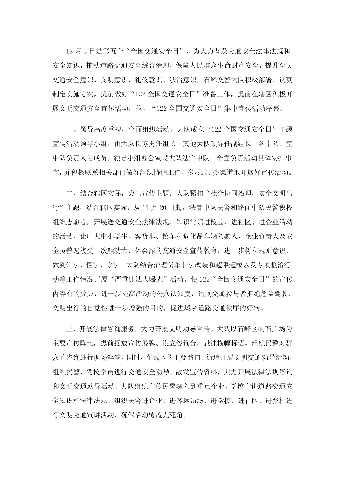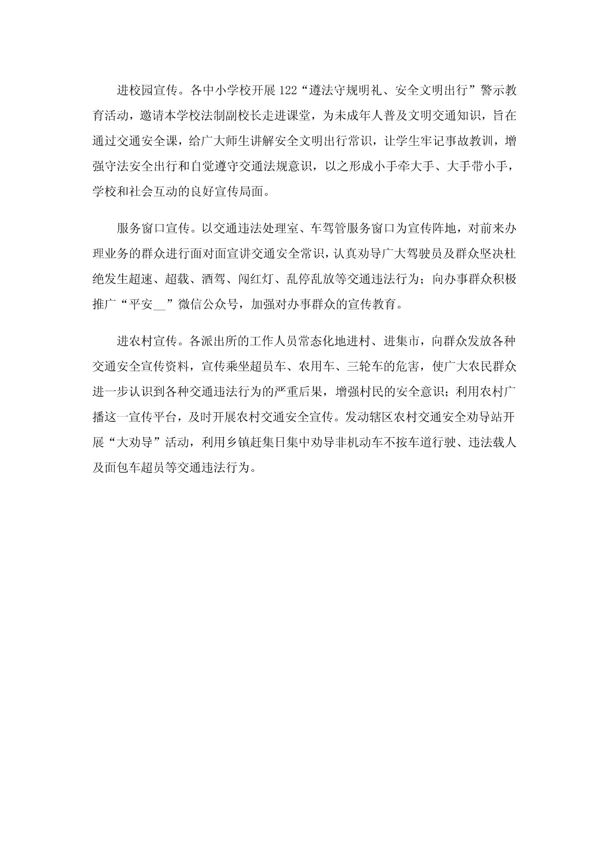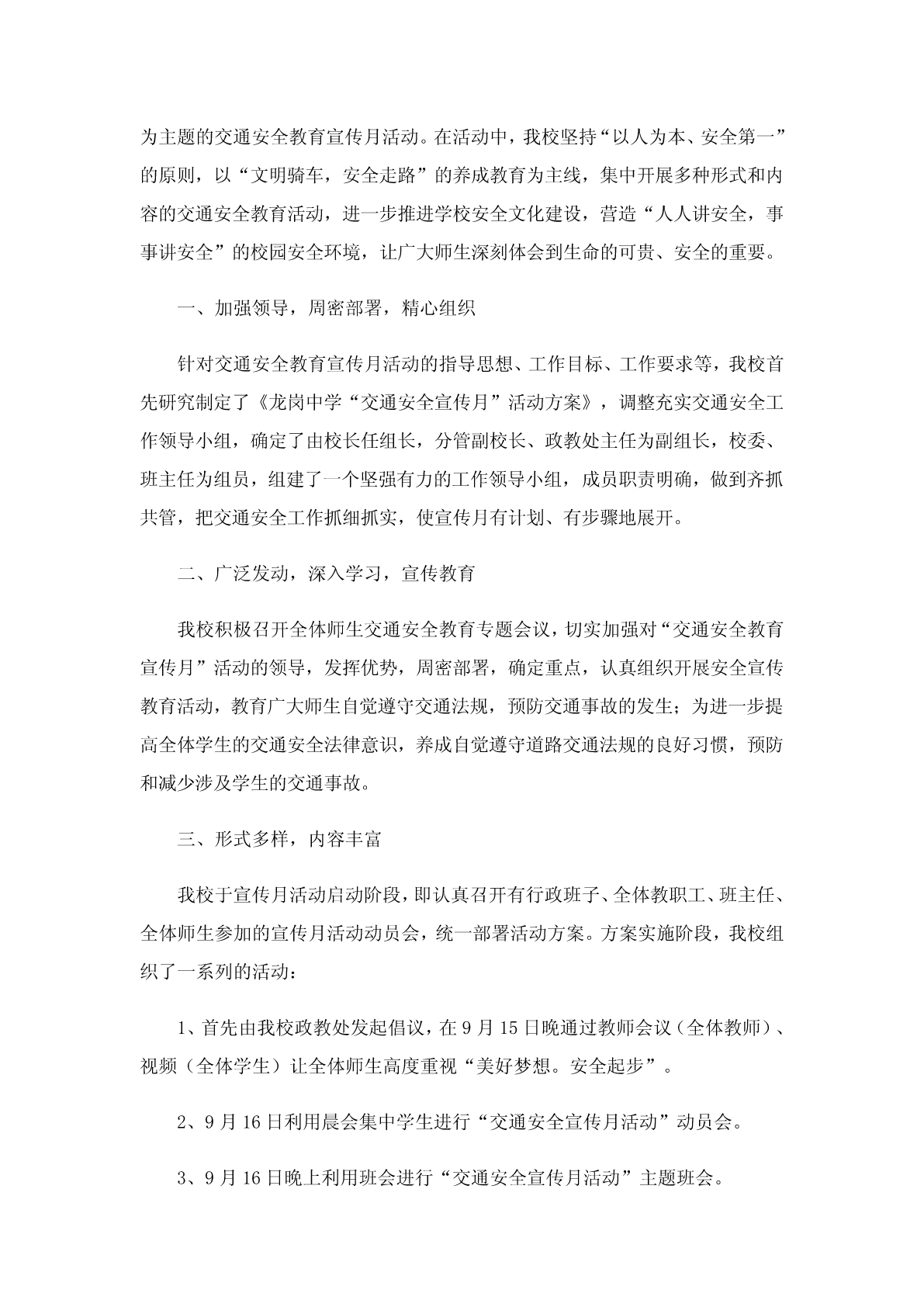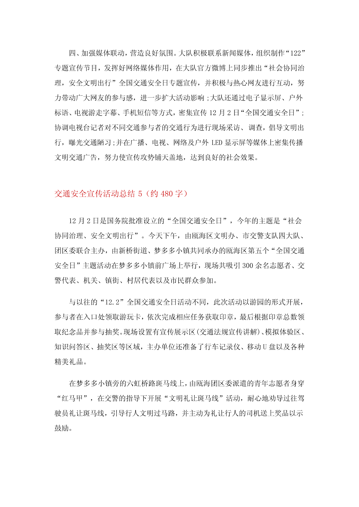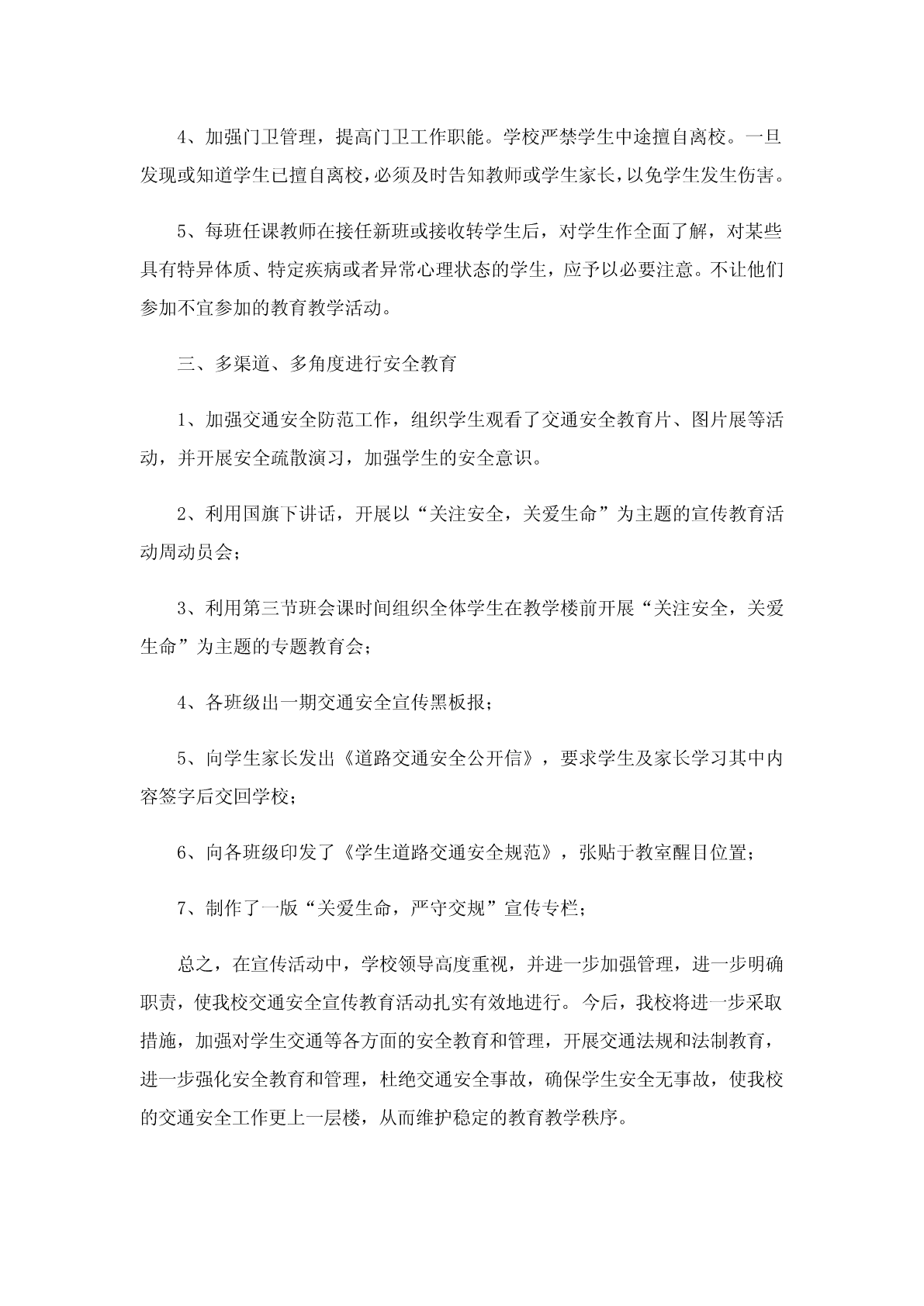 交通安全宣传活动总结交通安全宣传活动总结1(约1421字)为深入推进“文明交通行动计划”,切实加强中小学生交通安全宣传教育,提高交通安全意识,在全社会营造关注未成年人交通安全的良好氛围,我校开展了以“倡导文明交通意识,营造校园安全环境”为主题的交通安全宣传教育活动。我校把“稳定、安全”作为学校工作的首要任务,全方位、全过程执行“安全第一,预防为主”的方针,加强对安全工作的领导和管理。一、加强安全工作的领导1、随着学生进入校园,我校领导宣布学校安全教育工作随之同步。在本学期初的会议中,召开“关注安全,关爱生命”道路交通安全宣传教育周活动的工作部署。2、提高教师认识,明确安全工作的重要性、人命关天、责任重大,学校把安全教育提到重要议事日程,每学期制定计划,专题研究安全教育工作,使广大教职员工明确把安全教育纳入素质教育之中,保证教学秩序顺利进行。二、加强常规制度的落实1、加强学生日常行为规范教育。利用晨会课或班队活动时间,对学生进行安全教育,把学生的安全知识教育渗透到日常行为规范教育中。增强学生安全意识,教育学生不要在公路、楼道、扶拦、工地、危险建筑物等地打闹追逐。2、强化道路交通安全教育,规范学生骑自行车上学。对十二周岁以下学生要求不得骑自行车上学;近路学生不骑车上学,并对学生的车况进行关注,并提醒学生注意相关安全情况。3、下发告家长书,希望在家长、社会和学校的全体努力下,大大提高学生的交通安全保障。4、加强门卫管理,提高门卫工作职能。学校严禁学生中途擅自离校。一旦发现或知道学生已擅自离校,必须及时告知教师或学生家长,以免学生发生伤害。5、每班任课教师在接任新班或接收转学生后,对学生作全面了解,对某些具有特异体质、特定疾病或者异常心理状态的学生,应予以必要注意。不让他们参加不宜参加的教育教学活动。三、多渠道、多角度进行安全教育1、加强交通安全防范工作,组织学生观看了交通安全教育片、图片展等活动,并开展安全疏散演习,加强学生的安全意识。2、利用国旗下讲话,开展以“关注安全,关爱生命”为主题的宣传教育活动周动员会;3、利用第三节班会课时间组织全体学生在教学楼前开展“关注安全,关爱生命”为主题的专题教育会;4、各班级出一期交通安全宣传黑板报;5、向学生家长发出《道路交通安全公开信》,要求学生及家长学习其中内容签字后交回学校;6、向各班级印发了《学生道路交通安全规范》,张贴于教室醒目位置;7、制作了一版“关爱生命,严守交规”宣传专栏;总之,在宣传活动中,学校领导高度重视,并进一步加强管理,进一步明确职责,使我校交通安全宣传教育活动扎实有效地进行。今后,我校将进一步采取措施,加强对学生交通等各方面的安全教育和管理,开展交通法规和法制教育,进一步强化安全教育和管理,杜绝交通安全事故,确保学生安全无事故,使我校的交通安全工作更上一层楼,从而维护稳定的教育教学秩序。交通安全宣传活动总结2(约456字)为切实抓好交通安全工作,增强师幼的交通安全和法制意识,提高师幼的自我保护能力,__镇中心幼儿园结合实际于6月14日开展了以“__”为主题的“交通安全演练”活动。本次活动主要分为三个部分:一是教师根据幼儿年龄特点,组织开展不同形式的宣传教育活动,如:游戏、主题班会、绘画作品、讲故事等。二是幼儿园组织开展交通安全演练,请交警队的同志为幼儿演示交通手势,帮助幼儿认识了解红绿灯等简单的'交通安全知识。三是通过情境设置,在操场创设“十字路口”、模拟红绿灯、演练自行车等通行十字路口情境,通过看看信号灯的指示通行,孩子们进一步了解了“红灯停、绿灯行”的交通规则,知道了怎么安全通过十字路口,知道了斑马线的作用。通过本次活动,孩子们增长了安全知识,从小萌发自觉遵守交通规则的意识,提高了幼儿的自我保护能力。交通安全宣传活动总结3(约928字)为了学生的健康发展,为了减少意外伤害事故,提高防范意识,创造“人人讲安全,人人受教育”的良好氛围,根据上级关于开展12、2交通安全日活动精神,我校开展了相关活动。本次活动安排精密,形式多样,教育性强。通过这次活动,创建了一个安全的教育教学环境,在全体师生中进一步形成了“安全第一,人人有责”的意识。现将活动有关情况总结如下:(一)校外,亲身感受,培养学生的自护能力。为开展交通安全日实践活动,我们聘请派出所指导员郑世忠为校外辅导员,请他们帮助学校进行交通法规等方面知识的教育。让学生掌握了有关交通安全法规常识,对维护学校秩序,疏导交通,宣传交通法规起到了积极而有效