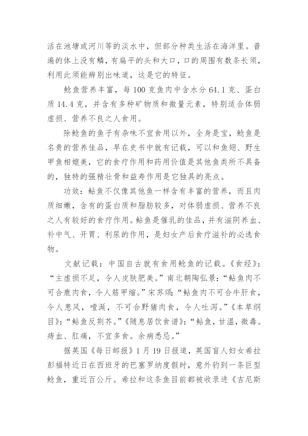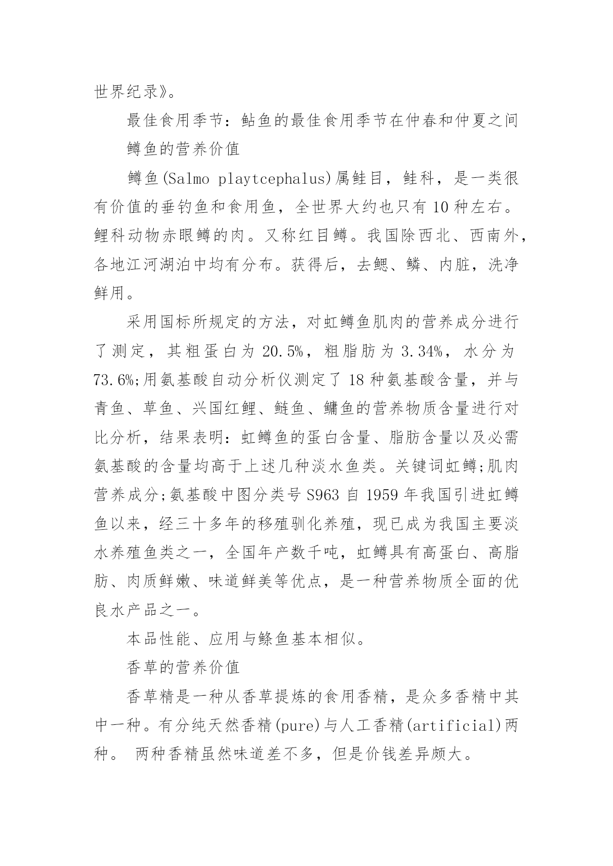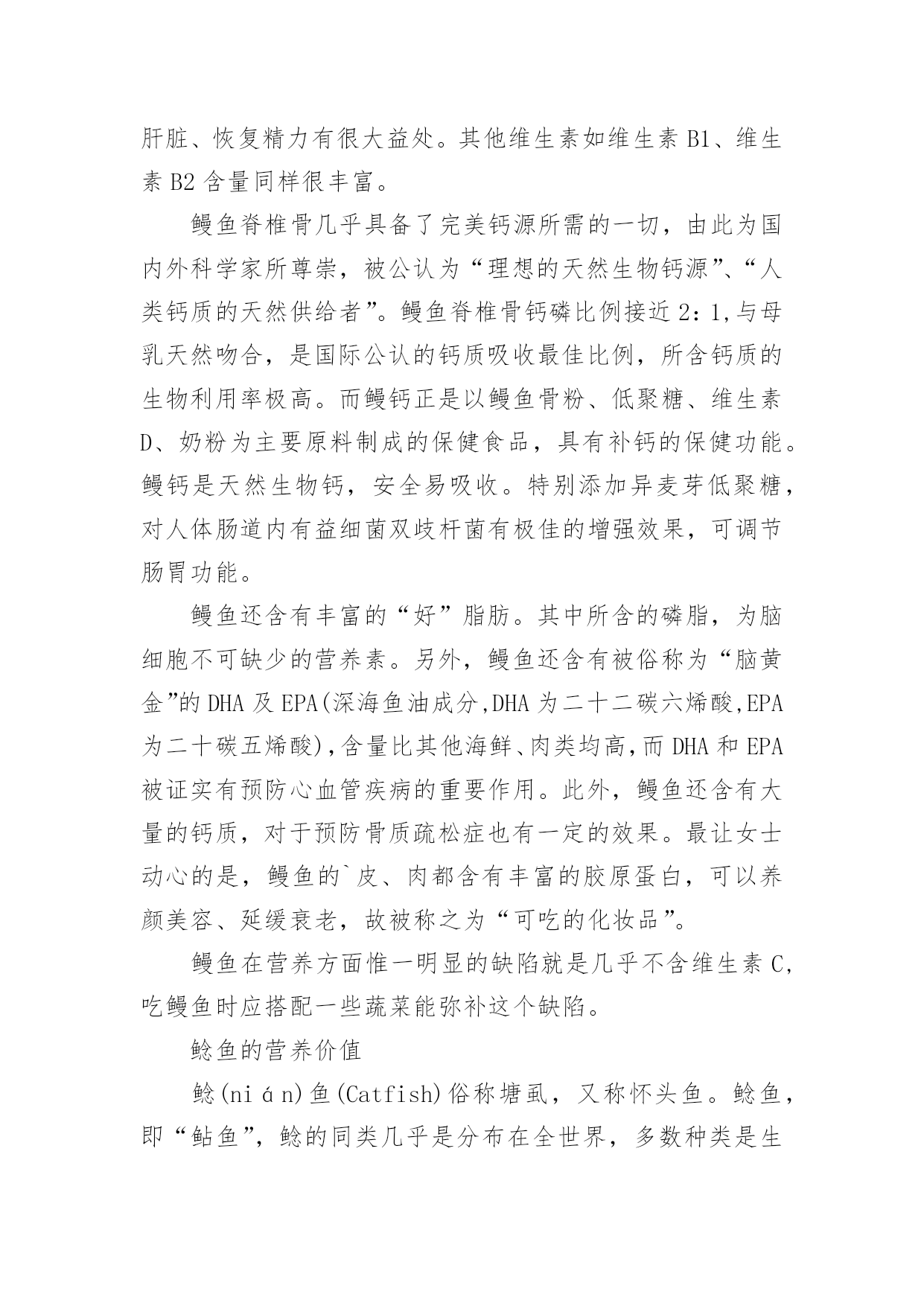 公共营养师考试饮食营养知识2017年公共营养师考试饮食营养知识人的生存、生长、保持健康以及取得从事任何工作和娱乐都离不开营养的参与,而营养的直接来源就是食物。接下来小编为大家精心整理了2017年公共营养师考试饮食营养知识,更多相关内容请关注应届毕业生考试网!鳗鱼的营养价值鳗鱼,别名:白鳝、白鳗、河鳗、鳗鲡、青鳝、风馒、日本鳗。鳗鱼是指属于鳗鲡目分类下的物种总称。又称鳝,是一种外观类似长条蛇形的鱼类,具有鱼的基本特征。此外鳗鱼与鲑鱼类似具有洄游特性。鳗鱼属鱼类,似蛇,但无鳞,一般产于咸淡水交界海域。鳗鱼富含多种营养成分,具有补虚养血、祛湿、抗痨等功效,是久病、虚弱、贫血、肺结核等病人的良好营养品。鳗鲡体内含有一种很稀有的西河洛克蛋白,具有良好的强精壮肾的功效,是年轻夫妇、中老年人的保健食品。鳗是富含钙质的水产品,经常食用,能使血钙值有所增加,使身体强壮。鳗的肝脏含有丰富的维生素A,是夜盲人的优良食品。鳗鱼的营养价值与其他鱼类及肉类相比也毫不逊色。鳗鱼肉含有丰富的优质蛋白和各种人体必需的氨基酸。鳗鱼富含维生素A和维生素E,含量分别是普通鱼类的60倍和9倍。其中维生素A为牛肉的100倍、猪肉的300倍以上。丰富的维生素A、维生素E,对于预防视力退化、保护肝脏、恢复精力有很大益处。其他维生素如维生素B1、维生素B2含量同样很丰富。鳗鱼脊椎骨几乎具备了完美钙源所需的一切,由此为国内外科学家所尊崇,被公认为“理想的天然生物钙源”、“人类钙质的天然供给者”。鳗鱼脊椎骨钙磷比例接近2:1,与母乳天然吻合,是国际公认的钙质吸收最佳比例,所含钙质的生物利用率极高。而鳗钙正是以鳗鱼骨粉、低聚糖、维生素D、奶粉为主要原料制成的保健食品,具有补钙的保健功能。鳗钙是天然生物钙,安全易吸收。特别添加异麦芽低聚糖,对人体肠道内有益细菌双歧杆菌有极佳的增强效果,可调节肠胃功能。鳗鱼还含有丰富的“好”脂肪。其中所含的磷脂,为脑细胞不可缺少的营养素。另外,鳗鱼还含有被俗称为“脑黄金”的DHA及EPA(深海鱼油成分,DHA为二十二碳六烯酸,EPA为二十碳五烯酸),含量比其他海鲜、肉类均高,而DHA和EPA被证实有预防心血管疾病的重要作用。此外,鳗鱼还含有大量的钙质,对于预防骨质疏松症也有一定的效果。最让女士动心的是,鳗鱼的`皮、肉都含有丰富的胶原蛋白,可以养颜美容、延缓衰老,故被称之为“可吃的化妆品”。鳗鱼在营养方面惟一明显的缺陷就是几乎不含维生素C,吃鳗鱼时应搭配一些蔬菜能弥补这个缺陷。鲶鱼的营养价值鲶(nián)鱼(Catfish)俗称塘虱,又称怀头鱼。鲶鱼,即“鲇鱼”,鲶的同类几乎是分布在全世界,多数种类是生活在池塘或河川等的淡水中,但部分种类生活在海洋里。普遍的体上没有鳞,有扁平的头和大口,口的周围有数条长须,利用此须能辨别出味道,这是它的特征。鲶鱼营养丰富,每100克鱼肉中含水分64.1克、蛋白质14.4克,并含有多种矿物质和微量元素,特别适合体弱虚损、营养不良之人食用。除鲶鱼的鱼子有杂味不宜食用以外,全身是宝,鲶鱼是名贵的营养佳品,早在史书中就有记载,可以和鱼翅、野生甲鱼相媲美,它的食疗作用和药用价值是其他鱼类所不具备的,独特的强精壮骨和益寿作用是它独具的亮点。功效:鲇鱼不仅像其他鱼一样含有丰富的营养,而且肉质细嫩,含有的蛋白质和脂肪较多,对体弱虚损、营养不良之人有较好的食疗作用。鲇鱼是催乳的佳品,并有滋阴养血、补中气、开胃、利尿的作用,是妇女产后食疗滋补的必选食物。文献记载:中国自古就有食用鲶鱼的记载。《食经》:“主虚损不足,令人皮肤肥美。”南北朝陶弘景:“鲇鱼肉不可合鹿肉食,令人筋甲缩。”宋苏颂:“鲇鱼肉不可合牛肝食,令人患风,噎涎,不可合野猪肉食,令人吐泻。”《本草纲目》:“鲇鱼反荆芥。”《随息居饮食谱》:“鲇鱼,甘温,微毒。痔血、肛痛,不宜多食。余病悉忌。”据英国《每日邮报》1月19日报道,英国盲人妇女希拉彭福特近日在西班牙的巴塞罗纳度假时,意外钓到一条巨型鲶鱼,重近百公斤。希拉和这条鱼目前都被收录进《吉尼斯世界纪录》。最佳食用季节:鲇鱼的最佳食用季节在仲春和仲夏之间鳟鱼的营养价值鳟鱼(Salmoplaytcephalus)属鲑目,鲑科,是一类很有价值的垂钓鱼和食用鱼,全世界大约也只有10种左右。鲤科动物赤眼鳟的肉。又称红目鳟。我国除西北、西南外,各地江河湖泊中均有分布。获得后,去鳃、鳞、内脏,洗净鲜用。采用国标所规定的方法,对虹鳟鱼肌肉的营养成分进行了测定,其粗蛋白为20.5%,粗脂肪为3.34%,水分为73.6%;用氨基酸自动分析仪测定了18种氨基酸含量,并与青鱼、草鱼、兴国红鲤、鲢鱼、鳙鱼的营养物质含量进行对比分析,结果表明:虹鳟鱼的蛋白含量、脂肪含量以及必需氨基酸的含量均高于上述几种淡水鱼类。关键词虹鳟;肌肉营养成分;氨基酸中图分类号